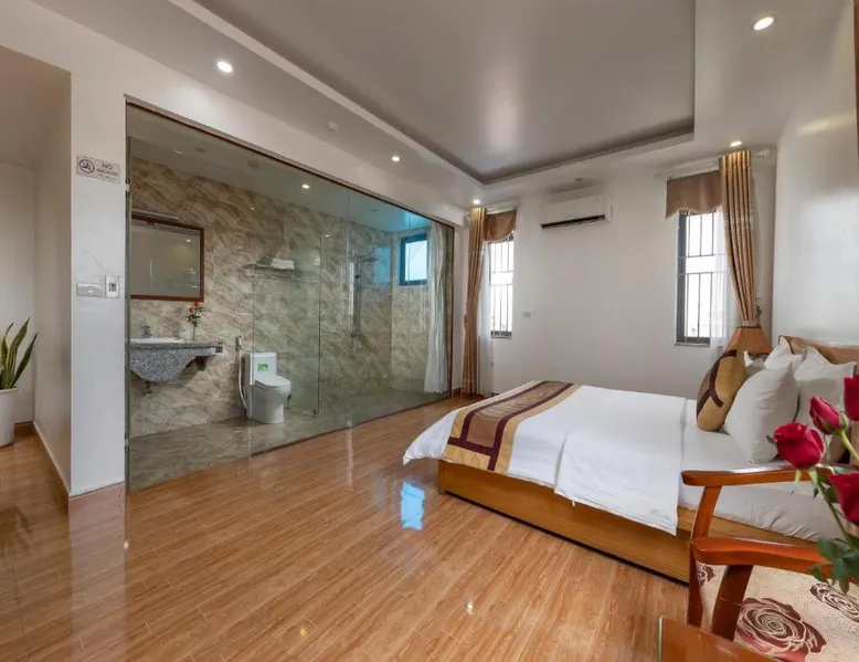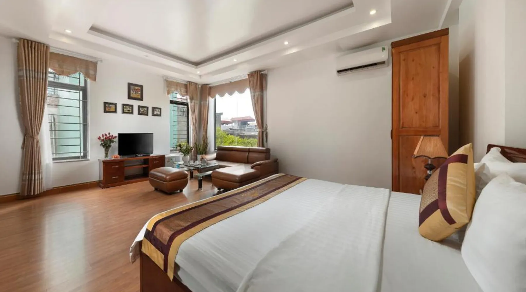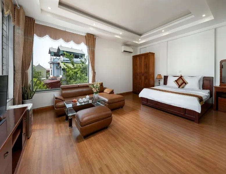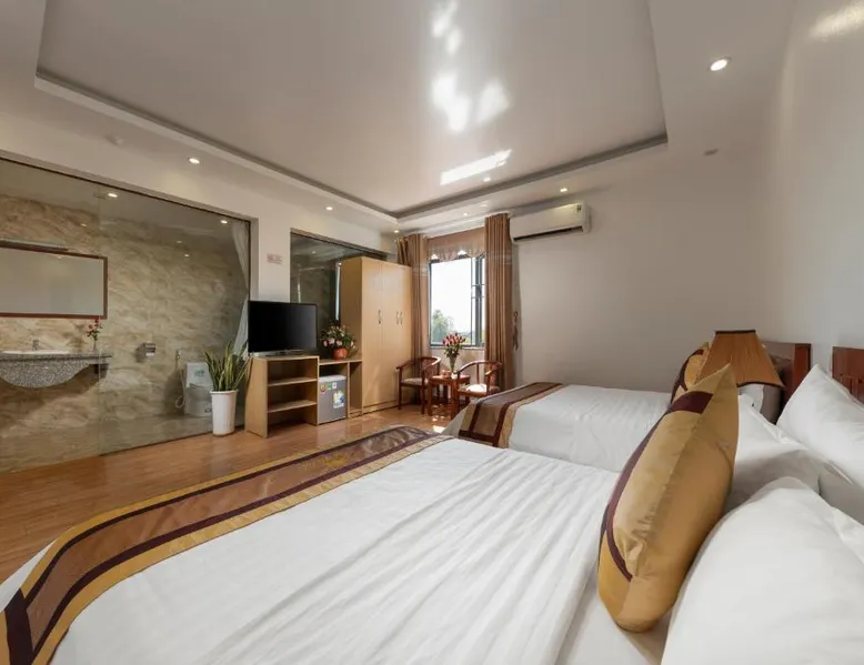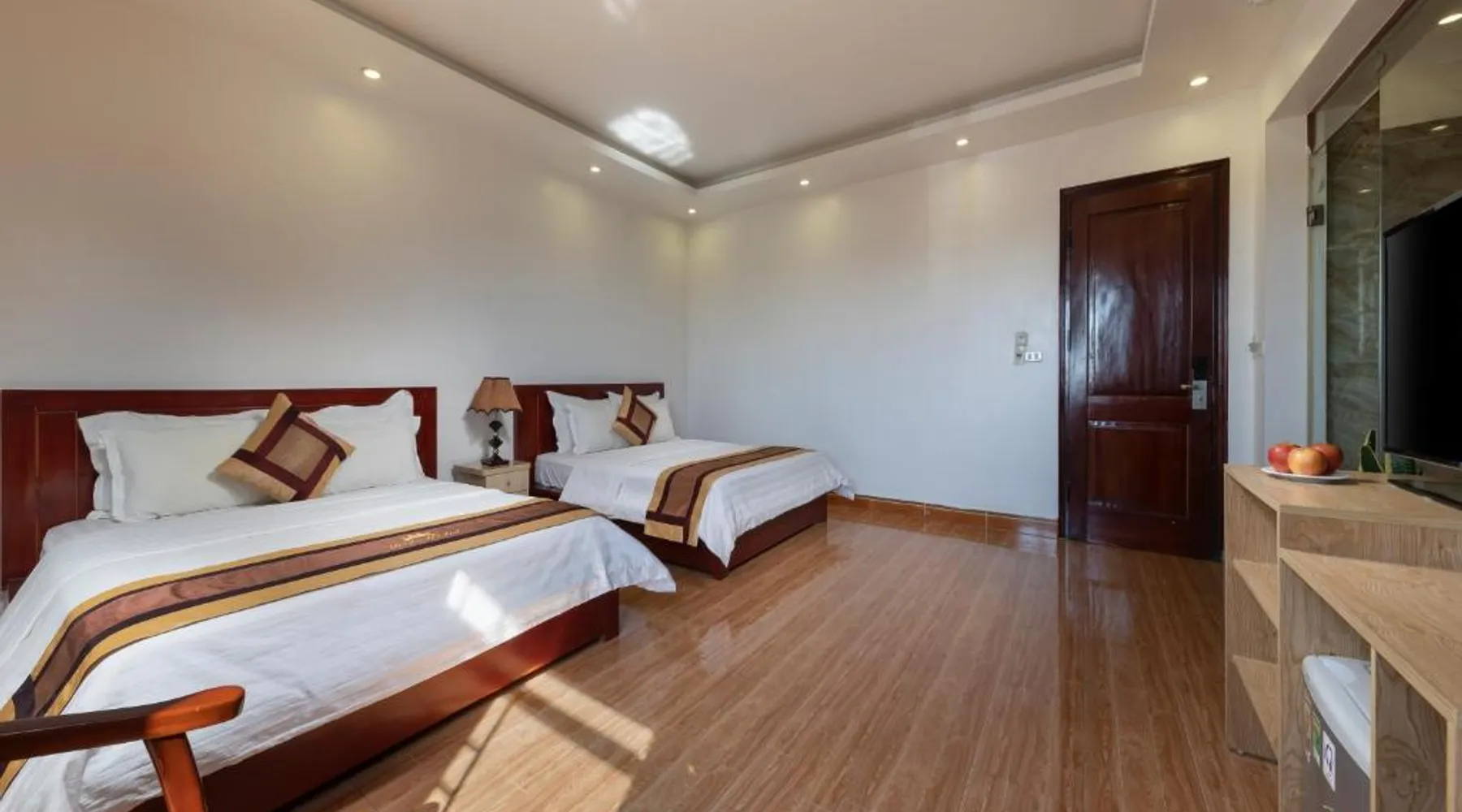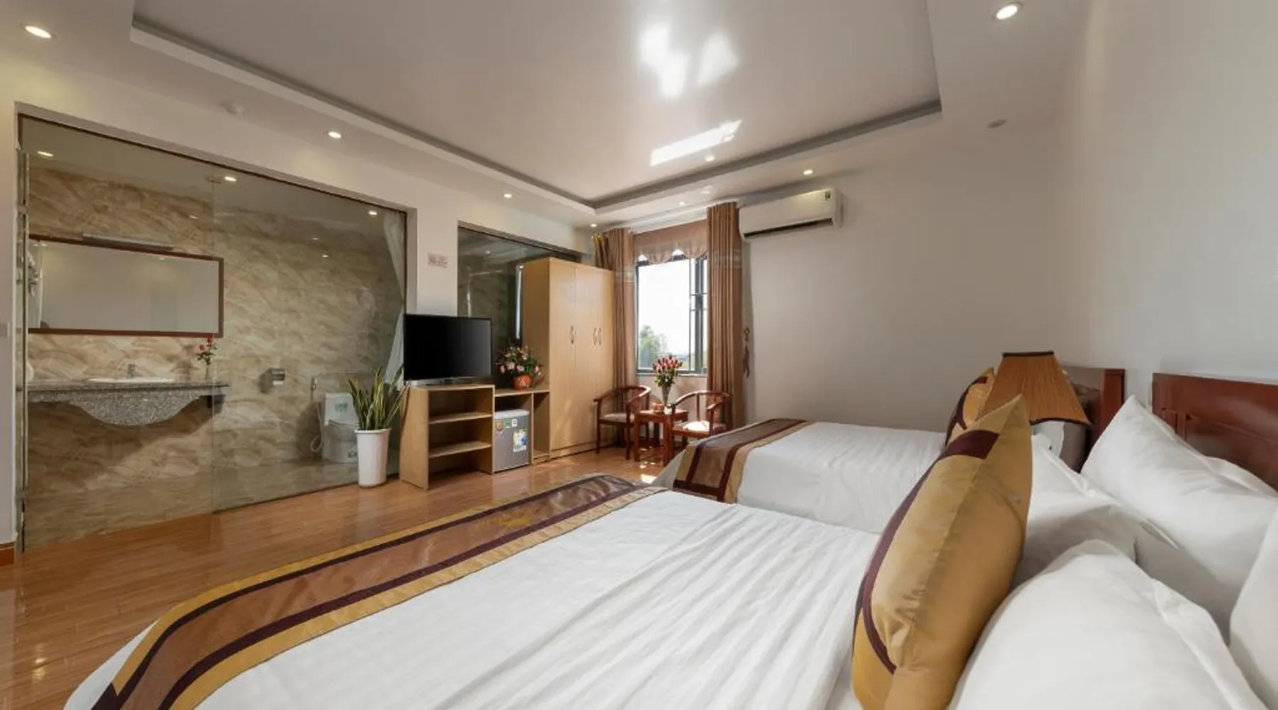 Comfortable Accommodations: Airport Transit Hotel in Hà Nội offers spacious rooms with air-conditioning, private bathrooms, and garden views. Each room includes a dining table, work desk, and soundproofing for a relaxing stay. Exceptional Facilities: Guests enjoy a sun terrace, lush garden, and free WiFi throughout the property. Additional amenities include a restaurant, bar, hot tub, and outdoor seating area. Free on-site private parking is available. Convenient Location: Located 5 mi from Noi Bai International Airport, the hotel is near attractions such as Vietnam Museum of Ethnology (12 mi) and West Lake (12 mi). Highly rated for its connectivity and shuttle service, the hotel ensures a pleasant experience. The air-conditioned family room offers a flat-screen TV with cable channels, soundproof walls, a mini-bar, a wardrobe as well as garden views. The unit offers 2 beds.