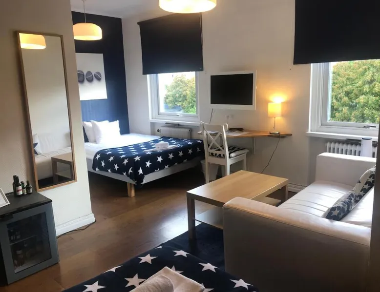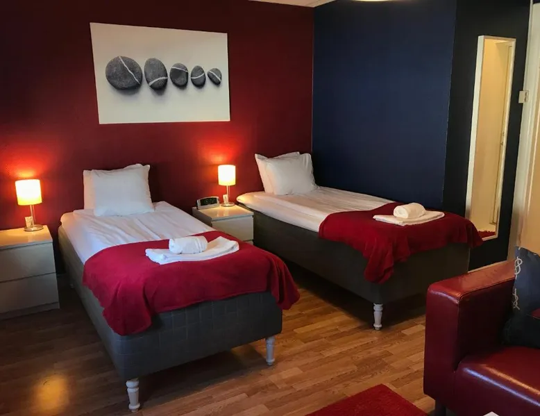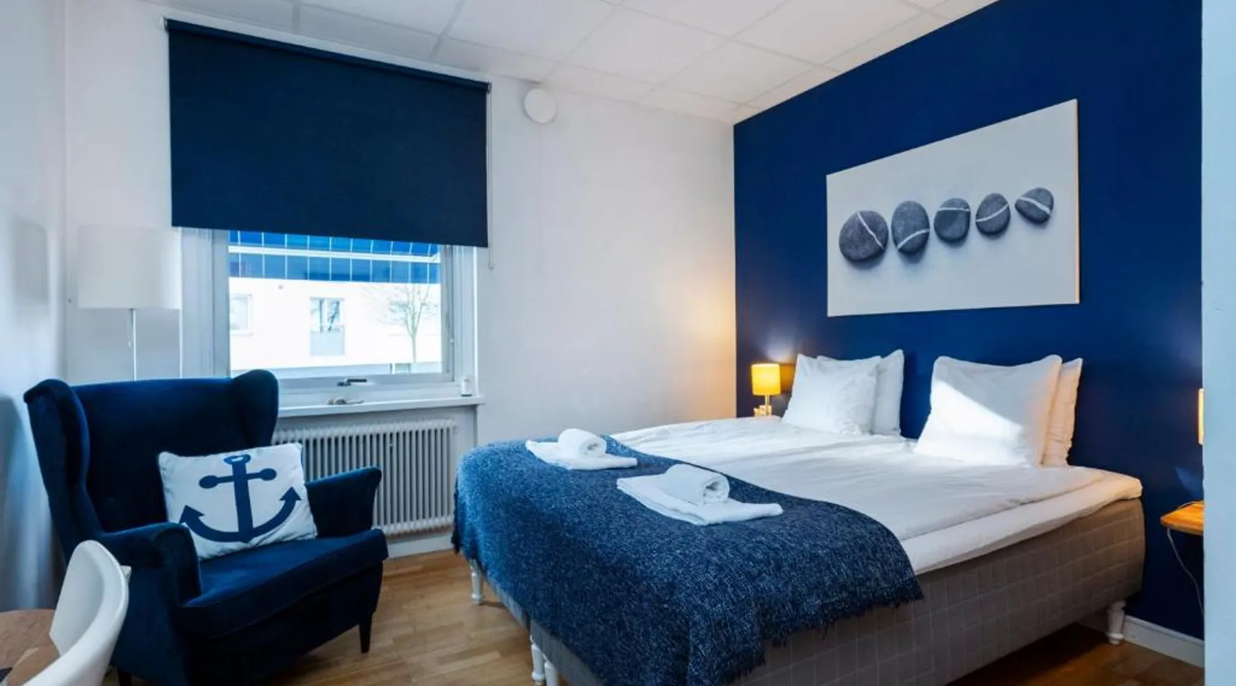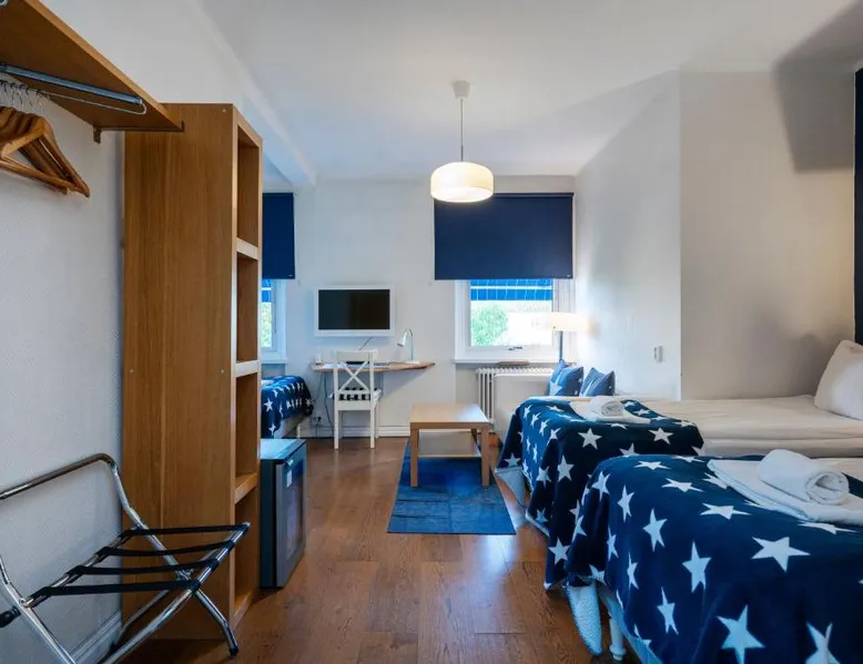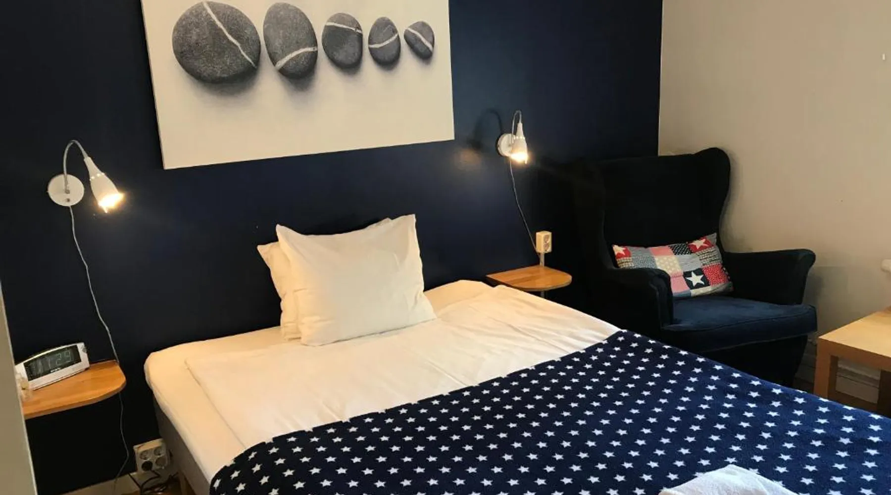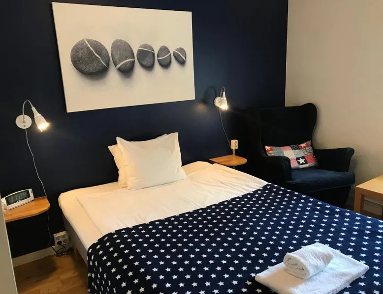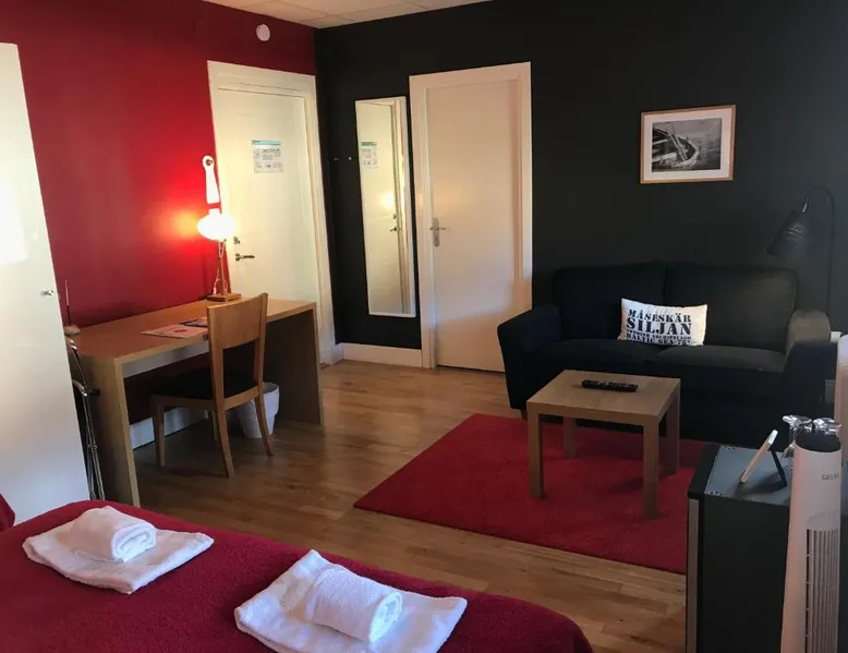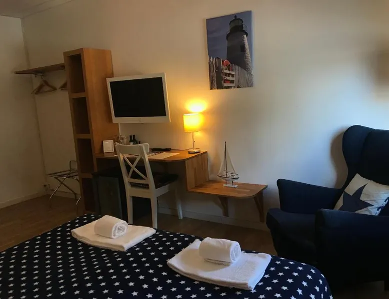 This hotel is located on the main street of Karlshamn, 2133 feet from Stortorget main market square. It offers free WiFi and a large private parking area. Guests can enjoy tea, coffee, fruit and cookies 24-hours at Port Hotel. The bright, marine-themed guest rooms at the hotel feature wooden floors, a mini-bar, desk, flat-screen TV and a comfortable armchair or sofa. Port Hotel serves a large buffet breakfast with more than 120 products. Free bicycles are available at the hotel to explore the surroundings, such as the harbor located 0.6 mi away. A seating area with a flat-screen TV, a desk and a private bathroom are provided in this spacious family room. The unit offers 5 beds.