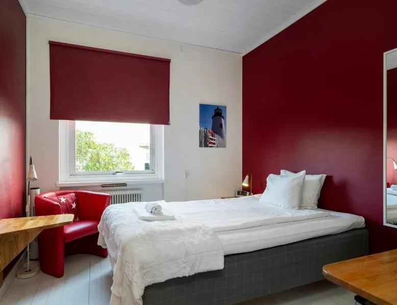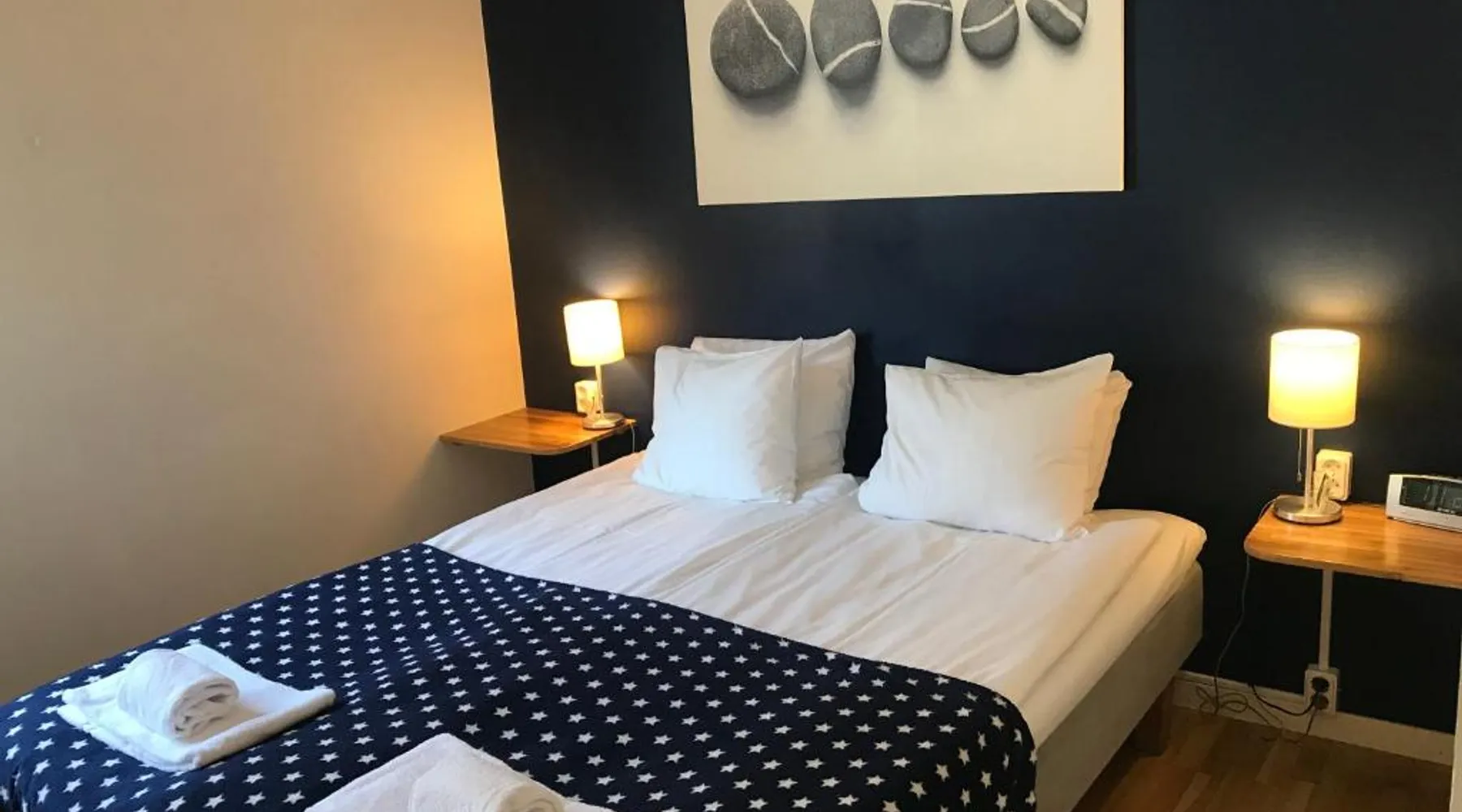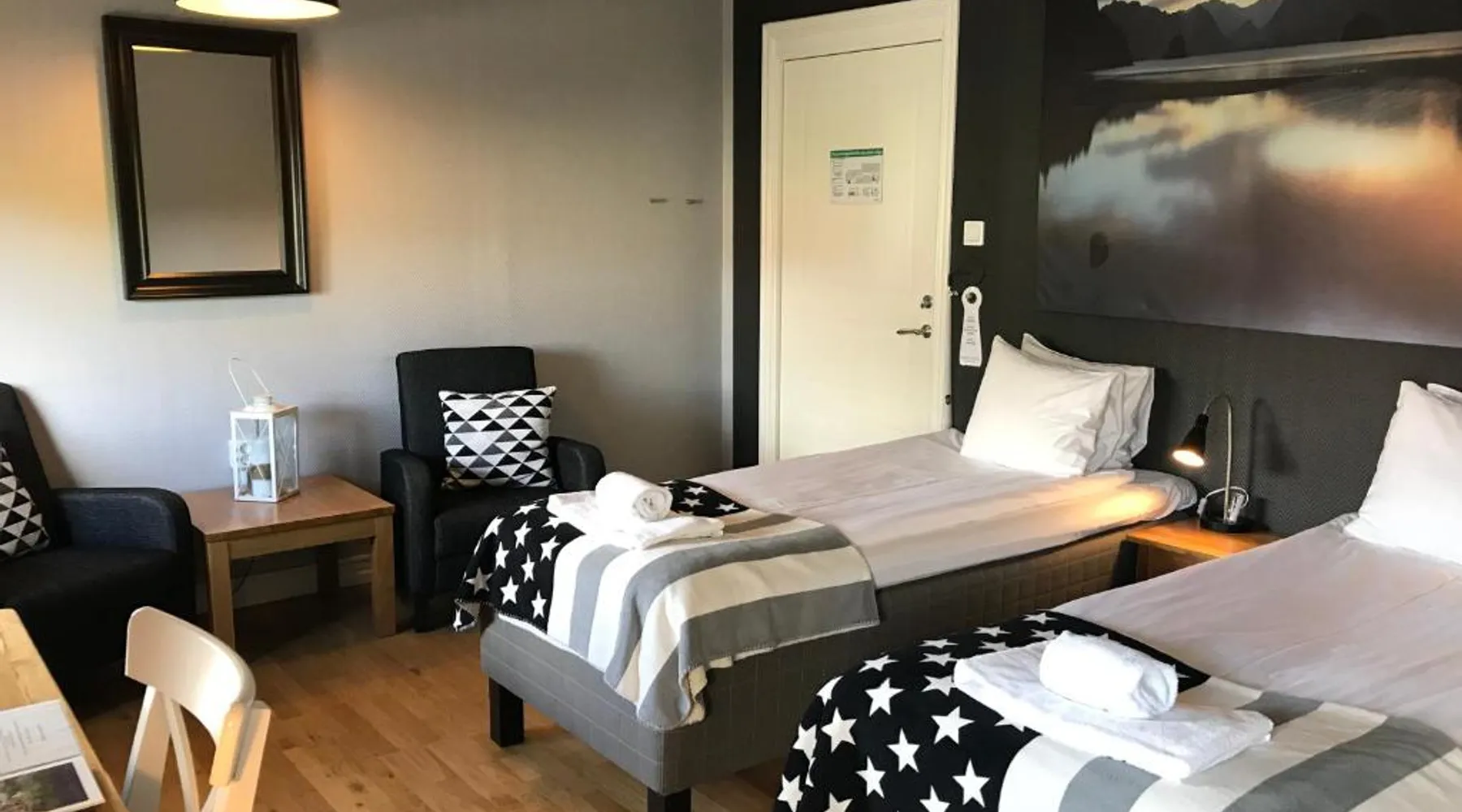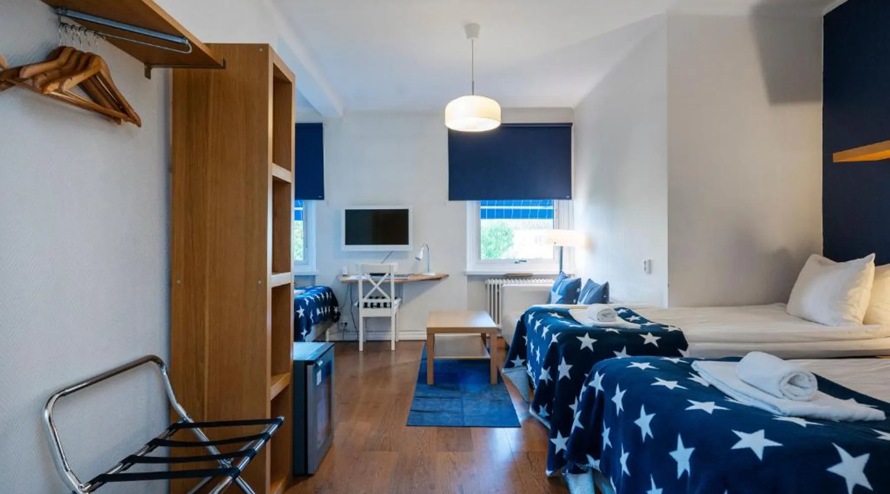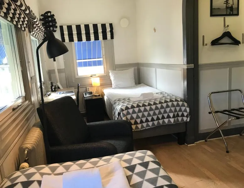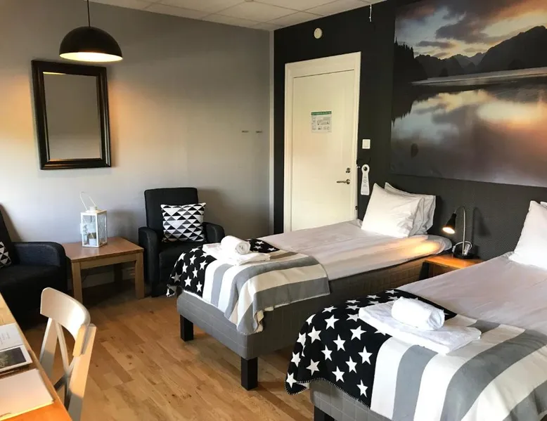 This hotel is located on the main street of Karlshamn, 2133 feet from Stortorget main market square. It offers free WiFi and a large private parking area. Guests can enjoy tea, coffee, fruit and cookies 24-hours at Port Hotel. The bright, marine-themed guest rooms at the hotel feature wooden floors, a mini-bar, desk, flat-screen TV and a comfortable armchair or sofa. Port Hotel serves a large buffet breakfast with more than 120 products. Free bicycles are available at the hotel to explore the surroundings, such as the harbor located 0.6 mi away. A seating area with a flat-screen TV, a desk and a private bathroom are provided in this spacious family room. The unit offers 5 beds.
