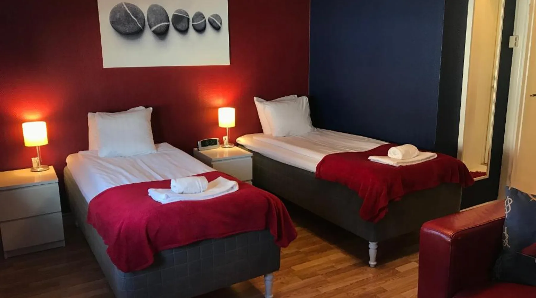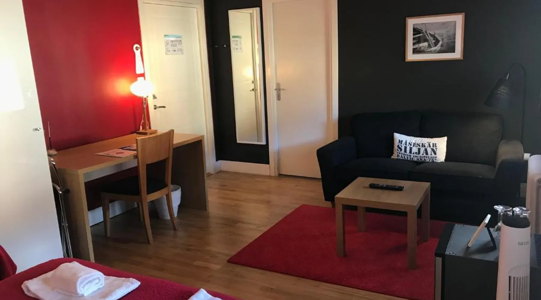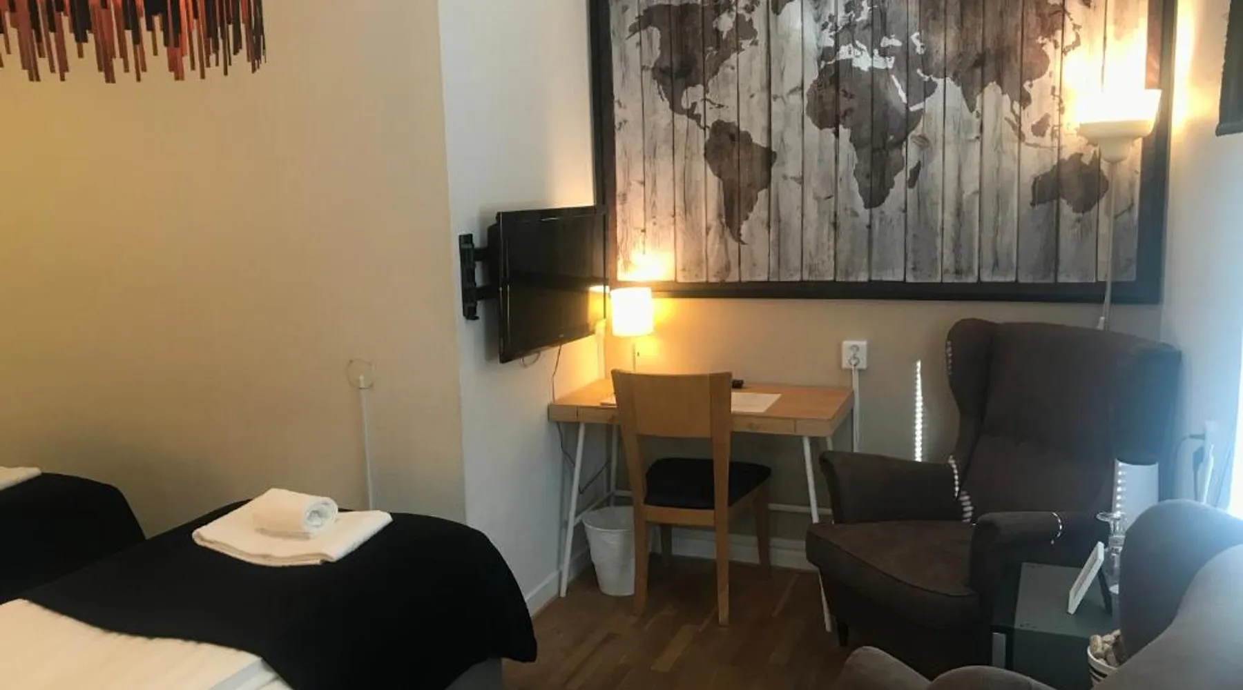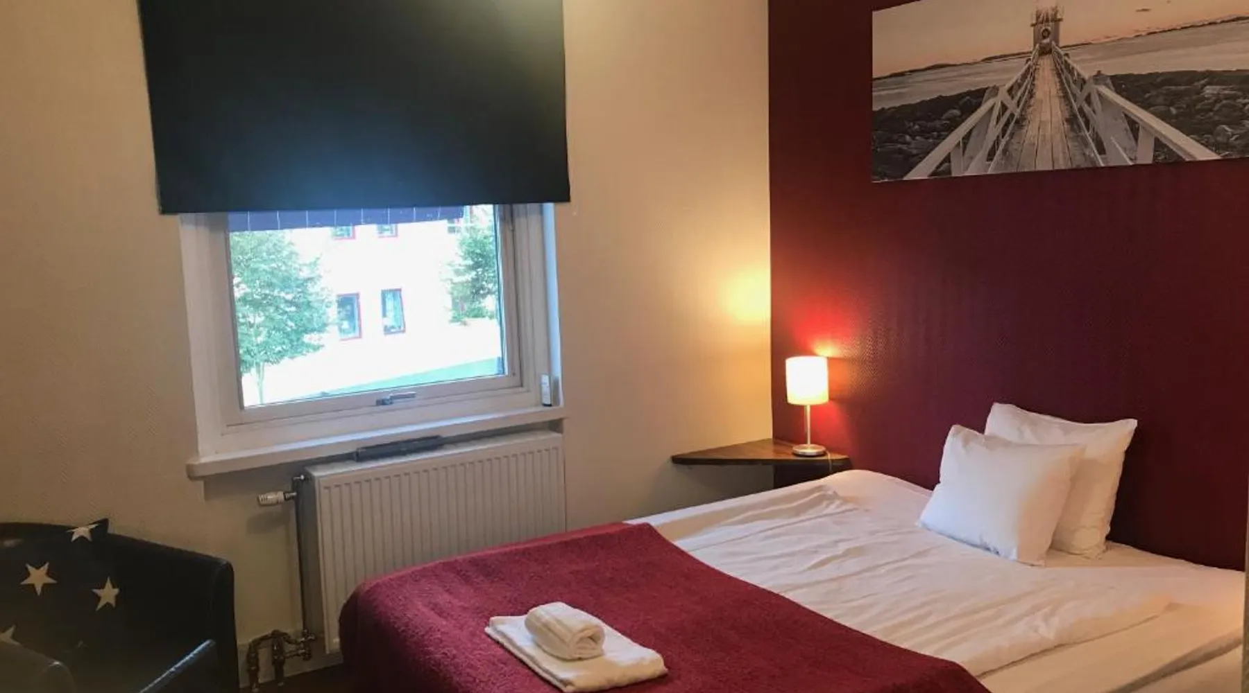 This hotel is located on the main street of Karlshamn, 2133 feet from Stortorget main market square. It offers free WiFi and a large private parking area. Guests can enjoy tea, coffee, fruit and cookies 24-hours at Port Hotel. The bright, marine-themed guest rooms at the hotel feature wooden floors, a mini-bar, desk, flat-screen TV and a comfortable armchair or sofa. Port Hotel serves a large buffet breakfast with more than 120 products. Free bicycles are available at the hotel to explore the surroundings, such as the harbor located 0.6 mi away. A seating area with a flat-screen TV, a desk and a private bathroom are provided in this spacious family room. The unit offers 5 beds.