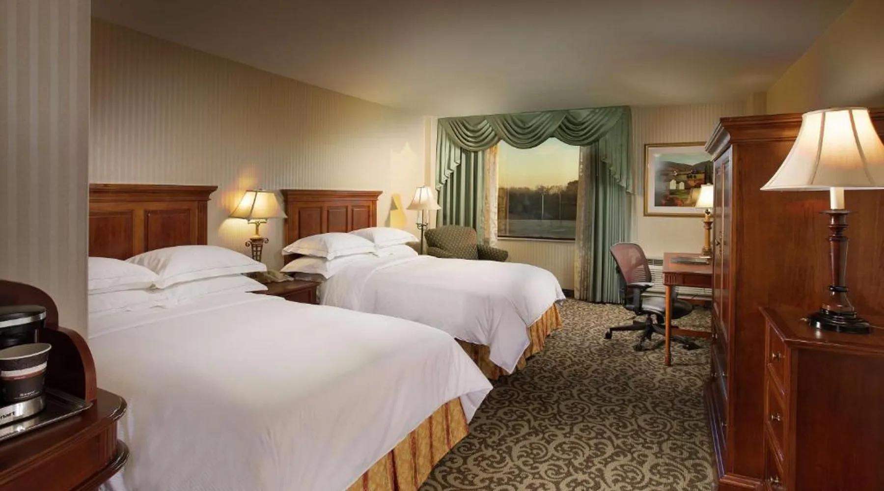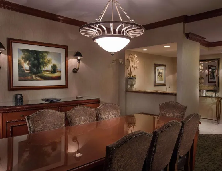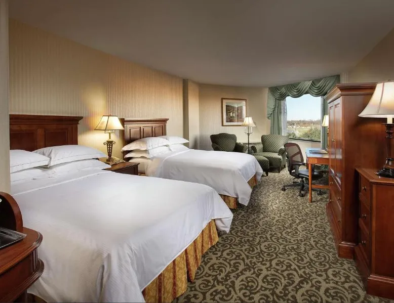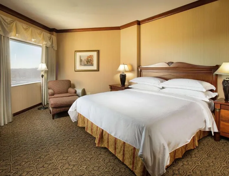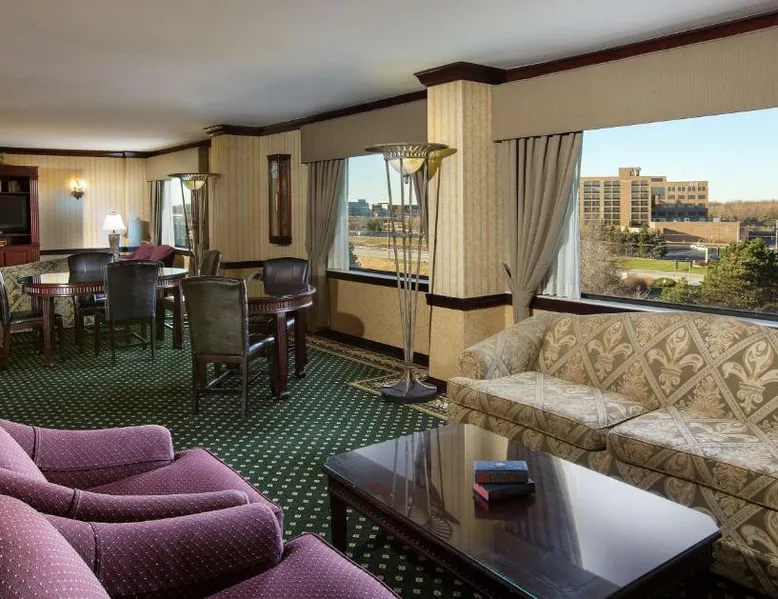 Comfortable Accommodations: DoubleTree by Hilton Lisle Naperville in Lisle offers family rooms with air-conditioning, free WiFi, and amenities such as tea and coffee makers, work desks, and flat-screen TVs. Exceptional Facilities: Guests can enjoy a swimming pool with a view, indoor pool, fitness center, sun terrace, and hot tub. Additional facilities include a restaurant, bar, and lounge. Dining Experience: The family-friendly restaurant serves American cuisine with vegetarian, vegan, and gluten-free options. Breakfast is available in-room. Convenient Location: Located 20 mi from Chicago O'Hare International Airport, the hotel is near attractions like United Center (25 mi) and Willis Tower (27 mi). Free on-site private parking is provided. The family room offers a tea and coffee maker. The unit has 1 bed.