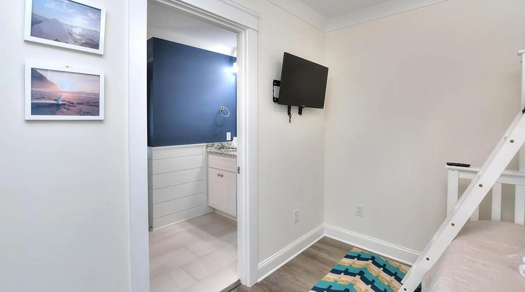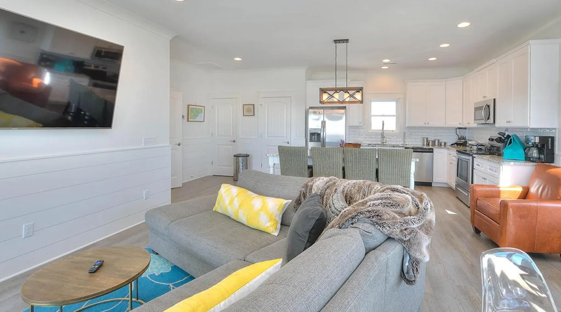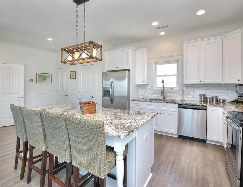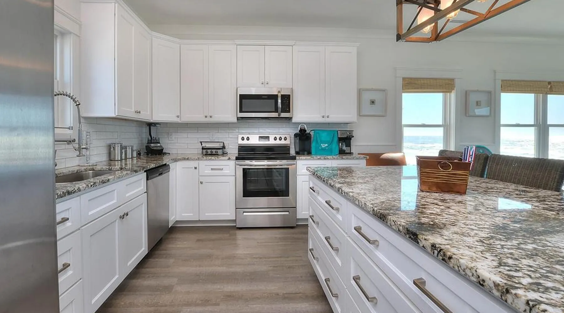 Brand New, Beautifully Decorated, 5 Bedroom/3.5 Bath Oceanfront Home-Sleeps13 The space Beach Plzzz - 5 Bedroom 3.5 Bath House, Sleeps 13 Unbelievable custom, brand new, oceanfront 5 bedroom, 3.5 bath home. This spacious new construction home is full of extras. Luxury Vinyl Plank throughout and tile floors in all baths. This beautiful home also has ship-lap accents throughout. Step into the kitchen with a large island bar area. Anyone lucky enough to work in this space will admire the views as well as the open concept. The kitchen offers granite countertops and a large eat-in island that you can multitask as a puzzle or game center. Extras include a panini press, ninja food grill, air fryer, and a large roaster. The higher end moldings and ship-lap accents throughout are a nice touch and give a beach feel. Great attention was paid to all the detail put into the property from the built-in bunk beds to the Pottery Barn décor. This home has two covered porches on the oceanfront so you can enjoy the unobstructed views down the beach and the breathtaking ocean blues. When you come off the beach, leave the sand in the outside hot/cold shower. This home is close to visit local restaurants, shopping, parks, & entertainment. Make this beautiful home your choice beach destination and you will be glad you did! Standard Features: - Bed linens and towel sets (shower towel, hand towel and washcloth) provided per the capacity of the house - Fully equipped kitchen - Free WIFI - Drip Coffee Maker - Washer/Dryer - Iron/ironing board - Departure housekeeping - Non-smoking Notable & Unique Features: - Brand new home built in 2020 - New to the rental market - Event home (additional fee for events) - Oceanfront with beautiful ocean sunrises and sunsets - Located in the heart of Oak Island convenient to great shops, dining, golf, sky diving and other fun activities - Short 10-15 minute drive to historic Southport - Beds: 1K, 2Q,1 BB T/D, 2 BB T/T - Private master suite - Baby crib and high chair provided by caring owner - Entertainment: Extended cable. Flat screen Smart TVs. Amazon Prime. DVD player. Games and puzzles. TVs in all bedrooms. - Granite countertops - Stainless steel appliances - Extra Kitchen Appliances: Panini Press. Ninja Foodi Grill. Air Fryer. Large roaster. - Large island breakfast bar in kitchen - Luxury Vinyl Plank flooring throughout - Tile floors in all bathrooms - Open concept floor plan - High-end molding and shiplap accents - Large capacity washer/dryer - Two covered oceanfront porches - Hot/cold outside shower - Charcoal Grill - Covered parking - No pets allowed **Exterior video monitoring on-premises**