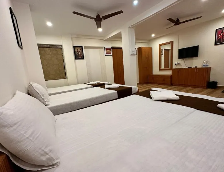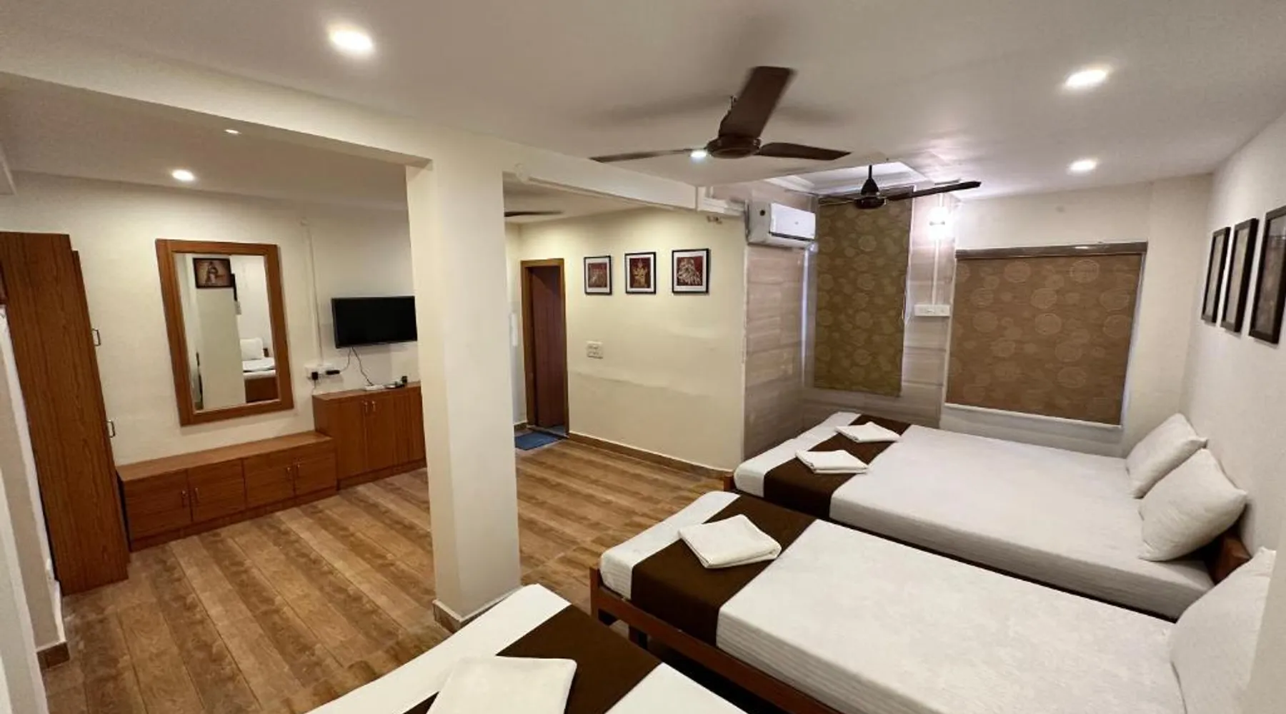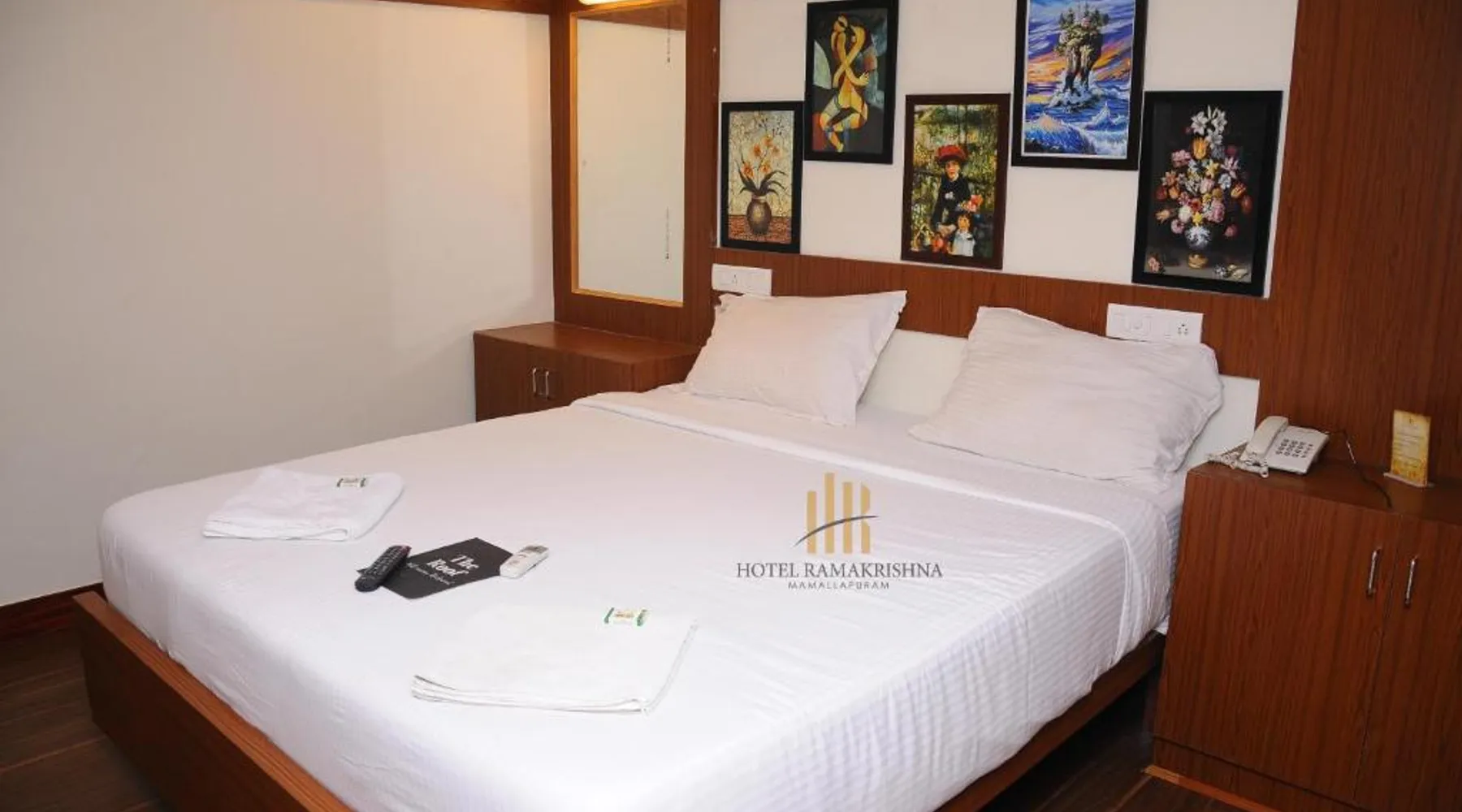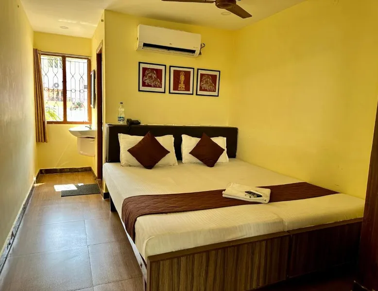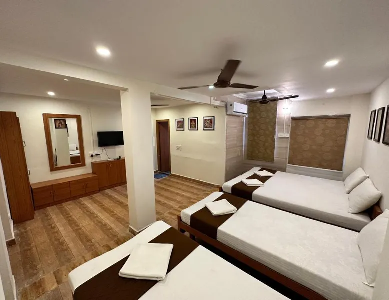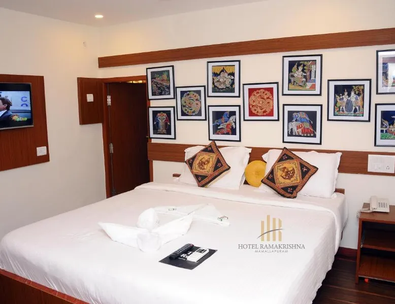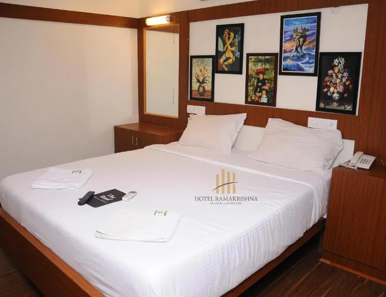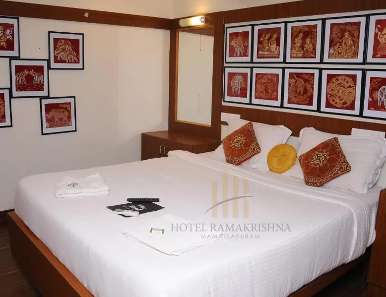 Comfortable Accommodations: Hotel Ramakrishna in Mamallapuram offers family rooms with air-conditioning, private bathrooms, and free WiFi. Each room includes a TV, wardrobe, and tiled floors. Convenient Facilities: Guests benefit from private check-in and check-out, a 24-hour front desk, concierge service, and a coffee shop. Additional services include a paid shuttle, elevator, bicycle parking, and free on-site private parking. Prime Location: Located 33 mi from Chennai International Airport, the hotel is a 2-minute walk from Pallava Beach. Nearby attractions include Arignar Anna Zoological Park (27 mi) and Nithya Kalyana Perumal Temple (12 mi). Guests appreciate the convenient location. This air-conditioned family room has a private bathroom, a seating area, a dining area as well as a patio. The unit has 2 beds.