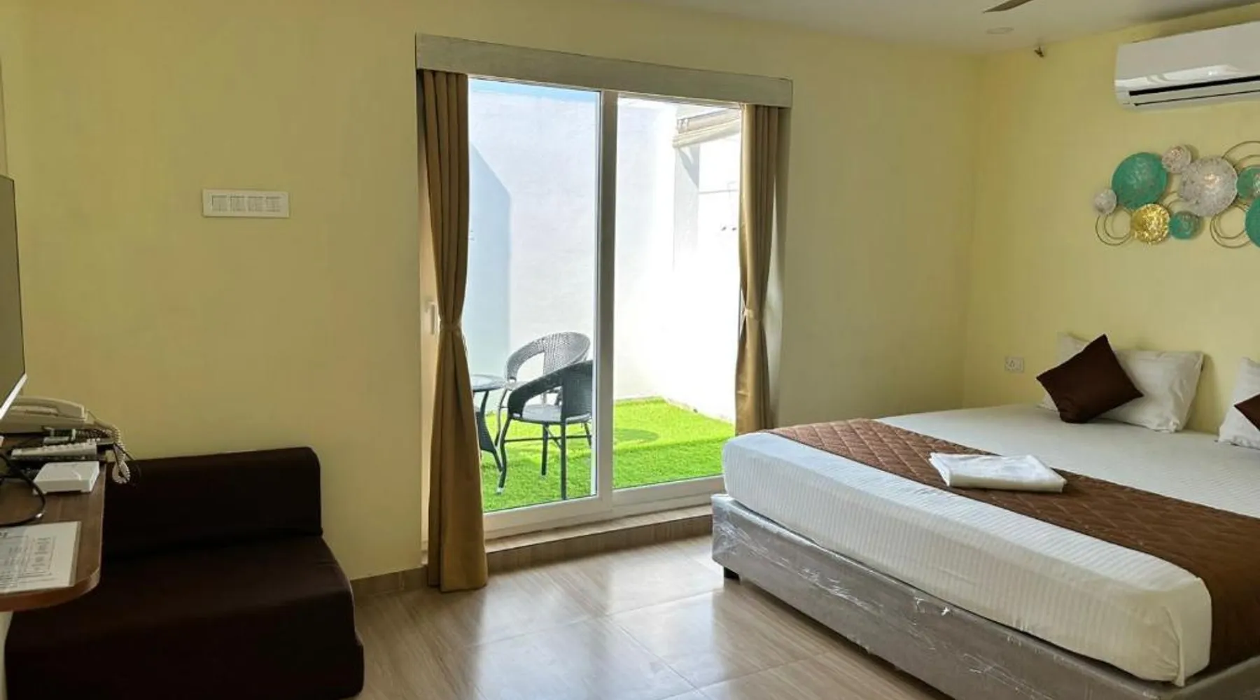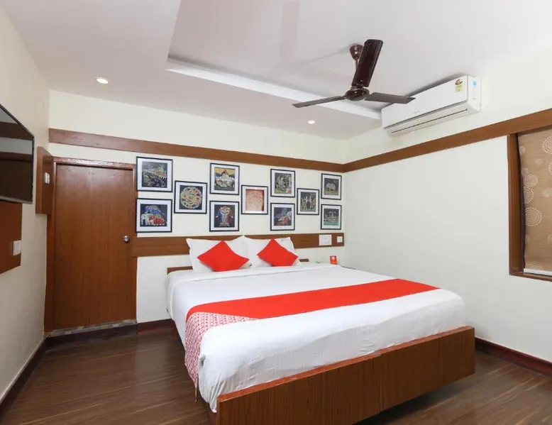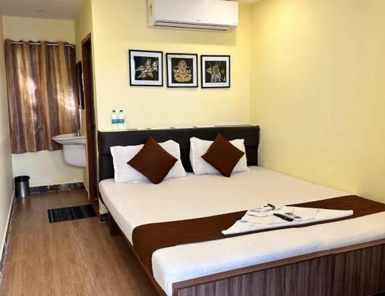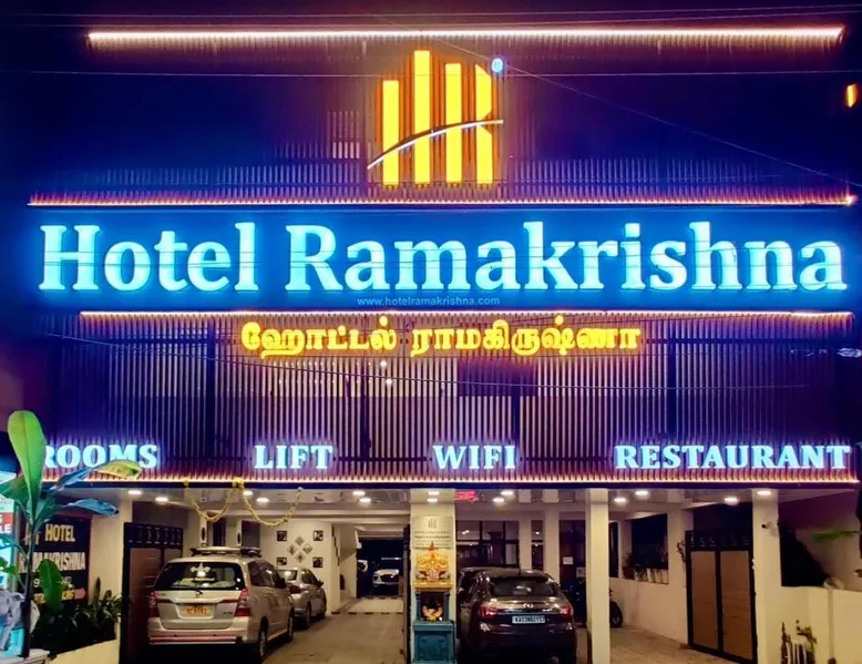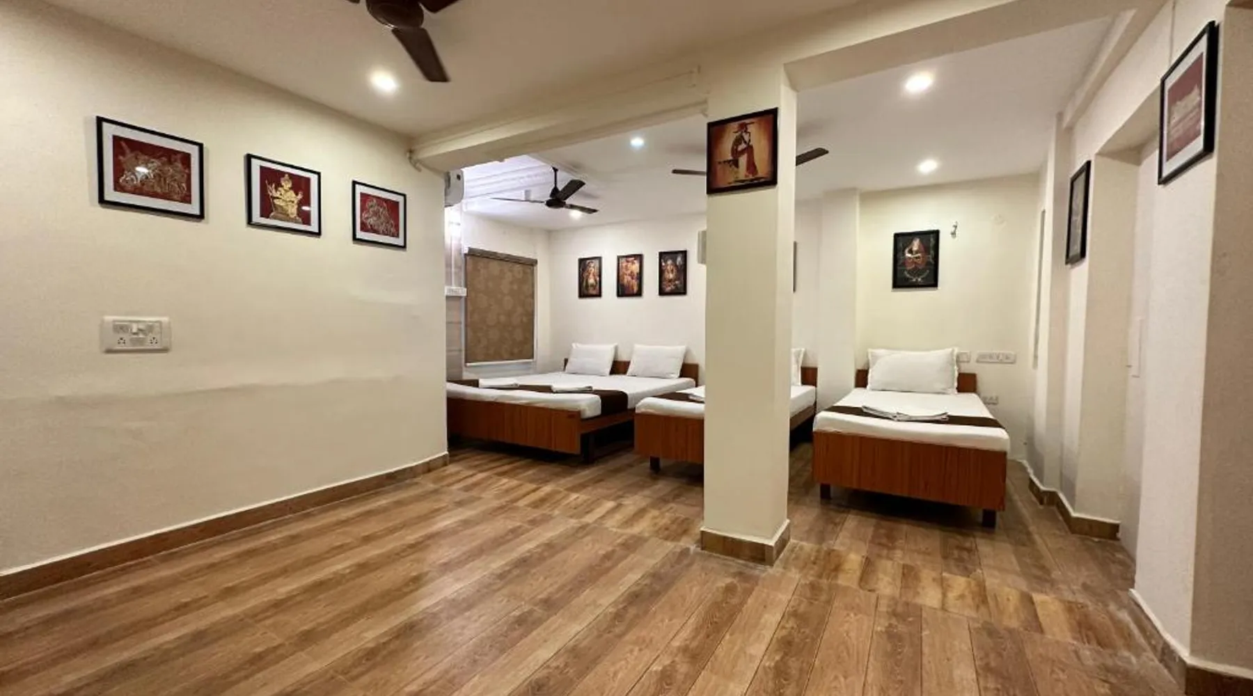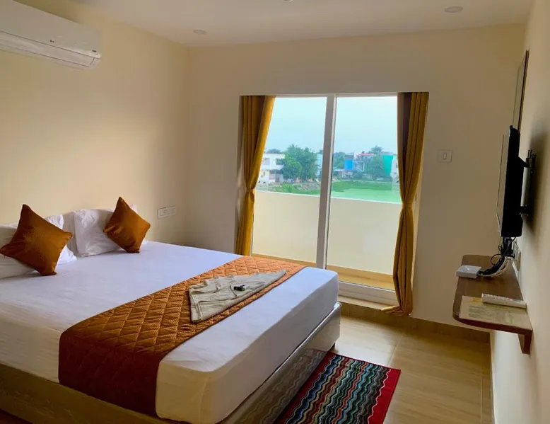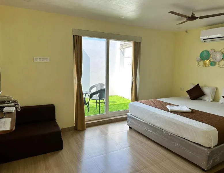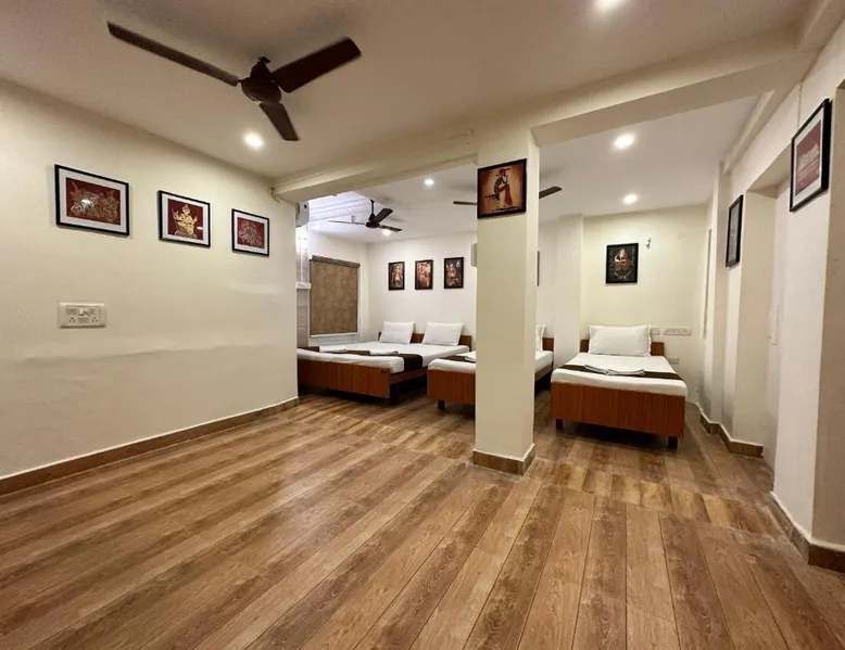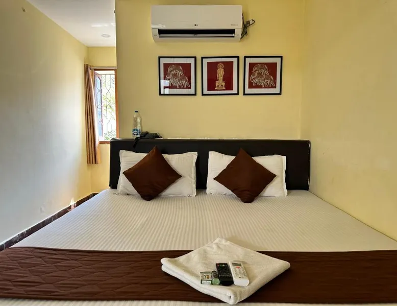 Comfortable Accommodations: Hotel Ramakrishna in Mamallapuram offers family rooms with air-conditioning, private bathrooms, and free WiFi. Each room includes a TV, wardrobe, and tiled floors. Convenient Facilities: Guests benefit from private check-in and check-out, a 24-hour front desk, concierge service, and a coffee shop. Additional services include a paid shuttle, elevator, bicycle parking, and free on-site private parking. Prime Location: Located 33 mi from Chennai International Airport, the hotel is a 2-minute walk from Pallava Beach. Nearby attractions include Arignar Anna Zoological Park (27 mi) and Nithya Kalyana Perumal Temple (12 mi). Guests appreciate the convenient location. This air-conditioned family room has a private bathroom, a seating area, a dining area as well as a patio. The unit has 2 beds.