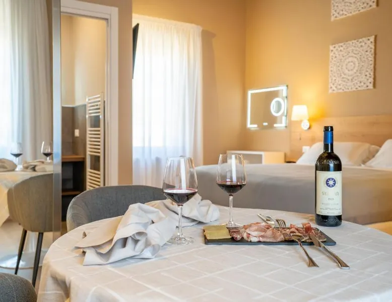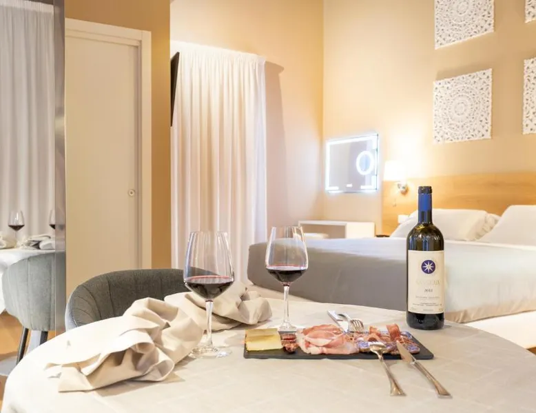 Historic Setting: GG8 Hotel & Suite SPA in Gualdo Tadino is housed in a historic building, offering a unique and charming atmosphere. Comfortable Accommodations: Rooms feature air-conditioning, private bathrooms, hypoallergenic bedding, and free WiFi. Additional amenities include mini-bars, work desks, and soundproofing. Dining Options: The modern, family-friendly restaurant serves Italian cuisine with vegetarian and gluten-free options. Breakfast includes continental, buffet, and Italian selections. Leisure Facilities: Guests can relax on the terrace or hot tub, enjoy the sauna, or take advantage of the fitness center. Prime Location: Located 25 mi from Perugia San Francesco d'Assisi Airport, the hotel is near attractions such as Perugia Cathedral (29 mi) and Basilica di San Francesco (21 mi). The hot tub is the standout feature of this double room. Featuring free toiletries and bathrobes, this double room includes a private bathroom with a bath, a shower and a bidet. The air-conditioned double room features a flat-screen TV, soundproof walls, a mini-bar, a wardrobe as well as city views. The unit has 1 bed.