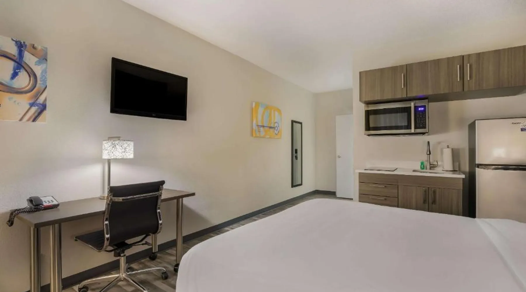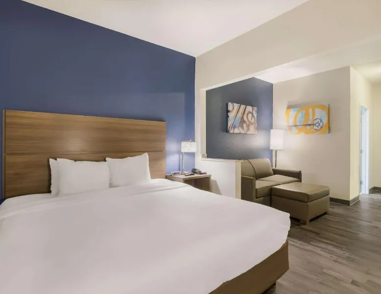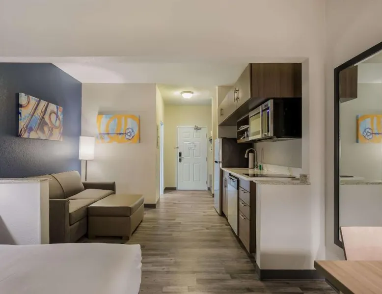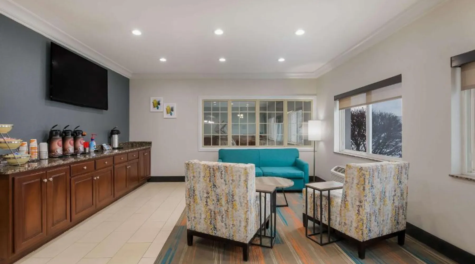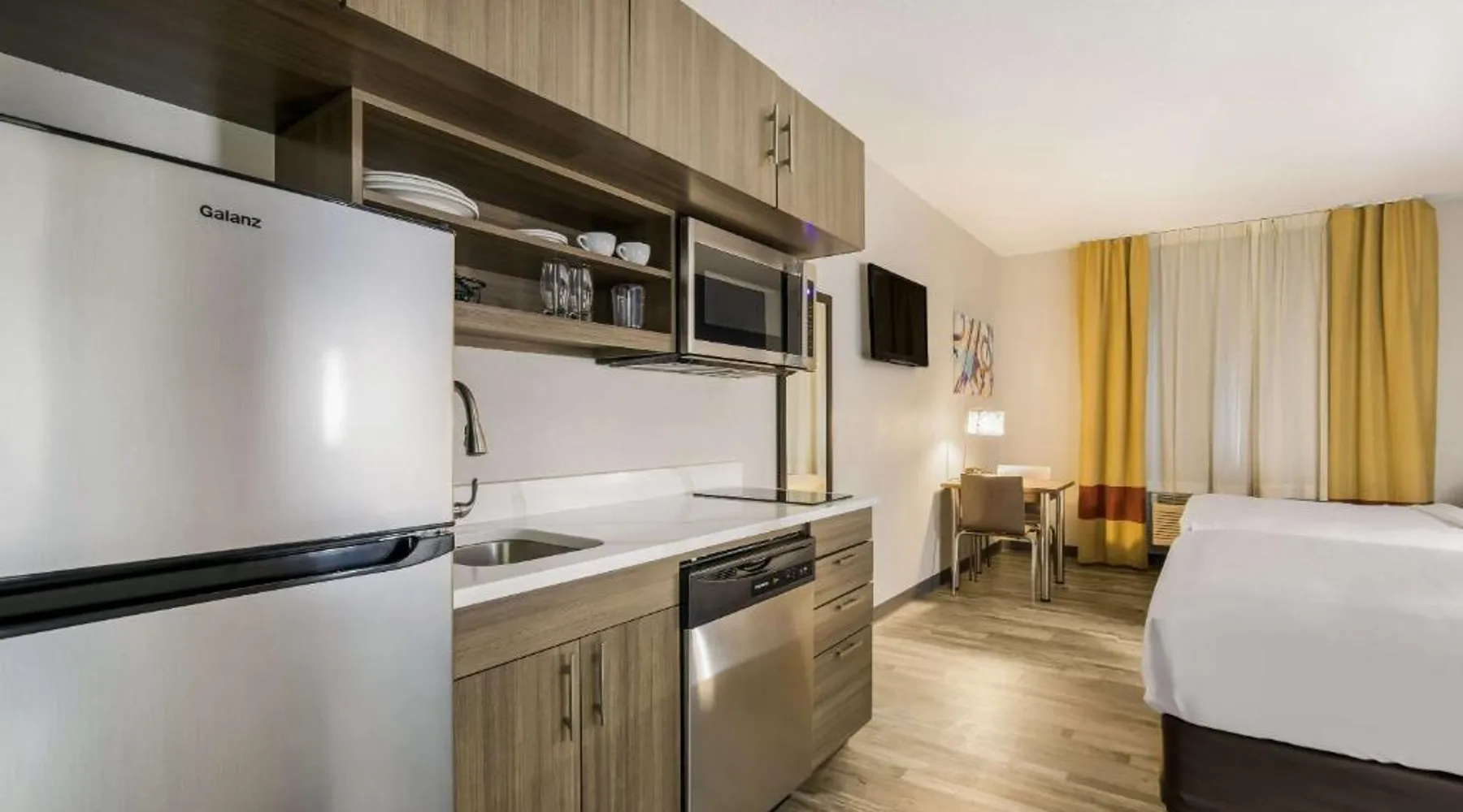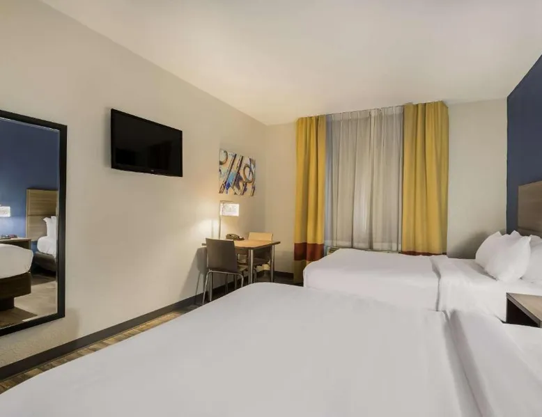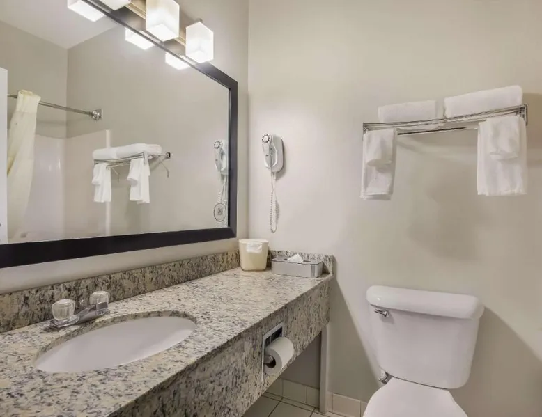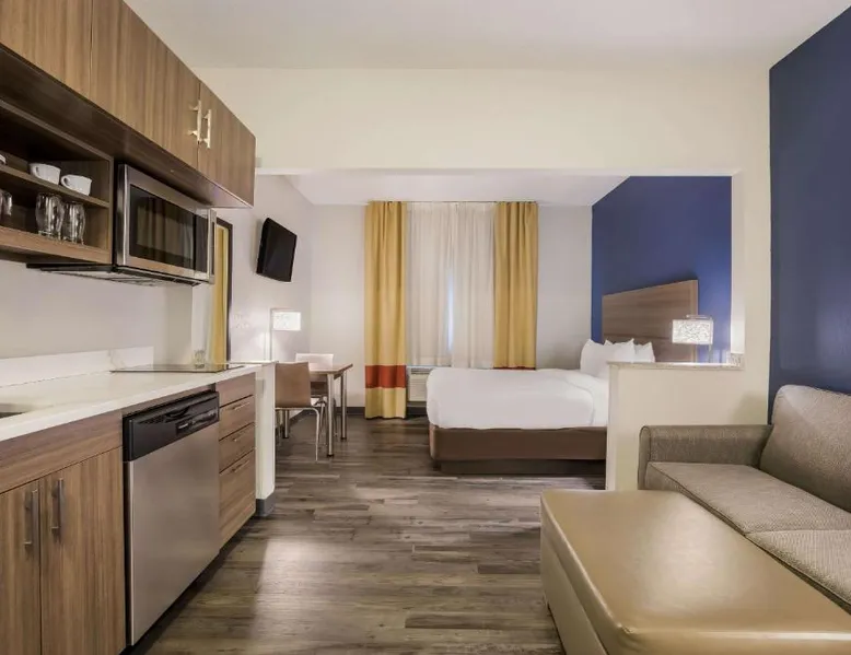 Comfortable Accommodations: MainStay Suites Joliet I-80 in Joliet offers air-conditioned rooms with private bathrooms, kitchenettes, and free WiFi. Each room includes a dining table, sofa bed, and TV. Convenient Facilities: Guests benefit from a elevator, 24-hour front desk, minimarket, and express check-in and check-out services. Free on-site private parking is available. Local Attractions: The hotel is 34 mi from Midway International Airport and near attractions such as Joliet Area Historical Museum (3.1 mi), Chicagoland Speedway (6.8 mi), and Ruffled Feathers Golf Course (16 mi). In the well-equipped kitchenette, guests will find a stovetop, a refrigerator, a dishwasher and kitchenware. This air-conditioned suite is consisted of of a flat-screen TV with cable channels and a private bathroom.