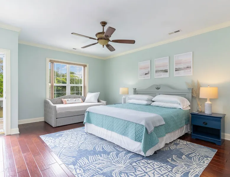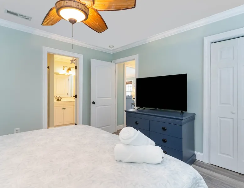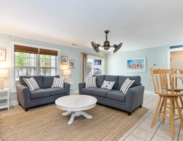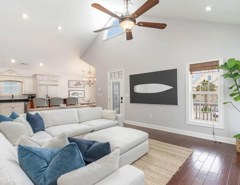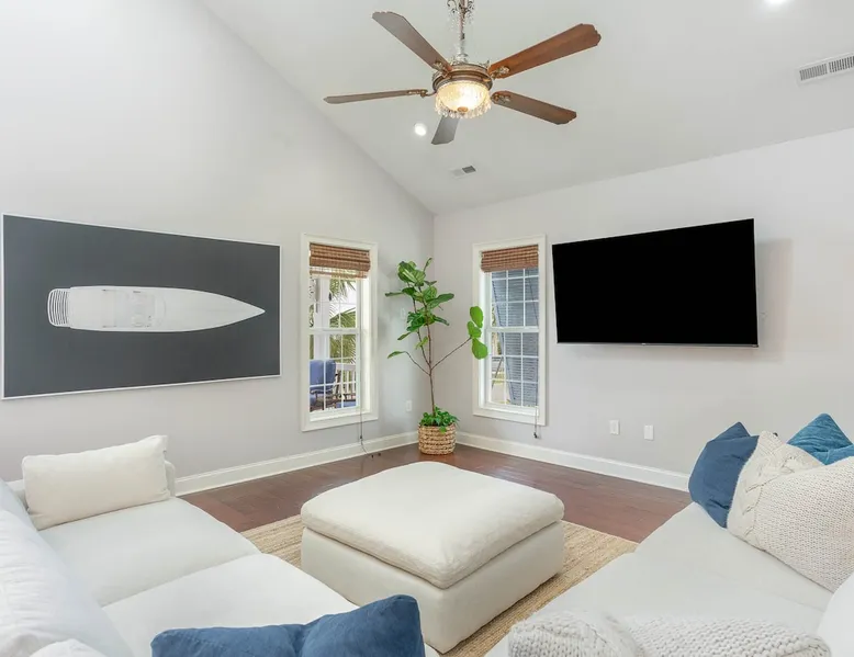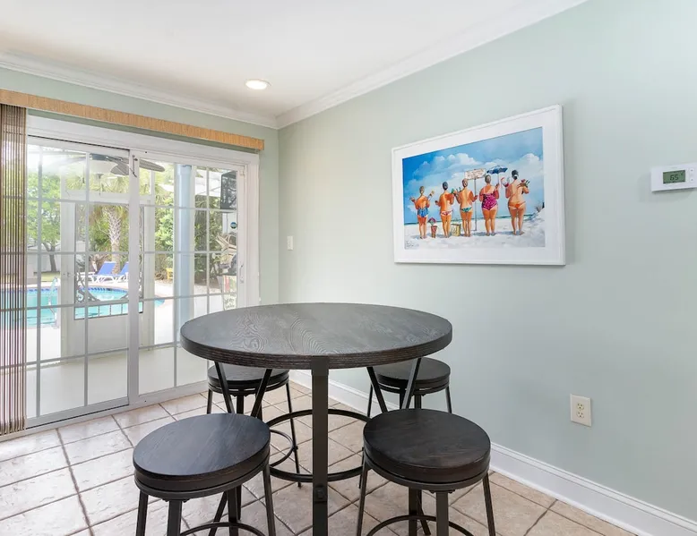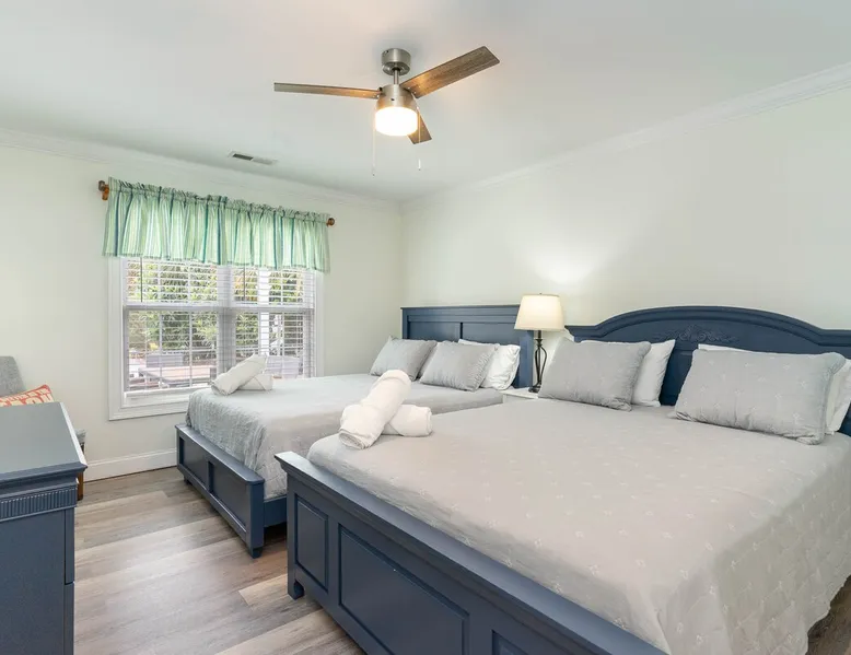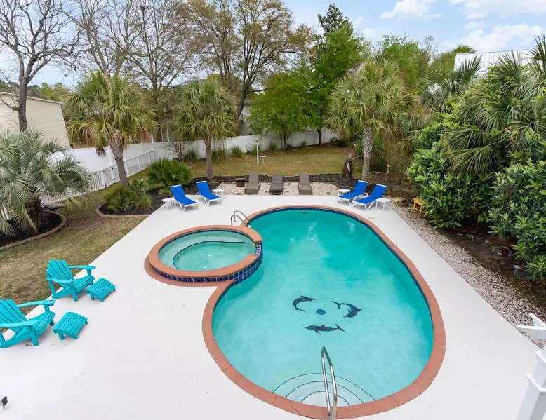Welcome to our spacious 5-bedroom, 4.5-bath coastal retreat in Surfside Beach, SC- designed for families and groups seeking both comfort and convenience. Whether you're relaxing by the private saltwater pool, cooking in one of two full kitchens, or heading to the beach just minutes away, this home has everything you need for an unforgettable stay. Booking Saturday to Saturday only during June, July and Aug. Other month's off peak please inquire. The space This luxurious 5-bedroom home is perfect for a family vacation or a group getaway. With 4.5 bathrooms, there is plenty of space for everyone to get ready without feeling cramped. The two living rooms and two kitchens allow for plenty of space to relax and entertain, with all the necessary appliances and amenities provided. Take a dip in the salt water private pool or relax on one of the two outdoor decks while enjoying the beautiful backyard area. The spacious back yard is perfect for playing games like corn hole. Inside, the home is beautifully decorated and features a 75" Smart TV in the living room, making it a great place to gather and watch movies or TV shows. The fully equipped kitchen features a gas stove with 4 burners, large refrigerator, dishwasher, microwave, and coffee maker, allowing you to easily prepare meals and snacks for your group. The bedrooms are all spacious and well-appointed, with comfortable beds and smart TVs in all of them. BR 1 has 2 twins over queen bunk beds and a private bathroom, making it perfect for kids. BR 2 has a king bed and a twin day bed with trundle, as well as a private bathroom. BR 3 has a king bed and its own bathroom, while BR 4 has a king bed and BR 5 has 2 queen beds. BR 4 & BR 5 share a full bathroom. All bedrooms have plenty of closet space. One of the best features of this home is the easy access to the lower level without having to walk up any stairs. The lower level features a full living room with a pull-out queen sleeper sofa, a kitchen with all the necessary appliances, and a dining area. BR 4 & BR 5 and a full bathroom are also located on this level. Enjoy the beautiful weather on the full enclosed screened porch with a TV and fans. With central A/C throughout the home, you will stay comfortable no matter what the weather is like outside. Book your stay in this luxurious and spacious home for your next vacation and create unforgettable memories with your loved ones. Guest access Access to entire home except inside the garages. Other things to note Requested mandatory information needed 48 hours prior to your arrival for security protocol for access into the community. Renters must be 25 and older to book our home no exception, Hoa rules. Number of adults & children, First & Last Name, Email address, home address, phone number, make, model and color of vehicles, tag information and state. Street parking is prohibited at this property. There is no parking garage available for this property. Overflow parking is available with a pass from the security gate. Driveway (5 vehicles), no street parking, no parking garage. 2 golf cart allowed max. If you need to rent more than 2 golf carts during your stay you will have to park your vehicles in overflow lot to allow more space for golf carts. Golf carts are only allowed to be parked on the driveway. No golf carts allowed on the grass. The property requires no steps for entry if you use the lower bottom right entry door. The lower level features a 2-bedroom, 1 bathroom, living room, dining area, kitchen and screen in porch on the lower level; however, all other bedrooms/bathrooms, a 2nd living room, and main kitchen require stair to access.