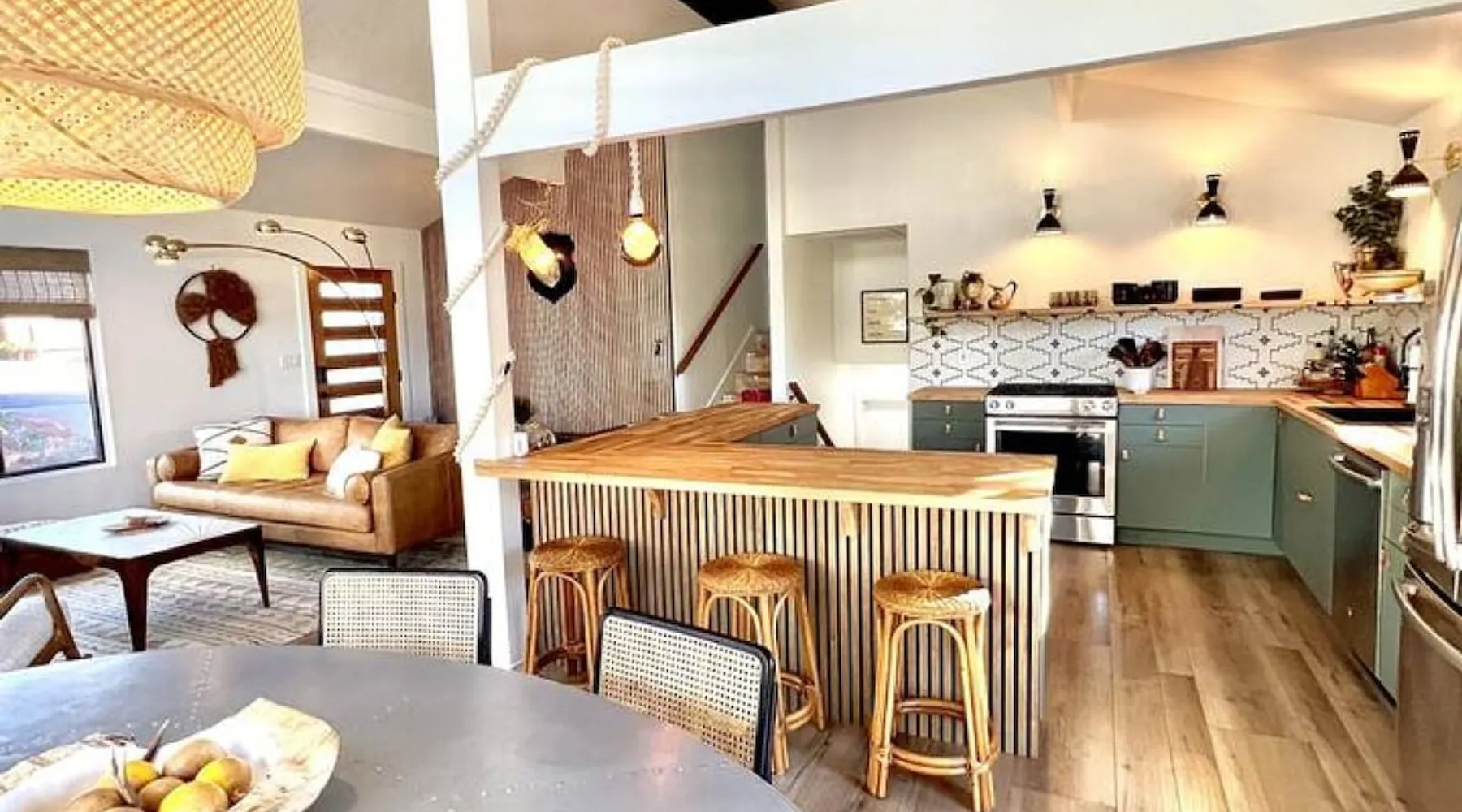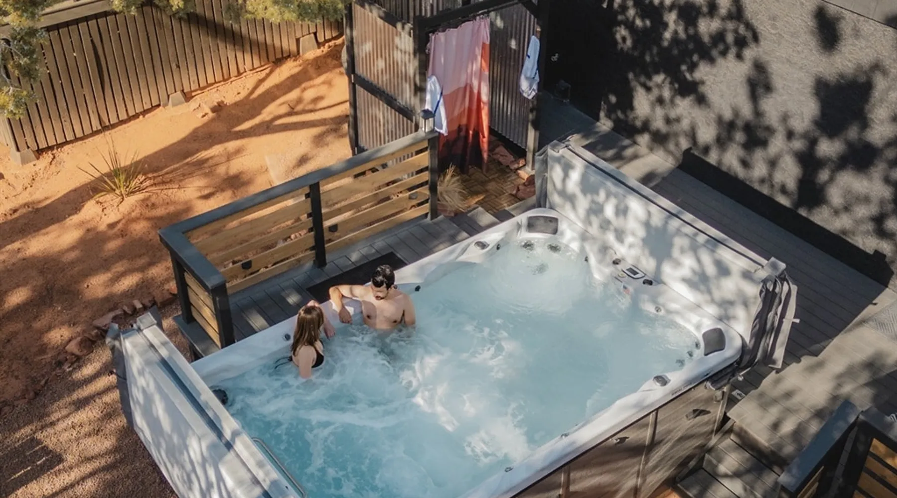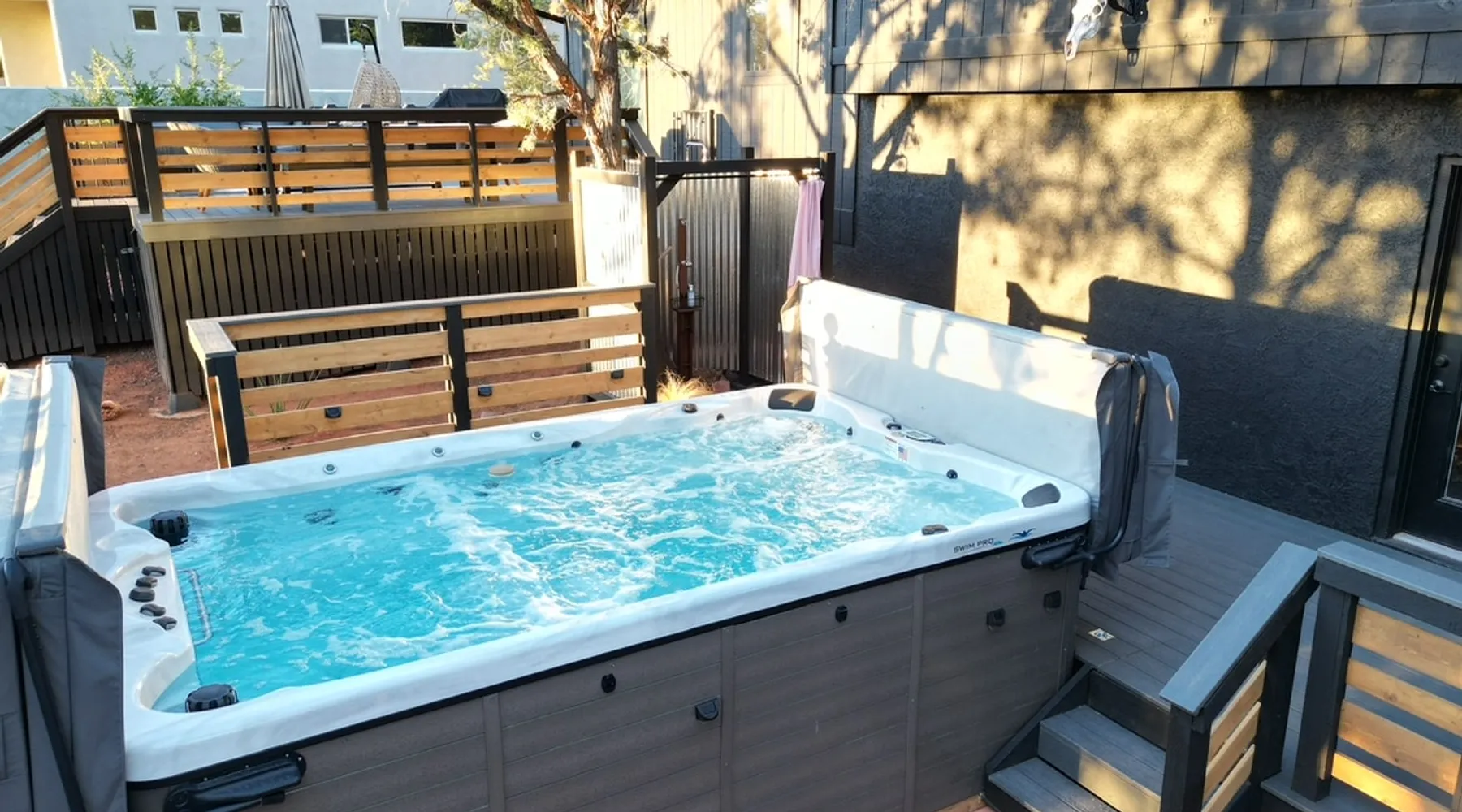 The Essex House Sedona is gorgeously appointed in desert modern style, curated with original art, and features a 17ft long Hydro-pool (addtl nightly fee for spa heat), fire pit, outdoor shower, tetherball, and back deck perfect for entertaining. Great room has a gorgeous vintage Malm fireplace, dining area, and a fully stocked chef's kitchen. Plush bedroom furnishings inspired by Arizona sunsets. Game room with a sectional sofa bed, retro video games & s'mores fixin's. The space THE ESSEX HOUSE SEDONA OVERVIEW Check out ig@essexhousesedona PROS: Multiple large communal areas, fully stocked chef's kitchen, huge hydro-pool, outdoor shower. CONS: Small bedrooms, older windows that sometimes stick. PLEASE NOTE: There is a new house being built on the empty lot behind the Essex House Sedona. Construction started in Oct 2025. Unfortunately, Sedona allows work crews to start at 7am, including Saturdays. There may be potential noise during your stay. As a result, we are waiving our nightly spa heating fee while outdoor construction takes place on the new house. Please reach out prior to booking, and I can update you on the building stage and potential noise. OUTSIDE •Private back yard with a luxe 17ft long Hydro-pool. (Please read detailed Hydro-pool description below regarding extra fee for spa heat) •Outdoor Shower that enhances the backyard vibe •Fire pit with 6 Adirondack chairs for roasting s'mores. (S'mores supplies provided) •Large deck for dining al fresco and adjacent lounge area •Grill *Tetherball GAME ROOM •New sectional sofa bed with memory foam Queen mattress •Smart TV with Sonos sound bar speaker •Game table and games •2 person video game console table with over 30 old school video games •Selection of exercise equipment, including yoga mats and weights •Lower leg and foot massager to help with sore muscles after a day of hiking •Smore's supplies •Washer and dryer *Pack n' Play and highchair •Mini fridge •Sun hat lending library and re-chargable bug zappers •Direct access out to the swim spa, stocked with spa towels and a towel warmer. BEDROOMS: •Master Suite: Queen bed, ensuite bath with oversized shower, Smart TV •Bedroom 2: Queen bed, Smart TV •Bedroom 3: Two twin beds •Game Room: Fold-out memory foam queen bed, Frontgate automatic air mattress (single), Pack n' Play KITCHEN •Fully stocked chef's kitchen •Standard appliances include gas burner stove, toaster, microwave, oven and refrigerator •Extra appliances include air fryer, crockpot, instant pot, electric kettle, blender, mini food processor, electric citrus juicer •Le Creuset dutch oven, baking dishes, baking pans, roasting pan, serving platters, pancake griddle that fits on the stovetop, spaetzle maker, microwave popcorn maker and popcorn supplies •Coffee making supplies include ground coffee and sugar, espresso machine with milk frother attachment, large drip coffee maker with thermos, French press and an Italian Moka pot. •Large tea selection and hot chocolate provided •Other supplies include: drawer full of various spices, olive oil, salt and pepper •Knife block has sharpeners built into it. Naturally, the kitchen is also stocked with basic dining, cooking and serving essentials including plates, bowls, silverware, stemless wine and drinking glasses, cooking utensils and kitchen accessories, such as can opener, wine opener, meat thermometer, measuring spoons and more. There is a set of plastic plates and cups if you wish to dine outside. No other cooking supplies are guaranteed, but likely to include oil, sprays or other cooking ingredients, foil, cling wrap, etc. We recommend assessing current kitchen stock before shopping for any meals you plan to prepare! LIVING ROOM •Open plan great room with kitchen, dining area and living area combined. •Siding doors with direct access to the back deck •Vintage 1960's brass Malm fireplace with electric fireplace insert. Heat optional. Turns on with a touch of a button. •Sonos speakers connected on the Essex House wifi Hydro-Pool 17-foot CalSpa Hydro Pool with waterfalls (Vegas package!) and LED lighting. It is a cross between a hot tub and a pool. High resistant jets enable you to swim in place. Normal resting temp is 85F - 95F. If you prefer to soak after hiking, and would like us to heat up the swim spa (to 104F) for your stay, please contact the house manager 24 hours in advance of your arrival. Heating fee is $50 per night or $200 for stays 4 nights or longer in a given week. During the hotter months of the year, guests normally do not request any additional spa heat. The Hydro-pool requires maintenance visits twice weekly on various days. The service tech needs access to the back yard to maintain water balance. The tech will access the back yard using the padlocked side gate. It usually takes around 15-20 min to service the Hydro-pool. Note: You will be charged $250 if your usage results in the hydro-pool needing extraordinary cleaning or to be drained. Please shower before using. No food and drink in the hydro-pool. Please follow the hydro-pool rules as posted in the game room and on the front of the hydro-pool itself. OTHER THINGS TO NOTE: •We require all of our guests to sign a rental agreement before staying at the Essex House Sedona. We send it out after booking and you will be able to do an electronic signature online. WE ALSO HAVE: •Fast Starlink Satellite Internet •Built-in work desk with a landscape mural painted by your hostess. •Whole house water softening system •2 outside security cameras. One is positioned on front door entrance and one on the back gate entrance. Camera actively records video and audio when it senses motion. •Essex House Sedona does not have any child safety setups. However, the back deck has closable gates at each set of stairs. The hydro-pool does not have any safety baby gates. We do provide a pack n' play, a high chair, and a few baby plates, cups and utensils. INCLUD