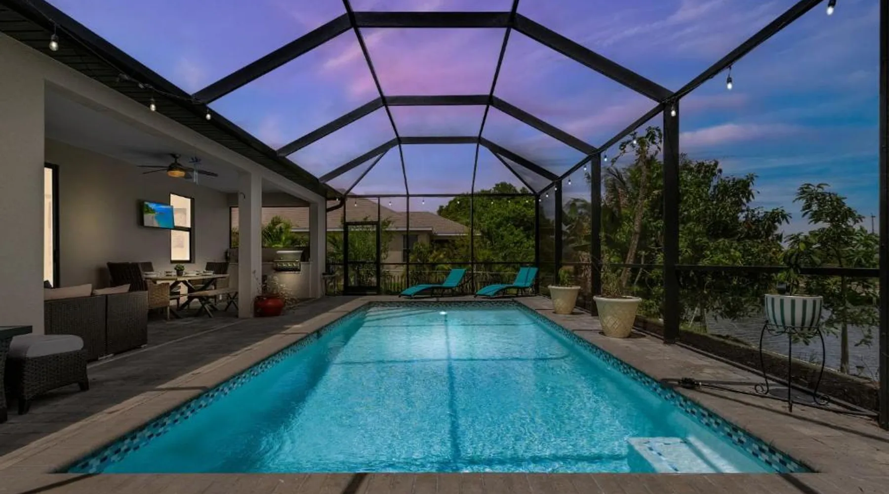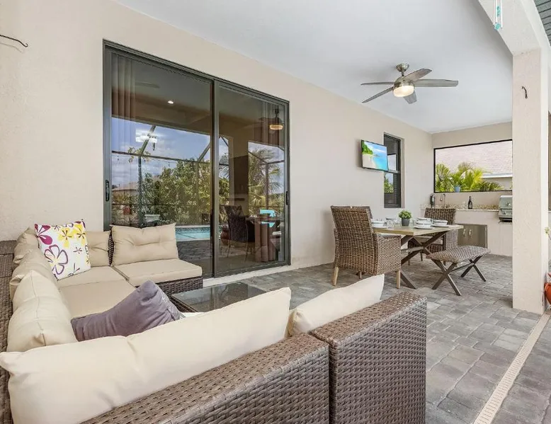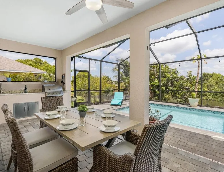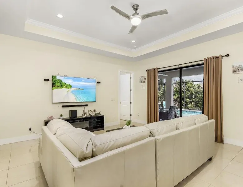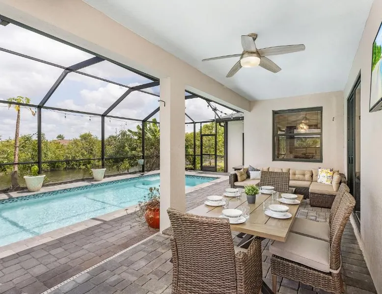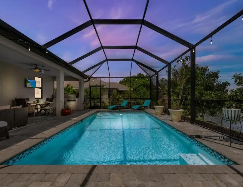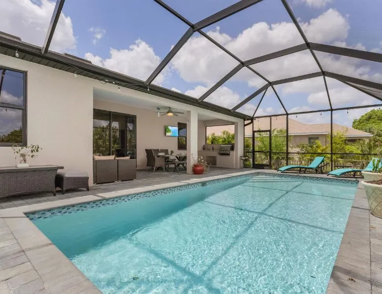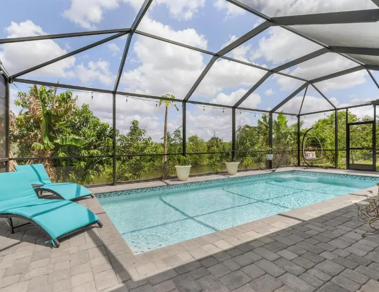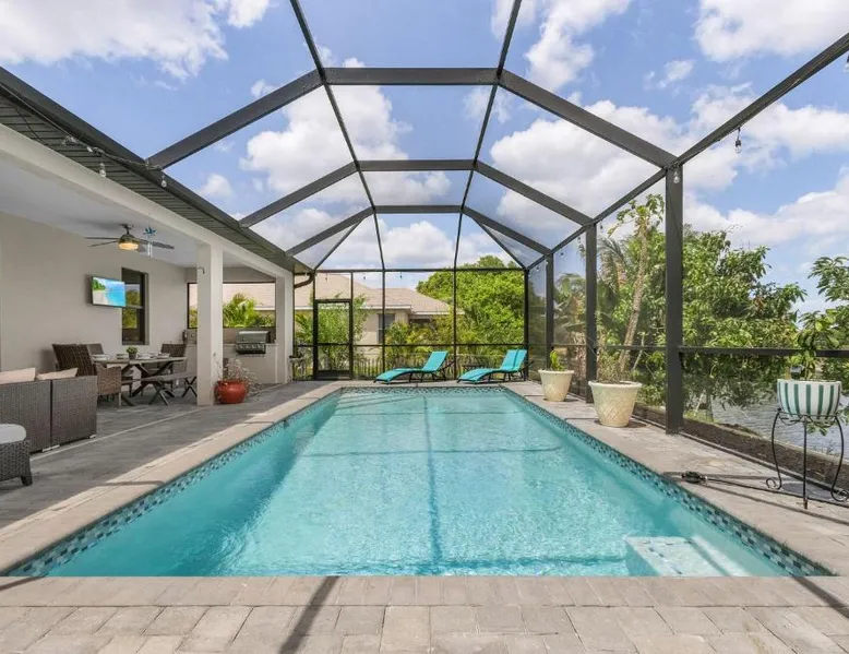 Spacious Holiday Home in Cape Coral: Villa Tropical Fruits offers a spacious holiday home in Cape Coral. The property features four bedrooms and three bathrooms, ensuring ample space for all guests. Exceptional Facilities: Guests can enjoy a saltwater swimming pool, sun terrace, and free WiFi. Additional amenities include a waterpark, outdoor seating area, family rooms, and a games room. Comfortable Living Spaces: The holiday home is equipped with air-conditioning, a fully fitted kitchen, and a washing machine. Outdoor areas include a patio, barbecue, and dining area, providing relaxing spaces. Convenient Location: Located 21 mi from Punta Gorda Airport, the property is close to attractions such as Fishermen's Village (21 mi) and Sanibel Lighthouse (27 mi). Free on-site parking is available. Guests will have a special experience as this holiday home provides a pool with a view. Guests will find a stovetop, a refrigerator, a dishwasher and kitchenware in the fully equipped kitchen. The holiday home also has a barbecue. The spacious air-conditioned holiday home offers a TV, a washing machine, a private entrance, a tea and coffee maker as well as pool views. The unit offers 5 beds.