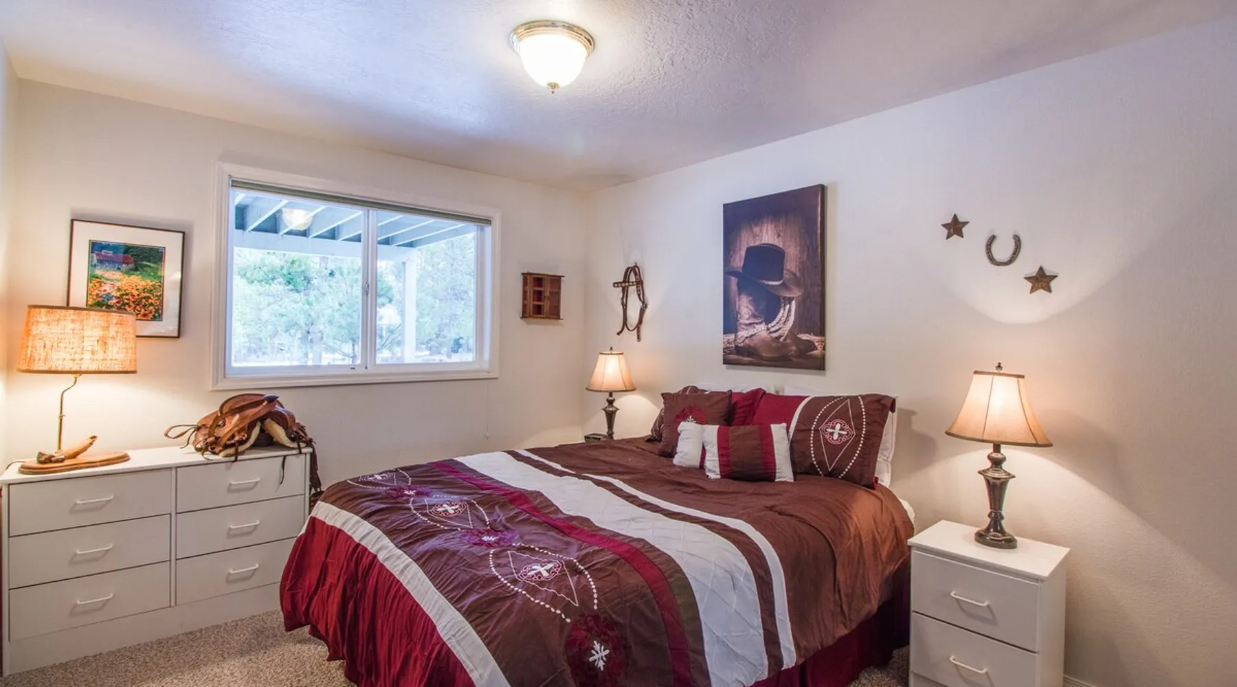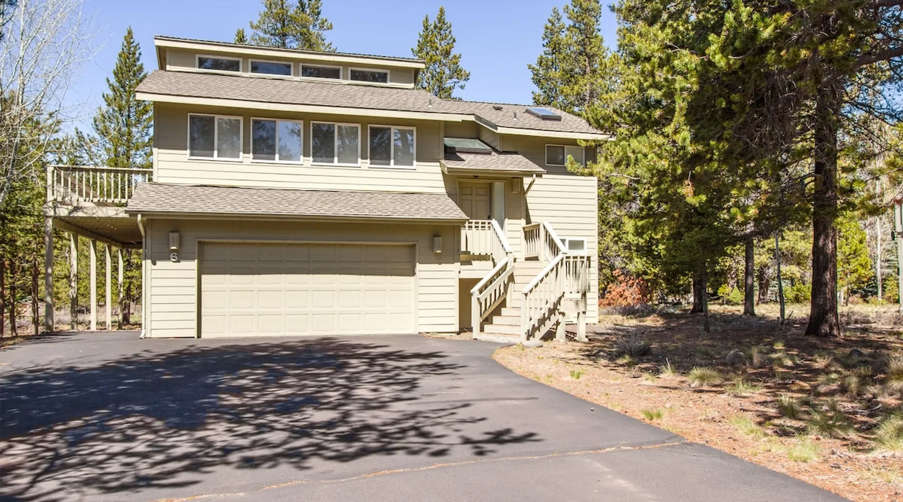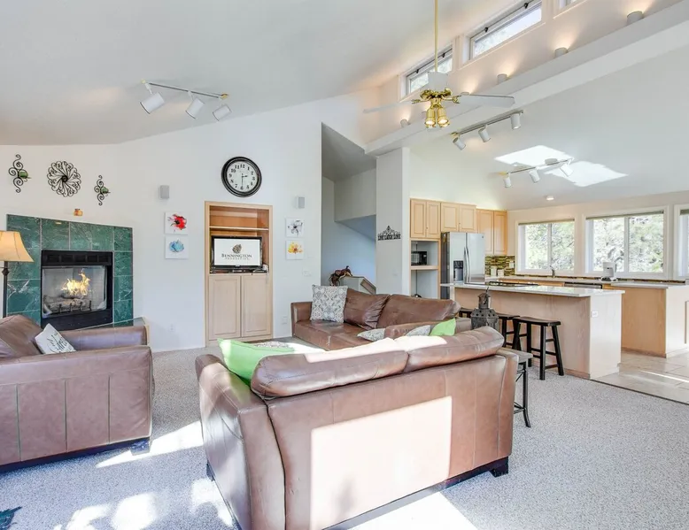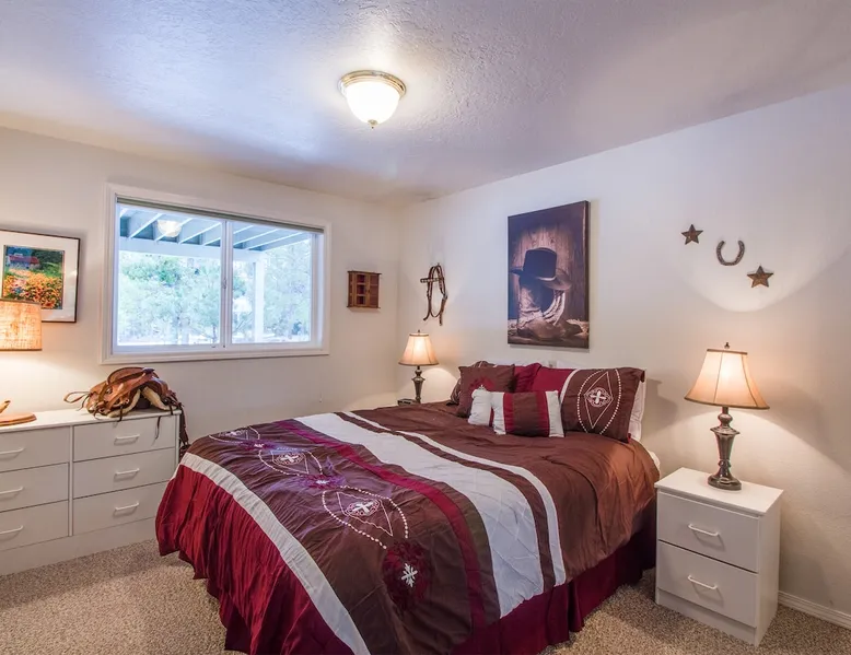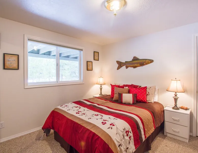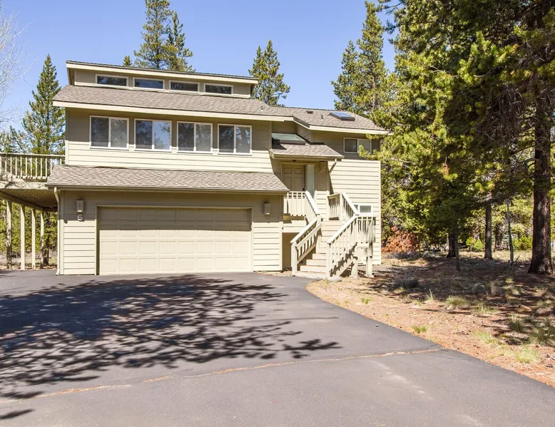 This comfortable Sunriver vacation rental home is perfect for several couples or a small group of up to 6 guests Home access information will be sent 7 - 10 days prior to arrival. All homes are set up for self check-in, no need to stop by the office, just go straight to the home. Sunriver is located at the foothills of the Cascade Mountains in Central Oregon. We enjoy 300 days of sunshine and a climate that is perfect for year round activities. Mt. Bachelor is a quick 30-45 minute drive away, the Deschutes River is in our back yard and the pristine Cascade Lakes are a short drive away. Plus so much more golfing, biking, kayaking, hiking, white water rafting, skiing, rock climbing and more. The resort community is compact at 4 miles long (north to south) and 2 miles wide (east-west). It's easy to get around on over 33 + miles of paved pathways. Welcome to Shag Bark 6! - 3 Bedrooms, 2 Bathrooms, Sleeps 6 - Private Hot Tub - Air Conditioning, Gas Fireplace - Ping Pong Table, Bikes This comfortable Sunriver vacation rental home is perfect for several couples or a small group of up to 6 guests; a reverse living layout provides for good separation with the living, dining, kitchen and primary ensuite bedroom located on the light-filled second story, and the two guest bedrooms, shared bathroom, and laundry facilities nestled downstairs on the ground level. The vaulted ceilings and large wrap-around windows let lots of light pour into the spotless kitchen with corian countertops, stainless appliances, and a glass flat top range. Pull up a barstool to the large island or sit down to dinner at the adjacent wooden dining table with seats for 6. Head out the sliding glass doors leading from the dining and living areas onto the large, upper deck, providing convenient access to the gas BBQ grill, patio seating and the hot tub. The living room is comfortably furnished with two leather sofas where you can cozy up to the gas fireplace and watch the big game on the flat-screen TV. The tastefully furnished primary bedroom features vaulted ceilings, a flat-screen TV, ensuite bathroom with a separate walk-in shower and jetted tub, and private access to the hot tub! Head downstairs to find 2 additional bedrooms - the "Cowboy Room" and the "Fisherman's Paradise" - each with a Queen bed. These bedrooms share the downstairs bathroom. Challenge your group to a ping pong tournament on the table in the garage. With tennis courts and the Woodlands Golf Course and clubhouse located a short trip down the bike path with the bikes provided at this home, and the fun at Fort Rock Park, launch for lazy summertime floats down the meandering Deschutes River and the Oregon Observatory and Sunriver Nature Center located within a few miles of 6 Shag Bark Lane, you won't have to travel far for fun! Family Reunion? Great! Book this home along with our 9 Shag Bark home and have plenty of room for the whole family.