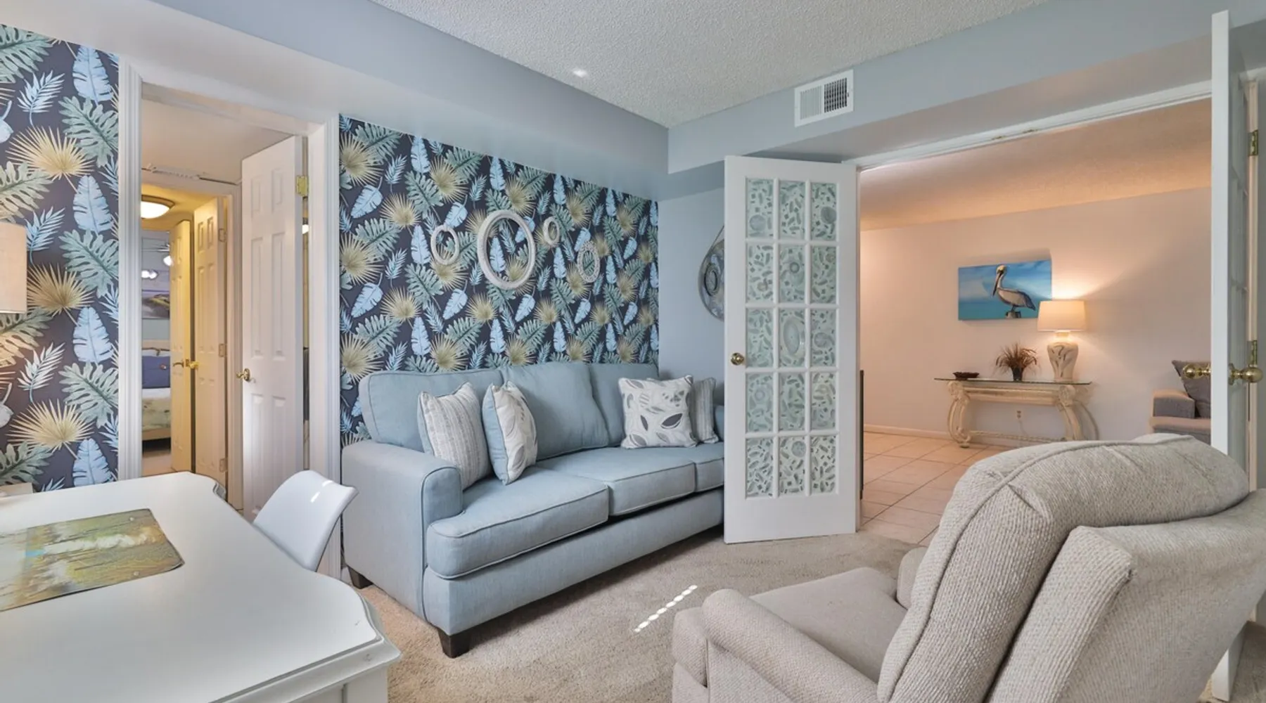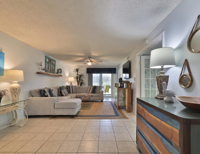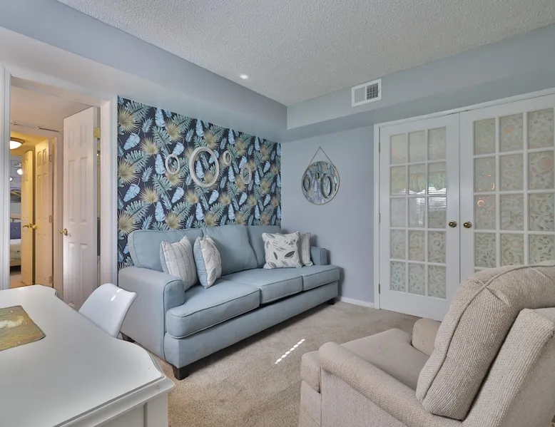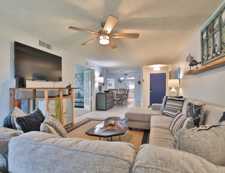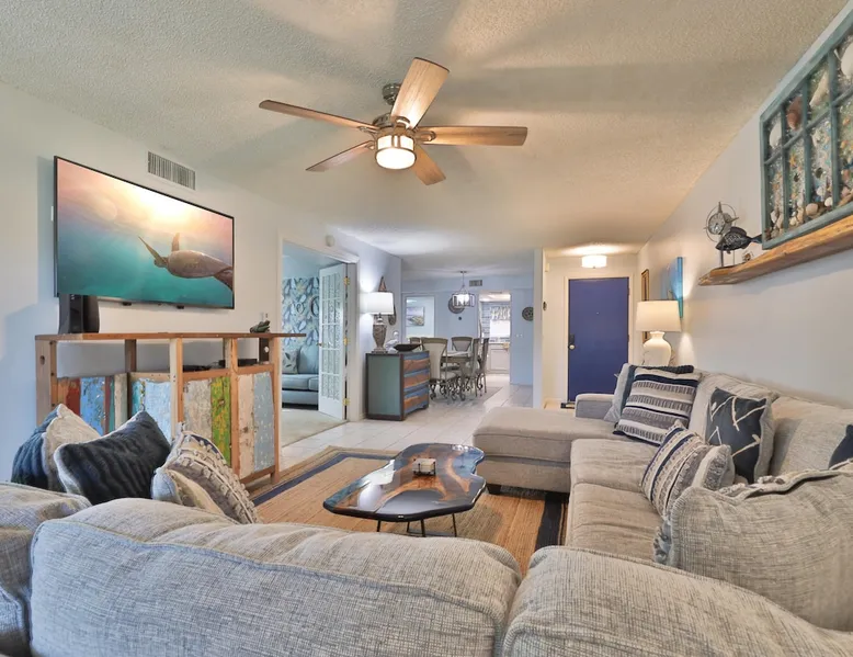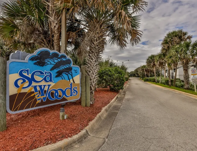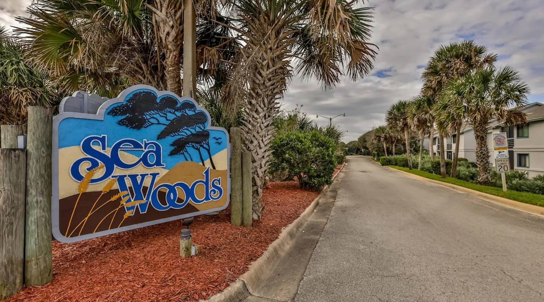 This condo provides comfortable and luxurious living, while a wealth of neighborhood amenities make getting outdoors and staying active on your vacation a breeze The space Escape to tranquility in this delightful 3-bedroom, 2-bath condo, nestled within the scenic 50-acre Sea Woods community. Located on the ground floor, the spacious master suite features a king-size bed and private ensuite bathroom. The second bedroom, conveniently positioned near the dining area, offers a cozy queen-size bed and shares a Jack-and-Jill bathroom with the versatile third room, which includes a pull-out sofa, perfect for an office or accommodating extra guests. The living room’s sectional easily converts into a full-size bed, providing additional sleeping options for family and friends. Enjoy preparing meals in the fully stocked kitchen, with a dining room ready for shared home-cooked feasts. For added convenience, the condo comes equipped with a washer and dryer. Start and end your days relaxing in the screened-in patio, where you can unwind to the soothing sounds of the ocean just beyond. Seawoods is a beautifully maintained community features 3 pools(1 heated), shuffleboard, pickle ball, tennis court, gorgeous nature trails for biking or walking, a fitness center plus deeded access paths to the "no-drive" beach!