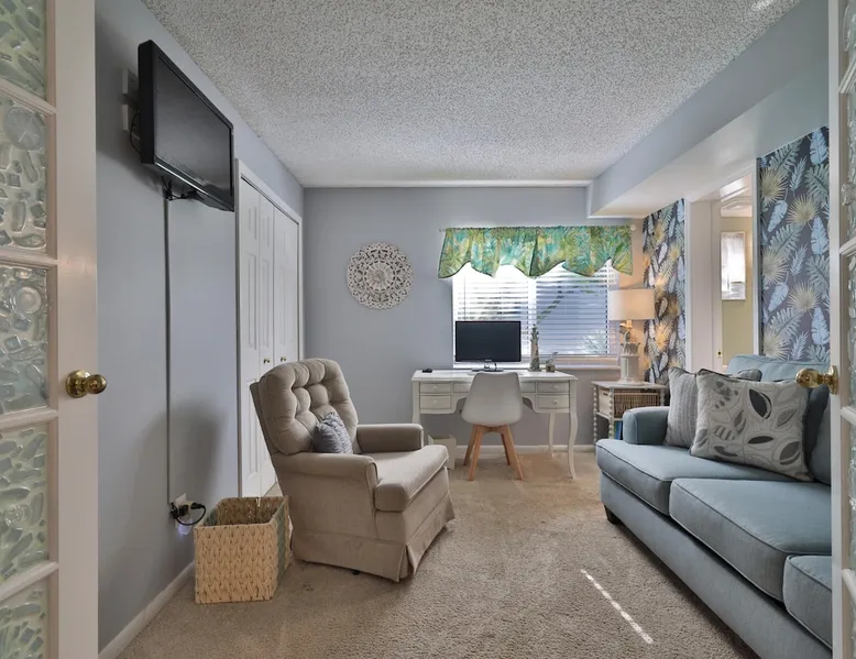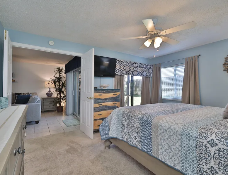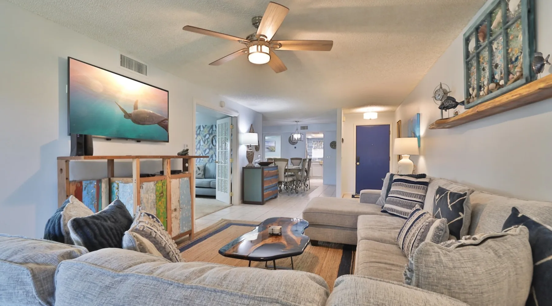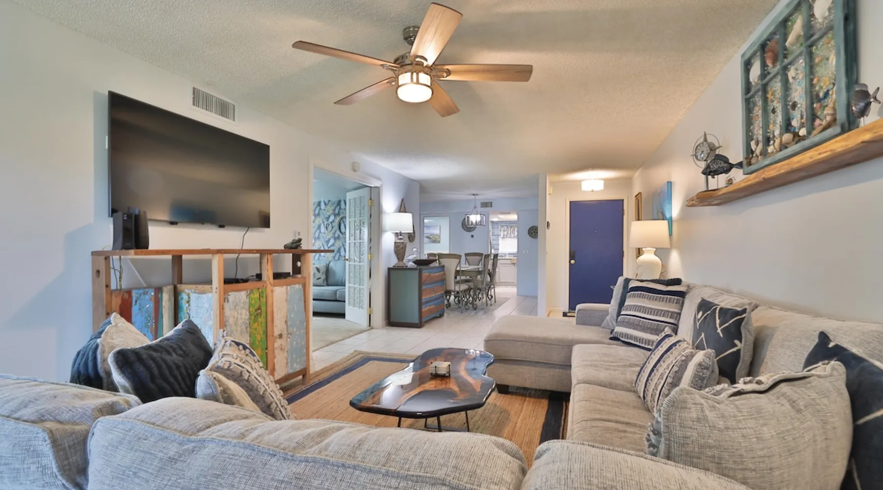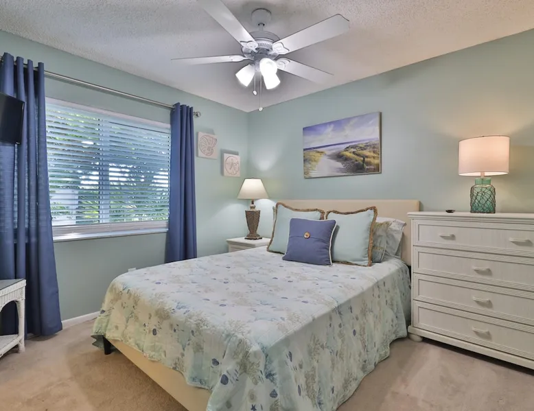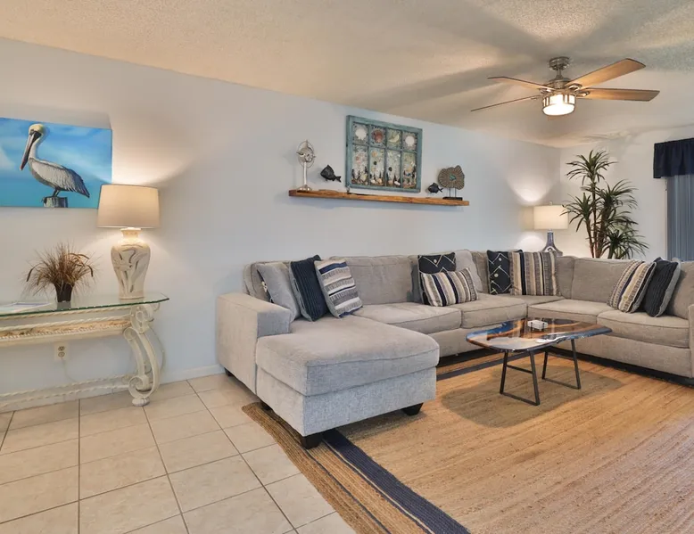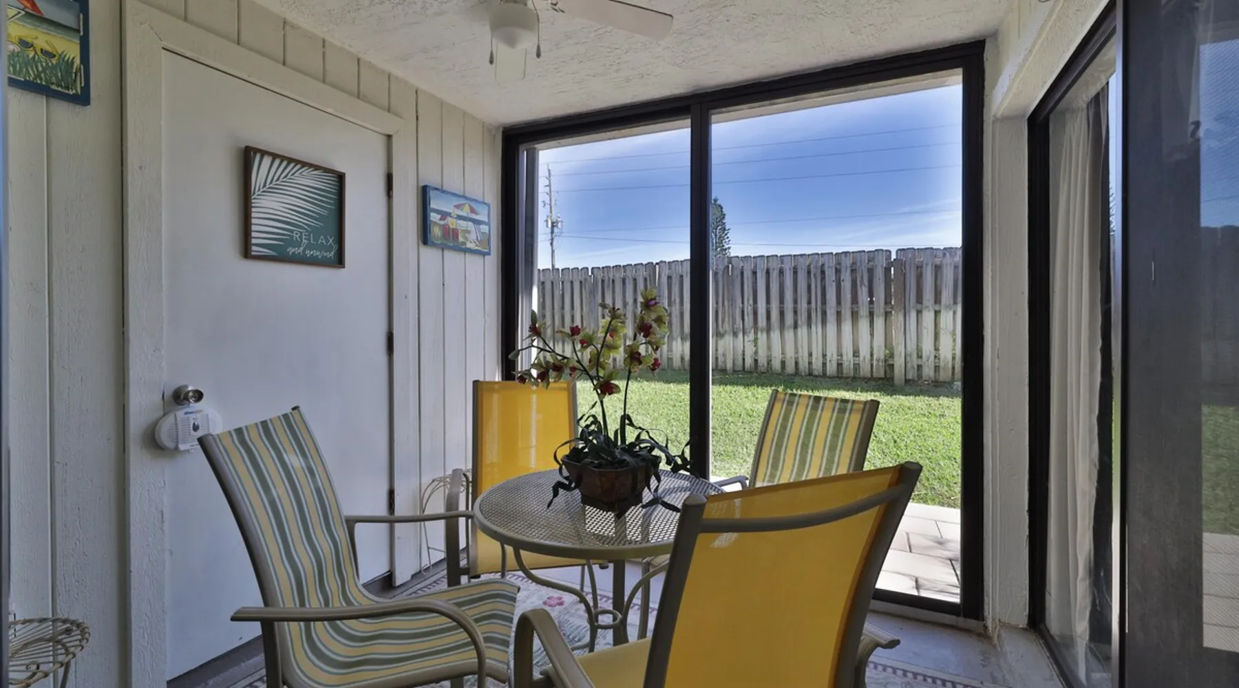 This condo provides comfortable and luxurious living, while a wealth of neighborhood amenities make getting outdoors and staying active on your vacation a breeze The space Escape to tranquility in this delightful 3-bedroom, 2-bath condo, nestled within the scenic 50-acre Sea Woods community. Located on the ground floor, the spacious master suite features a king-size bed and private ensuite bathroom. The second bedroom, conveniently positioned near the dining area, offers a cozy queen-size bed and shares a Jack-and-Jill bathroom with the versatile third room, which includes a pull-out sofa, perfect for an office or accommodating extra guests. The living room’s sectional easily converts into a full-size bed, providing additional sleeping options for family and friends. Enjoy preparing meals in the fully stocked kitchen, with a dining room ready for shared home-cooked feasts. For added convenience, the condo comes equipped with a washer and dryer. Start and end your days relaxing in the screened-in patio, where you can unwind to the soothing sounds of the ocean just beyond. Seawoods is a beautifully maintained community features 3 pools(1 heated), shuffleboard, pickle ball, tennis court, gorgeous nature trails for biking or walking, a fitness center plus deeded access paths to the "no-drive" beach!