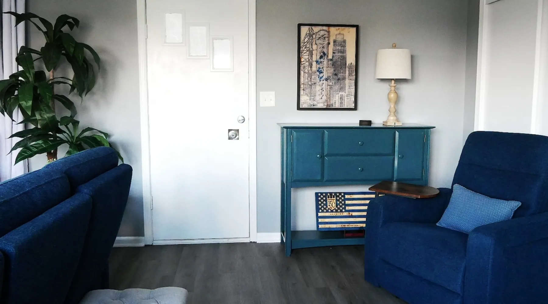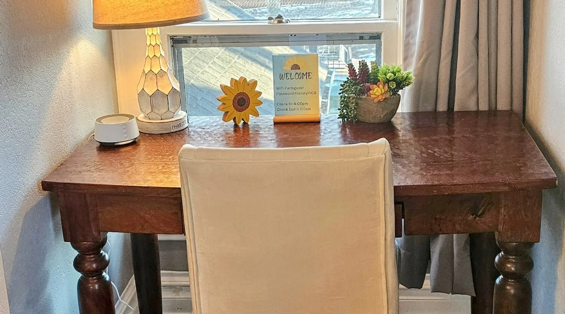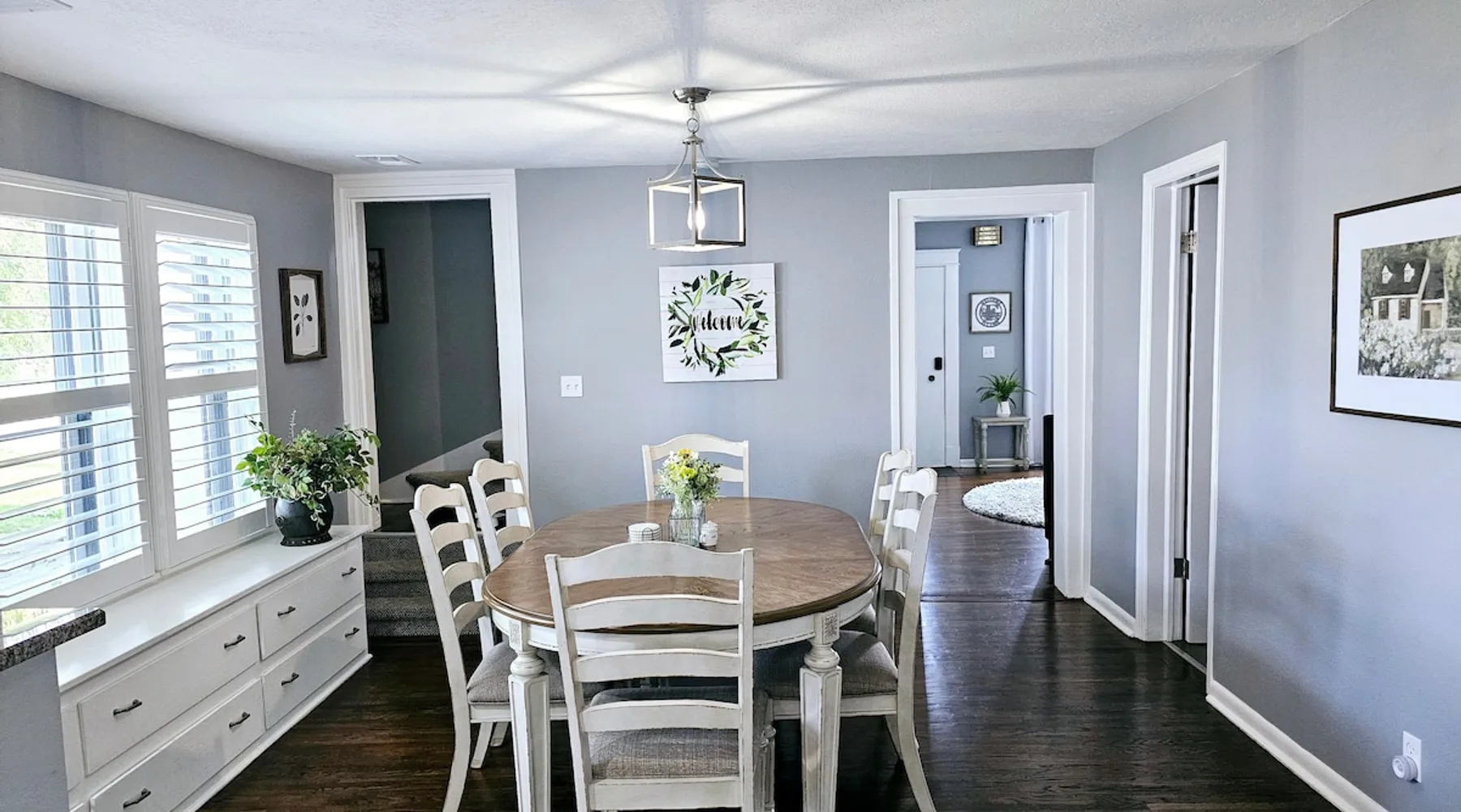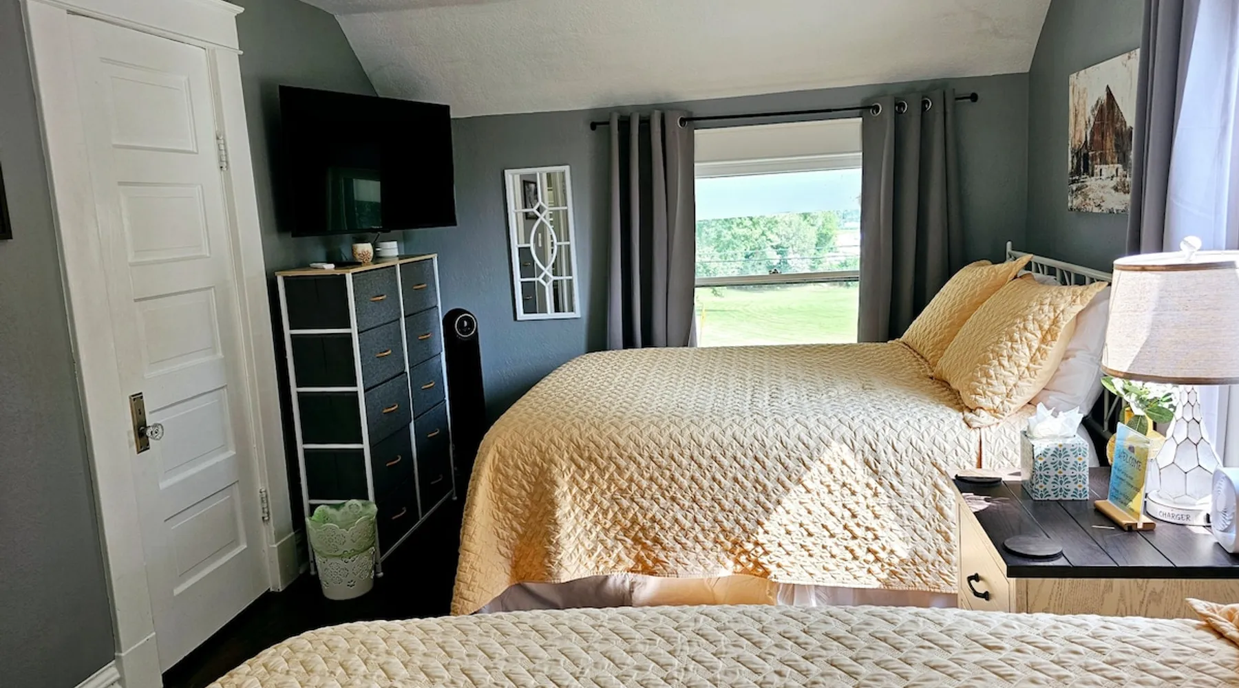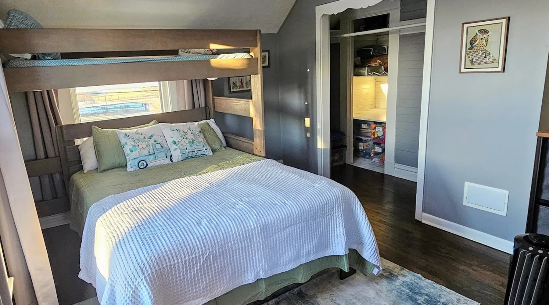 Over 1800 sq.ft. in this charming , modern farmhouse. The entire home is yours, no shared spaces. Private driveway with a north and east entry. Large, beautiful trees surround the property. A large family room with a 75inch t.v. Spacing kitchen/dining room perfect for gathering. Enjoy morning coffee on the front porch or back patio. Every bedroom has a smart tv. There is a work desk in the sitting room along with a queen sleeper sofa for an additional sleeping area on the main level. The space Large mudroom Large open kitchen and dining area. Stocked coffee bar. Kitchen stocked with all essentials and more. Sitting room with a conversation space and desk Large family room with two reclining sofas and chair, with an additional dining or game table. Large 75" Smart TV Main floor bedroom with king bed and 43" Smart TV. Vanity area for getting ready 2 Main floor full bathrooms, one off dining room and one off the mud room. supplied with toiletries. There is NO bathroom upstairs. Laundry in bathroom off mudroom Bedroom 2 located upstairs with two double beds and 43" smart tv Bedroom 3 has a queen bed with a twin bunk over it, 43" smart tv and desk area. Play space with toys for those traveling with children. Baby gates and playpen provided as well. Front porch with glider bench and 2 rockers Back sitting area with table and chairs and grill Guest access Guest have access to the grounds. There is 3/4 acres that you can use. Barn is inaccessible. Garages are available by request . Other things to note There is no bathroom on second level. Stairs are narrow and steep and not recommended for small children or those with mobility issues. There is some occasional street noise. There are fans and noise machines in all the bedrooms.