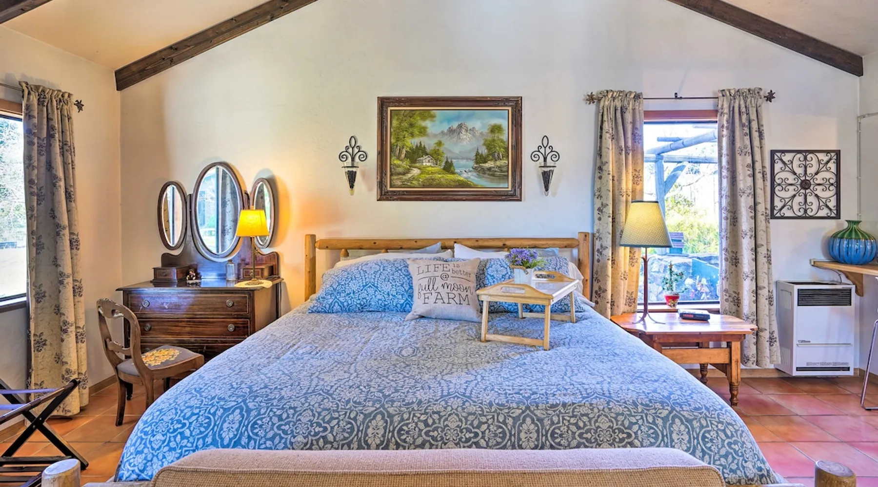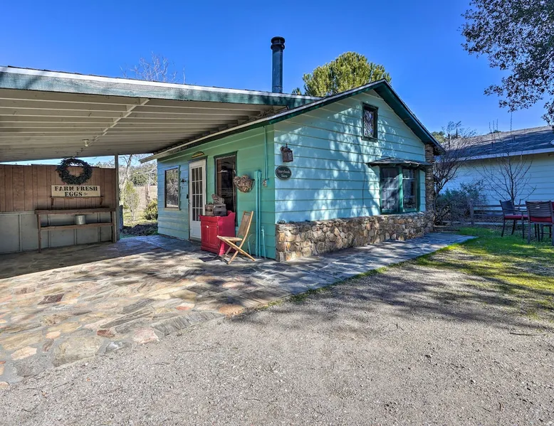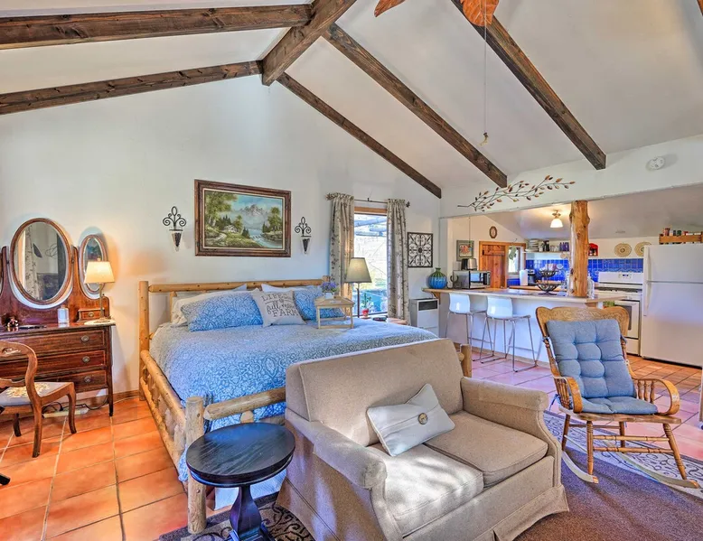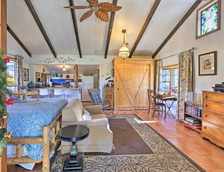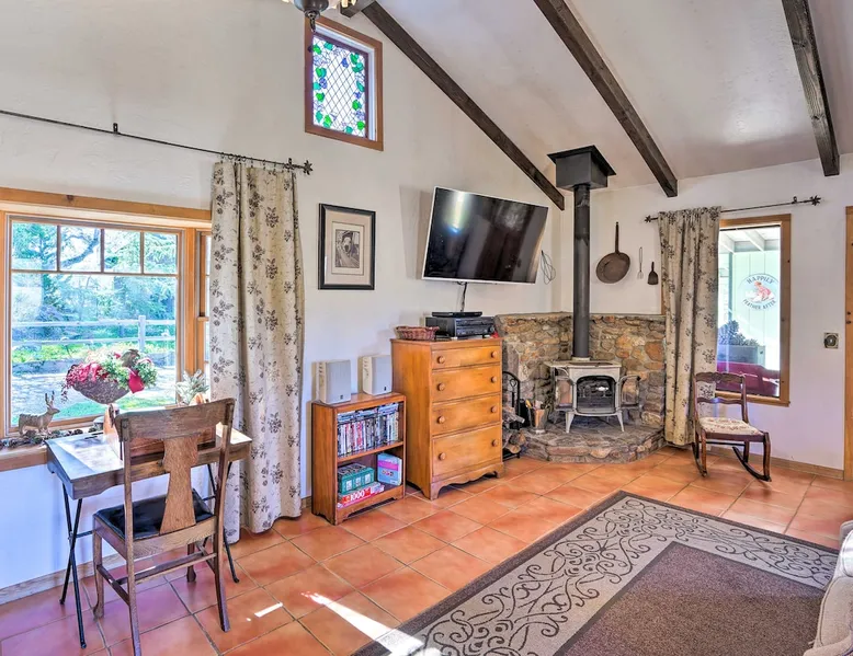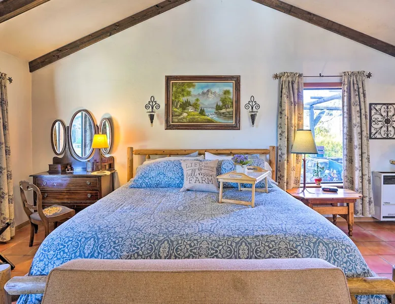 Welcome to 'Story Book Barn Cottage,' a charming 1-bath studio tucked away just 1 mile from Julian, CA. Here, experience an authentic farmhouse stay, complete with landscape views, a solid mix of antique and modern furnishings, and a wood-burning stove for cozy nights in. After long days spent hiking, wine tasting, or museum-going, return home to build a fire or relax on the patio. You won't encounter this vacation rental's quaint country charm or quiet-yet-convenient location anywhere else! The space 1 Mi to Downtown Julian | Fiber Optic Internet Studio: King Bed COTTAGE FEATURES: Smart TV w/ cable, wood-burning stove, desk space, dining table, books, board games, DVDs, ceiling fan, antique furniture OUTDOOR AMENITIES: Covered patio, side patio w/ view, yard w/ dining set, landscape views KITCHEN: Cooking basics, breakfast bar w/ seating, 4-burner stove, dishware & flatware, microwave, tea kettle, drip coffee maker GENERAL: Free WiFi, towels/linens, complimentary toiletries, window A/C units FAQ: 1 small step required for access, wildlife may be present PARKING: Driveway (2 vehicles) ADDT’L ACCOMMODATIONS: An additional studio property for 4 guests is available on-site with a separate nightly rate. If you wish to reserve both rentals, please inquire for more information prior to booking Guest access Guests will have access to the entire property Other things to note - No smoking - No pets allowed - No events, parties, or large gatherings - Must be at least 21 years old to book - Additional fees and taxes may apply - Photo ID may be required upon check-in - NOTE: The property requires 1 small step up for access - NOTE: The property is located in a rural area. While the property is proactively treated for pests every month, local wildlife may still be present
