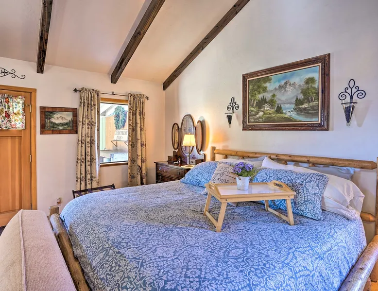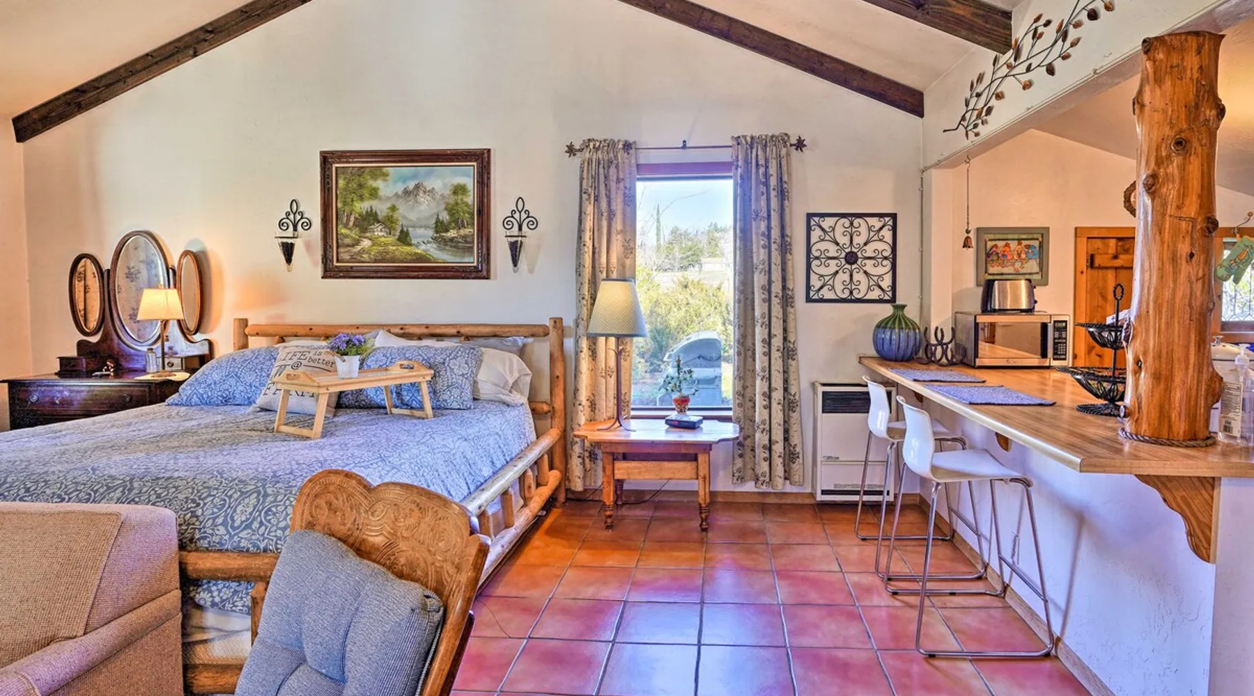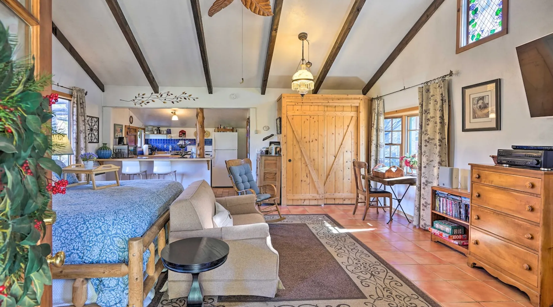 Welcome to 'Story Book Barn Cottage,' a charming 1-bath studio tucked away just 1 mile from Julian, CA. Here, experience an authentic farmhouse stay, complete with landscape views, a solid mix of antique and modern furnishings, and a wood-burning stove for cozy nights in. After long days spent hiking, wine tasting, or museum-going, return home to build a fire or relax on the patio. You won't encounter this vacation rental's quaint country charm or quiet-yet-convenient location anywhere else! The space 1 Mi to Downtown Julian | Fiber Optic Internet Studio: King Bed COTTAGE FEATURES: Smart TV w/ cable, wood-burning stove, desk space, dining table, books, board games, DVDs, ceiling fan, antique furniture OUTDOOR AMENITIES: Covered patio, side patio w/ view, yard w/ dining set, landscape views KITCHEN: Cooking basics, breakfast bar w/ seating, 4-burner stove, dishware & flatware, microwave, tea kettle, drip coffee maker GENERAL: Free WiFi, towels/linens, complimentary toiletries, window A/C units FAQ: 1 small step required for access, wildlife may be present PARKING: Driveway (2 vehicles) ADDT’L ACCOMMODATIONS: An additional studio property for 4 guests is available on-site with a separate nightly rate. If you wish to reserve both rentals, please inquire for more information prior to booking Guest access Guests will have access to the entire property Other things to note - No smoking - No pets allowed - No events, parties, or large gatherings - Must be at least 21 years old to book - Additional fees and taxes may apply - Photo ID may be required upon check-in - NOTE: The property requires 1 small step up for access - NOTE: The property is located in a rural area. While the property is proactively treated for pests every month, local wildlife may still be present