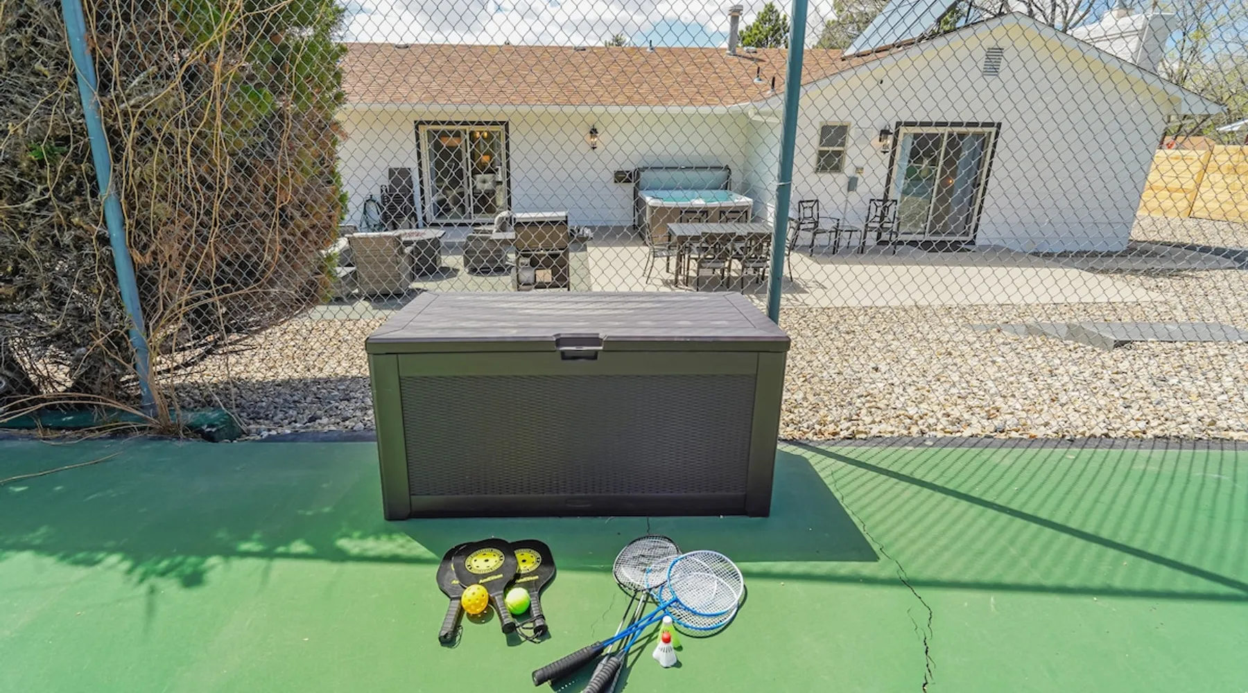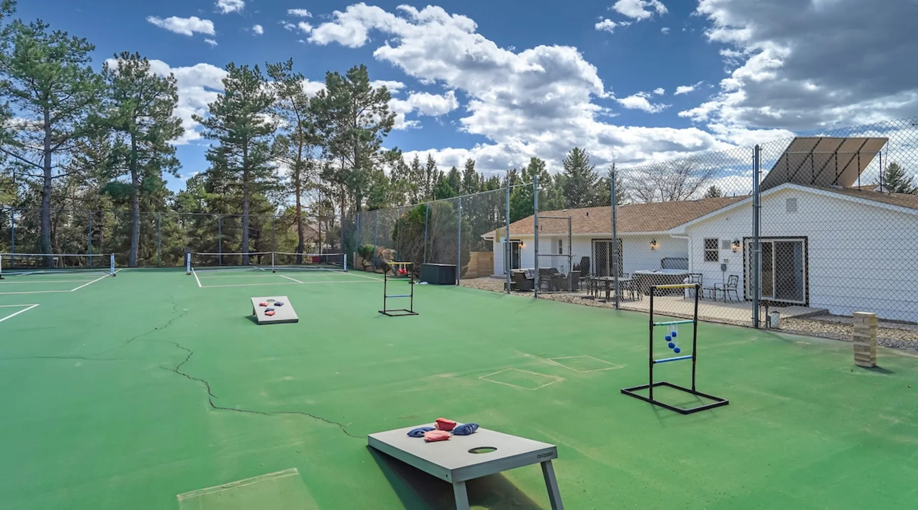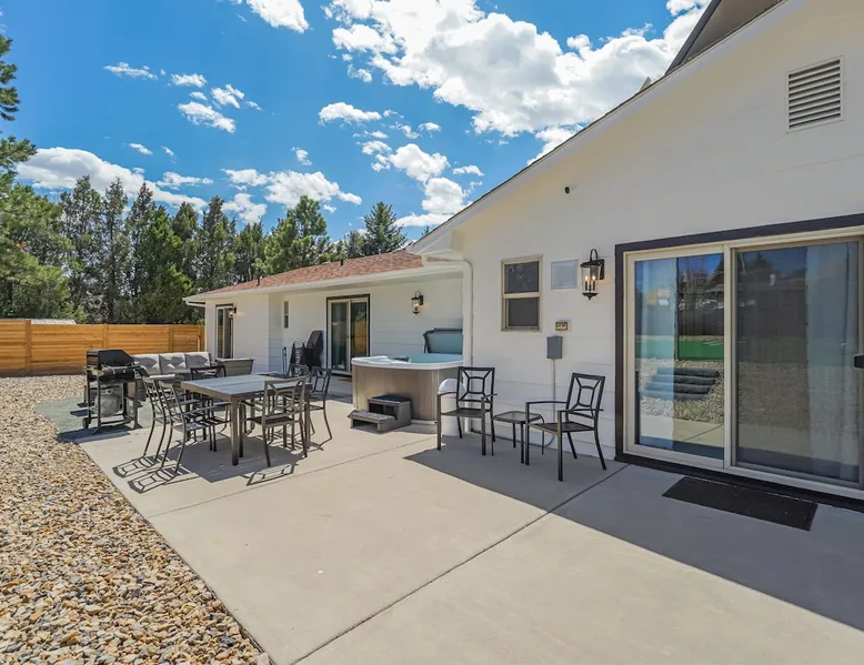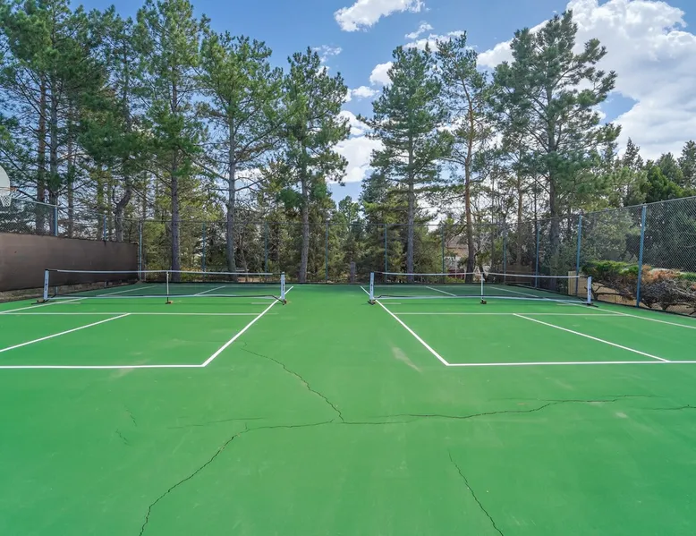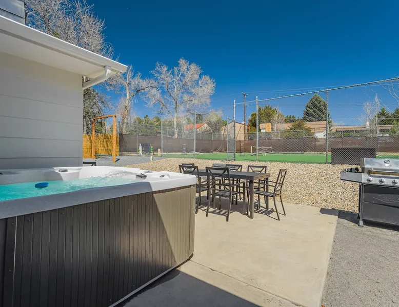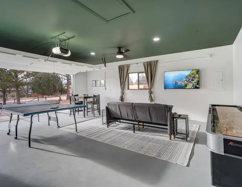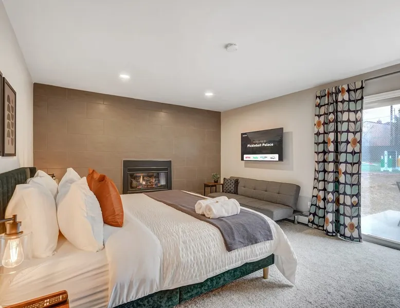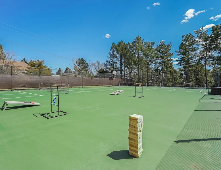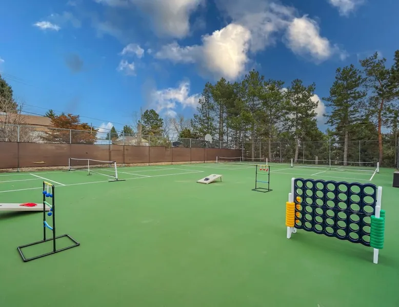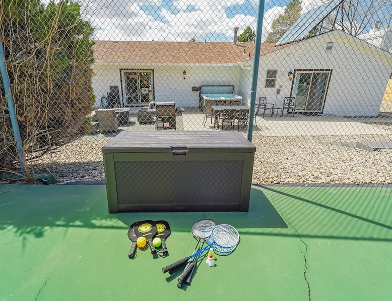 Welcome to Pickleball Palace in Colorado Springs! Our luxurious home is packed with things to do and ideal retreat for families and groups! 🏀 3 Pickleball courts & basketball hoop! 🔥 Hot tub, BBQ grill, fire pit, and outdoor dining w/ skyline view! 🕹️ Ping-pong, shuffleboard, and Smart TVs! 🏰 20-30 mins to Garden of the Gods & The Broadmoor! 🚶 Close to Mesa & Yucca trail at Palmer Park 🚀 Fast WiFi w/ workspace 🍽️ Fully-stocked kitchen Ready for a memorable stay? Book now! The space 🏡 Welcome to PICKLEBALL PALACE A meticulously designed haven catering to outdoor enthusiasts and design aficionados alike! Nestled in the heart of Colorado Springs, this exquisite residence offers an array of outdoor activities, expansive living spaces, and tasteful modern decor, ensuring an unforgettable stay. ✨ Inviting Living Spaces Upon entering, you'll be embraced by an open-plan living area featuring ample comfortable seating, large windows framing breathtaking mountain views, and chic furnishings. The spacious living room, equipped with a large Smart TV, provides the perfect spot to unwind after a day of exploration. Whether you're nestled on the couch or catching the game from the adjacent kitchen or dining area, this space invites relaxation and entertainment. Gather around for a night of board games and cherished moments! 🍳 Well-Equipped Kitchen A step away from the living area, the kitchen awaits with comprehensive amenities for culinary enthusiasts. From cooking utensils, cookware, bakeware, mixing bowls to measuring cups and a can opener, everything you need is at your fingertips. Whether you're the chef of the group or prefer observing from the island seat, the layout facilitates gathering with loved ones, friends, and colleagues. 🛏️ Bedroom Setup The unit comprises four bedrooms, each adorned with ultra-comfortable beds and luxurious linens for a restful night's sleep. King Master Bedroom: Features an en-suite bathroom fully stocked with premium amenities. Twin Bunkbed Bedroom: Equipped with three twin beds, ample floor space, and a built-in desk. Queen Bedroom: Includes twin bunkbeds and a twin trundle bed. Second King Master Bedroom: Offers a twin futon, a built-in fireplace, and a walk-out into the backyard. 👶 Kid-Friendly Amenities For your convenience, we provide a pack-n-play, sheets, and a high chair in the unit, making your stay with children more comfortable. 🔥 Outdoor Paradise The backyard unfolds as a haven for outdoor enthusiasts, offering an array of activities to captivate you for hours. PICKLEBALL PALACE boasts three full-size Pickleball courts, equipped with all necessary gear, a built-in basketball hoop, badminton equipment, ladder-ball, life-size Four-in-a-row, and Corn Hole! The garage game room is a treasure trove, featuring a ping pong table, shuffleboard, a large Smart TV, and a futon for additional relaxation. Ideal for family game nights or friendly competitions with friends. 🍽️ Al Fresco Dining and Relaxation Just beyond the kitchen, a spacious patio area beckons with abundant outdoor seating and a gas grill for delightful al fresco dining. Immerse yourself in the lively atmosphere of the court while enjoying a relaxing outdoor experience. Guest access 🔑During your stay, enjoy the entire property to include plenty of driveway parking, laundry machines in the unit that you can use at your convenience, and a large fully fenced backyard! Other things to note 📜 Rental Agreement: For a seamless booking experience, a Rental Agreement is required for all reservations. Once your reservation is confirmed, we’ll provide details for completing the agreement. 🔑 Check-In Process: For a seamless check-in experience, your unique code along with your check-in instructions will be updated into your personalized guidebook on the morning of your arrival. You’ll use this code for entry. ☕ Starter Supply: We’ve also prepared a starter supply that includes paper towels, coffee K-cups, toilet paper, shampoo, body wash, and plush white towels! We hope these amenities add an extra touch of comfort to your stay. ⏰ Unauthorized Late Checkout Fee: $20 per half-hour late. 💵 Additional Fees: For guests bringing dogs, there is a mandatory pet fee of $100 per dog, collected after booking. A maximum of 2 dogs is allowed per reservation unless otherwise approved. No other animals are permitted. Optional services, including early check-in, late check-out, and additional guests, can be arranged upon request and are subject to availability. These additional fees help cover the cost of reworking the schedule or adding an additional cleaner if needed. Please message us ahead of time for pricing and availability. 🏓 Pickleball Court: The pickleball court is seasonal—open for play most of the year, but it won’t be cleared of snow during the winter months. 🏠 Entire Palace: You get the ENTIRE palace to yourself! On over 1/2 acre of land, you'll have the perfect base camp for your group!