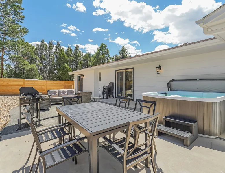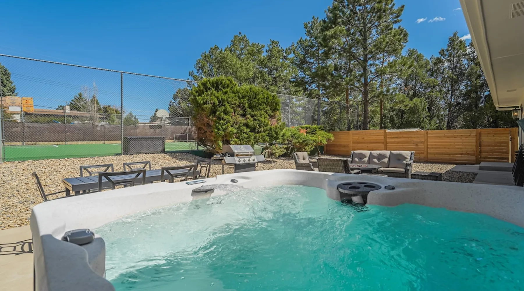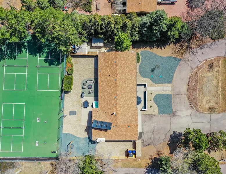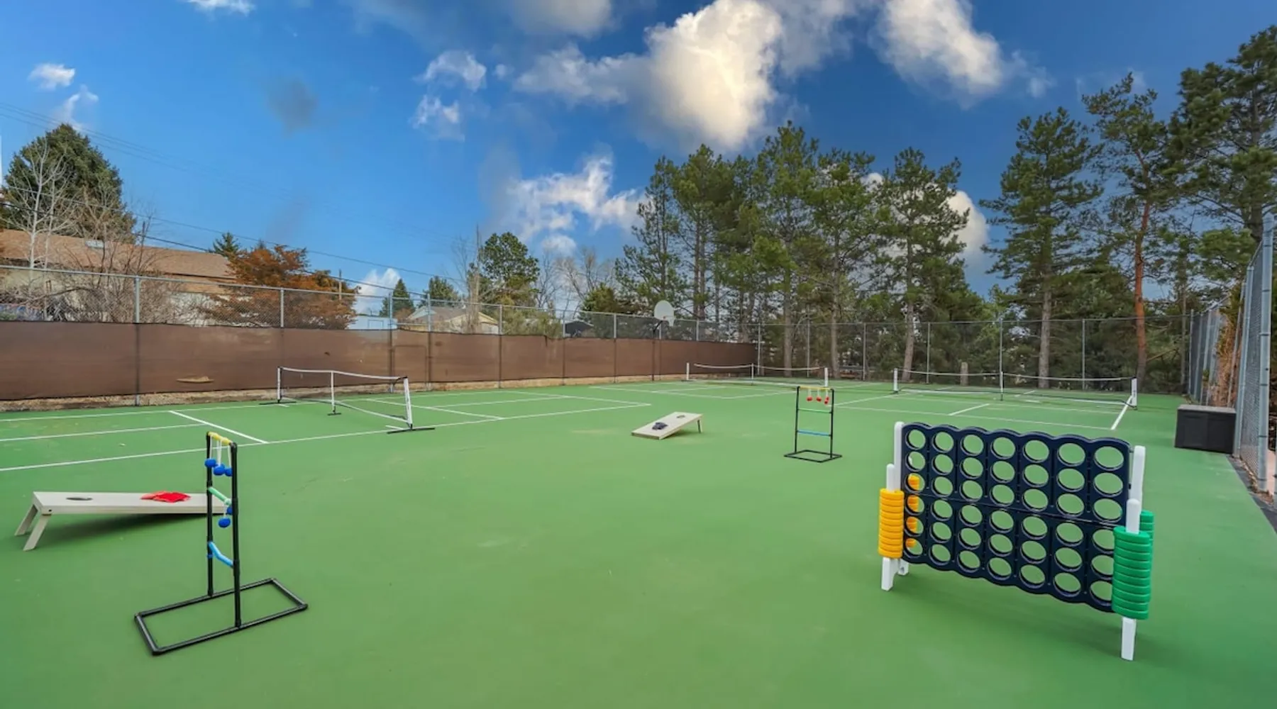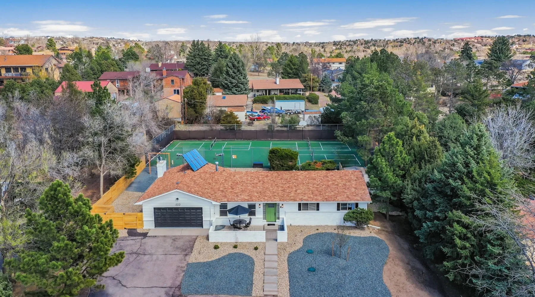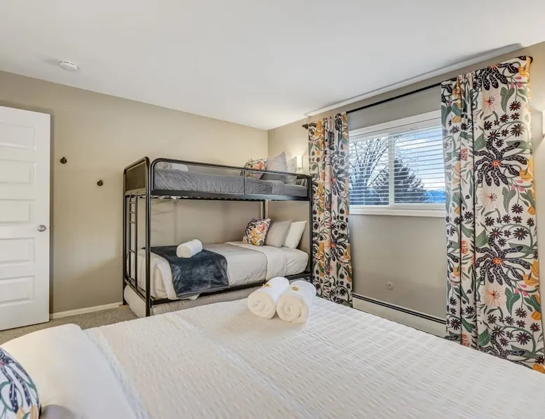 Welcome to Pickleball Palace in Colorado Springs! Our luxurious home is packed with things to do and ideal retreat for families and groups! 🏀 3 Pickleball courts & basketball hoop! 🔥 Hot tub, BBQ grill, fire pit, and outdoor dining w/ skyline view! 🕹️ Ping-pong, shuffleboard, and Smart TVs! 🏰 20-30 mins to Garden of the Gods & The Broadmoor! 🚶 Close to Mesa & Yucca trail at Palmer Park 🚀 Fast WiFi w/ workspace 🍽️ Fully-stocked kitchen Ready for a memorable stay? Book now! The space 🏡 Welcome to PICKLEBALL PALACE A meticulously designed haven catering to outdoor enthusiasts and design aficionados alike! Nestled in the heart of Colorado Springs, this exquisite residence offers an array of outdoor activities, expansive living spaces, and tasteful modern decor, ensuring an unforgettable stay. ✨ Inviting Living Spaces Upon entering, you'll be embraced by an open-plan living area featuring ample comfortable seating, large windows framing breathtaking mountain views, and chic furnishings. The spacious living room, equipped with a large Smart TV, provides the perfect spot to unwind after a day of exploration. Whether you're nestled on the couch or catching the game from the adjacent kitchen or dining area, this space invites relaxation and entertainment. Gather around for a night of board games and cherished moments! 🍳 Well-Equipped Kitchen A step away from the living area, the kitchen awaits with comprehensive amenities for culinary enthusiasts. From cooking utensils, cookware, bakeware, mixing bowls to measuring cups and a can opener, everything you need is at your fingertips. Whether you're the chef of the group or prefer observing from the island seat, the layout facilitates gathering with loved ones, friends, and colleagues. 🛏️ Bedroom Setup The unit comprises four bedrooms, each adorned with ultra-comfortable beds and luxurious linens for a restful night's sleep. King Master Bedroom: Features an en-suite bathroom fully stocked with premium amenities. Twin Bunkbed Bedroom: Equipped with three twin beds, ample floor space, and a built-in desk. Queen Bedroom: Includes twin bunkbeds and a twin trundle bed. Second King Master Bedroom: Offers a twin futon, a built-in fireplace, and a walk-out into the backyard. 👶 Kid-Friendly Amenities For your convenience, we provide a pack-n-play, sheets, and a high chair in the unit, making your stay with children more comfortable. 🔥 Outdoor Paradise The backyard unfolds as a haven for outdoor enthusiasts, offering an array of activities to captivate you for hours. PICKLEBALL PALACE boasts three full-size Pickleball courts, equipped with all necessary gear, a built-in basketball hoop, badminton equipment, ladder-ball, life-size Four-in-a-row, and Corn Hole! The garage game room is a treasure trove, featuring a ping pong table, shuffleboard, a large Smart TV, and a futon for additional relaxation. Ideal for family game nights or friendly competitions with friends. 🍽️ Al Fresco Dining and Relaxation Just beyond the kitchen, a spacious patio area beckons with abundant outdoor seating and a gas grill for delightful al fresco dining. Immerse yourself in the lively atmosphere of the court while enjoying a relaxing outdoor experience. Guest access 🔑During your stay, enjoy the entire property to include plenty of driveway parking, laundry machines in the unit that you can use at your convenience, and a large fully fenced backyard! Other things to note 📜 Rental Agreement: For a seamless booking experience, a Rental Agreement is required for all reservations. Once your reservation is confirmed, we’ll provide details for completing the agreement. 🔑 Check-In Process: For a seamless check-in experience, your unique code along with your check-in instructions will be updated into your personalized guidebook on the morning of your arrival. You’ll use this code for entry. ☕ Starter Supply: We’ve also prepared a starter supply that includes paper towels, coffee K-cups, toilet paper, shampoo, body wash, and plush white towels! We hope these amenities add an extra touch of comfort to your stay. ⏰ Unauthorized Late Checkout Fee: $20 per half-hour late. 💵 Additional Fees: For guests bringing dogs, there is a mandatory pet fee of $100 per dog, collected after booking. A maximum of 2 dogs is allowed per reservation unless otherwise approved. No other animals are permitted. Optional services, including early check-in, late check-out, and additional guests, can be arranged upon request and are subject to availability. These additional fees help cover the cost of reworking the schedule or adding an additional cleaner if needed. Please message us ahead of time for pricing and availability. 🏓 Pickleball Court: The pickleball court is seasonal—open for play most of the year, but it won’t be cleared of snow during the winter months. 🏠 Entire Palace: You get the ENTIRE palace to yourself! On over 1/2 acre of land, you'll have the perfect base camp for your group!