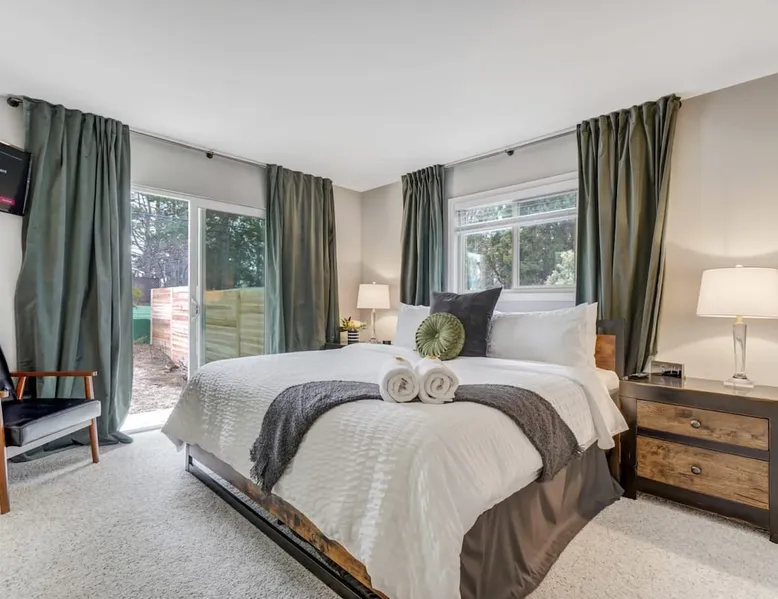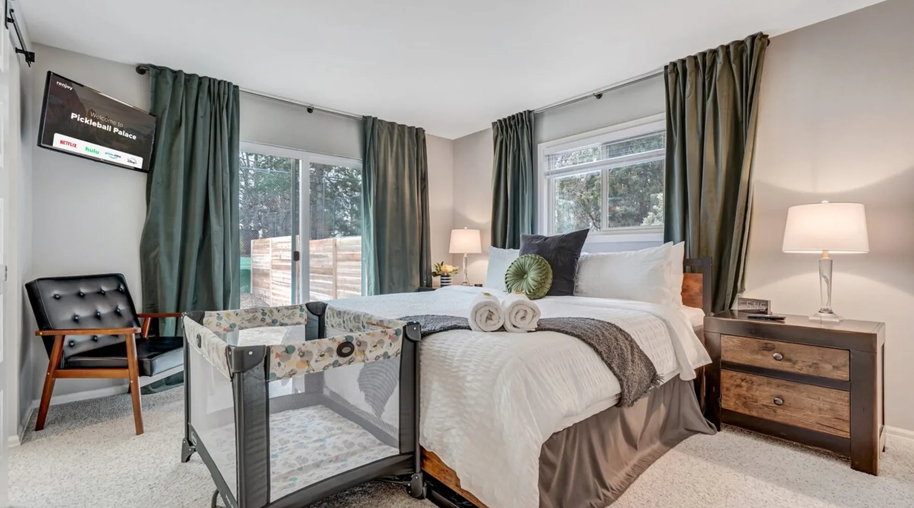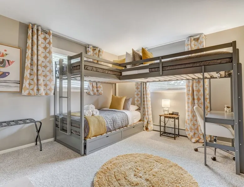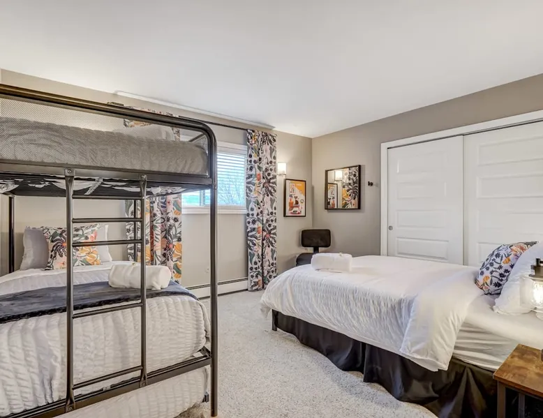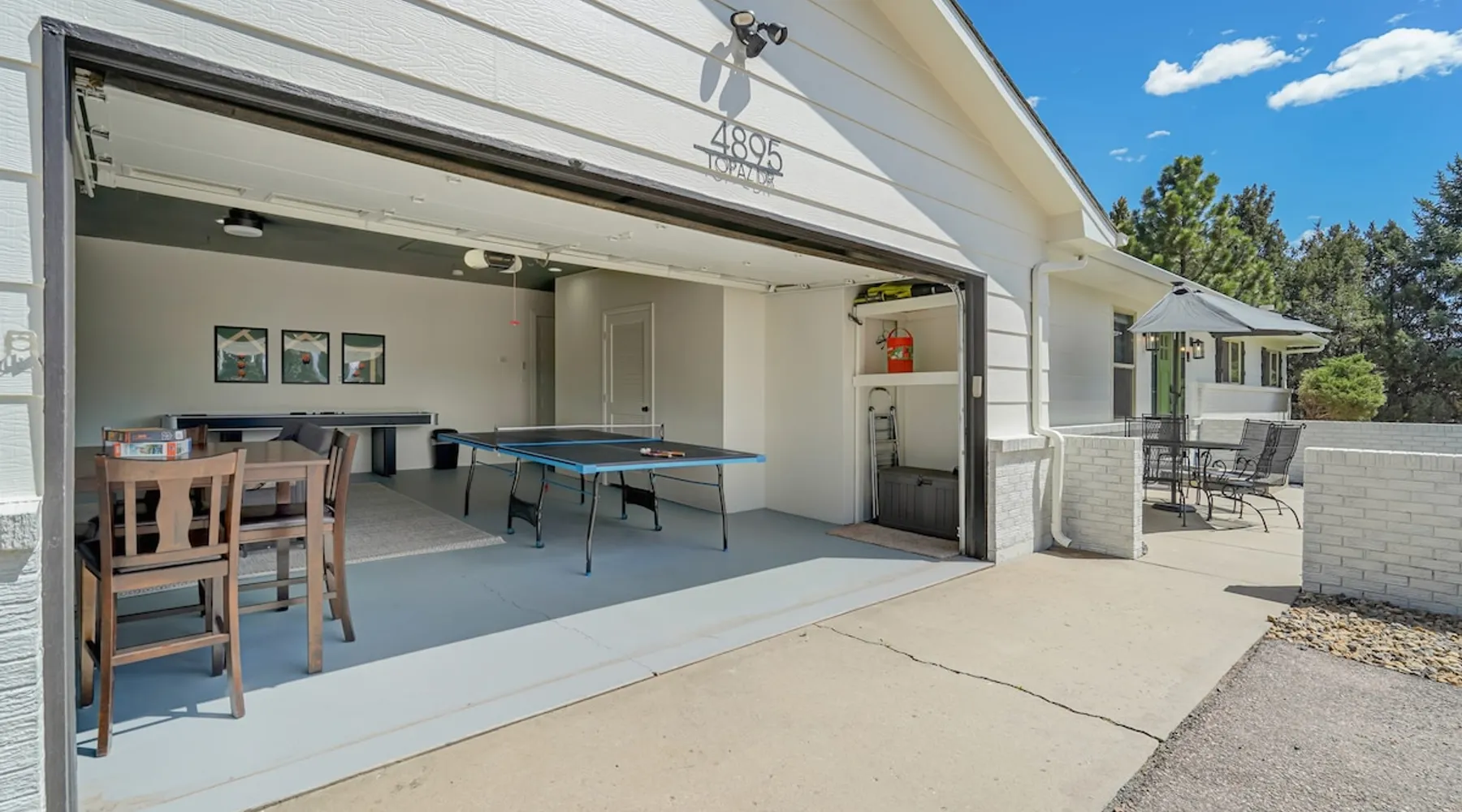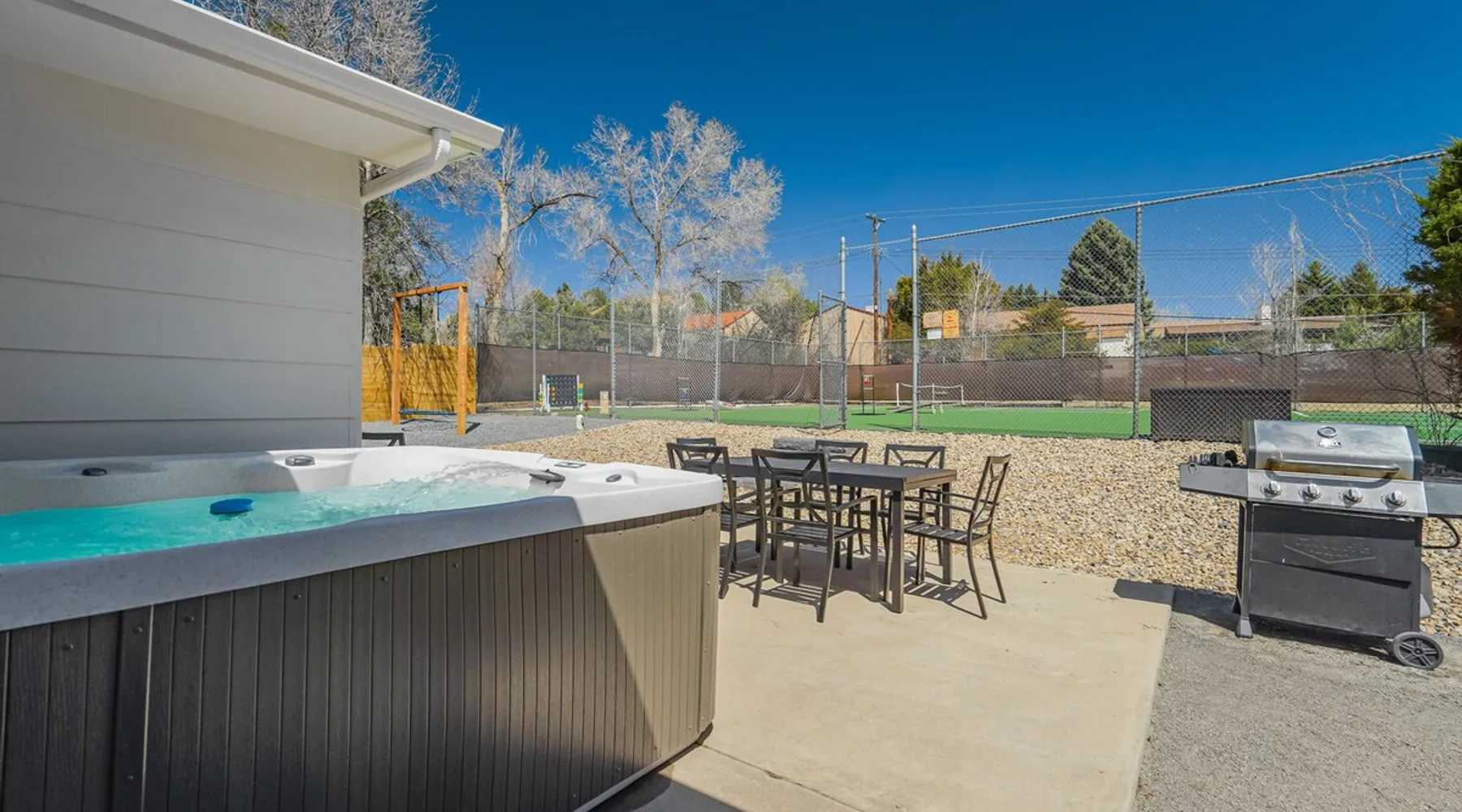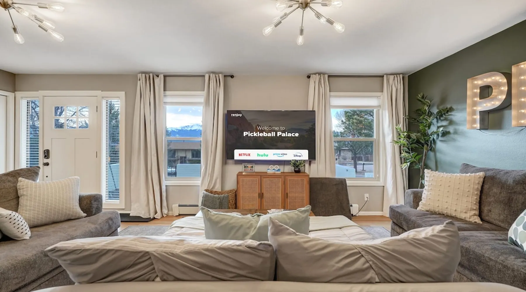 Welcome to Pickleball Palace in Colorado Springs! Our luxurious home is packed with things to do and ideal retreat for families and groups! 🏀 3 Pickleball courts & basketball hoop! 🔥 Hot tub, BBQ grill, fire pit, and outdoor dining w/ skyline view! 🕹️ Ping-pong, shuffleboard, and Smart TVs! 🏰 20-30 mins to Garden of the Gods & The Broadmoor! 🚶 Close to Mesa & Yucca trail at Palmer Park 🚀 Fast WiFi w/ workspace 🍽️ Fully-stocked kitchen Ready for a memorable stay? Book now! The space 🏡 Welcome to PICKLEBALL PALACE A meticulously designed haven catering to outdoor enthusiasts and design aficionados alike! Nestled in the heart of Colorado Springs, this exquisite residence offers an array of outdoor activities, expansive living spaces, and tasteful modern decor, ensuring an unforgettable stay. ✨ Inviting Living Spaces Upon entering, you'll be embraced by an open-plan living area featuring ample comfortable seating, large windows framing breathtaking mountain views, and chic furnishings. The spacious living room, equipped with a large Smart TV, provides the perfect spot to unwind after a day of exploration. Whether you're nestled on the couch or catching the game from the adjacent kitchen or dining area, this space invites relaxation and entertainment. Gather around for a night of board games and cherished moments! 🍳 Well-Equipped Kitchen A step away from the living area, the kitchen awaits with comprehensive amenities for culinary enthusiasts. From cooking utensils, cookware, bakeware, mixing bowls to measuring cups and a can opener, everything you need is at your fingertips. Whether you're the chef of the group or prefer observing from the island seat, the layout facilitates gathering with loved ones, friends, and colleagues. 🛏️ Bedroom Setup The unit comprises four bedrooms, each adorned with ultra-comfortable beds and luxurious linens for a restful night's sleep. King Master Bedroom: Features an en-suite bathroom fully stocked with premium amenities. Twin Bunkbed Bedroom: Equipped with three twin beds, ample floor space, and a built-in desk. Queen Bedroom: Includes twin bunkbeds and a twin trundle bed. Second King Master Bedroom: Offers a twin futon, a built-in fireplace, and a walk-out into the backyard. 👶 Kid-Friendly Amenities For your convenience, we provide a pack-n-play, sheets, and a high chair in the unit, making your stay with children more comfortable. 🔥 Outdoor Paradise The backyard unfolds as a haven for outdoor enthusiasts, offering an array of activities to captivate you for hours. PICKLEBALL PALACE boasts three full-size Pickleball courts, equipped with all necessary gear, a built-in basketball hoop, badminton equipment, ladder-ball, life-size Four-in-a-row, and Corn Hole! The garage game room is a treasure trove, featuring a ping pong table, shuffleboard, a large Smart TV, and a futon for additional relaxation. Ideal for family game nights or friendly competitions with friends. 🍽️ Al Fresco Dining and Relaxation Just beyond the kitchen, a spacious patio area beckons with abundant outdoor seating and a gas grill for delightful al fresco dining. Immerse yourself in the lively atmosphere of the court while enjoying a relaxing outdoor experience. Guest access 🔑During your stay, enjoy the entire property to include plenty of driveway parking, laundry machines in the unit that you can use at your convenience, and a large fully fenced backyard! Other things to note 📜 Rental Agreement: For a seamless booking experience, a Rental Agreement is required for all reservations. Once your reservation is confirmed, we’ll provide details for completing the agreement. 🔑 Check-In Process: For a seamless check-in experience, your unique code along with your check-in instructions will be updated into your personalized guidebook on the morning of your arrival. You’ll use this code for entry. ☕ Starter Supply: We’ve also prepared a starter supply that includes paper towels, coffee K-cups, toilet paper, shampoo, body wash, and plush white towels! We hope these amenities add an extra touch of comfort to your stay. ⏰ Unauthorized Late Checkout Fee: $20 per half-hour late. 💵 Additional Fees: For guests bringing dogs, there is a mandatory pet fee of $100 per dog, collected after booking. A maximum of 2 dogs is allowed per reservation unless otherwise approved. No other animals are permitted. Optional services, including early check-in, late check-out, and additional guests, can be arranged upon request and are subject to availability. These additional fees help cover the cost of reworking the schedule or adding an additional cleaner if needed. Please message us ahead of time for pricing and availability. 🏓 Pickleball Court: The pickleball court is seasonal—open for play most of the year, but it won’t be cleared of snow during the winter months. 🏠 Entire Palace: You get the ENTIRE palace to yourself! On over 1/2 acre of land, you'll have the perfect base camp for your group!
