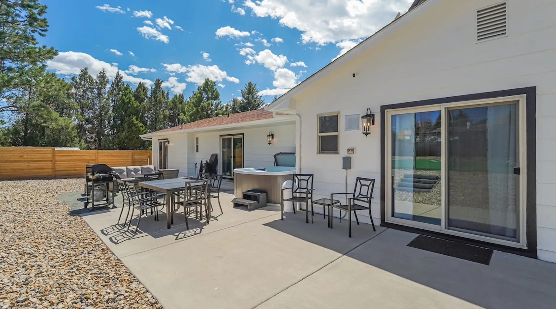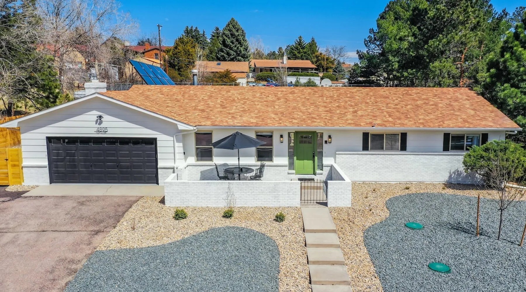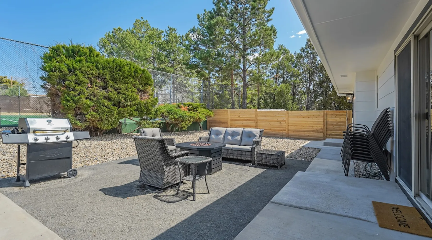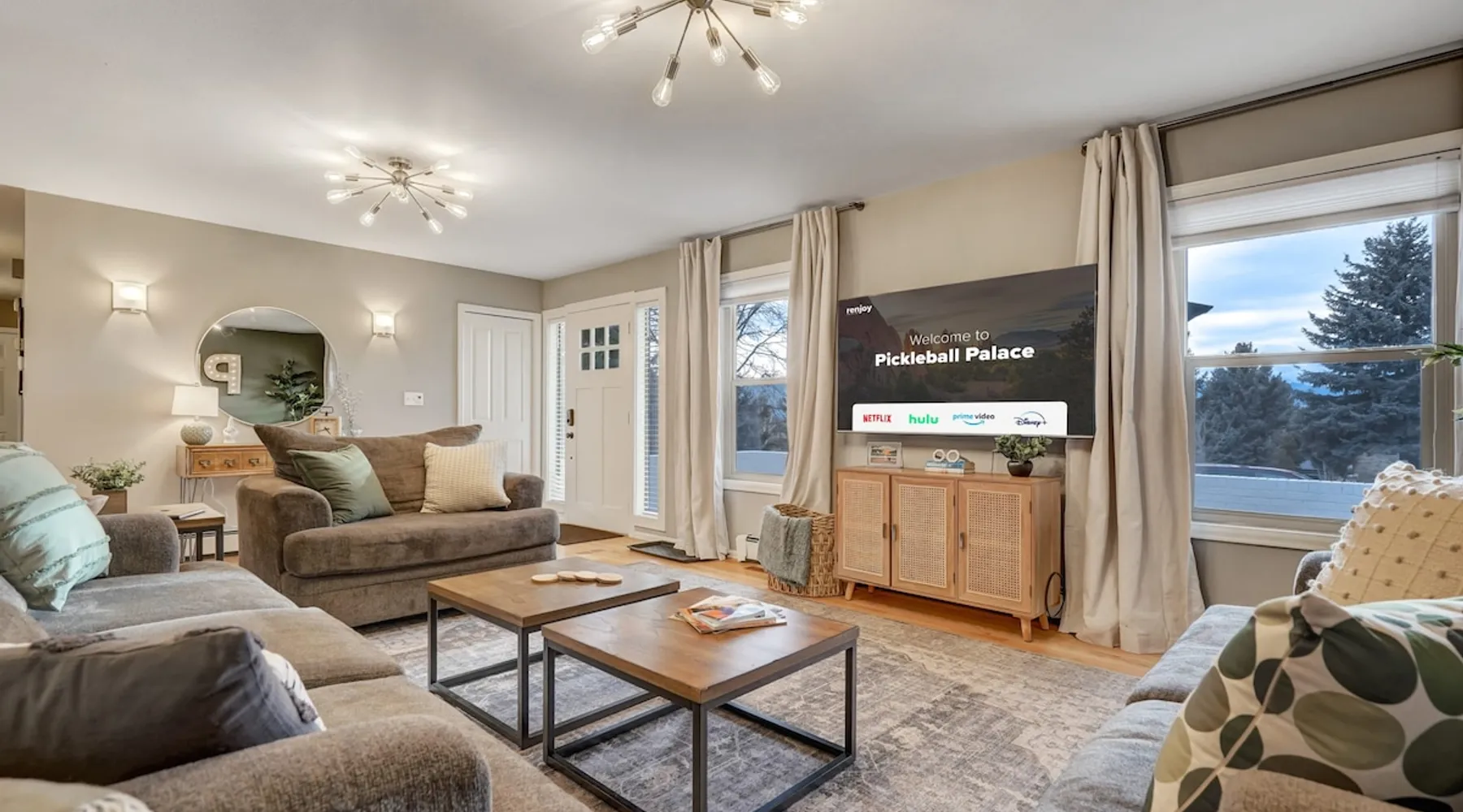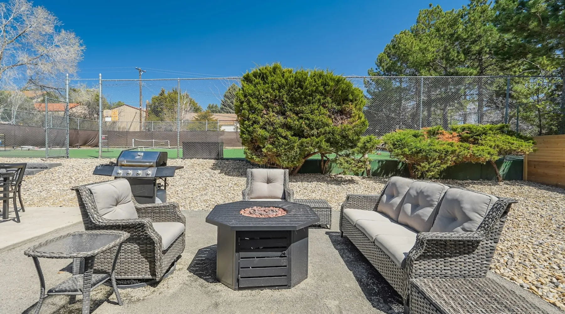 Welcome to Pickleball Palace in Colorado Springs! Our luxurious home is packed with things to do and ideal retreat for families and groups! 🏀 3 Pickleball courts & basketball hoop! 🔥 Hot tub, BBQ grill, fire pit, and outdoor dining w/ skyline view! 🕹️ Ping-pong, shuffleboard, and Smart TVs! 🏰 20-30 mins to Garden of the Gods & The Broadmoor! 🚶 Close to Mesa & Yucca trail at Palmer Park 🚀 Fast WiFi w/ workspace 🍽️ Fully-stocked kitchen Ready for a memorable stay? Book now! The space 🏡 Welcome to PICKLEBALL PALACE A meticulously designed haven catering to outdoor enthusiasts and design aficionados alike! Nestled in the heart of Colorado Springs, this exquisite residence offers an array of outdoor activities, expansive living spaces, and tasteful modern decor, ensuring an unforgettable stay. ✨ Inviting Living Spaces Upon entering, you'll be embraced by an open-plan living area featuring ample comfortable seating, large windows framing breathtaking mountain views, and chic furnishings. The spacious living room, equipped with a large Smart TV, provides the perfect spot to unwind after a day of exploration. Whether you're nestled on the couch or catching the game from the adjacent kitchen or dining area, this space invites relaxation and entertainment. Gather around for a night of board games and cherished moments! 🍳 Well-Equipped Kitchen A step away from the living area, the kitchen awaits with comprehensive amenities for culinary enthusiasts. From cooking utensils, cookware, bakeware, mixing bowls to measuring cups and a can opener, everything you need is at your fingertips. Whether you're the chef of the group or prefer observing from the island seat, the layout facilitates gathering with loved ones, friends, and colleagues. 🛏️ Bedroom Setup The unit comprises four bedrooms, each adorned with ultra-comfortable beds and luxurious linens for a restful night's sleep. King Master Bedroom: Features an en-suite bathroom fully stocked with premium amenities. Twin Bunkbed Bedroom: Equipped with three twin beds, ample floor space, and a built-in desk. Queen Bedroom: Includes twin bunkbeds and a twin trundle bed. Second King Master Bedroom: Offers a twin futon, a built-in fireplace, and a walk-out into the backyard. 👶 Kid-Friendly Amenities For your convenience, we provide a pack-n-play, sheets, and a high chair in the unit, making your stay with children more comfortable. 🔥 Outdoor Paradise The backyard unfolds as a haven for outdoor enthusiasts, offering an array of activities to captivate you for hours. PICKLEBALL PALACE boasts three full-size Pickleball courts, equipped with all necessary gear, a built-in basketball hoop, badminton equipment, ladder-ball, life-size Four-in-a-row, and Corn Hole! The garage game room is a treasure trove, featuring a ping pong table, shuffleboard, a large Smart TV, and a futon for additional relaxation. Ideal for family game nights or friendly competitions with friends. 🍽️ Al Fresco Dining and Relaxation Just beyond the kitchen, a spacious patio area beckons with abundant outdoor seating and a gas grill for delightful al fresco dining. Immerse yourself in the lively atmosphere of the court while enjoying a relaxing outdoor experience. Guest access 🔑During your stay, enjoy the entire property to include plenty of driveway parking, laundry machines in the unit that you can use at your convenience, and a large fully fenced backyard! Other things to note 📜 Rental Agreement: For a seamless booking experience, a Rental Agreement is required for all reservations. Once your reservation is confirmed, we’ll provide details for completing the agreement. 🔑 Check-In Process: For a seamless check-in experience, your unique code along with your check-in instructions will be updated into your personalized guidebook on the morning of your arrival. You’ll use this code for entry. ☕ Starter Supply: We’ve also prepared a starter supply that includes paper towels, coffee K-cups, toilet paper, shampoo, body wash, and plush white towels! We hope these amenities add an extra touch of comfort to your stay. ⏰ Unauthorized Late Checkout Fee: $20 per half-hour late. 💵 Additional Fees: For guests bringing dogs, there is a mandatory pet fee of $100 per dog, collected after booking. A maximum of 2 dogs is allowed per reservation unless otherwise approved. No other animals are permitted. Optional services, including early check-in, late check-out, and additional guests, can be arranged upon request and are subject to availability. These additional fees help cover the cost of reworking the schedule or adding an additional cleaner if needed. Please message us ahead of time for pricing and availability. 🏓 Pickleball Court: The pickleball court is seasonal—open for play most of the year, but it won’t be cleared of snow during the winter months. 🏠 Entire Palace: You get the ENTIRE palace to yourself! On over 1/2 acre of land, you'll have the perfect base camp for your group!