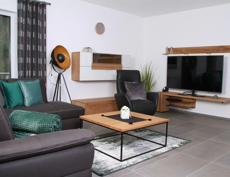 Loft apartment in the villa green in Bad Tabarz / apartment 10 Other things to note Right next to the Bad Tabarzer Kneipp cure complex, our high-quality equipped, air-conditioned loft apartment with a living area of 89 sqm for 2 - 4 people is located at Baumkronenhöhe. Car parking spaces under the carport. With an elevator, even people with walking disabilities can easily reach the apartment. One bedroom can accommodate 2 adults. An extra bed for 2 people and a children's travel cot can be provided if needed. Two bathrooms with generous lighting and cosmetic mirror, one with bath and one with shower are available. The apartment also offers a furnished 112 m² roof terrace overlooking the Kneipp cure complex and surrounding hiking trails. The high-quality kitchen is equipped with an oven, plate warmer, microwave, stove, fridge-freezer, coffee maker, fully automatic coffee machine, kettle, toaster, toaster, cookware, dinnerware, cutlery and with glasses. On the cozy couch, movies can be watched on a 66 inch TV. There are shopping opportunities in the city center, which is about 900 m away. Tourist Tax must be paid. However, with the issued spa card, for example, the adventure pool "Tabbs" can be visited and the Thuringian Forest Railway can be used free of charge. More information can be found online.