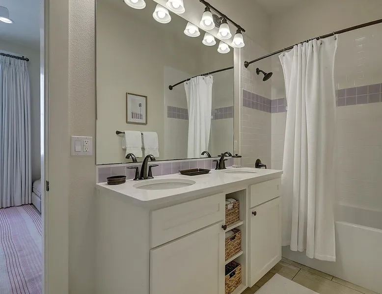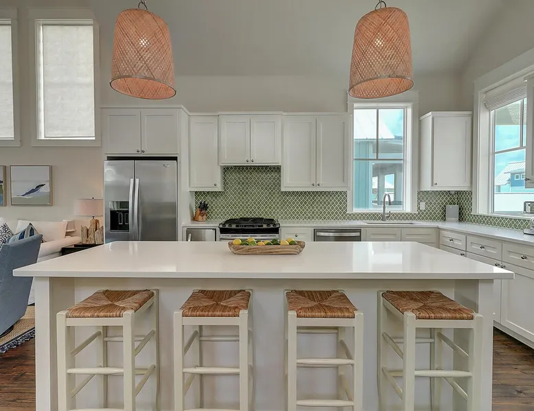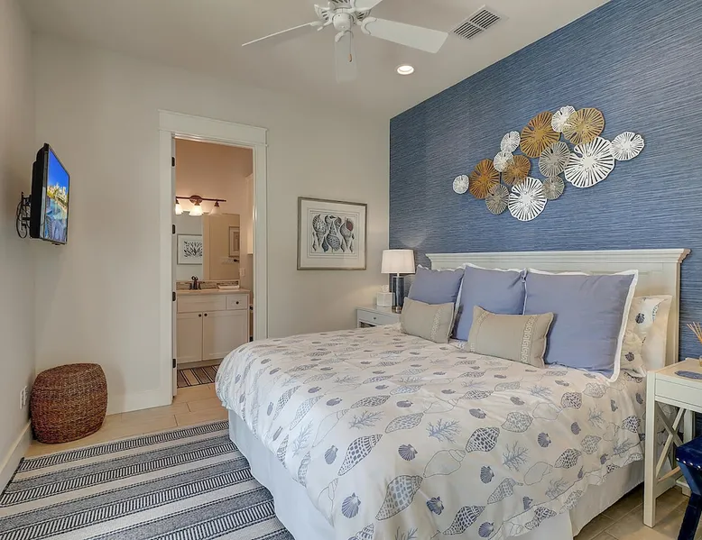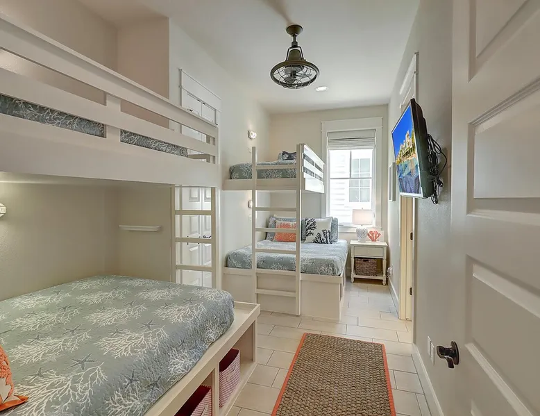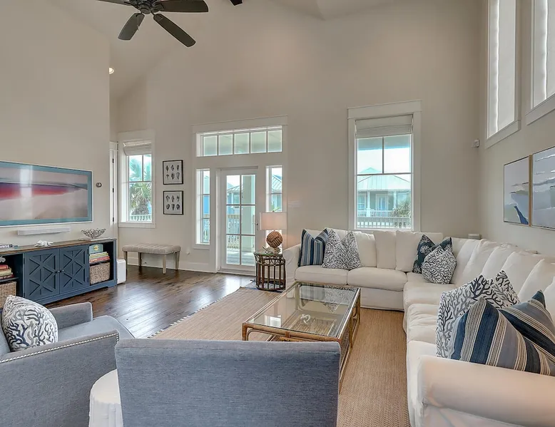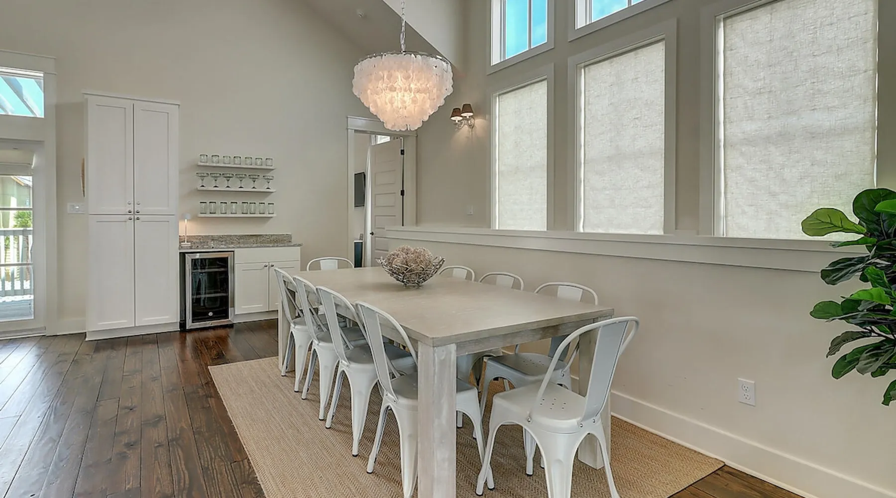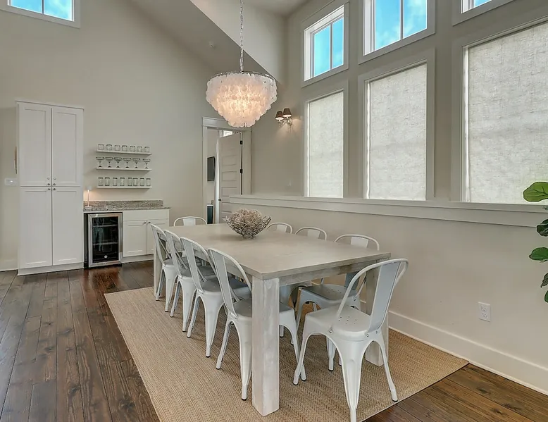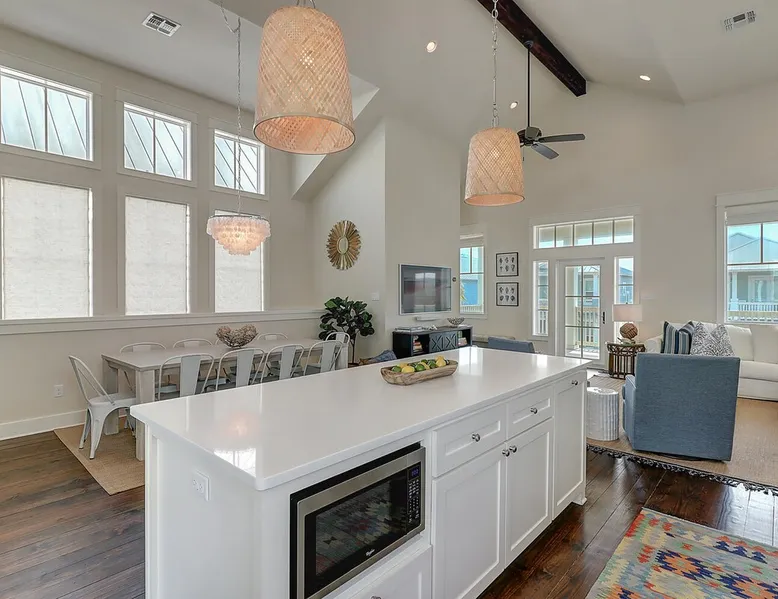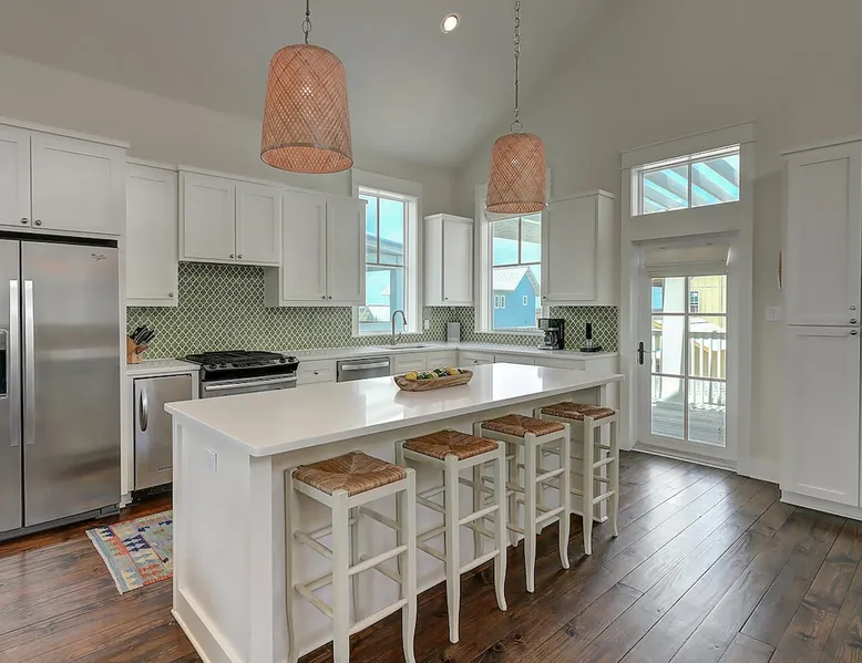 Shore Fun is comfortable, spacious, refined living. The beautiful shiplap lined entryway greets you with a sophisticated beachy feel. Get ready to enjoy family gatherings in the open great room with soaring ceilings, an abundance of natural light and plenty of seating. Relax on the expansive upstairs porch while taking in the idyllic view, listening to the music from the social circle or enjoying a meal al fresco. The space The large open kitchen is well appointed and draws you to gather around the large island. MAIN LIVING SPACE: The upstairs open floor plan is light, airy and spacious. It is a true “great room” in every sense the phrase! The kitchen features all stainless-steel appliances, a gas cooktop, oven and an additional freestanding ice maker. The large island is a wonderful gathering spot under the glow of the coastal pendant lights. Enjoy extra space at the bar to mix drinks and store beverages. The kitchen overlooks the dining area with a large table that seats 10 (or up to 12 with the additional table leaf). It adjoins the living room where you can relax on the sectional sofa that seats 6 easily and two swivel chairs to make watching TV on the 65-inch FRAME TV an experience. You can also kick back after a day at the beach with some relaxing music on the Sonos sound system. The upstairs has a front deck with ample seating and an outdoor dining table that seats 6. Off the kitchen you will find another deck with a Weber gas grill and gorgeous views of the sunset over the bay. Also, for convenience on this floor there is a half bathroom adorned in beachy shell wallpaper. At night, with dimmable light switches throughout, you’ll be able to set the perfect mood for any occasion. SLEEPING QUARTERS: This home features four bedrooms and three and a half baths. Lots of options with two primary bedrooms, one downstairs and one upstairs, each outfitted with a king bed and private bathroom. The downstairs king suite is decorated in a beautiful blue and white coastal theme. The bunk room is adorable and playful. It sleeps six with a twin over a queen bed and a twin over full bed. Each bed has its own nautical light and plug outlet. The back bedroom – with beautiful beachy fish prints and whimsical palm bedding – is tucked away and also features a king bed. Each bedroom has gorgeous custom draperies with black out lining so everyone can sleep in! Washer and dryer are available downstairs as well. The upstairs primary bedroom has vaulted ceilings with shiplap paneling, a Tempur-Pedic® mattress and a large bathroom with double sinks, separate shower and soaking tub, along with an enclosed water closet. GREAT FEATURES: The home is just a few doors down from the Stillwater pool that is heated year-round. It's also just steps away from the Social Circle, Lisabella's Bistro, Dylan's Pizzeria, the Coffee Shop, and all the action. Enjoy three porches to take in the views and spend time with friends and family. The home comfortably sleeps 12, making it ideal for multiple families or a fun friend trip! Shore Fun boasts many custom touches, clean crisp interiors and is within walking distance to everywhere you want to go. You are Shore to come back again and again! AMENITIES: At North, Resort-style amenities include three lavish pools, two scenic lakes, a fishing dock, fire pits, a fitness center, private dune crossovers, lawn games, a pirate ship playscape, and more! Enjoy on-site restaurants such as a Mediterranean bistro and a pizzeria, a coffee shop and café, while the Town Center hosts events, activities, and live music in peak season and on holiday weekends. ***NO PETS ALLOWED*** Shore Fun is a non-pet friendly property, if a pet is seen entering Shore Fun the homeowner and/or Cinnamon Shore Vacation Rentals has the right to immediately evict the renter with no refunds. An automatic non-refundable penalty fee of $1000 will be added to the reservation. Please review all policies at: STR#374960