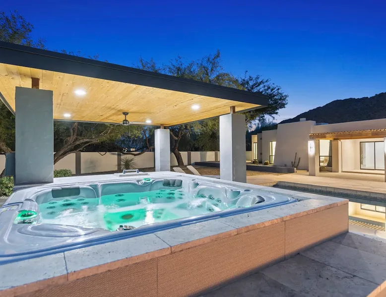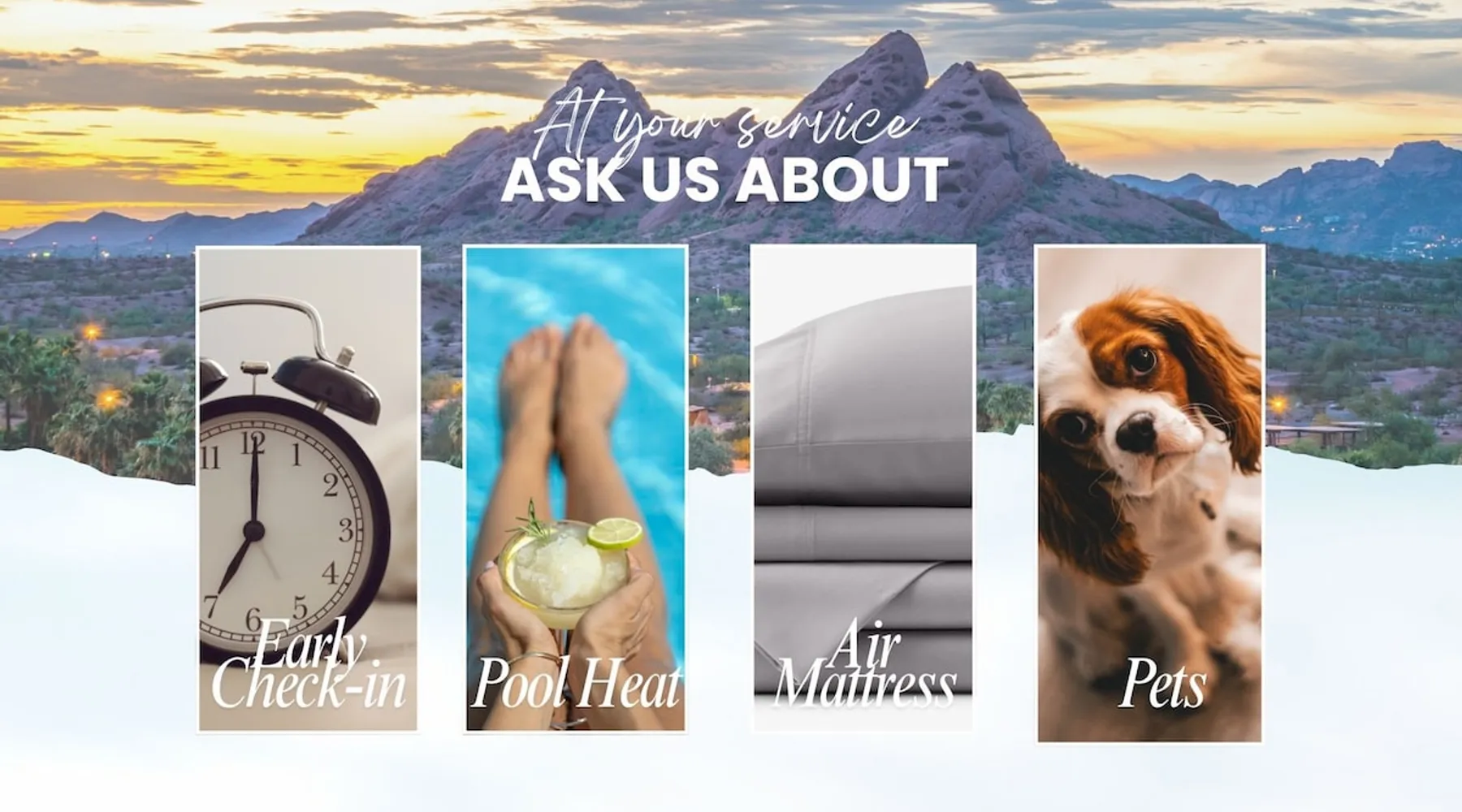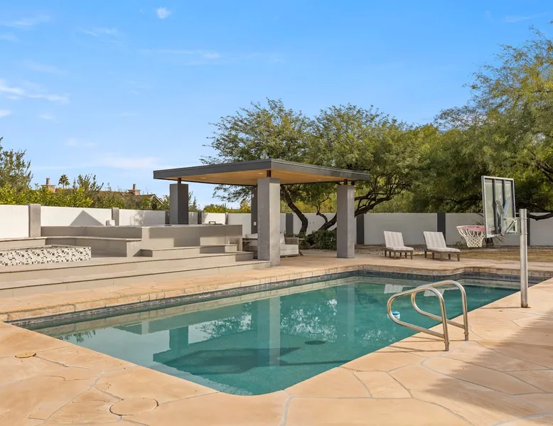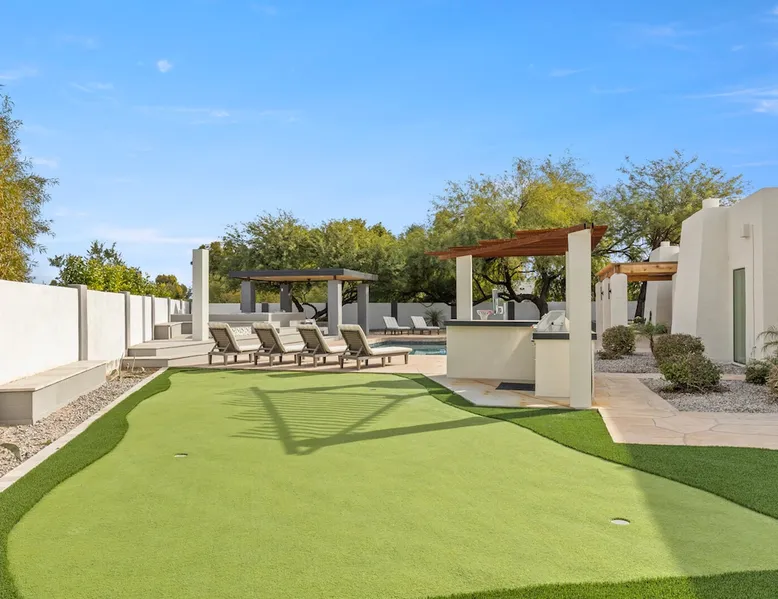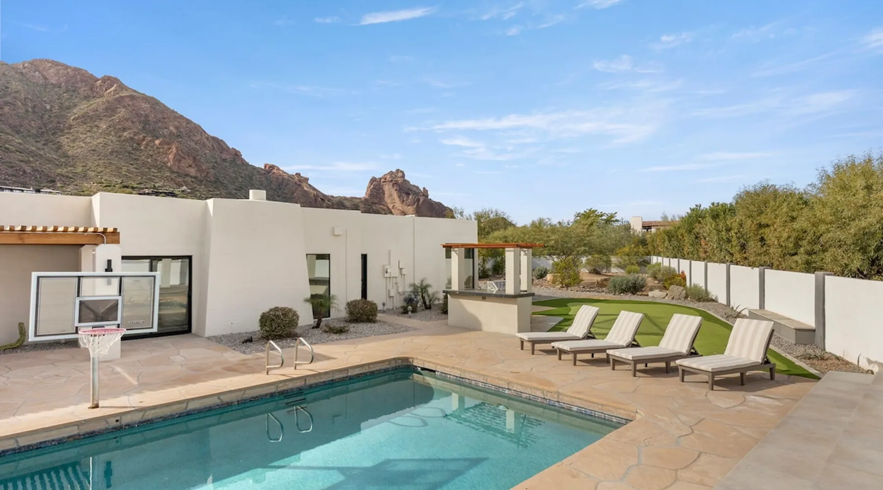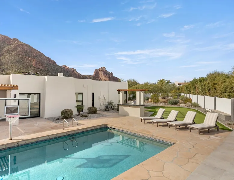 Nothing says luxury like staying on Billionaire Row, backdropped by the magnetic Camelback Mountains with views of The Praying Monk and walking distance to Sanctuary Resort & Spa! The space Welcome to Amangiri Scottsdale Welcome to another stunning estate by Hotel Home Stays, nestled in the heart of Arizona’s most exclusive neighborhood, Paradise Valley. This luxurious property is just a short walk from some of Arizona’s top destinations: the world-renowned Sanctuary Resort Spa, Mountain Shadows Resort with world-class golf, the iconic El Chorro for exceptional dining, and the scenic Camelback Mountain hiking trails. Luxury and convenience come together in this desert oasis. Key Highlights >> Exclusive location on Billionaire Row >> Breathtaking views of Camelback Mountain >> High-speed internet – Ideal for a “work-cation” >> Heated pool with water basketball (additional fee) >> Complimentary hot tub >> Outdoor kitchen, fire pit, and dining area >> Game Room & Mini Golf for fun and relaxation >> Pet-friendly (up to 2 dogs, 25 lbs max) >> Concierge service for personalized vacation planning >> 5 Smart TVs with access to all your favorite streaming apps Convenient Location: ** 10 minutes to the Biltmore ** 8 minutes to Old Town Scottsdale and Scottsdale Fashion Square ** 15 minutes to Kierland Commons, Scottsdale Quarter, and TPC Golf Course ** 15 minutes to Scottsdale Airport and Sky Harbor The Estate Step into this desert modern paradise, where every detail has been designed for comfort and relaxation. The open floor plan allows for seamless flow between spaces, from the gourmet kitchen to the spacious living areas. The chef’s kitchen is equipped with top-of-the-line appliances, offering everything you need to prepare a gourmet meal. The backyard oasis is where you’ll truly unwind. Swim in the sparkling heated pool, relax in the hot tub, or enjoy an al fresco meal on the outdoor patio, all while taking in the panoramic views of Camelback Mountain. There’s also a mini golf course, outdoor fire pit, and kitchen for entertaining. Whether you’re looking for adventure or relaxation, this estate has it all. Bedrooms & Sleeping Options Retreat to one of the luxurious bedrooms at the end of your day. Each room is thoughtfully designed with comfort and privacy in mind. Master Bedroom King bed with en-suite bathroom featuring a modern glass shower Spacious walk-in closet Private sitting area with TV Private patio with mountain views King Guest Suite King bed Private sitting area with fireplace (candles only) and TV Queen Bedroom (x3) 1 Queen bed with direct access to the backyard & closet 2nd Queen bed with reach-in closet with TV 3rd Queen bed with reach-in closet Game Room Bedroom Twin daybed and TV Sleeping Options: 2 Kings, 3 Queens, 1 Twin Daybed, 1 Queen Air Mattress, 1 Travel Crib Luxury Amenities >> Concierge Service – Let our team assist with transportation, bookings, special requests, and more >> Heated Pool (additional fee) – Please provide 48 hours' notice for pool heating requests >> Hot Tub – Complimentary access to the hot tub >> Fully stocked kitchen – Includes a coffee bar, mixology bar, kids' plates, cups, and essential appliances >> Game Room & Mini Golf – Fun for all ages >> Outdoor Fire Pit & Kitchen – Perfect for entertaining >> All-natural stone flooring throughout the home Guest Occupancy Maximum occupancy: 14 Pet Policy: Up to 2 dogs allowed (less than 25 lbs each). $250 fee per dog required upfront. Sorry, no cats. The Space The entire home, including the garage, is available during your stay. The garage features code entry and a button for access. Please note there is a step into the home and a few steps inside. This estate is situated on the side of a mountain, so you may encounter local wildlife during your stay. We recommend keeping trash in the garage to avoid attracting critters. Who is Hotel Home Stays? At Hotel Home Stays, we specialize in providing luxury vacation experiences that promote true peace for the soul. Our team ensures that every detail is taken care of with exceptional service, and our homes are designed with the finest comforts in mind. Protection: We go above and beyond with mattress encasements, hypoallergenic bedding, and cleanliness standards that exceed expectations. Effortless Experience: No need for keys—our door codes provide 24-hour access. All check-in details are provided via text and email. Excellence: Our team is here for you throughout your stay, providing local insights, fulfilling special requests, and handling any needs promptly. Complimentary Concierge Service Elevate your vacation with our complimentary concierge service. Our concierge can assist with: Transportation (car services, rentals) Spa treatments and reservations Private chef bookings Grocery delivery via InstaCart Babysitting services And much more! Book your stay at Amangiri Scottsdale and indulge in a luxury experience designed to provide ultimate relaxation and convenience. We look forward to hosting you in this exclusive desert retreat! Other things to note Guest Interaction Your personal concierge will reach out to you prior to your arrival. Feel free to ask about additional services such as personal chefs, trusted babysitters, and more! Security Cameras For your safety and insurance purposes, a security camera system is in place at the property, specifically around the pool area. --- One camera is located at the front door --- One camera overlooks the pool area in the back Pet Policy: -- Dogs under 20lbs each are allowed, with a maximum of two per stay. -- Written approval and a $250 fee per pet are required. -- Unauthorized pets may result in removal without refund and fines up to $1,500. -- Service animals, providing essential support to their owners, are exempt from this policy. They must be with their owners at all times, and emotional support animals do not qualify. -- Unfortunately, cats are not permitted due to severe guest all