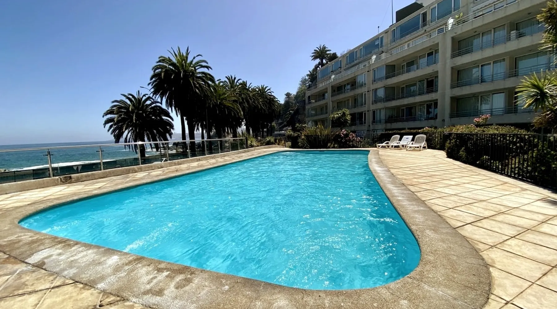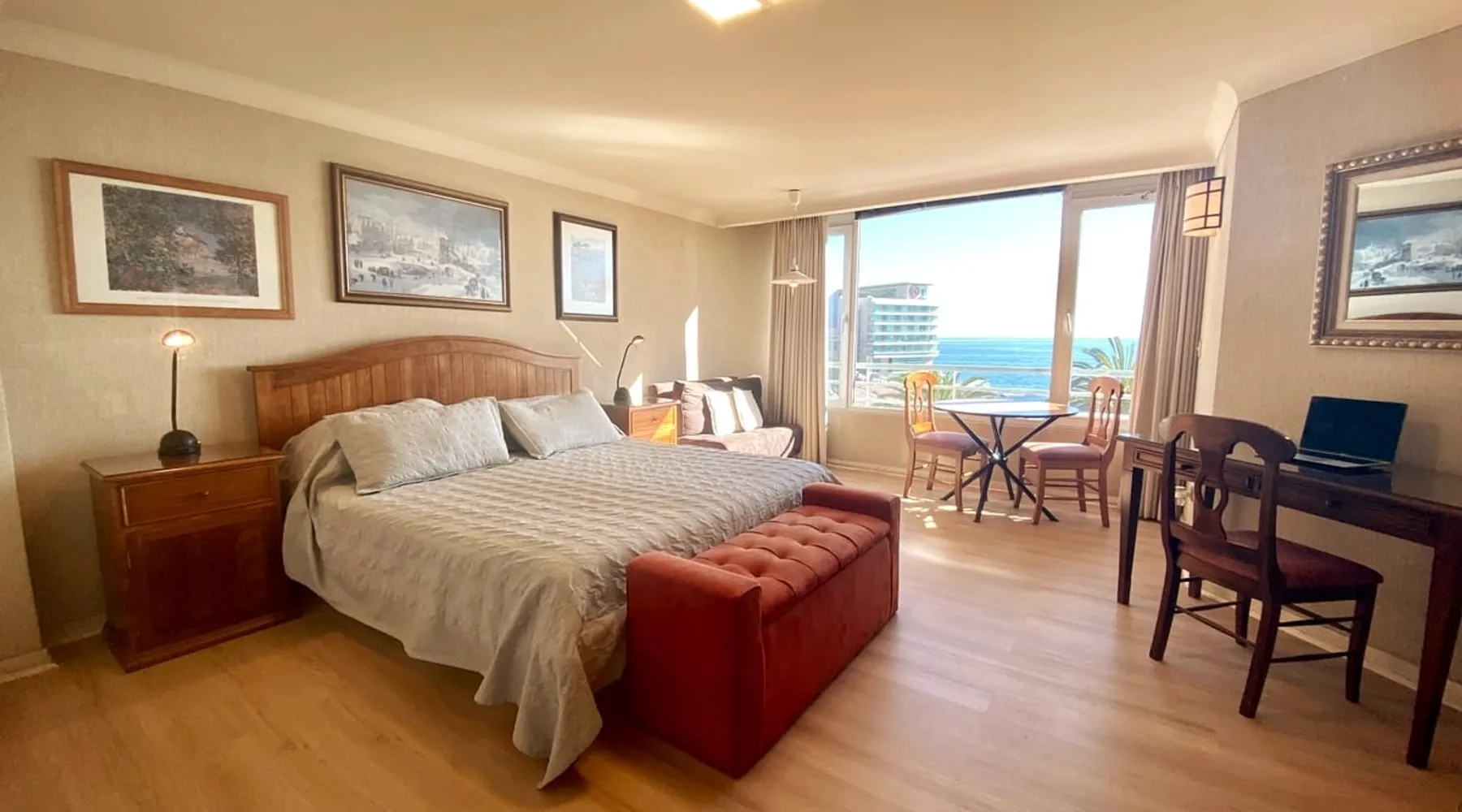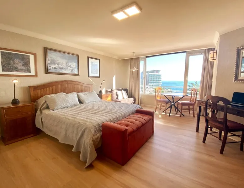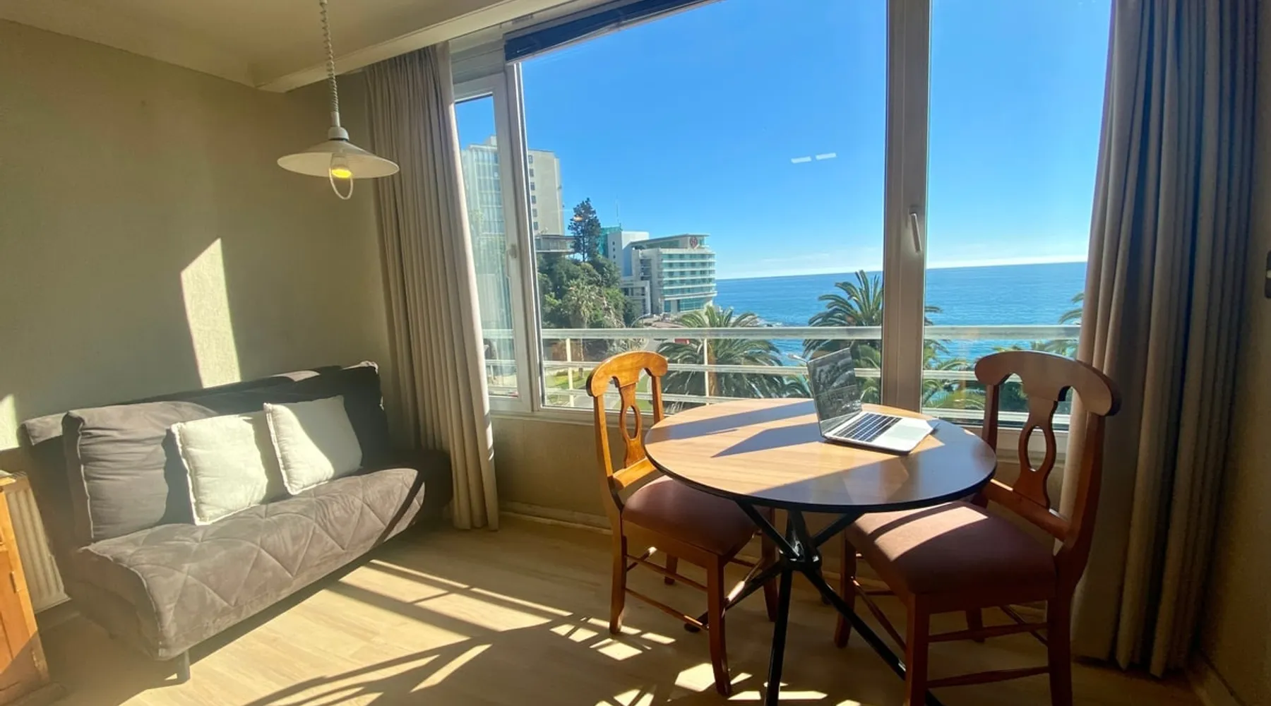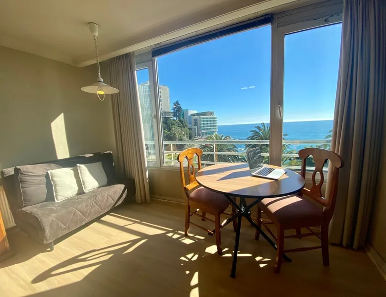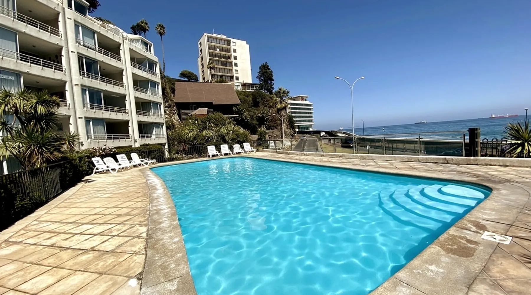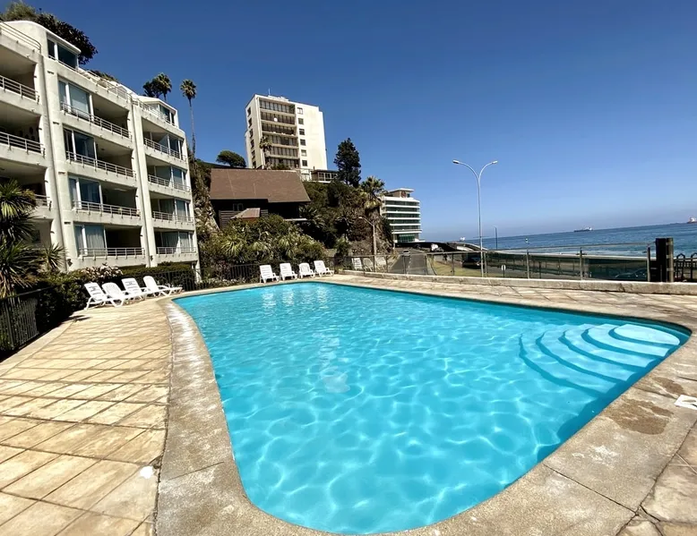 ⛵ Enjoy a unique stay in our bright studio with a stunning ocean view. Located in Cerro Castillo, minutes from the center of Viña del Mar and the beach. Perfect for taking a break and also for working. 🖥️ Ideal for digital nomads, couples looking for a getaway, and small vacation families. The space 🟢 King bed 🟢 Sofa bed 🟢 Full bathroom 🟢 Fully Equipped Kitchen 🟢 Desk 🟢 Wi-Fi (Fiber Optic 400 Mbps) 🟢 Free parking, 1 reserved space 🟢 Laundry in the building (additional value) 🟢 Swimming pool and gymnasium shared Guest access 🔑 The property features a smart lock, 24/7 access Other things to note ♻️ We use eco-friendly, biodegradable and antibacterial cleaning products. 🧡 We take care of our home, the environment and the community. 🤗 Thank you for being a respectful guest! 📅 Book now and live an unforgettable experience in Viña del Mar!