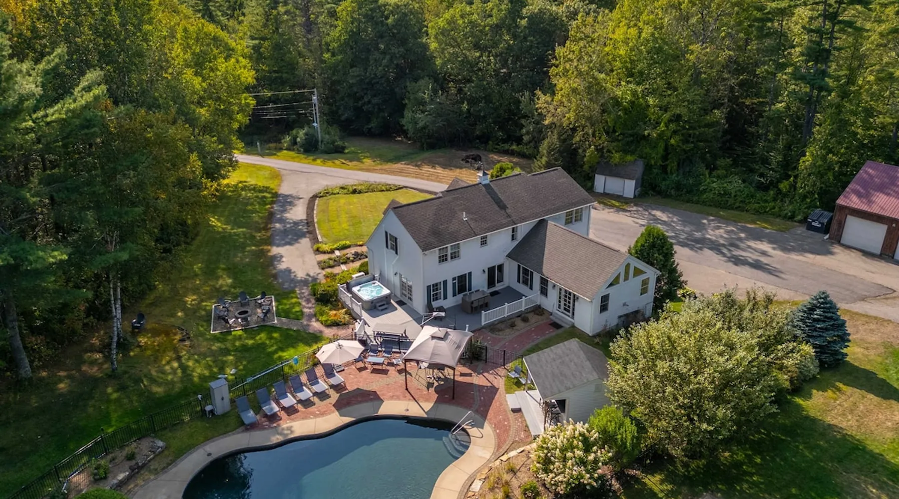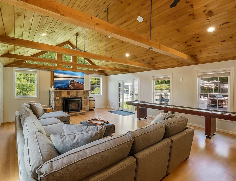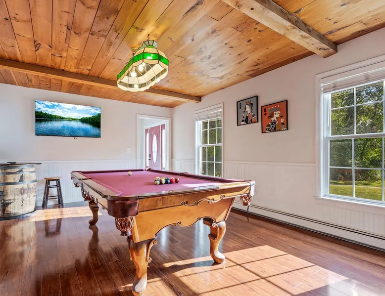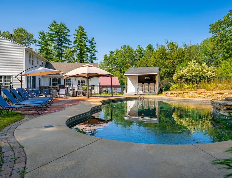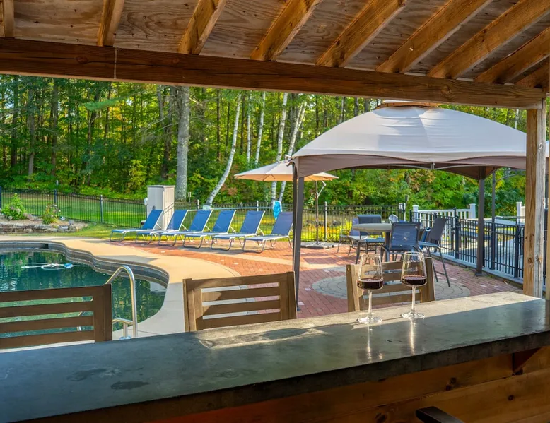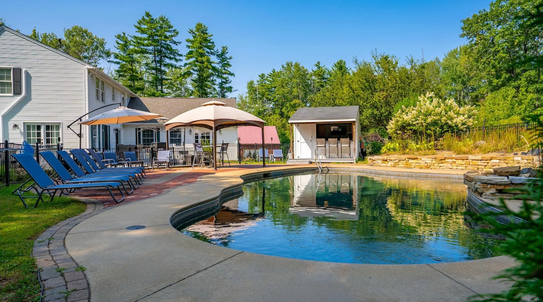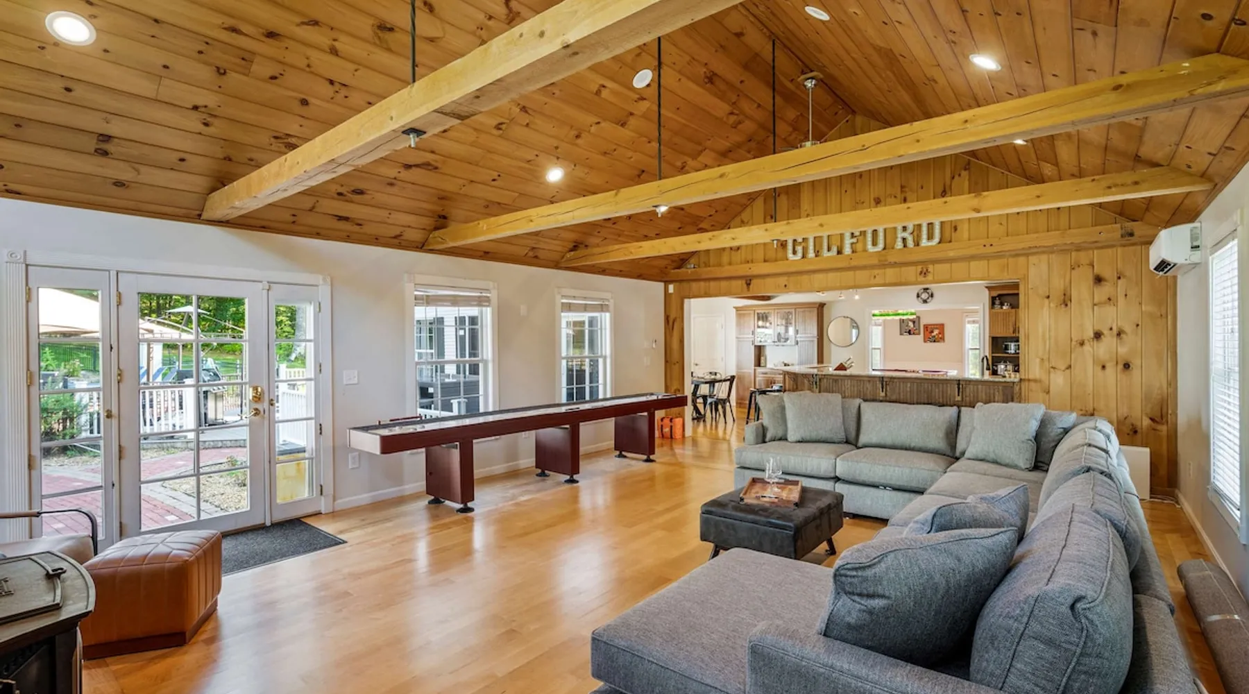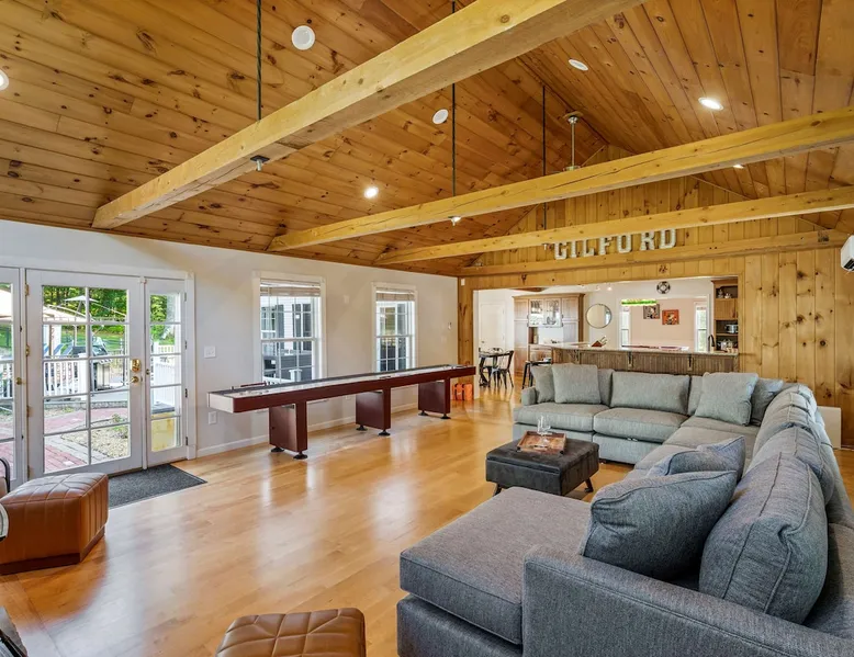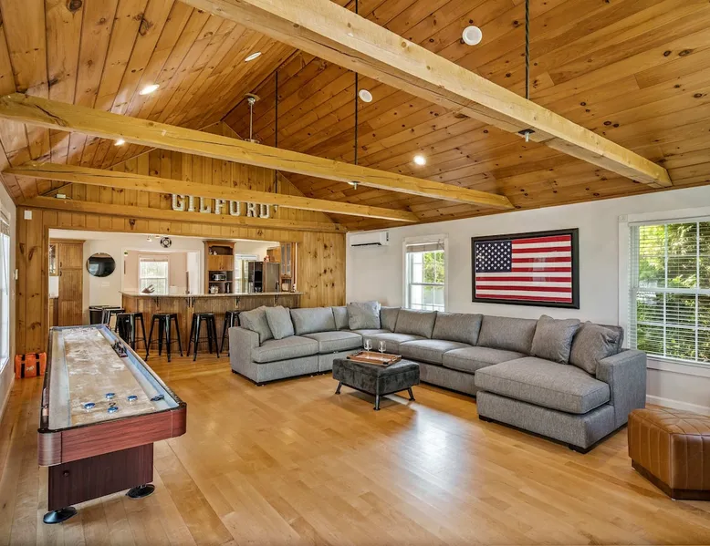 Welcome to the stunning, private escape of Gilford! This 6 bedroom, 4 full bathroom is the ideal vacation spot for you and your family- accommodating up to 18 guests. Sit back and relax by the pool and hot tub, or cozy up inside for a game night with a fully stocked game room: pool table, shuffle board, cards, board games, and more! Brand NEW outdoor fire pit! This house can accommodate ample parking. The space Working from home, no problem. This property features 2 state of the art standup desks with wireless charging. Staying just for fun, all 3 levels of the home have common areas to fit large groups and give guests some privacy from the others should they need it. Kitchen *Fully stocked kitchen with granite countertops, a ”knock-knock” fridge by LG, an induction cooktop, an oven and a wine/beer fridge to fit beverages for the whole family. The kitchen is equipped with everything you need to cook and entertain. A drip coffee pot and Keurig are included for your morning cup of coffee. The Grand Room *Amazing open floor plan that is all tied together by the Grand room that features 15 foot cathedral ceilings with wood beams, a 75 inch Smart TV, and a 14 foot wooden shuffleboard. Bedroom Configuration Bedroom 1- King - Main Level - this has the ensuite bathroom Bedroom 2- Queen - Main Level Bedroom 3- 2 Queens - Upper Level Bedroom 4- Queen - Upper Level Bedroom 5- King - Upper Level (w/ crib) Bedroom 6- Queen - Lower Level Plus four twin beds - 3 in the common area upstairs and 1 in the lower level Outside Area The Front yard features a private 500 foot driveway that was newly paved and lined with lighted lamps atop large granite posts. There is also a 40x25 fish pond with a fountain right where the 2 private driveways split left and right off the home. We just added a brand new fire pit with seating for 7 people. We do not leave firewood out for guests for liability purposes but you are welcome to bring your own as long as you follow the noise ordinance and be safe. The backyard has an incredible set up with a massive Gunite pool for the summer time and 5-person hot tub that is open all year round. Behind the Waterfall there is a horseshoe pit and an acre of flat lawn that is well maintained for any other backyard games. Adjacent to the pool there is a converted shed that is now an outdoor bar with seating for 4-5 people. The outdoor bar also has a Smart TV. We keep it open with the pool from Mid May to Late September and the pool can be heated for $750 per week or $500 per weekend at 78 degrees during the day. This rental has something for every season: Winter: Gunstock Mountain 10 minutes away (many other mountains within an hour drive) Spring: Boat Season opens back up just a few miles down the road Summer: The Pool opens up and golf season begins Fall: Foliage is incredible in the lakes region Hard to believe this Oasis is only a 90 minute drive from Boston. *7.8 miles from Gunstock Mountain Resort *6.9 miles from Bank of New Hampshire Pavilion Concert Venue *9 miles from Weirs Beach *2 miles from downtown Laconia *Loudon Motor Speedway *Minutes away from Laconia’s famous bike week *11 miles from Winnipesaukee Playhouse *12 miles from Canterbury Shaker Village *30 mins to Squam Lakes Natural Science Center *8 miles from Lakes Region Casino Guest access Guests have access to the entire house (minus owners closet). Other things to note Pets are allowed for $125 per dog- maximum 2 dogs. Pool may be heated for $700 per week or $350 per weekend with 48 hour notice. Guests must provide their own firewood if they would like to utilize the fire pit at their own discretion. It should never be left unattended while there is a live flame, and it should be extinguished entirely prior to going in for the night. Pellet Stove is just for show and will be locked for your stay. You are free to use the propane heater and obviously the traditional heating system. Please note there exterior cameras at the property. NH Meals & Rentals Tax Operator's License #104081