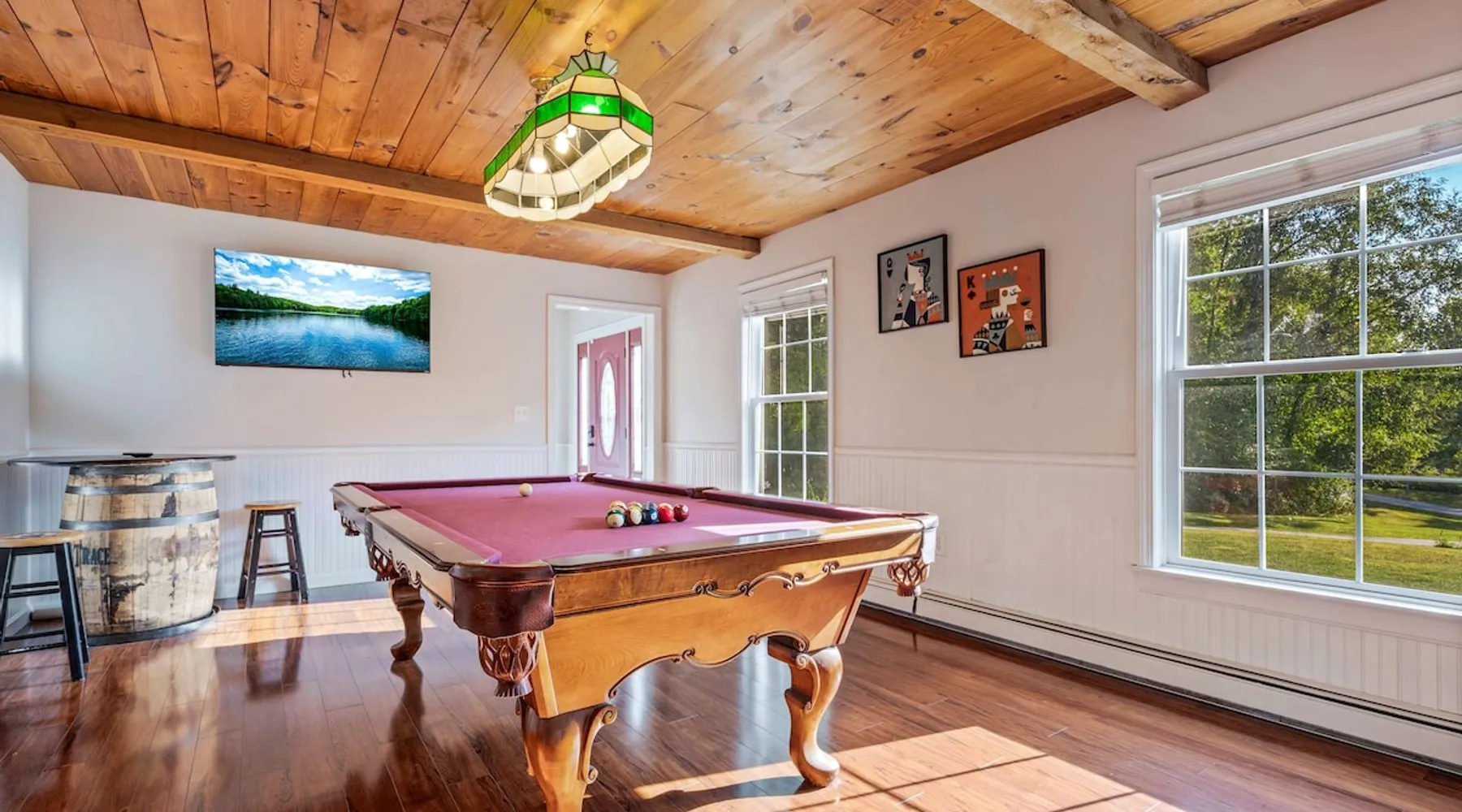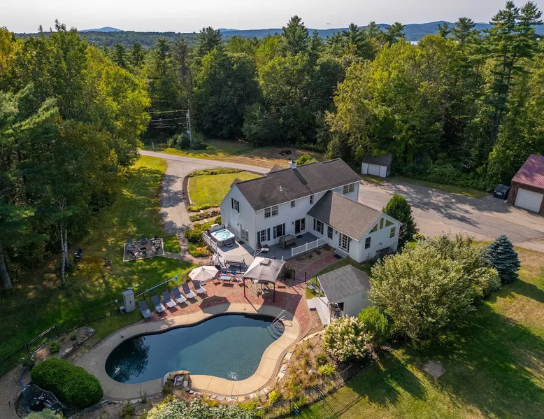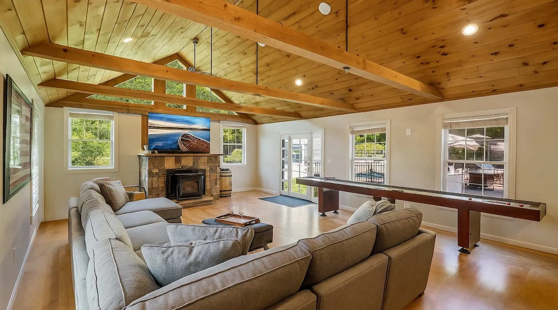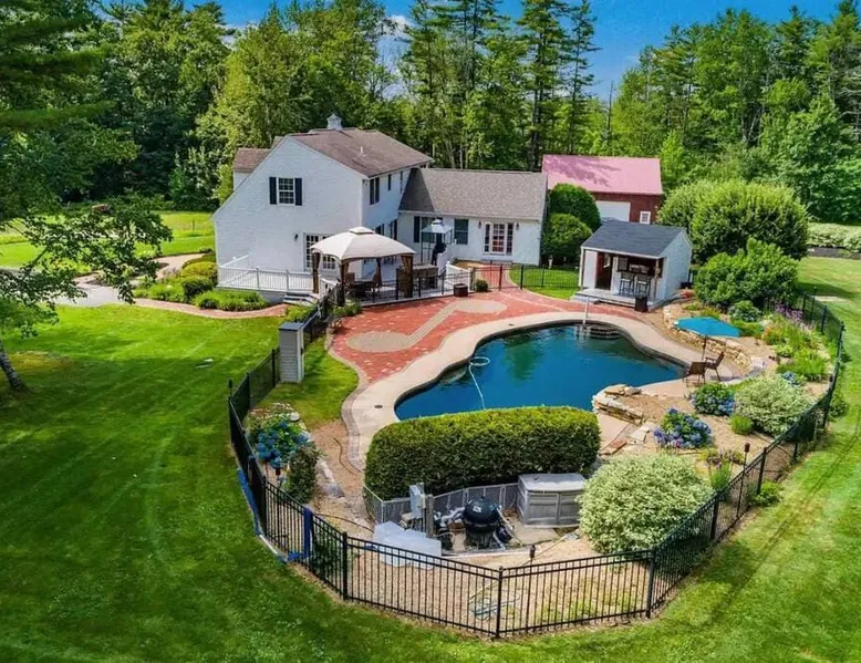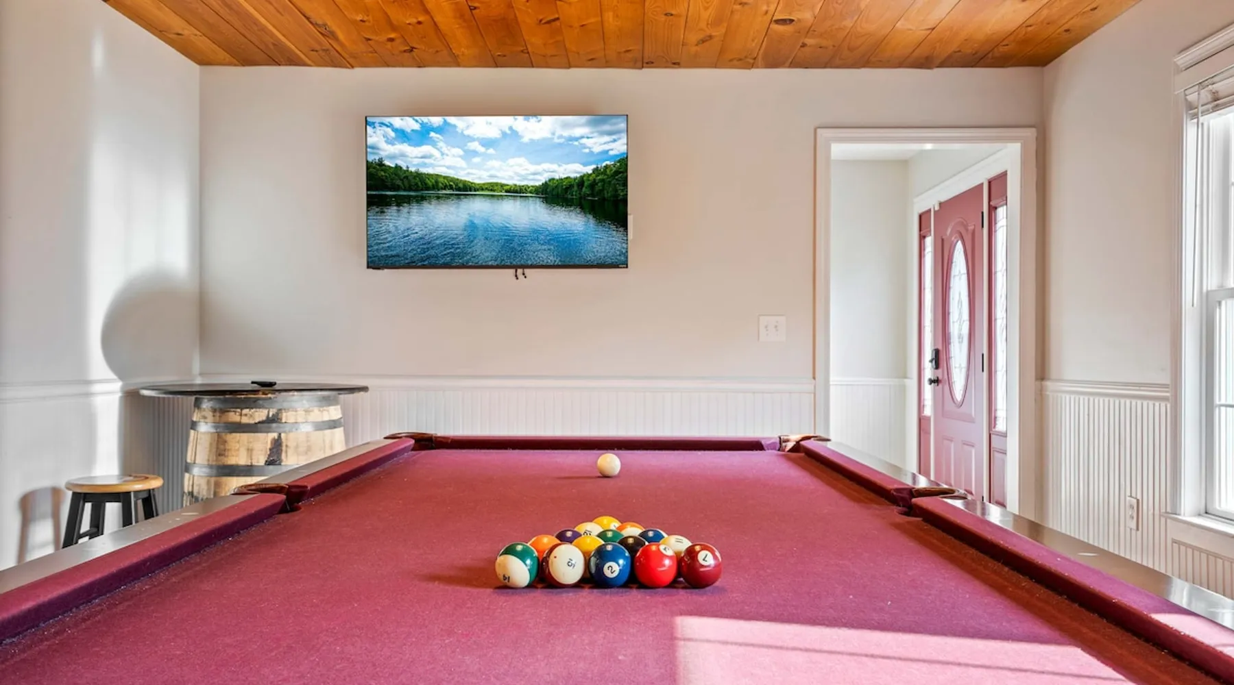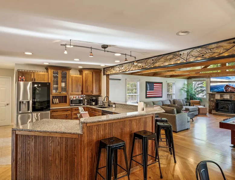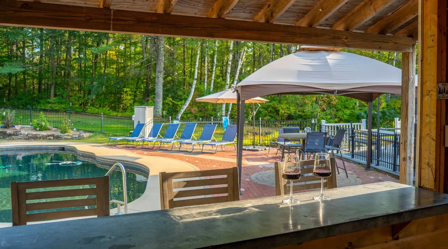 Welcome to the stunning, private escape of Gilford! This 6 bedroom, 4 full bathroom is the ideal vacation spot for you and your family- accommodating up to 18 guests. Sit back and relax by the pool and hot tub, or cozy up inside for a game night with a fully stocked game room: pool table, shuffle board, cards, board games, and more! Brand NEW outdoor fire pit! This house can accommodate ample parking. The space Working from home, no problem. This property features 2 state of the art standup desks with wireless charging. Staying just for fun, all 3 levels of the home have common areas to fit large groups and give guests some privacy from the others should they need it. Kitchen *Fully stocked kitchen with granite countertops, a ”knock-knock” fridge by LG, an induction cooktop, an oven and a wine/beer fridge to fit beverages for the whole family. The kitchen is equipped with everything you need to cook and entertain. A drip coffee pot and Keurig are included for your morning cup of coffee. The Grand Room *Amazing open floor plan that is all tied together by the Grand room that features 15 foot cathedral ceilings with wood beams, a 75 inch Smart TV, and a 14 foot wooden shuffleboard. Bedroom Configuration Bedroom 1- King - Main Level - this has the ensuite bathroom Bedroom 2- Queen - Main Level Bedroom 3- 2 Queens - Upper Level Bedroom 4- Queen - Upper Level Bedroom 5- King - Upper Level (w/ crib) Bedroom 6- Queen - Lower Level Plus four twin beds - 3 in the common area upstairs and 1 in the lower level Outside Area The Front yard features a private 500 foot driveway that was newly paved and lined with lighted lamps atop large granite posts. There is also a 40x25 fish pond with a fountain right where the 2 private driveways split left and right off the home. We just added a brand new fire pit with seating for 7 people. We do not leave firewood out for guests for liability purposes but you are welcome to bring your own as long as you follow the noise ordinance and be safe. The backyard has an incredible set up with a massive Gunite pool for the summer time and 5-person hot tub that is open all year round. Behind the Waterfall there is a horseshoe pit and an acre of flat lawn that is well maintained for any other backyard games. Adjacent to the pool there is a converted shed that is now an outdoor bar with seating for 4-5 people. The outdoor bar also has a Smart TV. We keep it open with the pool from Mid May to Late September and the pool can be heated for $750 per week or $500 per weekend at 78 degrees during the day. This rental has something for every season: Winter: Gunstock Mountain 10 minutes away (many other mountains within an hour drive) Spring: Boat Season opens back up just a few miles down the road Summer: The Pool opens up and golf season begins Fall: Foliage is incredible in the lakes region Hard to believe this Oasis is only a 90 minute drive from Boston. *7.8 miles from Gunstock Mountain Resort *6.9 miles from Bank of New Hampshire Pavilion Concert Venue *9 miles from Weirs Beach *2 miles from downtown Laconia *Loudon Motor Speedway *Minutes away from Laconia’s famous bike week *11 miles from Winnipesaukee Playhouse *12 miles from Canterbury Shaker Village *30 mins to Squam Lakes Natural Science Center *8 miles from Lakes Region Casino Guest access Guests have access to the entire house (minus owners closet). Other things to note Pets are allowed for $125 per dog- maximum 2 dogs. Pool may be heated for $700 per week or $350 per weekend with 48 hour notice. Guests must provide their own firewood if they would like to utilize the fire pit at their own discretion. It should never be left unattended while there is a live flame, and it should be extinguished entirely prior to going in for the night. Pellet Stove is just for show and will be locked for your stay. You are free to use the propane heater and obviously the traditional heating system. Please note there exterior cameras at the property. NH Meals & Rentals Tax Operator's License #104081