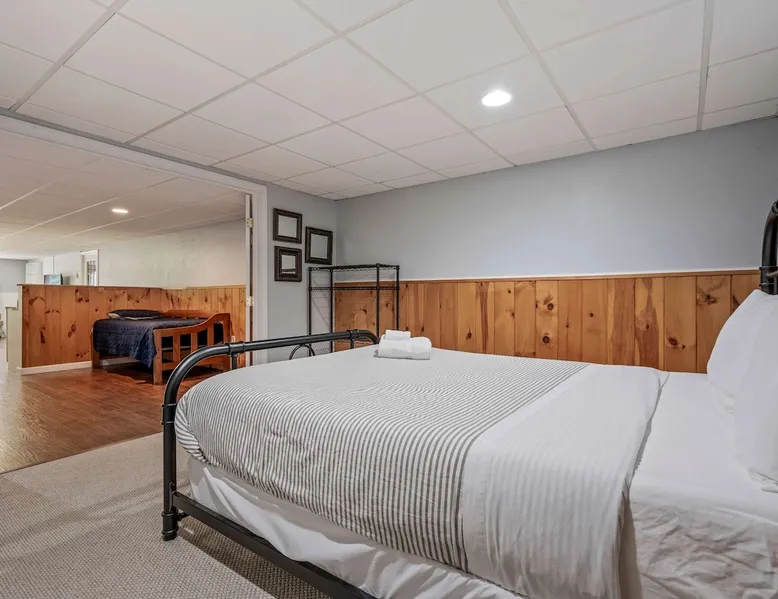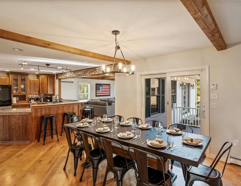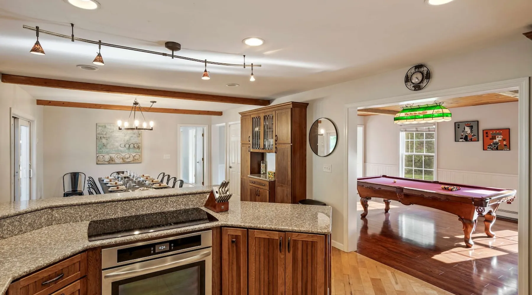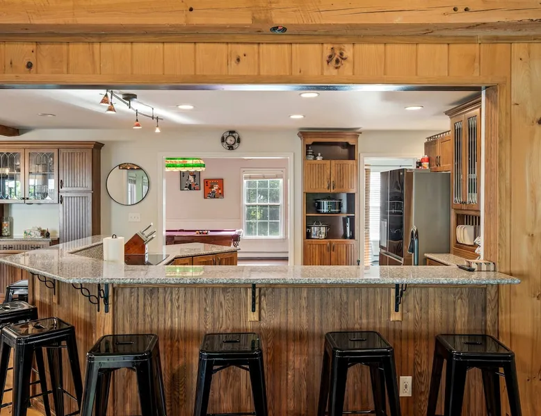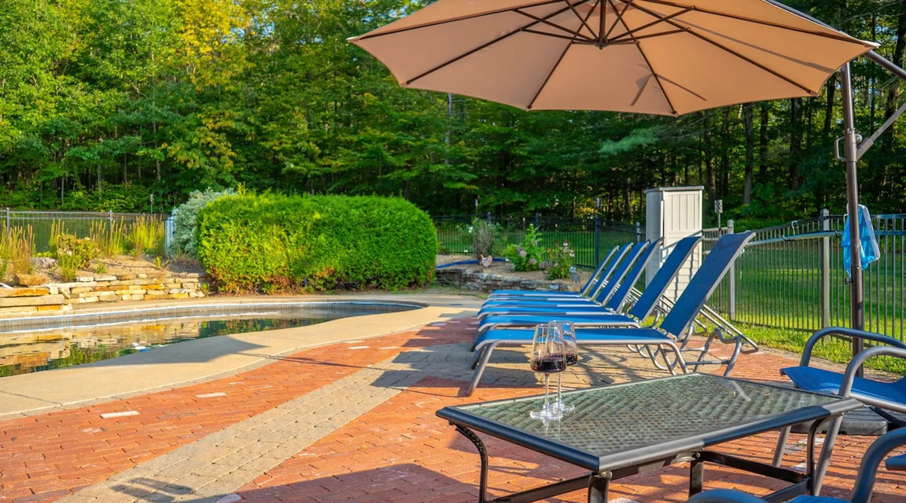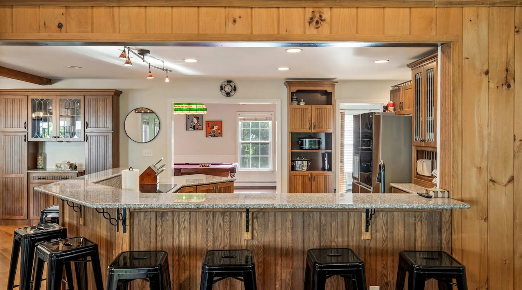 Welcome to the stunning, private escape of Gilford! This 6 bedroom, 4 full bathroom is the ideal vacation spot for you and your family- accommodating up to 18 guests. Sit back and relax by the pool and hot tub, or cozy up inside for a game night with a fully stocked game room: pool table, shuffle board, cards, board games, and more! Brand NEW outdoor fire pit! This house can accommodate ample parking. The space Working from home, no problem. This property features 2 state of the art standup desks with wireless charging. Staying just for fun, all 3 levels of the home have common areas to fit large groups and give guests some privacy from the others should they need it. Kitchen *Fully stocked kitchen with granite countertops, a ”knock-knock” fridge by LG, an induction cooktop, an oven and a wine/beer fridge to fit beverages for the whole family. The kitchen is equipped with everything you need to cook and entertain. A drip coffee pot and Keurig are included for your morning cup of coffee. The Grand Room *Amazing open floor plan that is all tied together by the Grand room that features 15 foot cathedral ceilings with wood beams, a 75 inch Smart TV, and a 14 foot wooden shuffleboard. Bedroom Configuration Bedroom 1- King - Main Level - this has the ensuite bathroom Bedroom 2- Queen - Main Level Bedroom 3- 2 Queens - Upper Level Bedroom 4- Queen - Upper Level Bedroom 5- King - Upper Level (w/ crib) Bedroom 6- Queen - Lower Level Plus four twin beds - 3 in the common area upstairs and 1 in the lower level Outside Area The Front yard features a private 500 foot driveway that was newly paved and lined with lighted lamps atop large granite posts. There is also a 40x25 fish pond with a fountain right where the 2 private driveways split left and right off the home. We just added a brand new fire pit with seating for 7 people. We do not leave firewood out for guests for liability purposes but you are welcome to bring your own as long as you follow the noise ordinance and be safe. The backyard has an incredible set up with a massive Gunite pool for the summer time and 5-person hot tub that is open all year round. Behind the Waterfall there is a horseshoe pit and an acre of flat lawn that is well maintained for any other backyard games. Adjacent to the pool there is a converted shed that is now an outdoor bar with seating for 4-5 people. The outdoor bar also has a Smart TV. We keep it open with the pool from Mid May to Late September and the pool can be heated for $750 per week or $500 per weekend at 78 degrees during the day. This rental has something for every season: Winter: Gunstock Mountain 10 minutes away (many other mountains within an hour drive) Spring: Boat Season opens back up just a few miles down the road Summer: The Pool opens up and golf season begins Fall: Foliage is incredible in the lakes region Hard to believe this Oasis is only a 90 minute drive from Boston. *7.8 miles from Gunstock Mountain Resort *6.9 miles from Bank of New Hampshire Pavilion Concert Venue *9 miles from Weirs Beach *2 miles from downtown Laconia *Loudon Motor Speedway *Minutes away from Laconia’s famous bike week *11 miles from Winnipesaukee Playhouse *12 miles from Canterbury Shaker Village *30 mins to Squam Lakes Natural Science Center *8 miles from Lakes Region Casino Guest access Guests have access to the entire house (minus owners closet). Other things to note Pets are allowed for $125 per dog- maximum 2 dogs. Pool may be heated for $700 per week or $350 per weekend with 48 hour notice. Guests must provide their own firewood if they would like to utilize the fire pit at their own discretion. It should never be left unattended while there is a live flame, and it should be extinguished entirely prior to going in for the night. Pellet Stove is just for show and will be locked for your stay. You are free to use the propane heater and obviously the traditional heating system. Please note there exterior cameras at the property. NH Meals & Rentals Tax Operator's License #104081