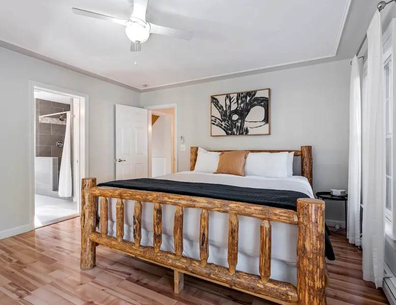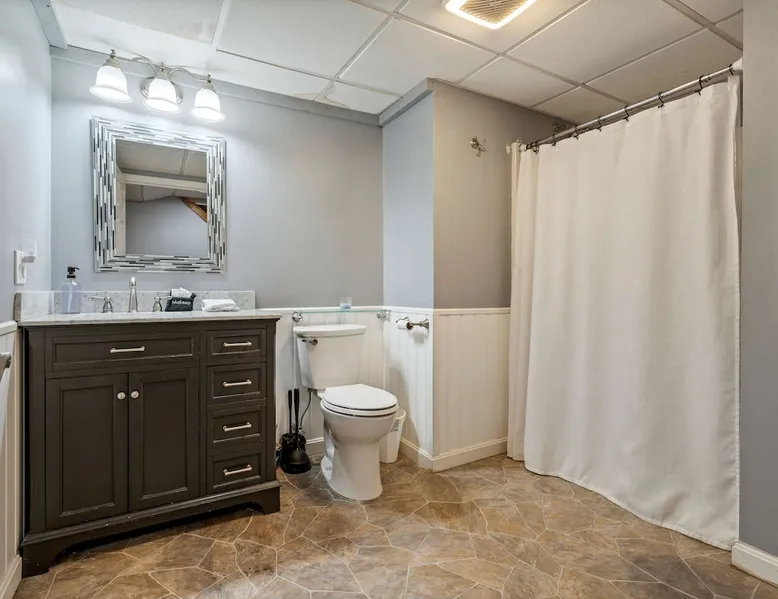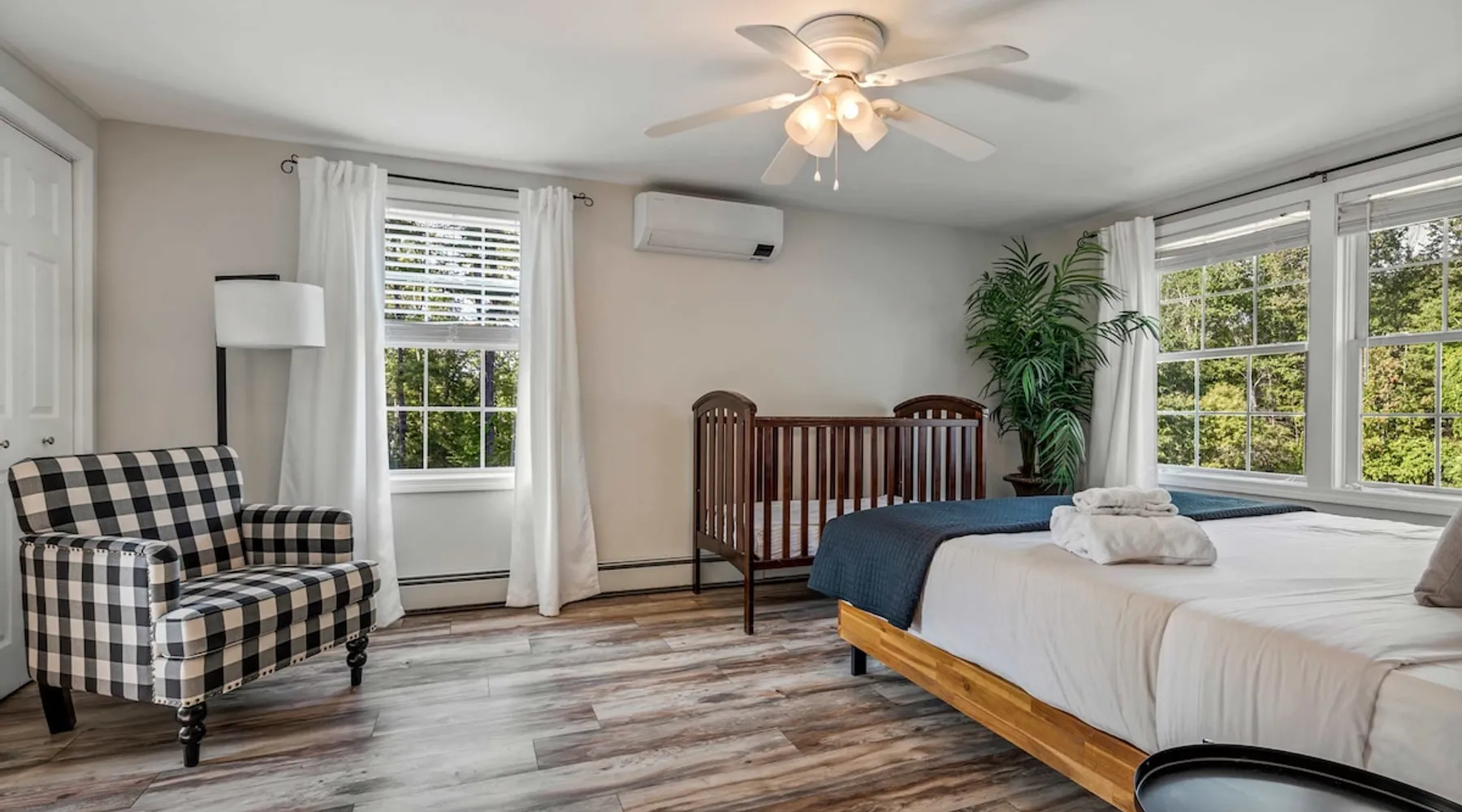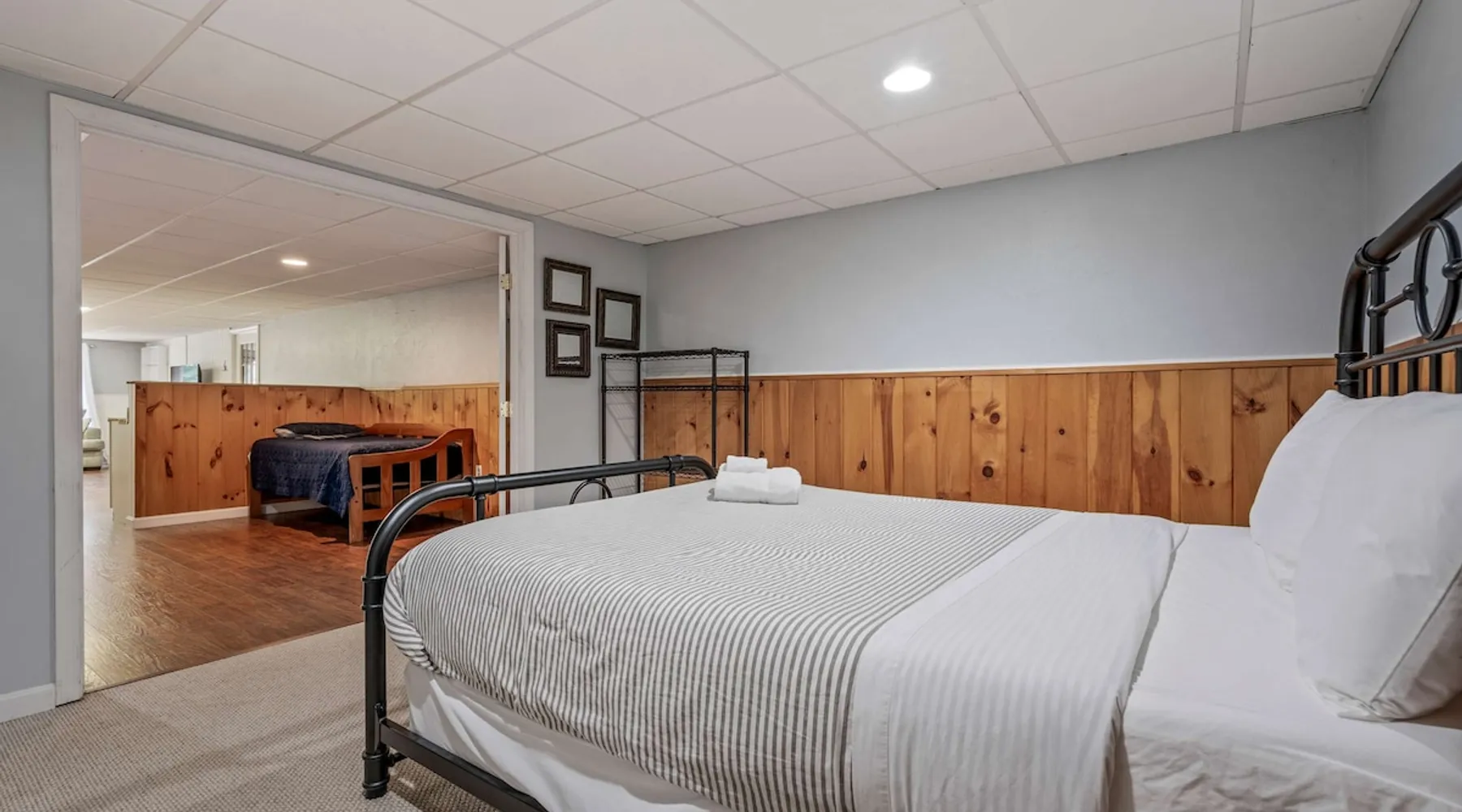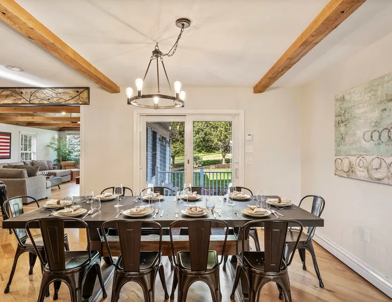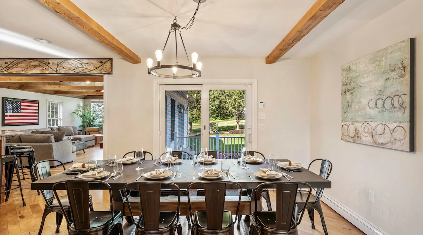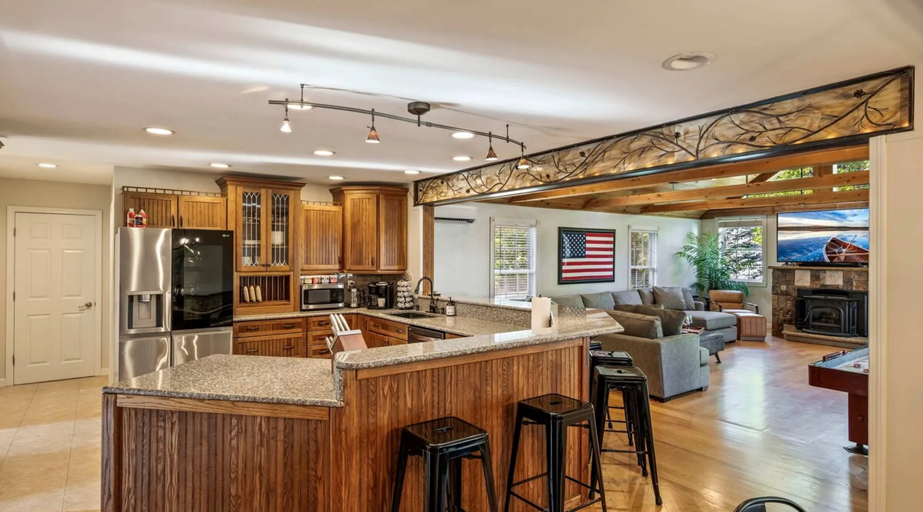 Welcome to the stunning, private escape of Gilford! This 6 bedroom, 4 full bathroom is the ideal vacation spot for you and your family- accommodating up to 18 guests. Sit back and relax by the pool and hot tub, or cozy up inside for a game night with a fully stocked game room: pool table, shuffle board, cards, board games, and more! Brand NEW outdoor fire pit! This house can accommodate ample parking. The space Working from home, no problem. This property features 2 state of the art standup desks with wireless charging. Staying just for fun, all 3 levels of the home have common areas to fit large groups and give guests some privacy from the others should they need it. Kitchen *Fully stocked kitchen with granite countertops, a ”knock-knock” fridge by LG, an induction cooktop, an oven and a wine/beer fridge to fit beverages for the whole family. The kitchen is equipped with everything you need to cook and entertain. A drip coffee pot and Keurig are included for your morning cup of coffee. The Grand Room *Amazing open floor plan that is all tied together by the Grand room that features 15 foot cathedral ceilings with wood beams, a 75 inch Smart TV, and a 14 foot wooden shuffleboard. Bedroom Configuration Bedroom 1- King - Main Level - this has the ensuite bathroom Bedroom 2- Queen - Main Level Bedroom 3- 2 Queens - Upper Level Bedroom 4- Queen - Upper Level Bedroom 5- King - Upper Level (w/ crib) Bedroom 6- Queen - Lower Level Plus four twin beds - 3 in the common area upstairs and 1 in the lower level Outside Area The Front yard features a private 500 foot driveway that was newly paved and lined with lighted lamps atop large granite posts. There is also a 40x25 fish pond with a fountain right where the 2 private driveways split left and right off the home. We just added a brand new fire pit with seating for 7 people. We do not leave firewood out for guests for liability purposes but you are welcome to bring your own as long as you follow the noise ordinance and be safe. The backyard has an incredible set up with a massive Gunite pool for the summer time and 5-person hot tub that is open all year round. Behind the Waterfall there is a horseshoe pit and an acre of flat lawn that is well maintained for any other backyard games. Adjacent to the pool there is a converted shed that is now an outdoor bar with seating for 4-5 people. The outdoor bar also has a Smart TV. We keep it open with the pool from Mid May to Late September and the pool can be heated for $750 per week or $500 per weekend at 78 degrees during the day. This rental has something for every season: Winter: Gunstock Mountain 10 minutes away (many other mountains within an hour drive) Spring: Boat Season opens back up just a few miles down the road Summer: The Pool opens up and golf season begins Fall: Foliage is incredible in the lakes region Hard to believe this Oasis is only a 90 minute drive from Boston. *7.8 miles from Gunstock Mountain Resort *6.9 miles from Bank of New Hampshire Pavilion Concert Venue *9 miles from Weirs Beach *2 miles from downtown Laconia *Loudon Motor Speedway *Minutes away from Laconia’s famous bike week *11 miles from Winnipesaukee Playhouse *12 miles from Canterbury Shaker Village *30 mins to Squam Lakes Natural Science Center *8 miles from Lakes Region Casino Guest access Guests have access to the entire house (minus owners closet). Other things to note Pets are allowed for $125 per dog- maximum 2 dogs. Pool may be heated for $700 per week or $350 per weekend with 48 hour notice. Guests must provide their own firewood if they would like to utilize the fire pit at their own discretion. It should never be left unattended while there is a live flame, and it should be extinguished entirely prior to going in for the night. Pellet Stove is just for show and will be locked for your stay. You are free to use the propane heater and obviously the traditional heating system. Please note there exterior cameras at the property. NH Meals & Rentals Tax Operator's License #104081