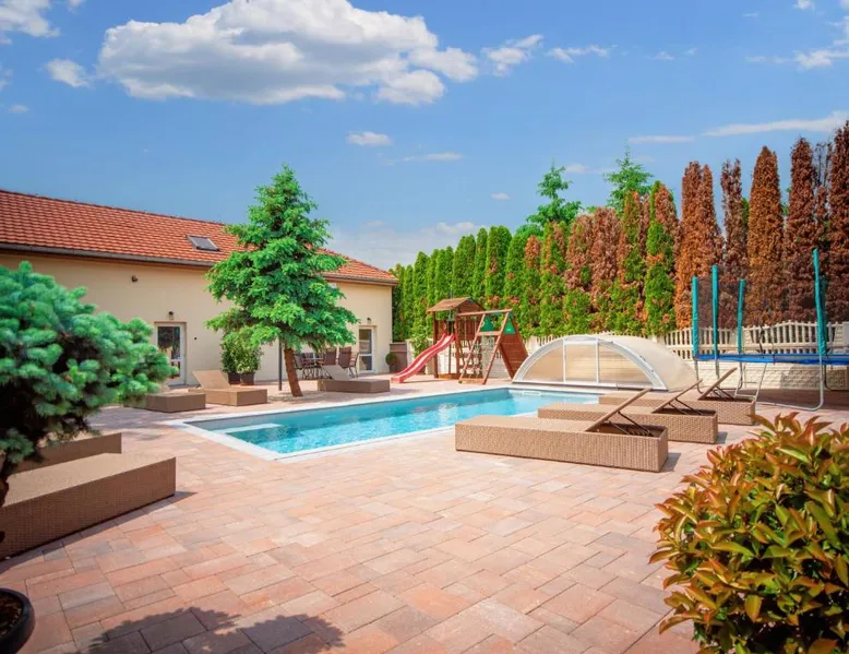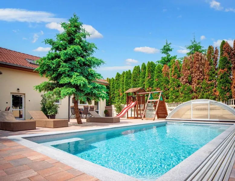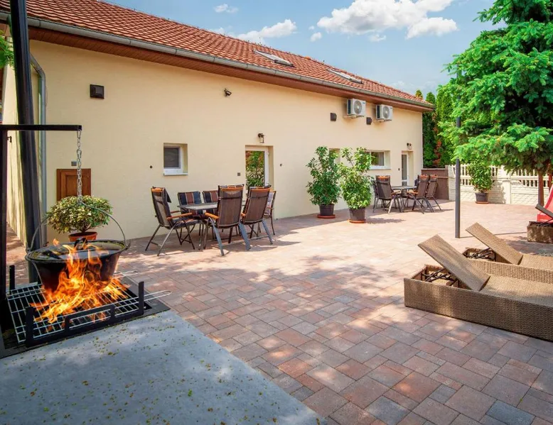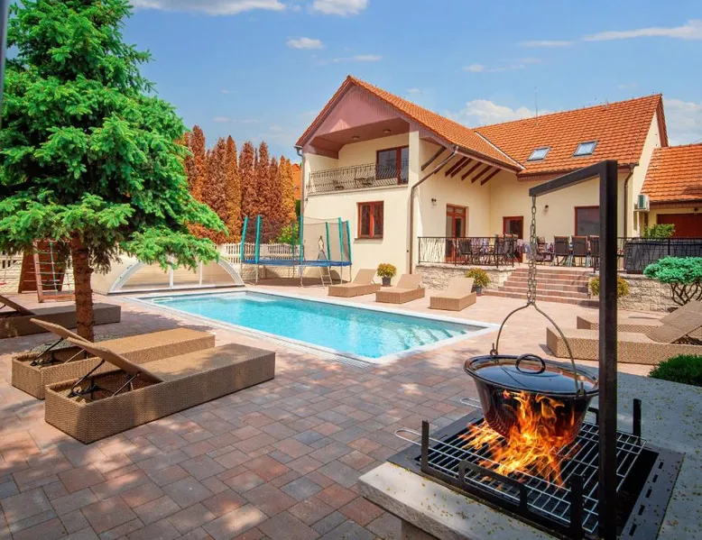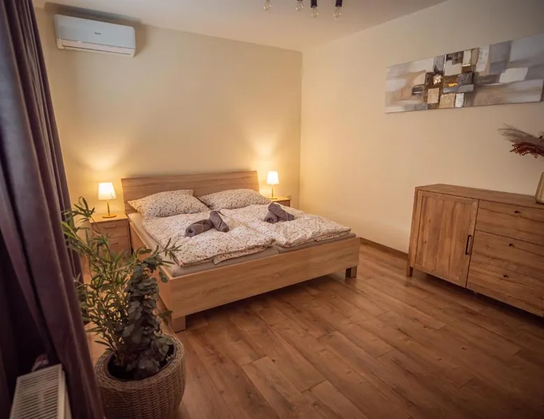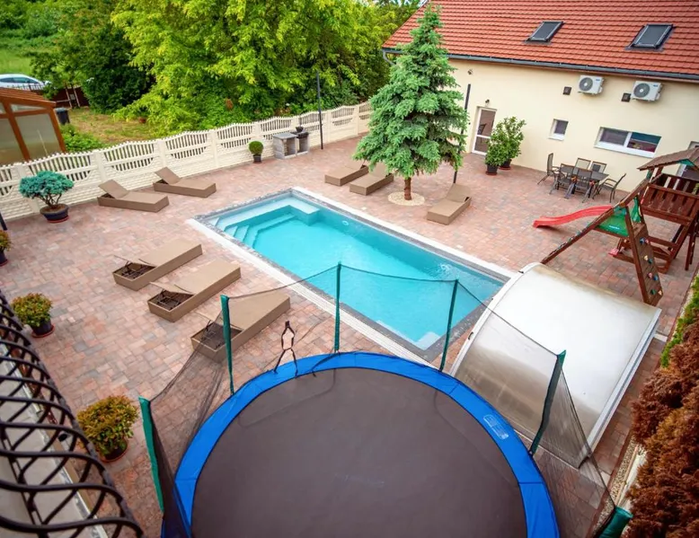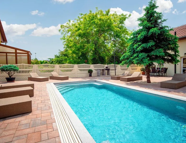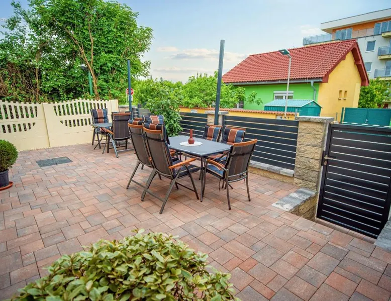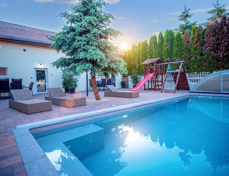 Comfortable Accommodations: Duna Apartments Štúrovo in Štúrovo offers a saltwater swimming pool, sun terrace, and a beautiful garden. Guests enjoy free WiFi throughout the property. Modern Amenities: Each apartment features air-conditioning, a terrace, kitchenette, private bathroom, kitchen, and TV. Additional amenities include a balcony, washing machine, and free private parking. Leisure Facilities: The property provides a children's playground, outdoor seating area, and picnic area. Private check-in and check-out services ensure a smooth arrival and departure. Nearby Attractions: Margaret Island Japanese Garden is 29 mi away, and Chain Bridge is 31 mi from the apartment. Hiking trails and boating opportunities are available in the surrounding area. The private pool is the standout feature of this apartment. Boasting 2 bedrooms and 1 bathroom, this spacious apartment has a living room and terrace where you can relax. The apartment's kitchen is available for cooking and storing food. This apartment features air conditioning and a flat-screen TV. The unit offers 5 beds.