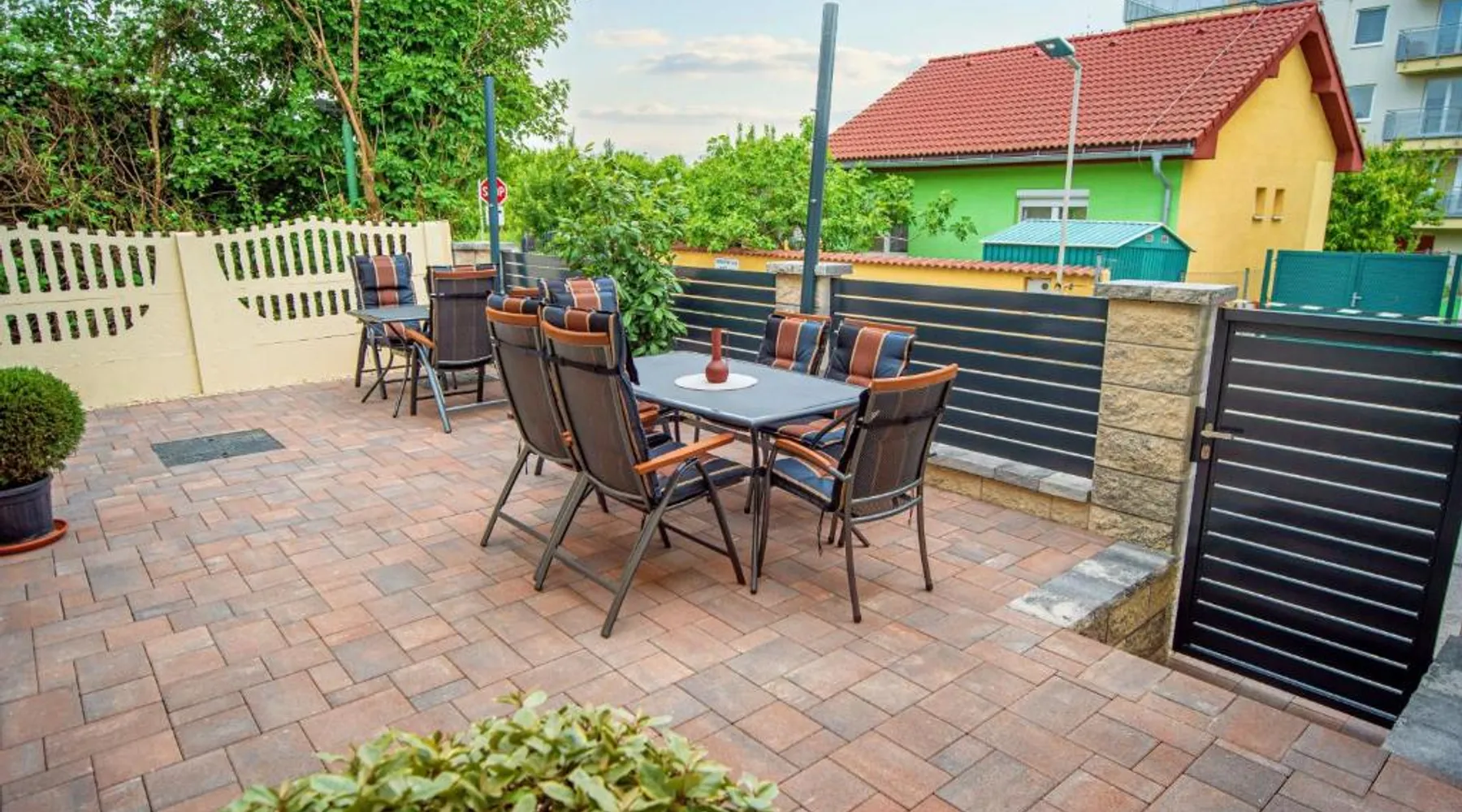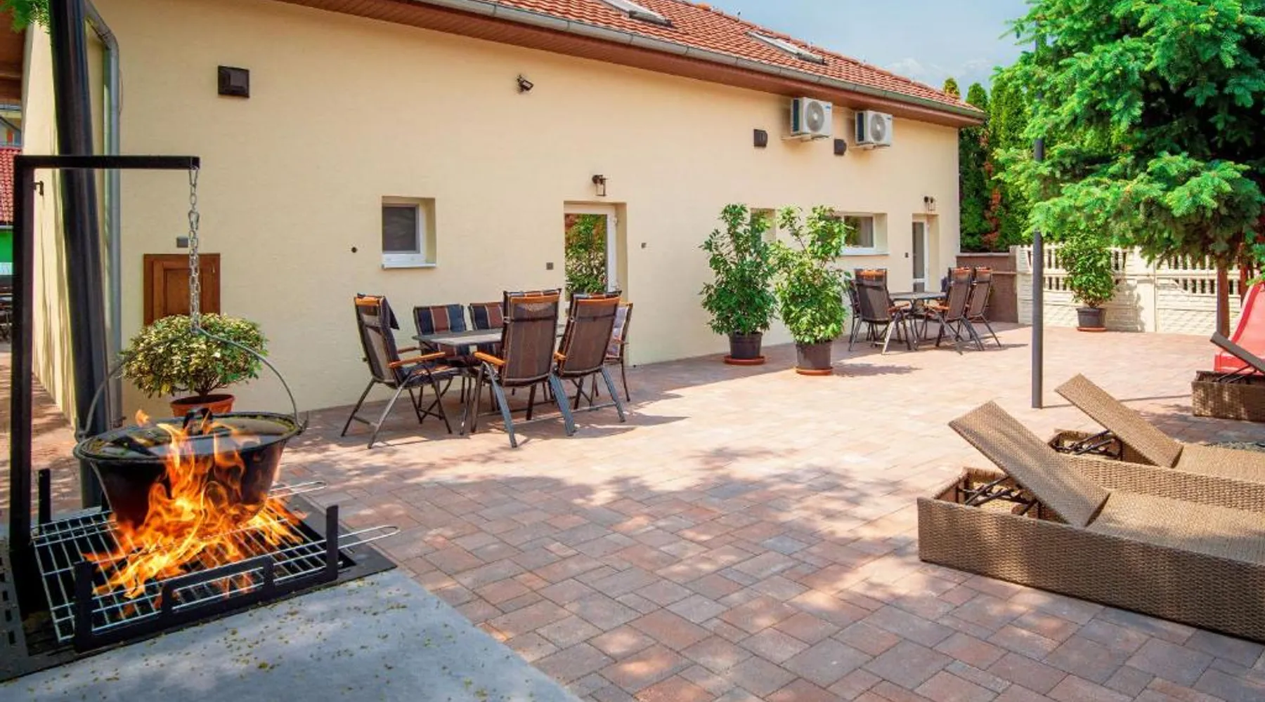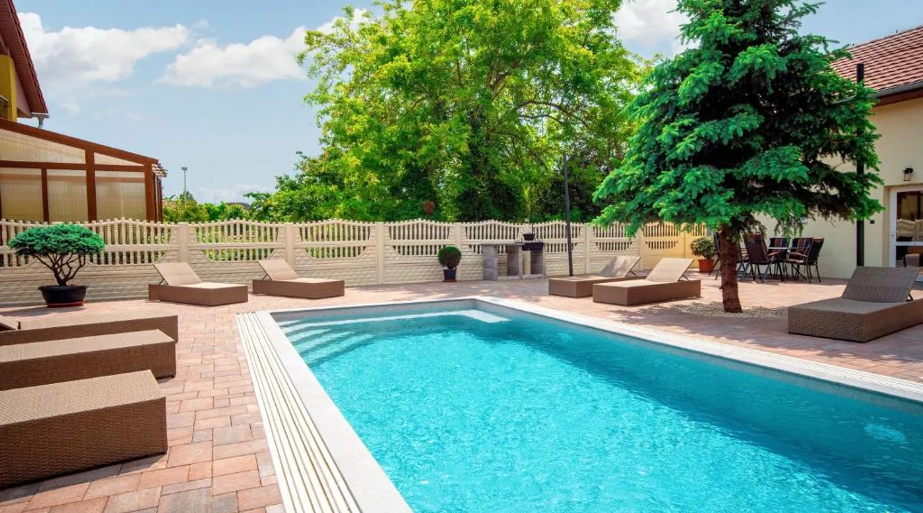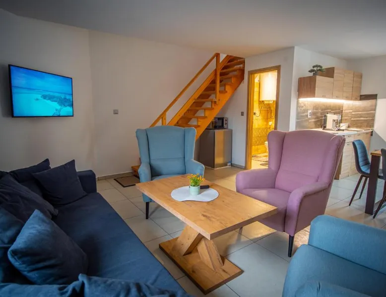 Comfortable Accommodations: Duna Apartments Štúrovo in Štúrovo offers a saltwater swimming pool, sun terrace, and a beautiful garden. Guests enjoy free WiFi throughout the property. Modern Amenities: Each apartment features air-conditioning, a terrace, kitchenette, private bathroom, kitchen, and TV. Additional amenities include a balcony, washing machine, and free private parking. Leisure Facilities: The property provides a children's playground, outdoor seating area, and picnic area. Private check-in and check-out services ensure a smooth arrival and departure. Nearby Attractions: Margaret Island Japanese Garden is 29 mi away, and Chain Bridge is 31 mi from the apartment. Hiking trails and boating opportunities are available in the surrounding area. The private pool is the standout feature of this apartment. Boasting 2 bedrooms and 1 bathroom, this spacious apartment has a living room and terrace where you can relax. The apartment's kitchen is available for cooking and storing food. This apartment features air conditioning and a flat-screen TV. The unit offers 5 beds.