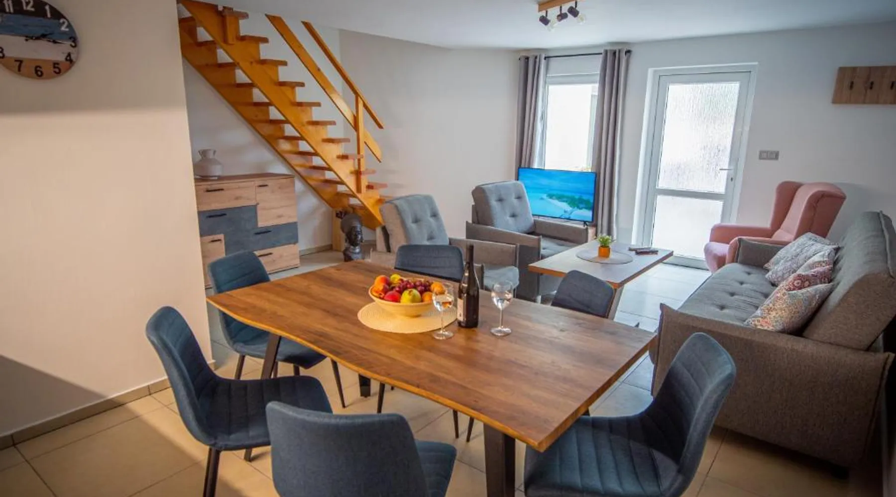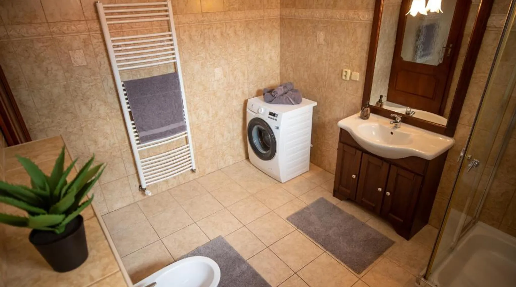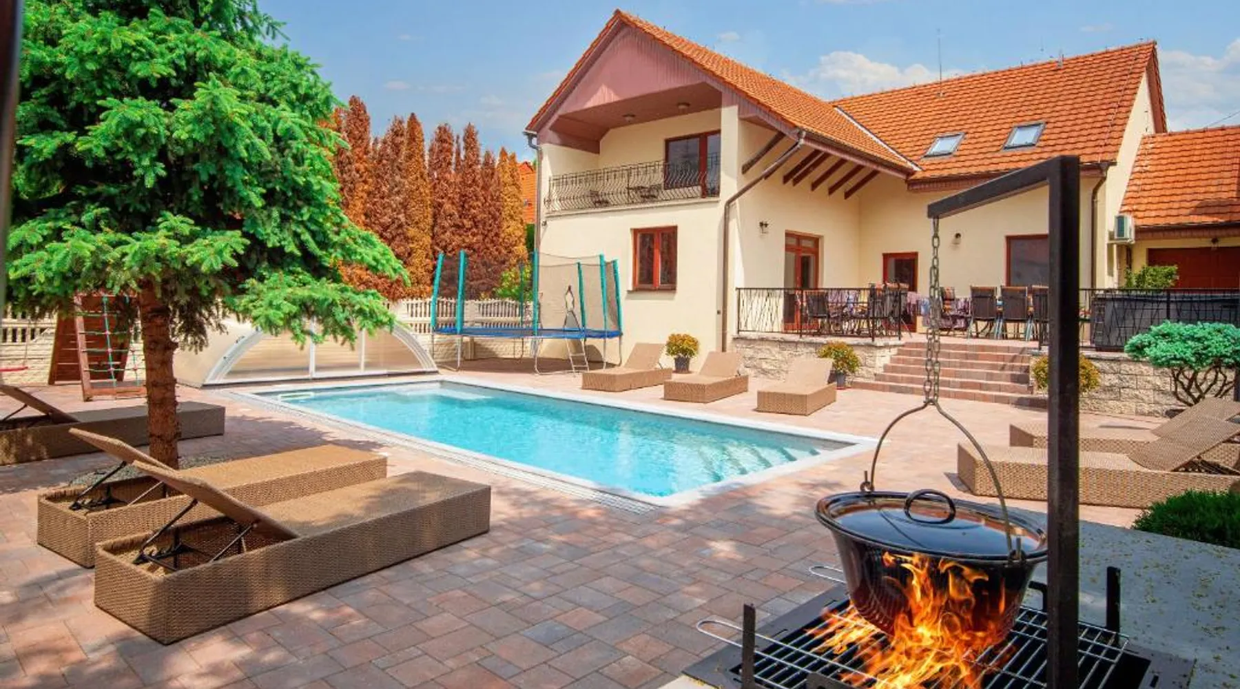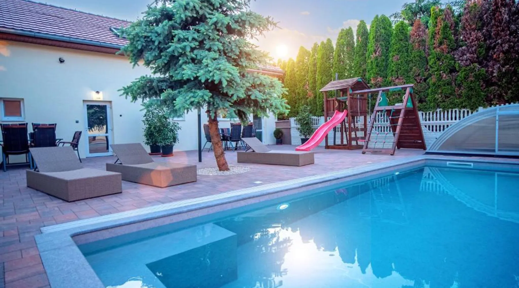 Comfortable Accommodations: Duna Apartments Štúrovo in Štúrovo offers a saltwater swimming pool, sun terrace, and a beautiful garden. Guests enjoy free WiFi throughout the property. Modern Amenities: Each apartment features air-conditioning, a terrace, kitchenette, private bathroom, kitchen, and TV. Additional amenities include a balcony, washing machine, and free private parking. Leisure Facilities: The property provides a children's playground, outdoor seating area, and picnic area. Private check-in and check-out services ensure a smooth arrival and departure. Nearby Attractions: Margaret Island Japanese Garden is 29 mi away, and Chain Bridge is 31 mi from the apartment. Hiking trails and boating opportunities are available in the surrounding area. The private pool is the standout feature of this apartment. Boasting 2 bedrooms and 1 bathroom, this spacious apartment has a living room and terrace where you can relax. The apartment's kitchen is available for cooking and storing food. This apartment features air conditioning and a flat-screen TV. The unit offers 5 beds.