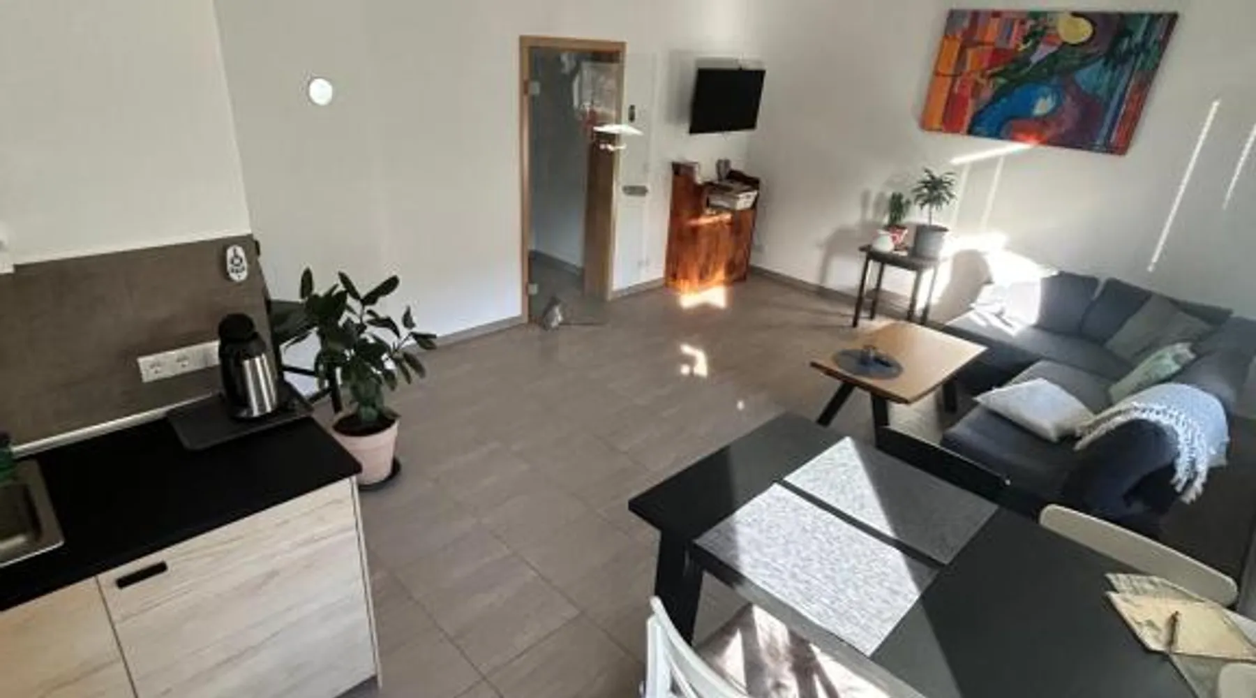 Modern Comforts: Chill-out in Heilbad Heiligenstadt offers a recently renovated apartment with free WiFi and free on-site private parking. The ground-floor unit features a kitchenette, kitchen, and a comfortable living room with a sofa bed. Convenient Amenities: Guests can enjoy a dining area, walk-in shower, and a seating area. The apartment includes a refrigerator, microwave, dishwasher, oven, stovetop, toaster, and a TV. Additional amenities include a hairdryer, coffee machine, electric kettle, and kitchenware. Prime Location: Located 40 mi from Kassel-Calden Airport and 24 mi from the University of Göttingen, the apartment is highly rated for its nearby shops and convenient location. The reception staff speak German. Boasting a private entrance, this apartment features 1 living room, 1 separate bedroom and 1 bathroom with a walk-in shower and a hairdryer. Meals can be prepared in the well-fitted kitchen, which has a stovetop, a refrigerator, a dishwasher and kitchenware. The apartment has tiled floors, a seating area with a flat-screen TV, a tea and coffee maker, a dining area, as well as a wardrobe. The unit has 2 beds.