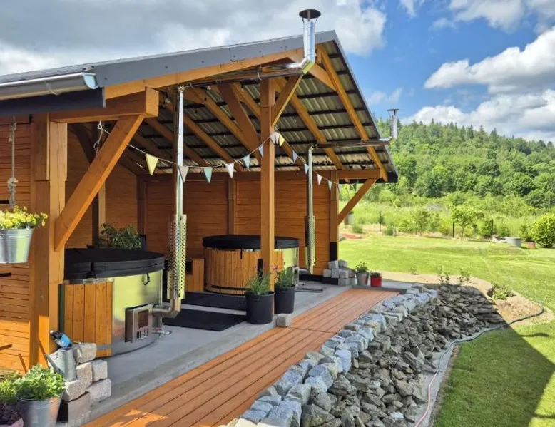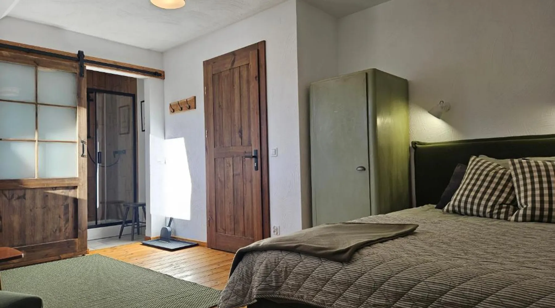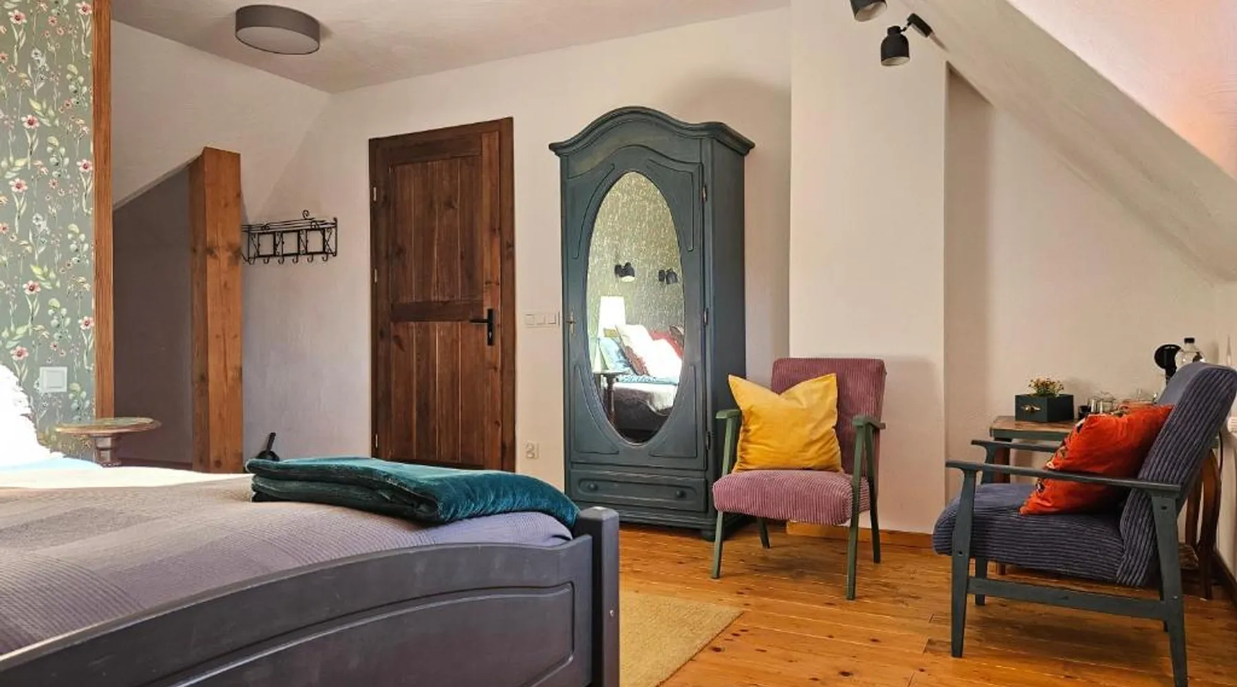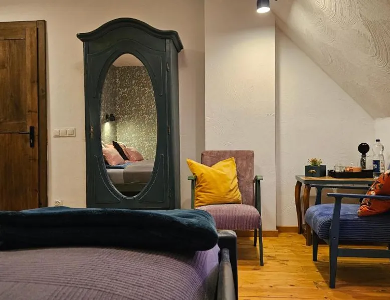 Accommodations Features: Miodówka in Stronie Śląskie offers a farm stay with a sun terrace, garden, and free WiFi. Private check-in and check-out services ensure a smooth arrival and departure. Amenities and Activities: Guests can enjoy an outdoor fireplace, hot tub, and badminton equipment hire. The property provides free on-site private parking, ski storage, and outdoor seating areas. Breakfast and Dining: A continental buffet breakfast includes local specialties, warm dishes, juice, fresh pastries, pancakes, cheese, and fruits. The dining area features parquet floors and a TV. Nearby Attractions: Polanica Zdroj Train Station is 24 mi away, Złoty Stok Gold Mine 18 mi, Chess Park 25 mi, and Szczytna 30 mi. Activities include skiing. Highly rated for its host, nature trip, and breakfast. Guests will have a special experience as this triple room features a hot tub, a spa bath and a fireplace. The triple room provides a tea and coffee maker, a seating area, a terrace with mountain views as well as a private bathroom featuring a shower. The unit offers 2 beds.