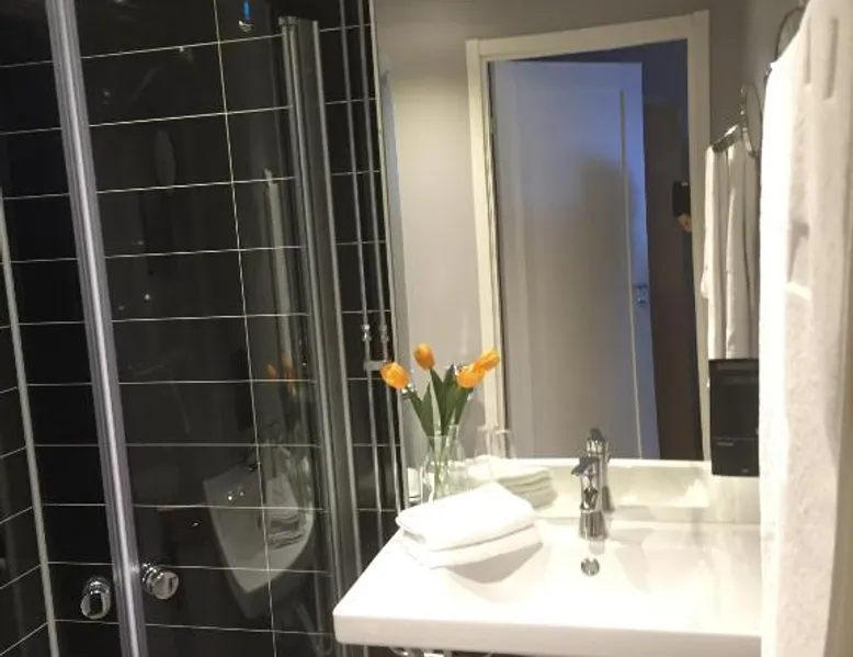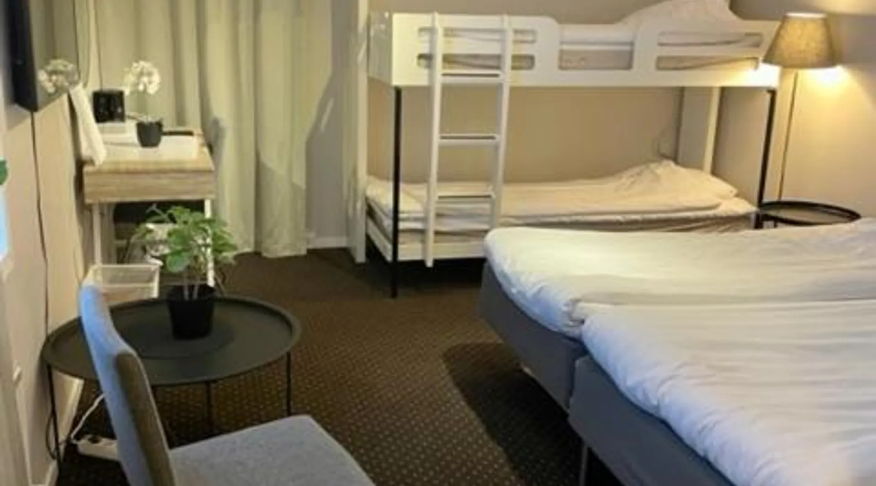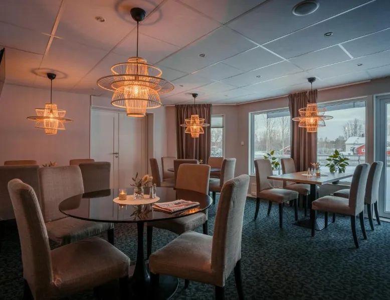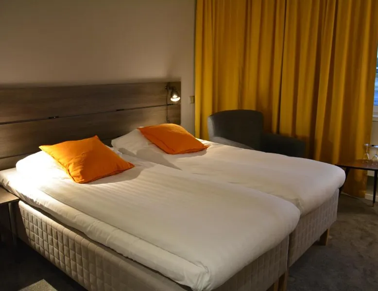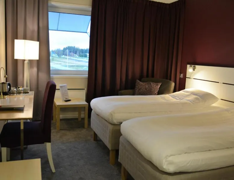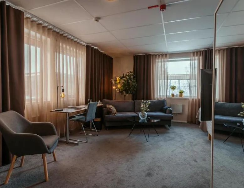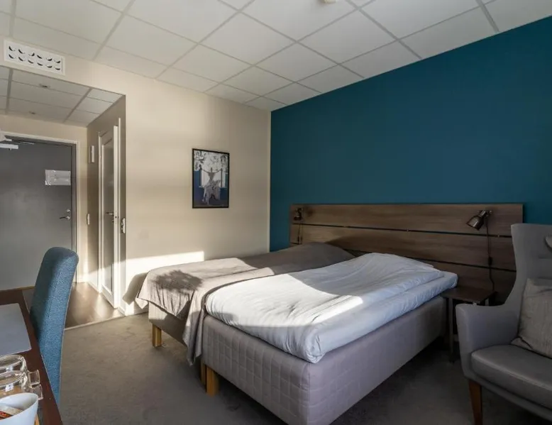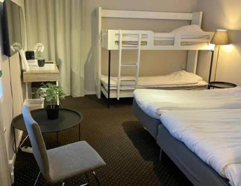 Comfortable Accommodations: Hotell Entré Norr in Umeå offers family rooms with air-conditioning, private bathrooms, and modern amenities. Each room includes a work desk, TV, and soundproofing for a pleasant stay. Exceptional Facilities: Guests can enjoy a sauna, sun terrace, and lush garden. The hotel features a fitness room, indoor and outdoor play areas, and a games room. Free WiFi is available throughout the property. Dining Experience: The family-friendly restaurant serves European cuisine with vegetarian, vegan, gluten-free, and dairy-free options. Breakfast is provided as a buffet, and lunch and dinner are available in a traditional ambiance. Convenient Location: Located 6.8 mi from Umeå Airport, the hotel is near attractions such as Umeå University (4.3 mi) and Norrlands Opera House (5 mi). Winter sports and fishing are available in the surrounding area. The spacious double room features a private bathroom, air conditioning, soundproof walls, as well as a seating area with a flat-screen TV. The double room offers a tea and coffee maker, a sofa, a carpeted floor, heating, as well as a TV. The unit offers 2 beds.
