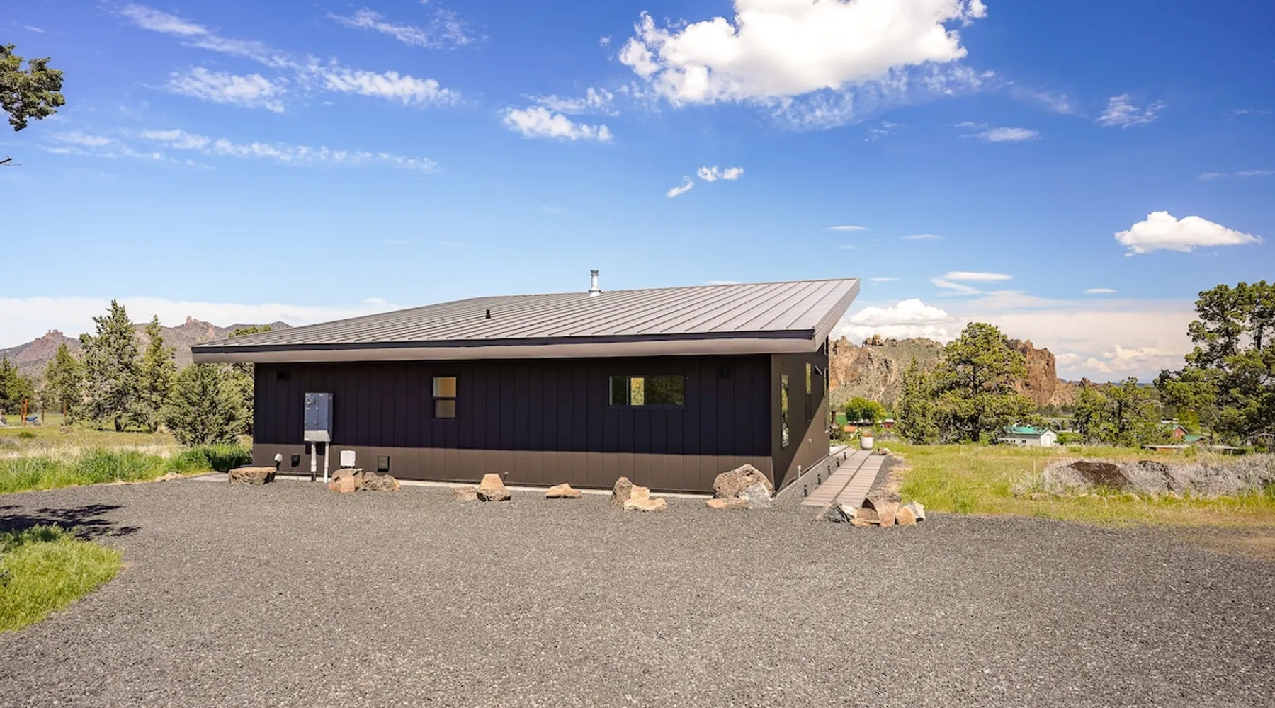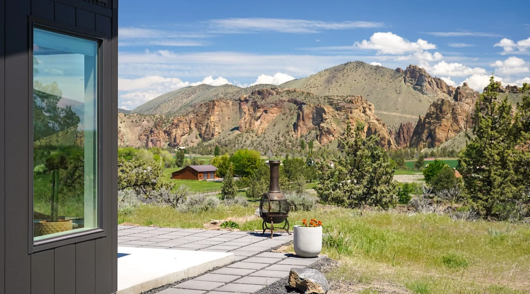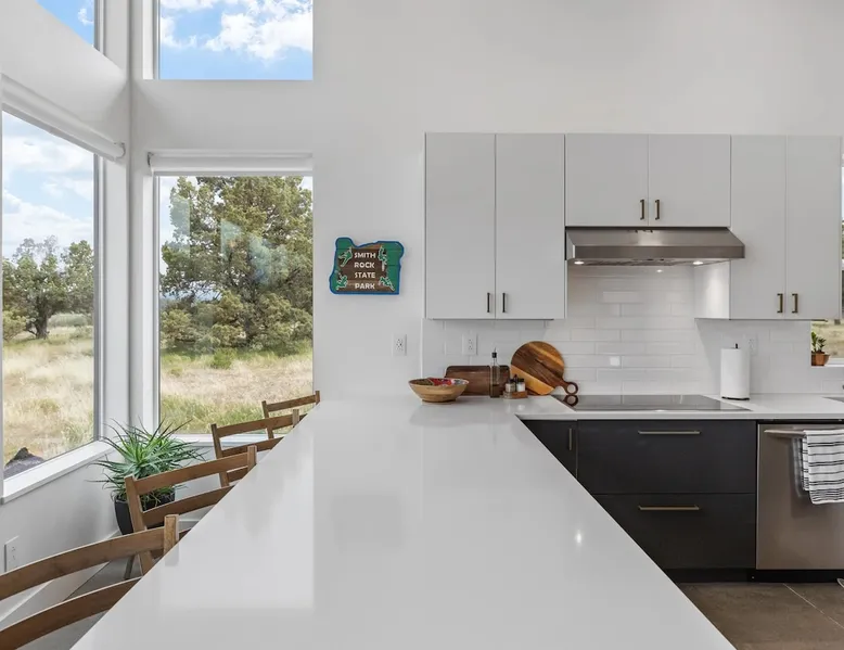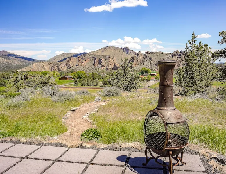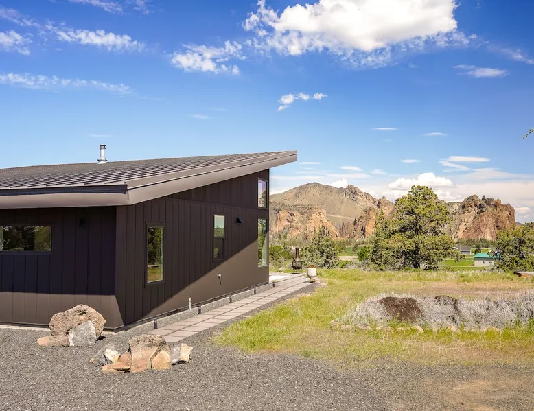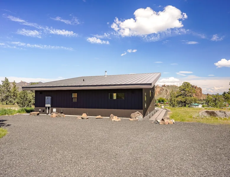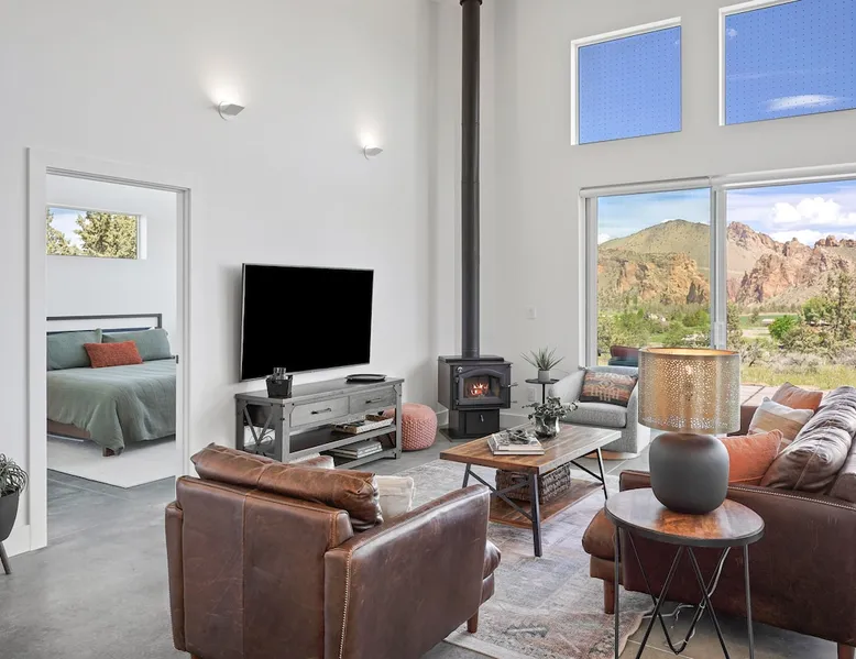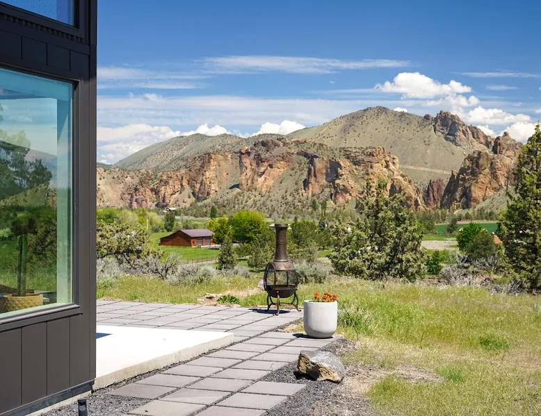 A wall of glass provides panoramic views of the iconic Smith Rock formation, creating a seamless connection between the indoor and outdoors. A sleek and sophisticated modern home perched on the rimrock and flooded with sunshine. King beds and a luxurious bathroom with steam shower. Includes Smith Rock Pass. *No parties or pets* (including support animals) please - this is a 'pet-free' home for guests with allergies. Trip insurance recommended if illness, weather or smoke may be an issue. The space You will be welcomed into the bright living room with a cozy fireplace that flows into the back patio with views that might take your breath away a little. The view extends into the primary bedroom. The property includes five acres of rural land that you are welcome to explore. Note that there is a detached shop about 140' from the house that is accessed by our business partner. Guest access The entire home is available to the guest and is not shared with anyone. The shop (100' up the driveway) is accessed occasionally (during business/working hours) by us or our business partners. Other things to note Please note the well-water is very hard. While the minerals are great for your bones, it does have a very subtle salty taste and is slightly whitish colored. It has been tested and is verified clean and healthy. Also, importantly, we require guests who use the steam-shower (sauna) to squeegee the glass after use, otherwise the mineral buildup is very difficult to remove. Note that dogs are not allowed, including Emotional Support Animals, which are not recognized as service animals in the state of Oregon. If you are bringing a service animal, we would appreciate if you would describe what duties or work it has been trained to perform, and if it is required because of a disability. Wildfire smoke is a significant risk in the mid-summer to late fall in the PNW, especially east of the Cascades. Please note that both Airbnb (and by extension, us as hosts) can not predict or control the weather or the smoke, and neither of these are considered grounds for exceptions to the refund policy. If you want a more flexible cancellation policy due to air quality/smoke, we recommend purchasing travel insurance through Airbnb, which is offered to you during the booking process. If your time in Bend is impacted by smoke, we are happy to help you make the best of it—there are often times of day or parts of the surrounding area that are far less smoky than others. We live here and understand the challenge.