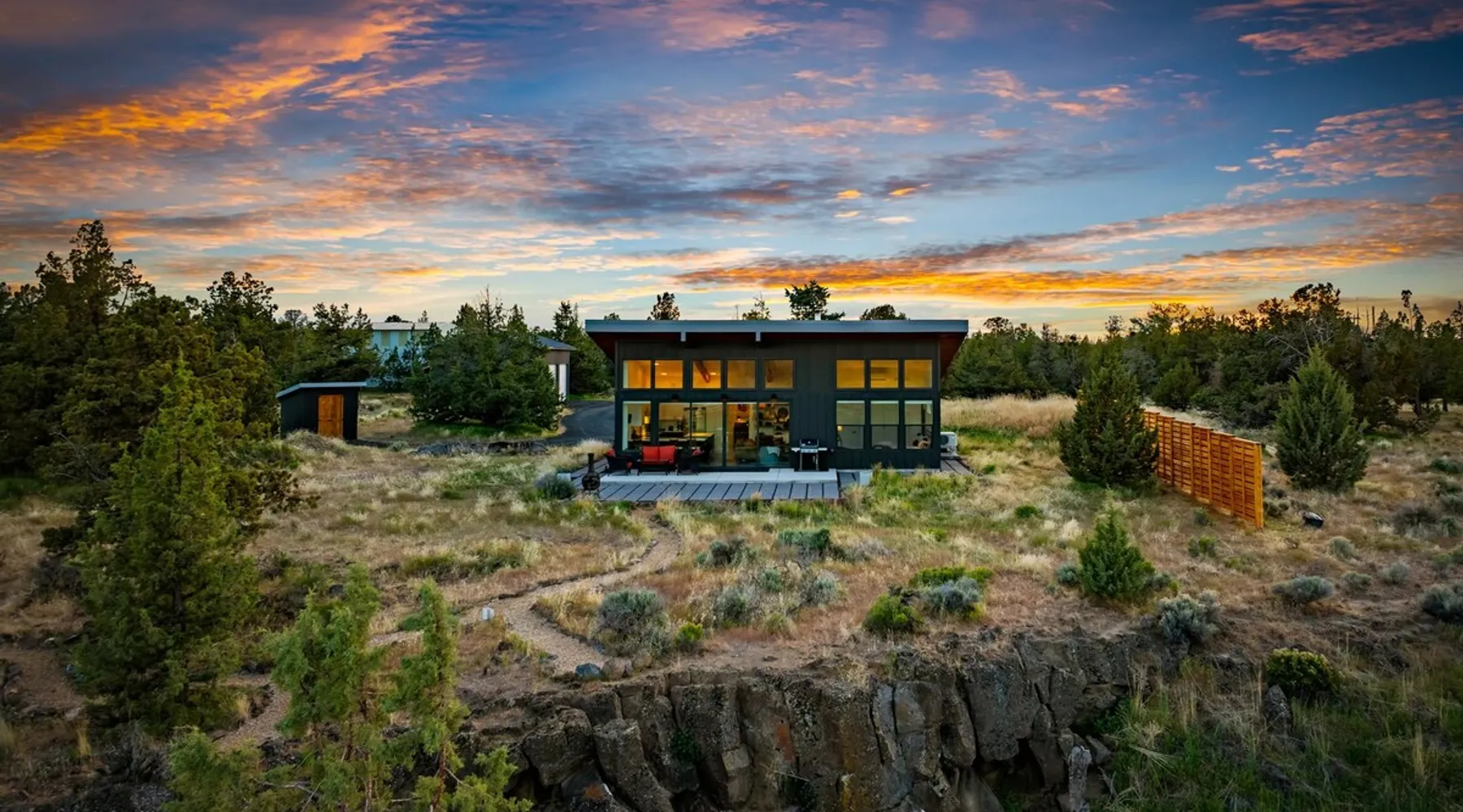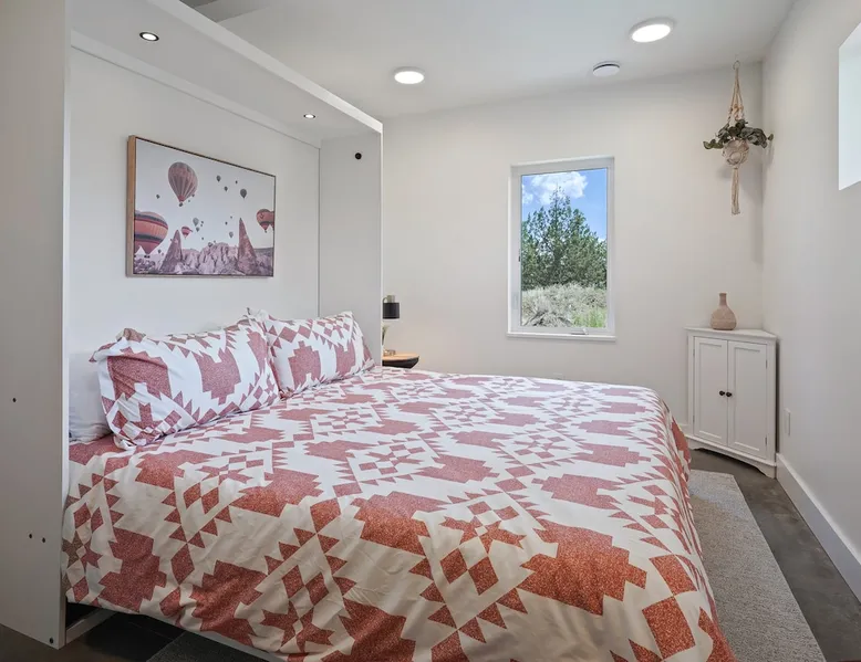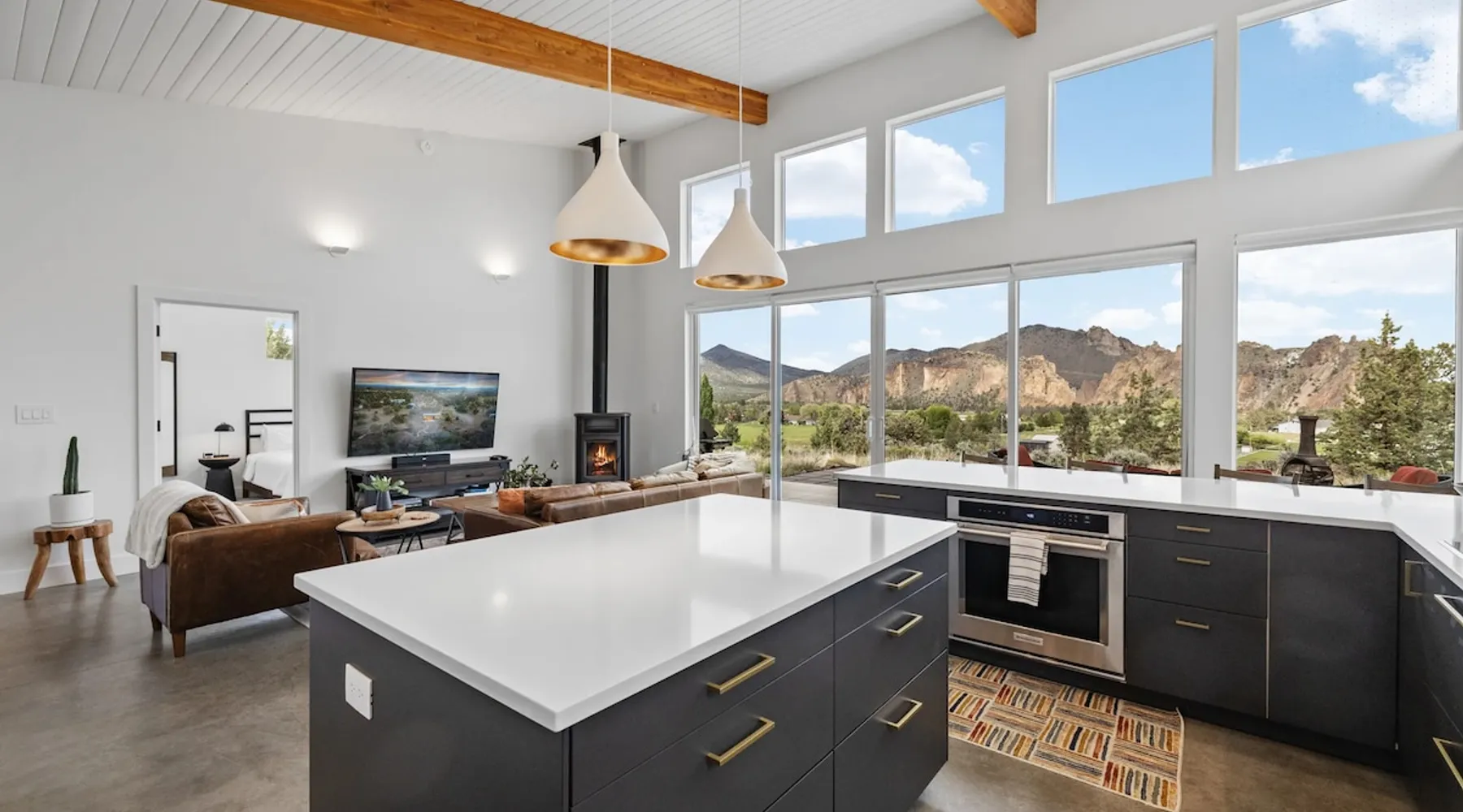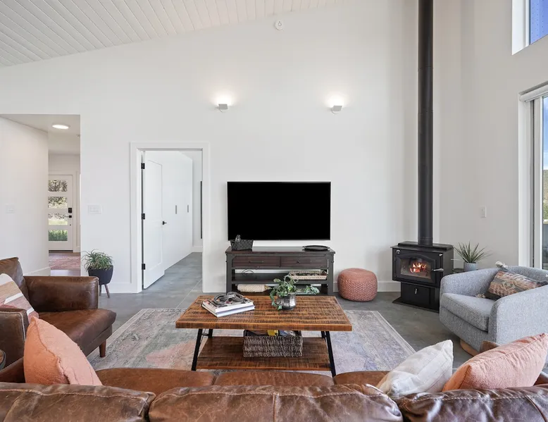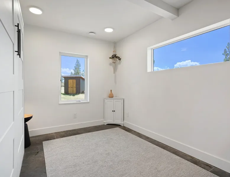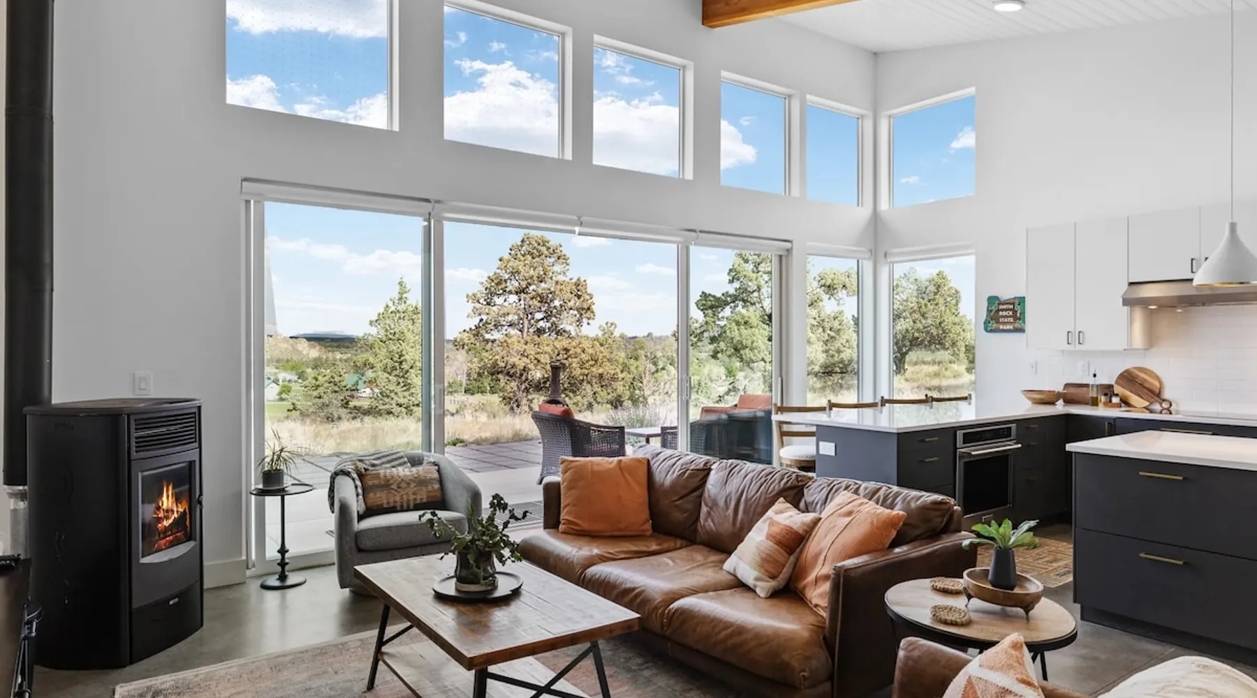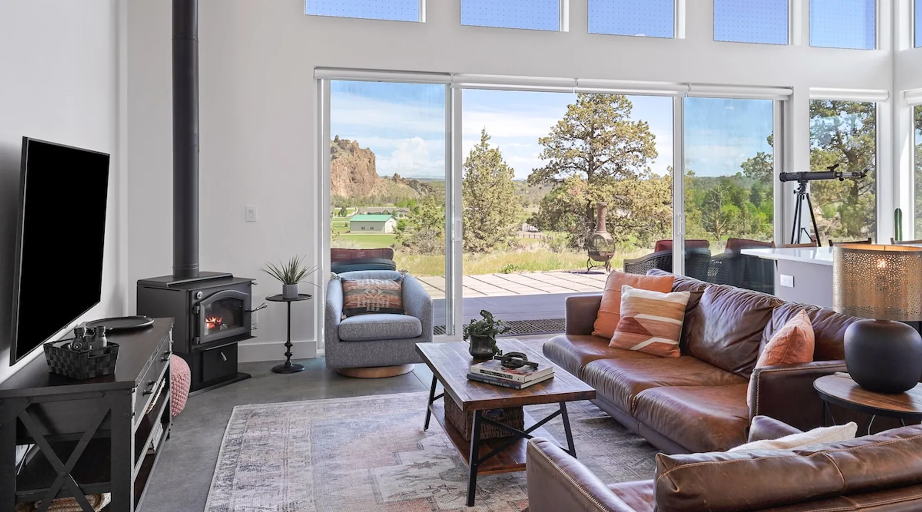 A wall of glass provides panoramic views of the iconic Smith Rock formation, creating a seamless connection between the indoor and outdoors. A sleek and sophisticated modern home perched on the rimrock and flooded with sunshine. King beds and a luxurious bathroom with steam shower. Includes Smith Rock Pass. *No parties or pets* (including support animals) please - this is a 'pet-free' home for guests with allergies. Trip insurance recommended if illness, weather or smoke may be an issue. The space You will be welcomed into the bright living room with a cozy fireplace that flows into the back patio with views that might take your breath away a little. The view extends into the primary bedroom. The property includes five acres of rural land that you are welcome to explore. Note that there is a detached shop about 140' from the house that is accessed by our business partner. Guest access The entire home is available to the guest and is not shared with anyone. The shop (100' up the driveway) is accessed occasionally (during business/working hours) by us or our business partners. Other things to note Please note the well-water is very hard. While the minerals are great for your bones, it does have a very subtle salty taste and is slightly whitish colored. It has been tested and is verified clean and healthy. Also, importantly, we require guests who use the steam-shower (sauna) to squeegee the glass after use, otherwise the mineral buildup is very difficult to remove. Note that dogs are not allowed, including Emotional Support Animals, which are not recognized as service animals in the state of Oregon. If you are bringing a service animal, we would appreciate if you would describe what duties or work it has been trained to perform, and if it is required because of a disability. Wildfire smoke is a significant risk in the mid-summer to late fall in the PNW, especially east of the Cascades. Please note that both Airbnb (and by extension, us as hosts) can not predict or control the weather or the smoke, and neither of these are considered grounds for exceptions to the refund policy. If you want a more flexible cancellation policy due to air quality/smoke, we recommend purchasing travel insurance through Airbnb, which is offered to you during the booking process. If your time in Bend is impacted by smoke, we are happy to help you make the best of it—there are often times of day or parts of the surrounding area that are far less smoky than others. We live here and understand the challenge.