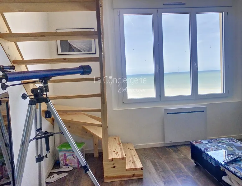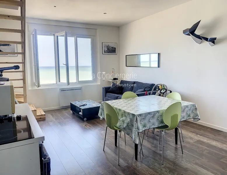 Are you looking for a seaside getaway? Look no further—you can’t get any closer to the water than this! Apartment with breathtaking sea views! The space Beautiful Duplex with Sea View – An Unforgettable Stay Awaits You! Let yourself be charmed by this stunning second-floor duplex offering breathtaking sea views. Ideal for a family vacation or a relaxing getaway, this accommodation combines comfort, charm, and an exceptional location. A Warm and Functional Living Space From the moment you arrive, you’ll be captivated by the bright living area, open to a fully equipped kitchen and an elegant lounge—perfect for: Sharing convivial meals facing the sea Relaxing after a day by the water Admiring the horizon all day long A second separate toilet is also available on this level for added convenience. Comfortable Bedrooms with a View Upstairs, you’ll find two welcoming bedrooms: A master bedroom with a double bed and panoramic sea views, perfect for waking up to the soothing sound of the waves A children’s bedroom with a bunk bed, ideal for the little ones For your convenience, linen rental (sheets + towels) is offered at: €20 for a single bed €30 for a double bed (Service not included in the rental price.) The upstairs bathroom includes a shower, sink, toilet, and washing machine to make your stay easier. Practical Information Blue zone parking (1.5 hours) during summer in front of the building Free parking in nearby streets Free public parking just 300 meters away Please Note The passage to the separate toilet is narrow The staircase to the upper floor is narrow but secure What You’ll Love Exceptional sea views from several rooms Ideal location, just steps from the beach Spacious and cozy duplex Perfect for families or couples with children Modern comfort in a seaside atmosphere Don’t miss this unique opportunity to stay in an idyllic setting where comfort meets the marine horizon. Book your next seaside getaway now! Access Keys are available from 4:00 PM at the AMARYM Immobilier agency located just below the apartment. After 6:00 PM, keys will be placed in a secure lockbox allowing you to arrive at your convenience. You will receive a message on the afternoon of your arrival explaining the key collection process. We look forward to welcoming you very soon!