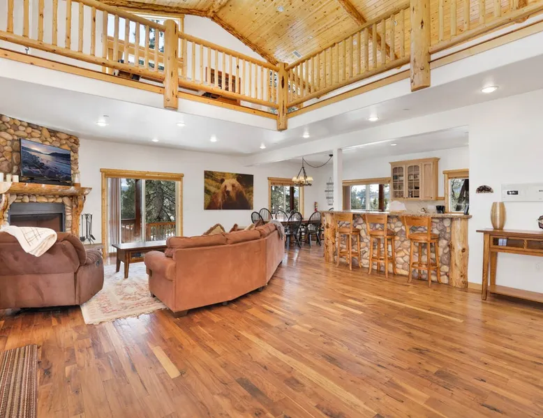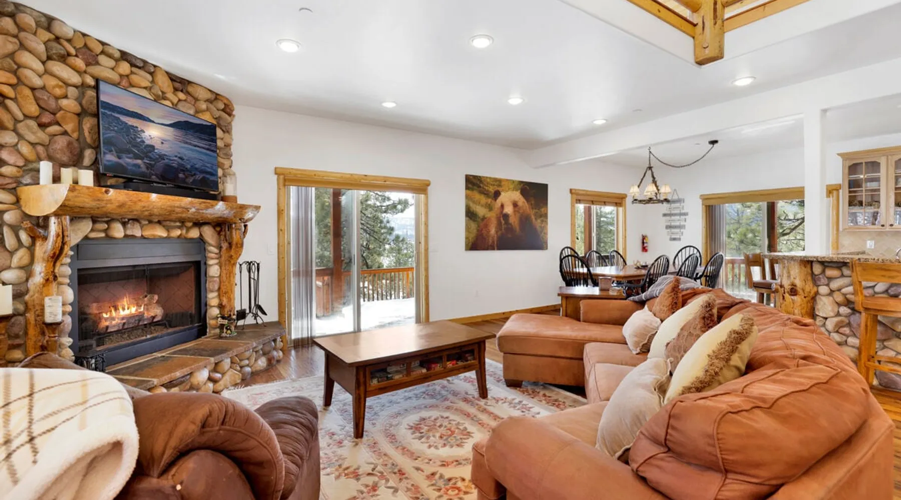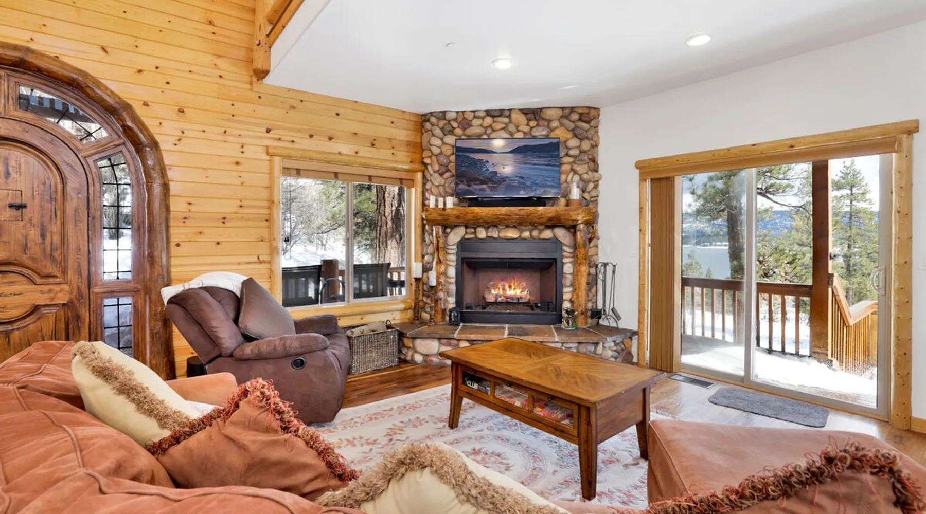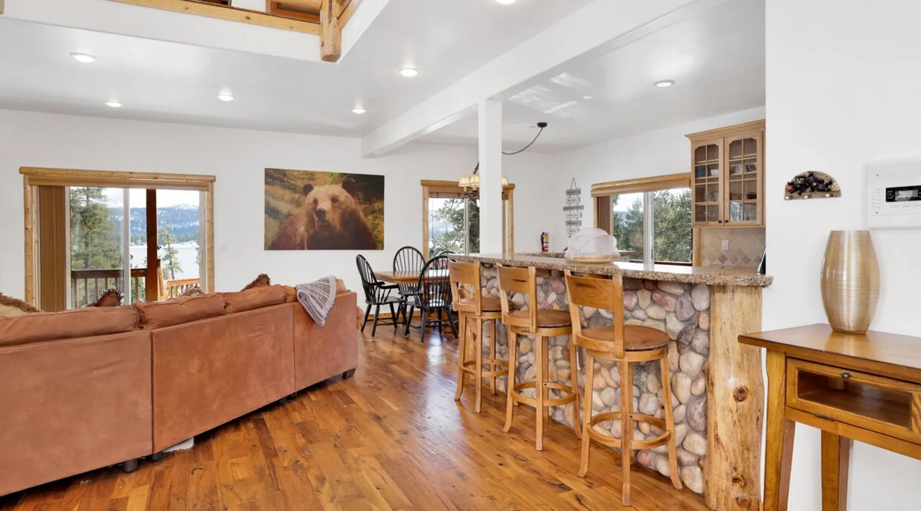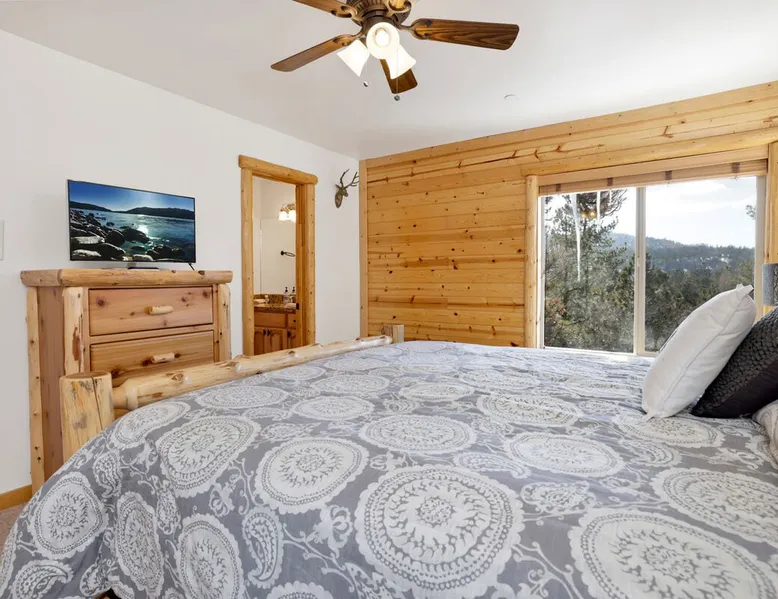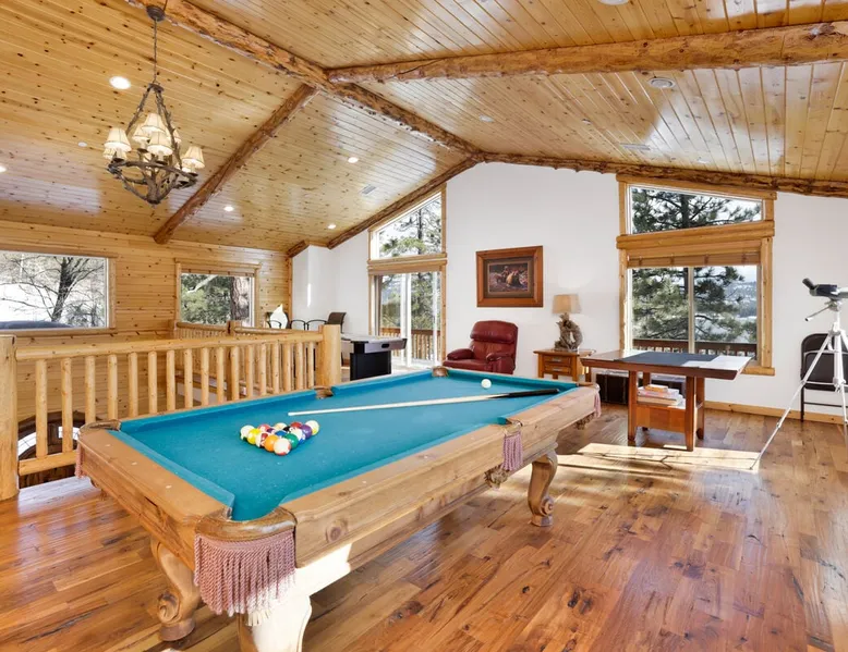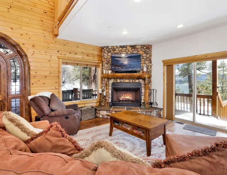 Perfect for a group of friends, family vacation, or corporate retreat our Cozy Lakeview Hideaway is an incredible Fawnskin custom log cabin boasting all that a group could need to enjoy a comfortable and relaxing vacation under soaring pine trees and shooting stars no matter the season you choose to visit Big Bear. You will love making memories together at our custom chalet home- you truly have it all right here at your fingertips- come experience this amazing chalet for yourselves today! The space Cozy Lakeview Hideaway in Fawnskin | Amazing Views Welcome to Flicker Lake View Log Cabin!! Perfect for a group of friends or family looking to experience the very best of Big Bear within our spectacular two story log cabin retreat which sits just above the lake in Fawnskin which is a super quiet and secluded neighborhood yet is still under a quick ten minute drive to local activities. Your group will love and appreciate the modern comforts and necessities from home along with spectacular lake views, log accents, modern amenities, and a fabulous location to enjoy your time together. Come experience this amazing home for your next vacation! Enter your chalet where you are greeted with the immediate feeling that you have your own private mountain lodge to yourselves for your visit with gorgeous hardwood floors, massive cathedral ceilings and walls draped in wood accents, and big open windows to take in the great views of the lake or watch the snow falling outside. Snuggle up on the oversized plush couches together as you warm your toes in front of the toasty wood burning fireplace and enjoy a movie together on the flat screen Streaming TV with complimentary hi speed WIFI internet provided for your enjoyment. (Guests must have their own accounts to enjoy Streaming Services) The open floor plan flows seamlessly to the equipped dining room and gourmet kitchen which is perfect for entertaining a dinner party or hosting your next family holiday feast boasting all that you need to whip up your home cooked meals including cookware, utensils, appliances and even a dishwasher to ensure your cleanup is an absolute breeze here. Rough edge granite counter tops [air with upscale remodeled furnishings to ensure your group has an amazing time here in the mountains, even a wet bar for your adult beverages is on hand. Four spacious sleeping quarters and 3.5 bathrooms are easily accessible for your group on both levels of your fully furnished and cozy chalet and includes a jetted spa tub in the primary suite where you can soak your aching muscles from the day on the slopes- each room is made up for your visit with Streaming TVs, big open windows, warm linens, blankets, pillows, and fresh shower towels for your group when you arrive for your vacation stay. You will love having a separate laundry room right on site with a washer and dryer for those wet snow clothes or extended visits to the mountains and this is also a great space to store your ski gear or lake toys. For added entertainment head up to the game room loft which is packed with endless hours of fun for you to enjoy your time together including air-hockey and a pool table, darts, and even board games to ensure you'll never want to leave your chalet. Venture outside to experience the great outdoors within a full alpine atmosphere as your log cabin chalet sits atop a lakeside hill with endless views, ample flat driveway parking, and a wonderful year round location no matter the season you choose to visit. Flicker Lake View Log Cabin lives up to it's name and is a spectacular home away from home for any group no matter the season- come experience this wonderful home today! Sleeping Arrangements: Bedroom 1: King Bed, Gas Fireplace, Streaming TV, Deck Access, Private Bath w/ Jetted Spa Tub- Downstairs Entry Level Bedroom 2: Queen Bed, Streaming TV- Upstairs 2nd Level Bedroom 3: King Bed, Streaming TV- Upstairs 2nd Level Bedroom 4: Twin/Full Bunk + Full Bed- Upstairs 2nd Level Bathroom Arrangements: Hallway Half Bath- Downstairs Entry Level Private Full Bath w/ Jetted Spa Tub- Bedroom 1- Downstairs Entry Level Jack/Jill Full Bath- Bedroom 2 & 3- Upstairs 2nd Level Hallway Full Bath- Upstairs 2nd Level -Sleeps 10 -2 Cars Driveway, 2 Cars Garage Parking -2 Pets Welcome w/ Additional Fee -3,528 Total Square Feet Registration Details CESTRP-2023-00509