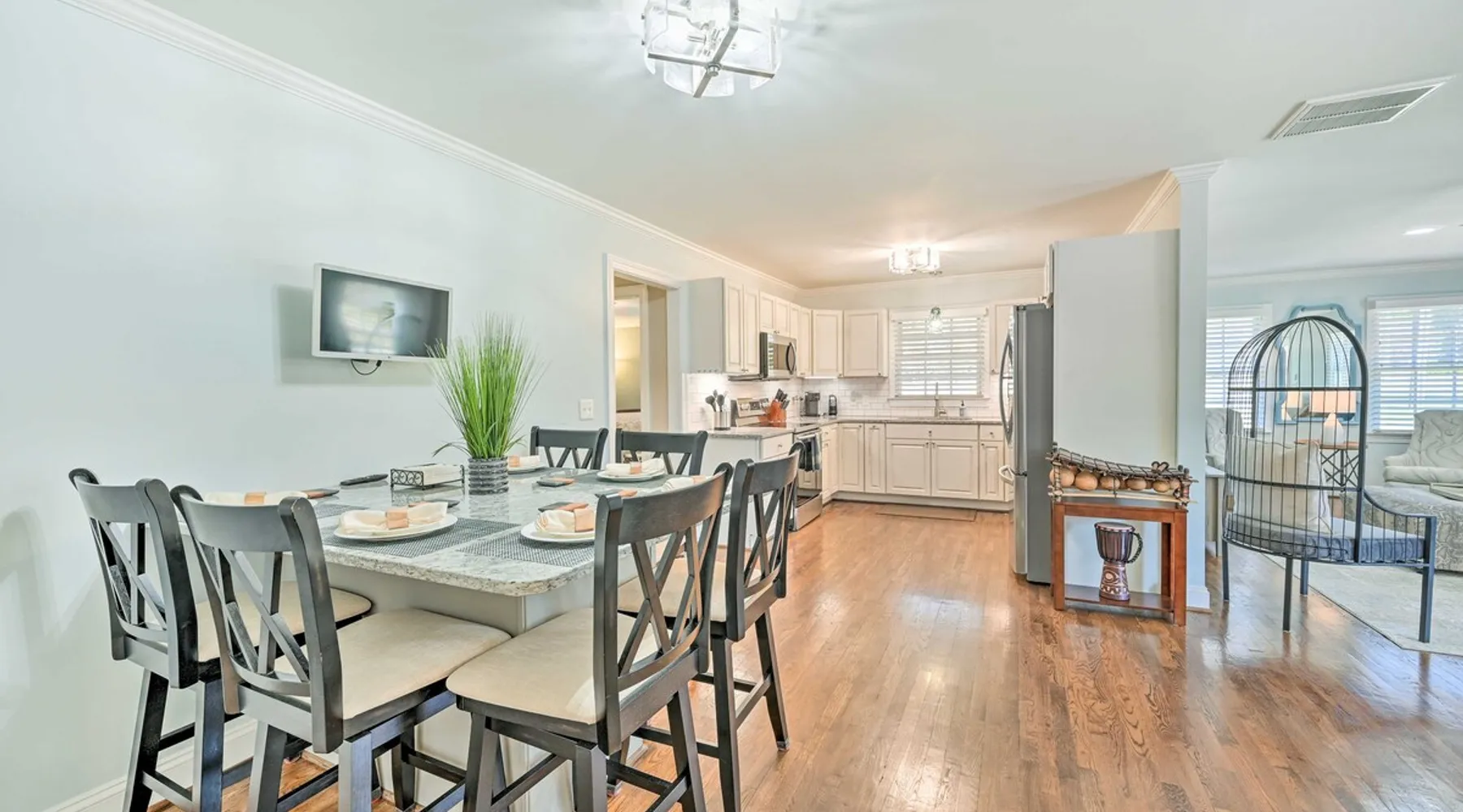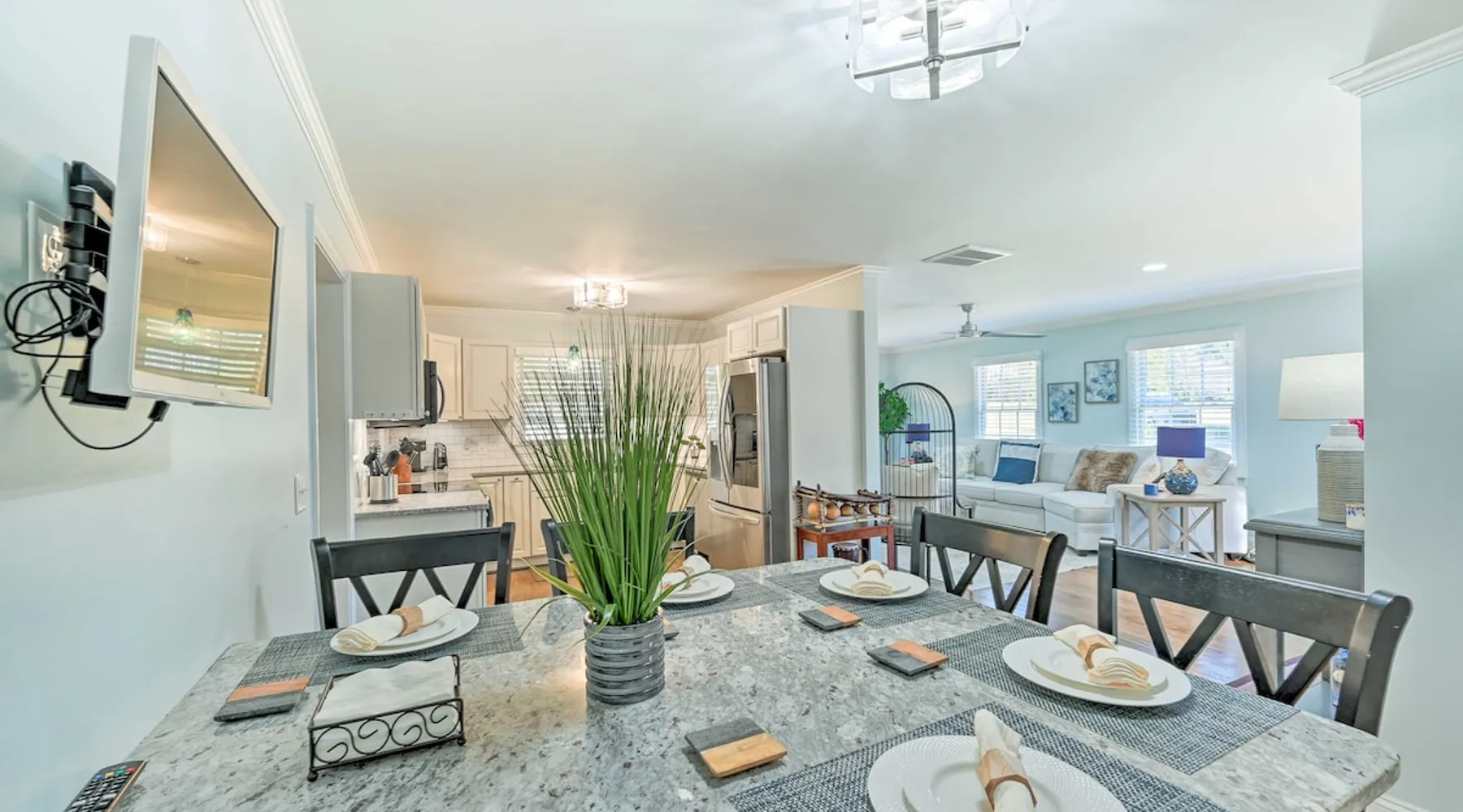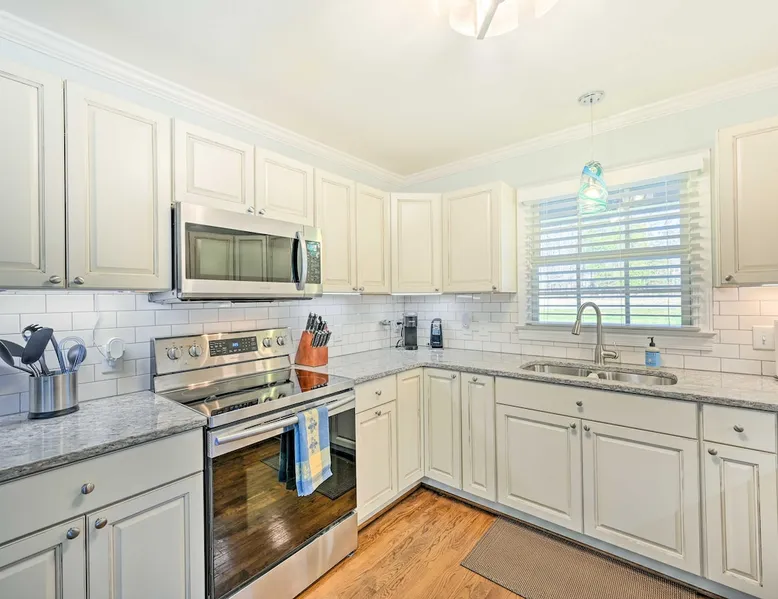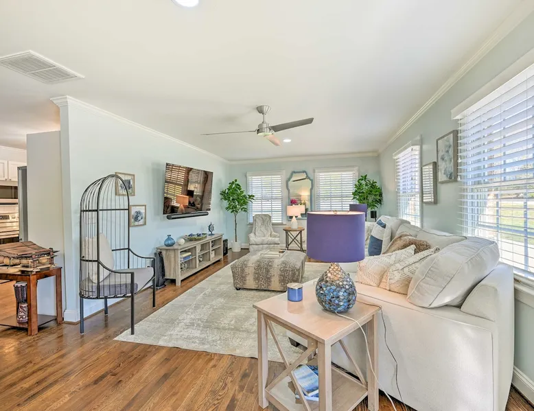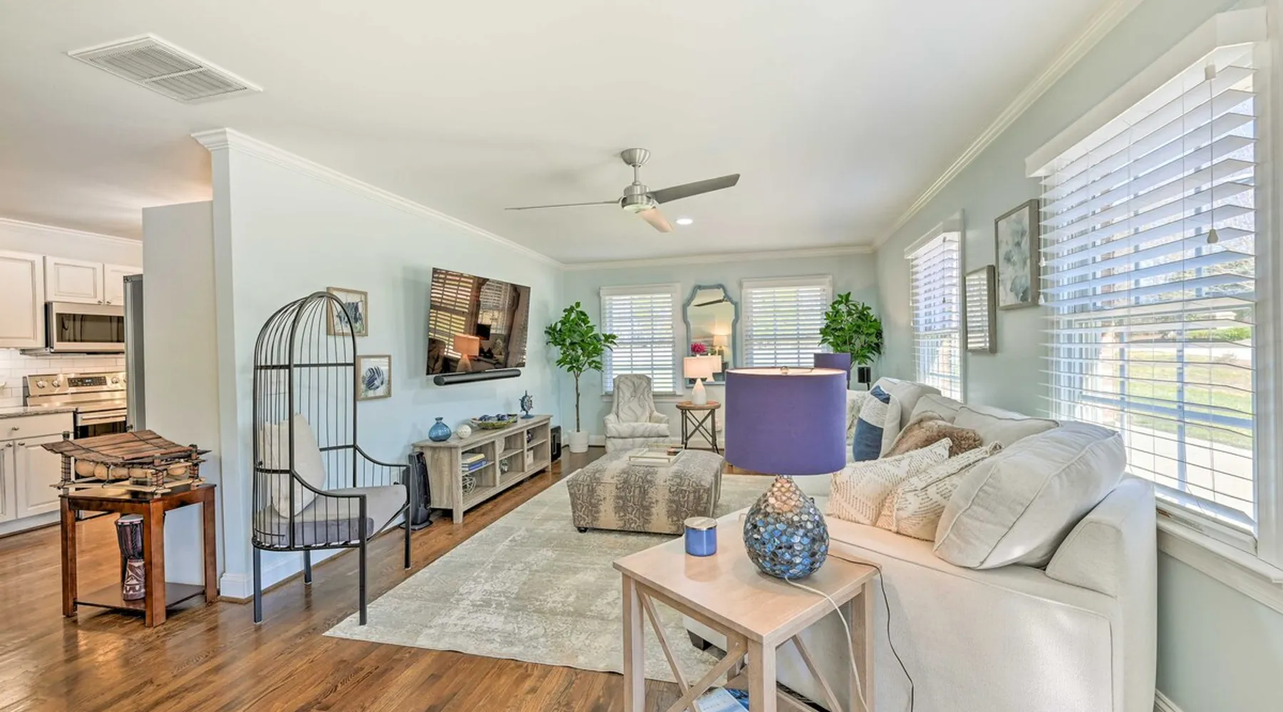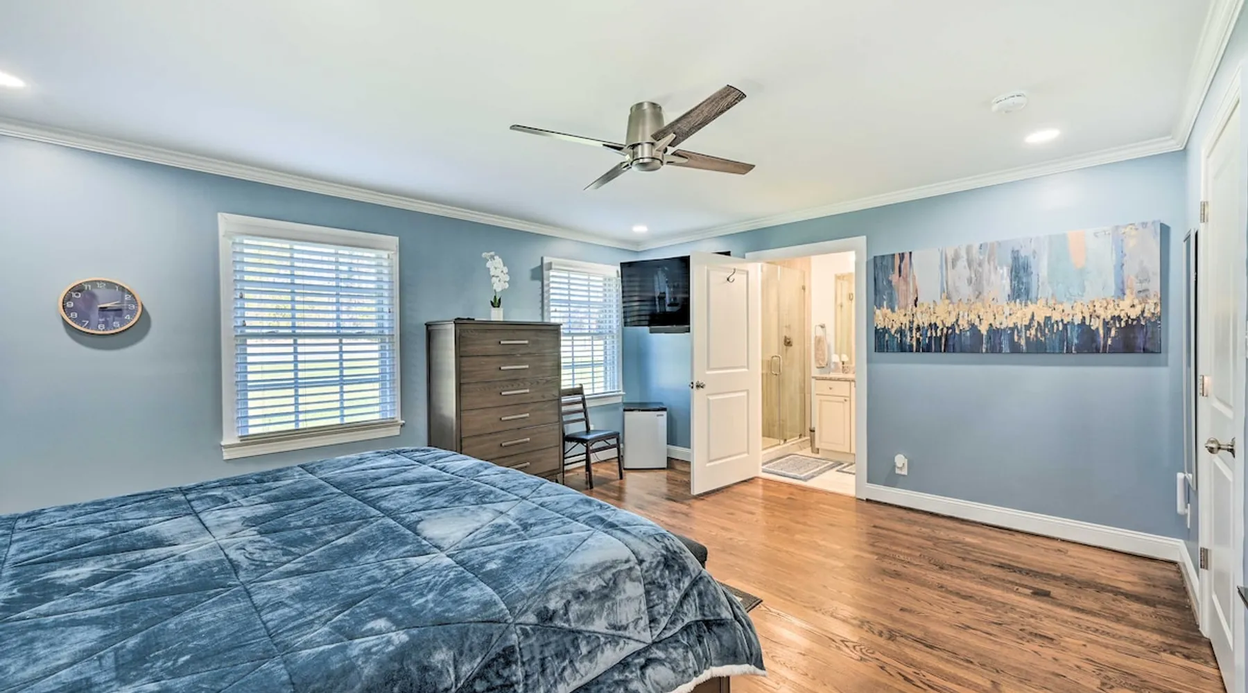 Get the best of the city at your fingertips while still enjoying private suburban living at this Greensboro, NC, vacation rental. This spacious 2-bedroom, 2-bathroom home is just 7 miles from Downtown Greensboro while also offering proximity to parks and lakes. Watch white-tailed deer run through the backyard while you have your morning coffee, walk to the trails at Lake Jeanette for a hike with your furry friend, then hit the city for a show at the Steven Tanger Center for the Performing Arts. The space 24-492 | Pet Friendly w/ Fee | Sonos Home Theater System | Bar Cart | Gas Grill | 1,850 Sq Ft Bedroom 1: King Bed | Bedroom 2: Queen Bed INDOOR LIVING: Smart TVs, dining table, en-suite bathroom OUTDOOR LIVING: Private yard, covered porch KITCHEN: Cooking basics, spices, dishware/flatware, dishwasher, smart fridge, stove, microwave, coffee maker, ice maker, water filter GENERAL: Free WiFi, keyless entry, central air conditioning, ceiling fans, complimentary toiletries, linens/towels, washer/dryer, iron/board, hangers, hair dryer, trash bags/paper towels FAQ: Pet fee (paid pre-trip), 2 external security cameras (facing out) SUITABILITY: Stairs required to access, single-story home PARKING: Driveway (8 vehicles) Guest access Guests will have access to the entire property via keyless entry Other things to note - No smoking - Pet friendly w/ $50 fee (+ fees & taxes) - No events, parties, or large gatherings - Additional fees and taxes may apply - Photo ID may be required upon check-in - NOTE: The property requires stairs to access - NOTE: Your safety matters. This property features 2 exterior security cameras. Camera 1 is a Ring doorbell device facing out from the front entry and camera 2 is over the front of the home facing out toward the driveway. They do not look into any interior spaces. The cameras record video and sound when activated by motion