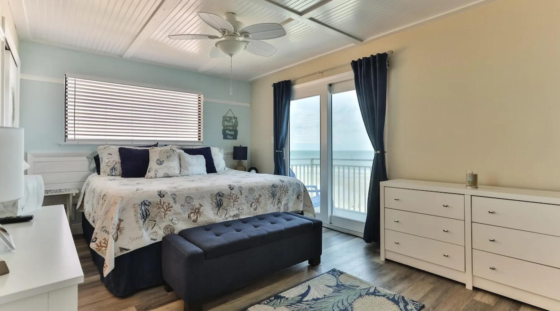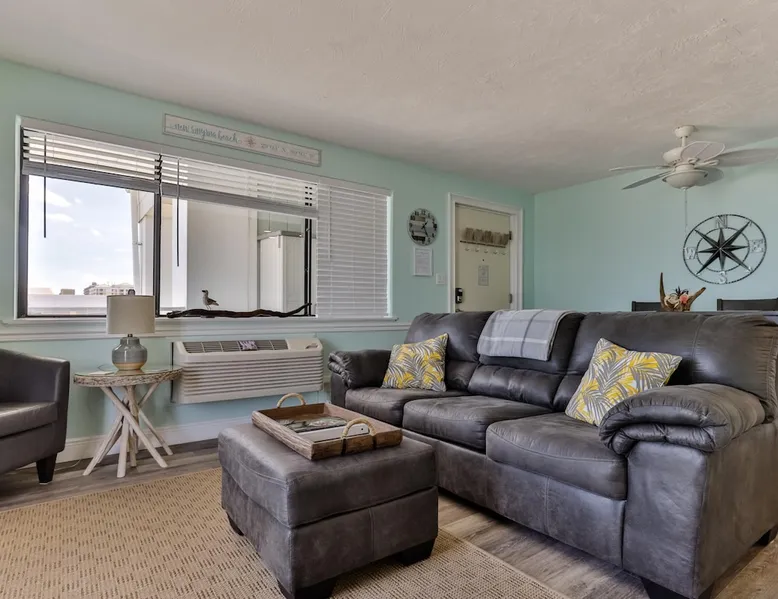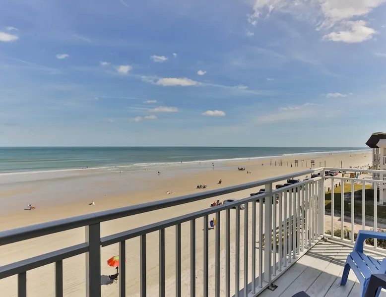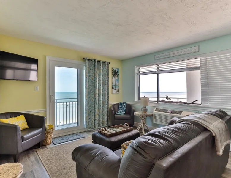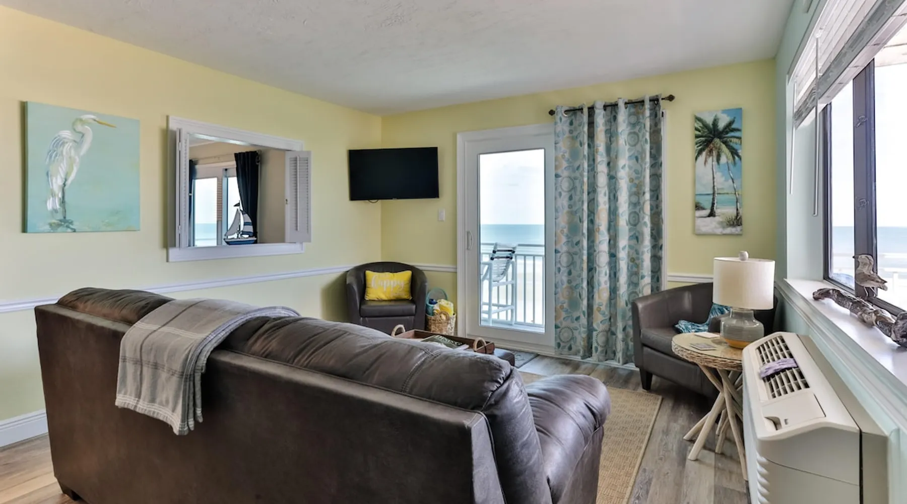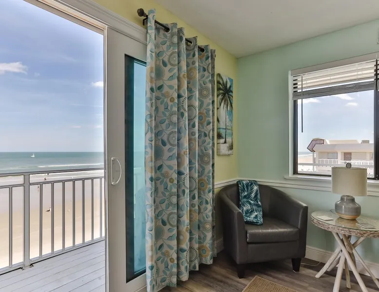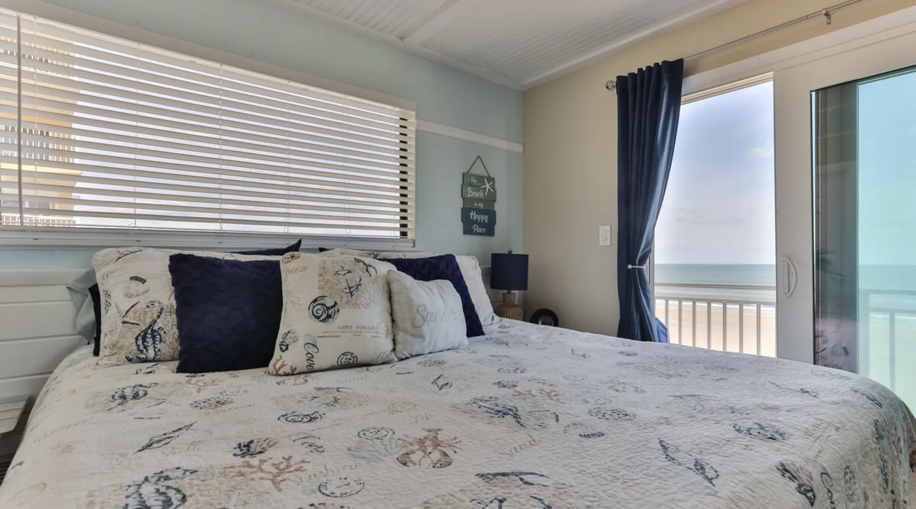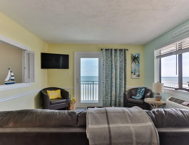 Coastal Waters 309 The space This oceanfront condo in Coastal Waters captures the quintessential New Smyrna Beach lifestyle in this coastal styled unit with luxurious finishes matched with the finest materials. A 1/1 waterfront condo that offers indoor/outdoor living spaces that connect with spectacular views. Enter to a coastal inspired living room with hurricane proof sliders that open to cool ocean breezes on the wrap around balcony. This is the place you’ll spend your time gazing out over the blue Atlantic Ocean, you’ll be treated to surfers and dolphins playing in the waves during the day and spectacular sunrises in the mornings. unique to this condo is the interior window between the bedroom and living room that contribute to the grandeur and open space feeling while enhancing this unit's already amazing ocean views. Warm colors of this unit compliment the azure Atlantic Ocean backdrop. As you enter this home find yourself in a light beach living room area with comfortable seating (including a full size pull out sofa bed for extra guests) from which to enjoy the large wall-mounted smart TV with cable and views of the water. Adjacent to the living room area is a colorfully accented dining area with seating for 4 making it easy for everyone to eat together. The tidy kitchen comes well-equipped for at-home convenience featuring a full size stove and oven, drip and keurig coffee maker, refrigerator, microwave and more. The primary bedroom has a luxurious King bed, TV, and access to the balcony with seating, the ensuite bathroom has a full size tub/shower combo, All beds are furnished with premiere linens for your comfort. This one-of-a-kind vacation rental is perfect for a romantic getaway or couple’s retreat. We invite you to experience the unparalleled peaceful tranquility of Coastal Waters. Head downstairs to the pool deck where you can take a dip in the heated pool and unwind while listening to the soothing sounds of the ocean. Coastal Waters is an oceanfront complex on the driving section of New Smyrna Beach. When you're not basking on the white sands of NSB, you'll find the complex provides great on-site amenities such as a heated swimming pool, 2 gas BBQ's and direct ocean access. Within walking distance to many great restaurants with just a short drive from Flagler Ave. Located near 27th avenue park, walking distance to some of NSB’s popular hometown restaurants and just minutes away from Flagler Avenue & Canal Street! There is parking in the front and an overflow parking across the street which can accommodate your trailer or boat, parking is first come first serve with appropriate parking pass. New Smyrna Beach is known for its small town character and family atmosphere. The warm climate, wide, white sand beaches, and variety of outdoor activities make this the perfect Florida beach vacation spot. PLEASE NOTE: : The condo is located on the 3rd floor and there is no elevator. We provide a "starter supply" of toilet paper, paper towels, hand soap, and trash bags. The starter supplies should suffice until a trip to the store is required. We do recommend you bring shampoo/conditioner, soap, coffee, and anything else you may need for your perfect vacation!