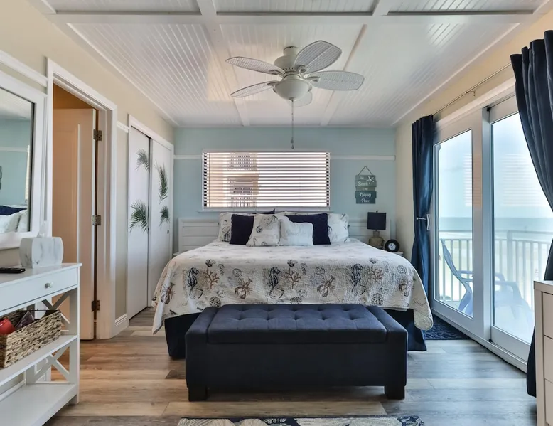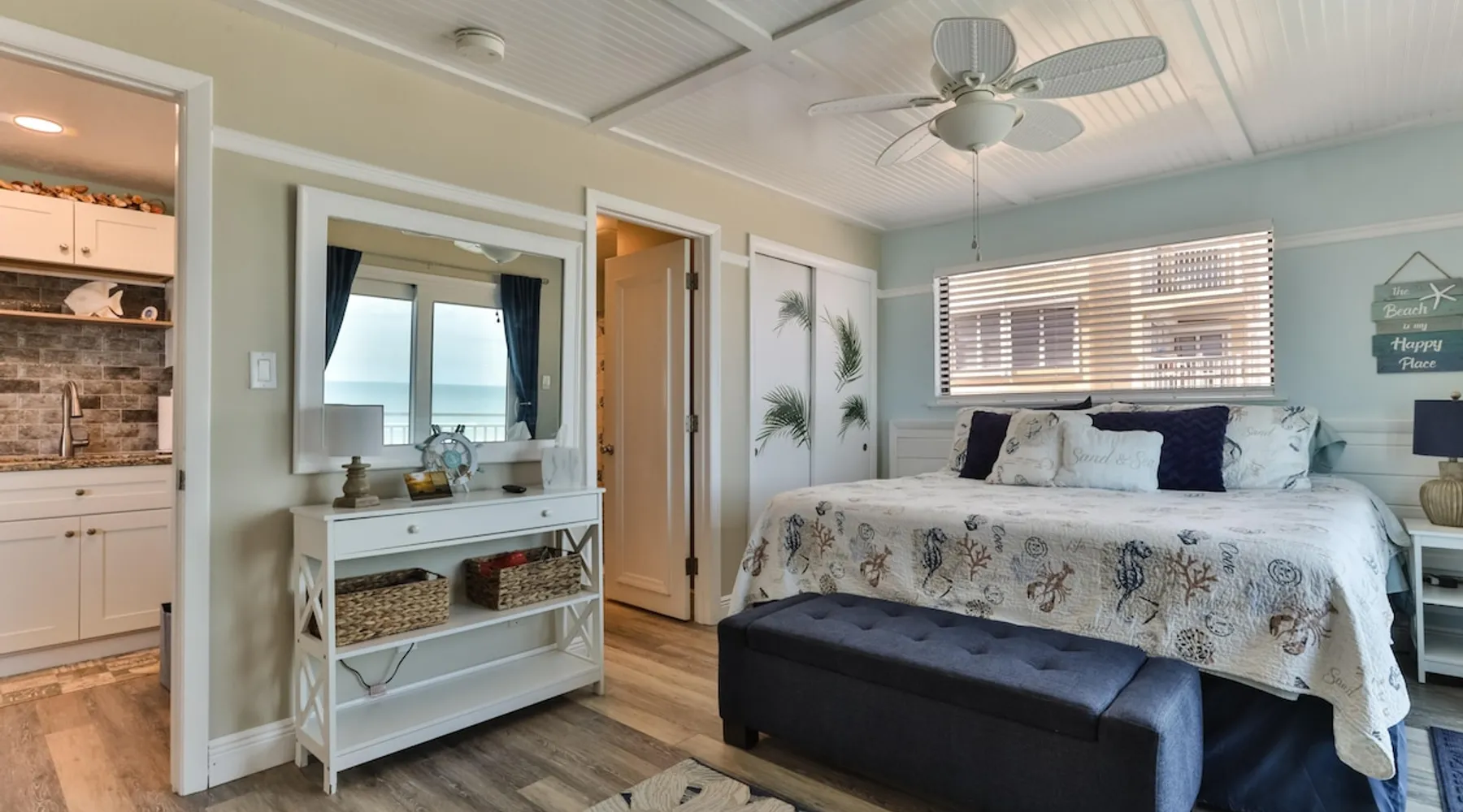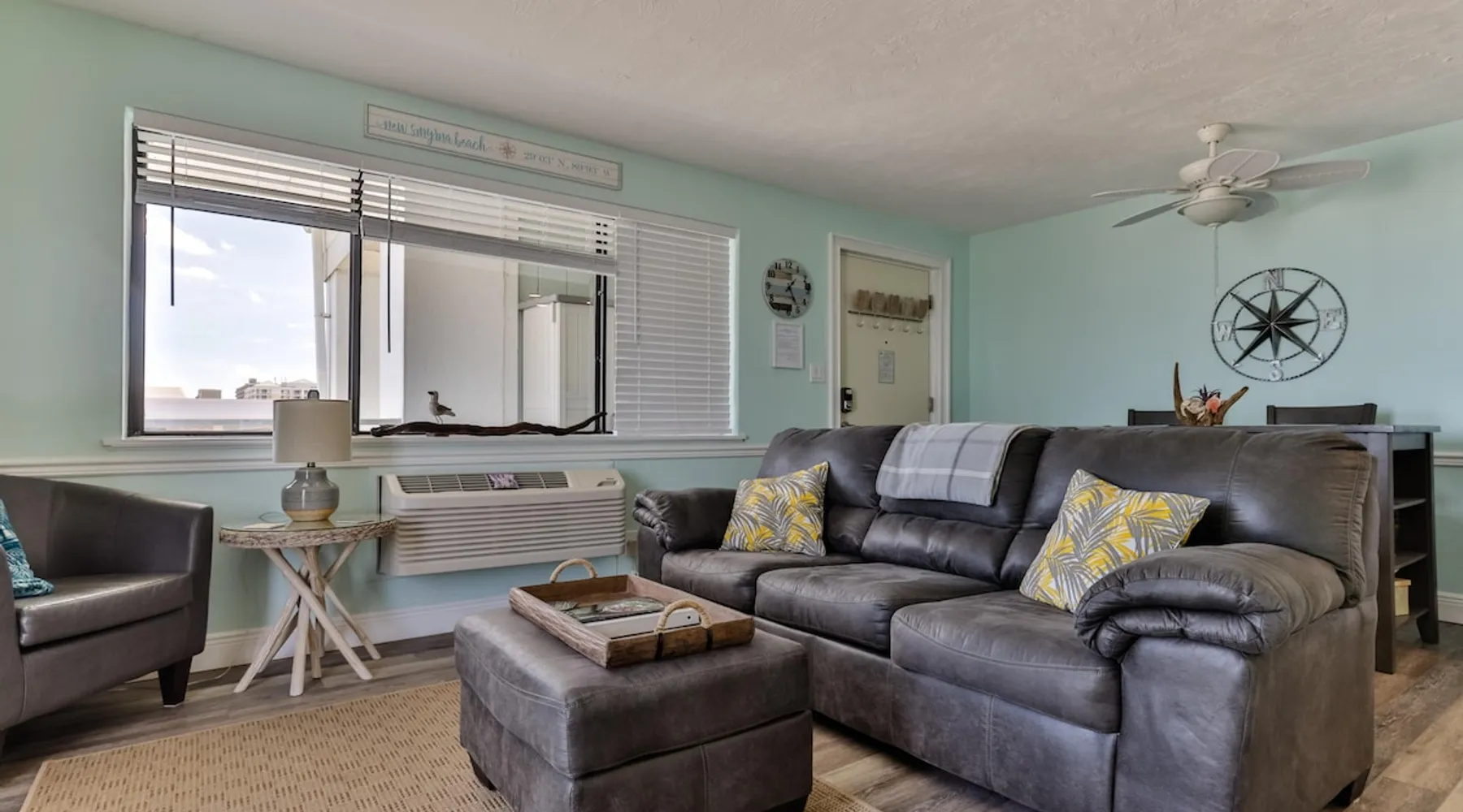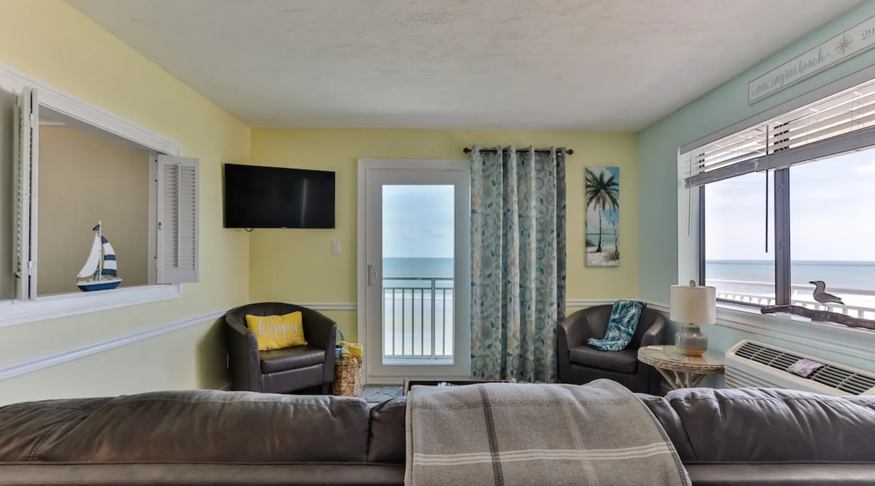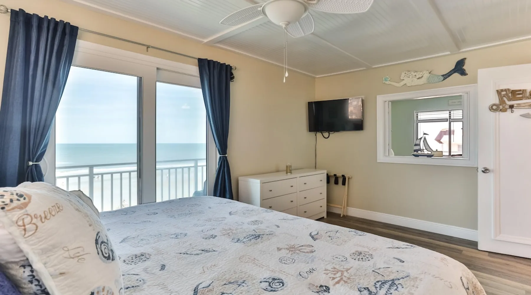 Coastal Waters 309 The space This oceanfront condo in Coastal Waters captures the quintessential New Smyrna Beach lifestyle in this coastal styled unit with luxurious finishes matched with the finest materials. A 1/1 waterfront condo that offers indoor/outdoor living spaces that connect with spectacular views. Enter to a coastal inspired living room with hurricane proof sliders that open to cool ocean breezes on the wrap around balcony. This is the place you’ll spend your time gazing out over the blue Atlantic Ocean, you’ll be treated to surfers and dolphins playing in the waves during the day and spectacular sunrises in the mornings. unique to this condo is the interior window between the bedroom and living room that contribute to the grandeur and open space feeling while enhancing this unit's already amazing ocean views. Warm colors of this unit compliment the azure Atlantic Ocean backdrop. As you enter this home find yourself in a light beach living room area with comfortable seating (including a full size pull out sofa bed for extra guests) from which to enjoy the large wall-mounted smart TV with cable and views of the water. Adjacent to the living room area is a colorfully accented dining area with seating for 4 making it easy for everyone to eat together. The tidy kitchen comes well-equipped for at-home convenience featuring a full size stove and oven, drip and keurig coffee maker, refrigerator, microwave and more. The primary bedroom has a luxurious King bed, TV, and access to the balcony with seating, the ensuite bathroom has a full size tub/shower combo, All beds are furnished with premiere linens for your comfort. This one-of-a-kind vacation rental is perfect for a romantic getaway or couple’s retreat. We invite you to experience the unparalleled peaceful tranquility of Coastal Waters. Head downstairs to the pool deck where you can take a dip in the heated pool and unwind while listening to the soothing sounds of the ocean. Coastal Waters is an oceanfront complex on the driving section of New Smyrna Beach. When you're not basking on the white sands of NSB, you'll find the complex provides great on-site amenities such as a heated swimming pool, 2 gas BBQ's and direct ocean access. Within walking distance to many great restaurants with just a short drive from Flagler Ave. Located near 27th avenue park, walking distance to some of NSB’s popular hometown restaurants and just minutes away from Flagler Avenue & Canal Street! There is parking in the front and an overflow parking across the street which can accommodate your trailer or boat, parking is first come first serve with appropriate parking pass. New Smyrna Beach is known for its small town character and family atmosphere. The warm climate, wide, white sand beaches, and variety of outdoor activities make this the perfect Florida beach vacation spot. PLEASE NOTE: : The condo is located on the 3rd floor and there is no elevator. We provide a "starter supply" of toilet paper, paper towels, hand soap, and trash bags. The starter supplies should suffice until a trip to the store is required. We do recommend you bring shampoo/conditioner, soap, coffee, and anything else you may need for your perfect vacation!