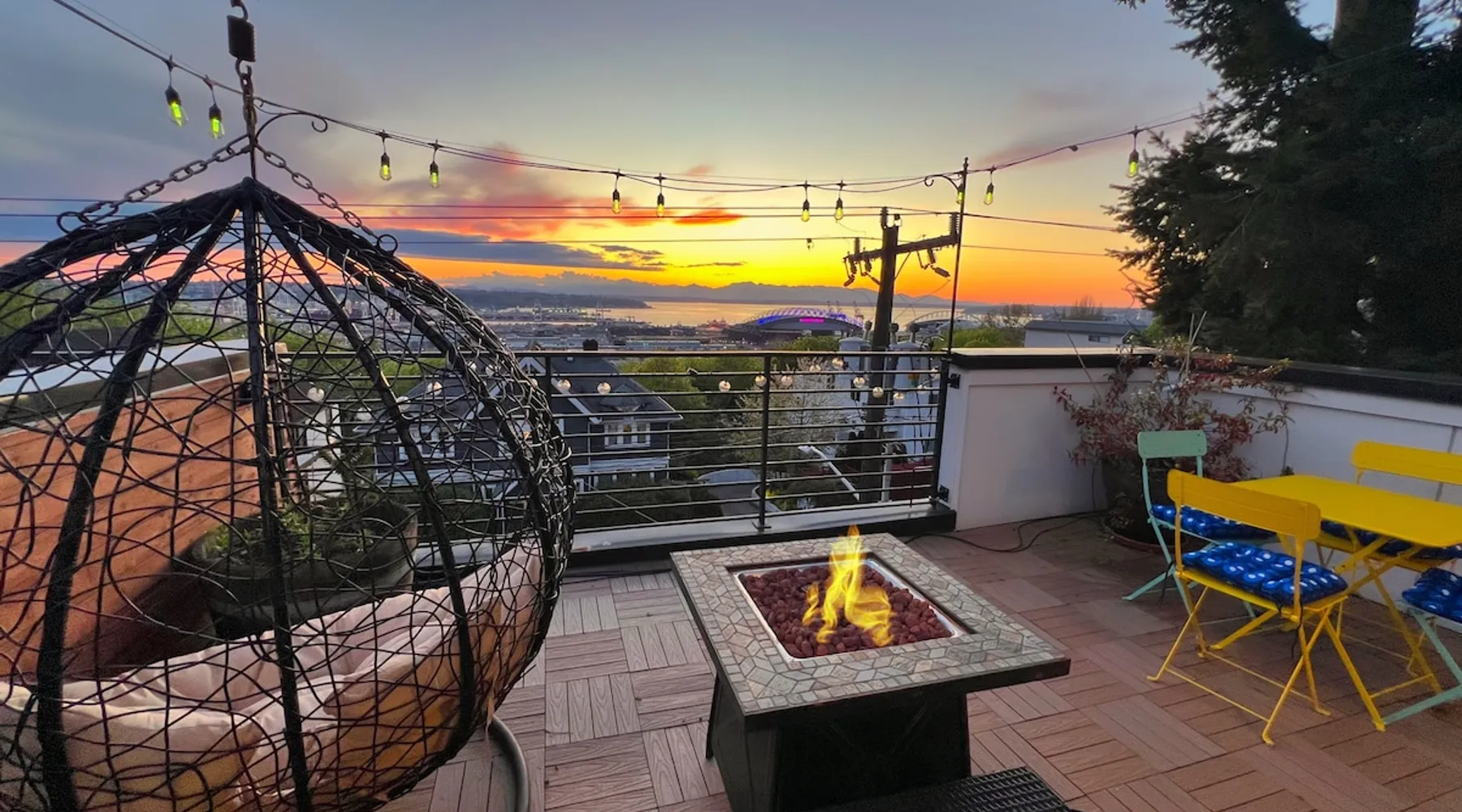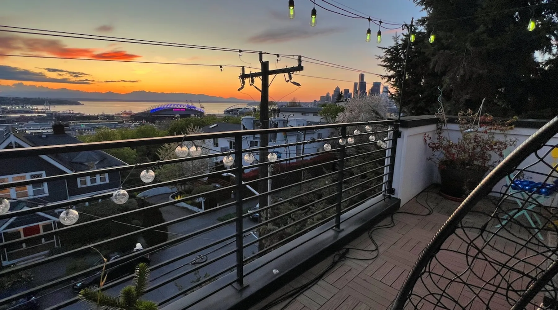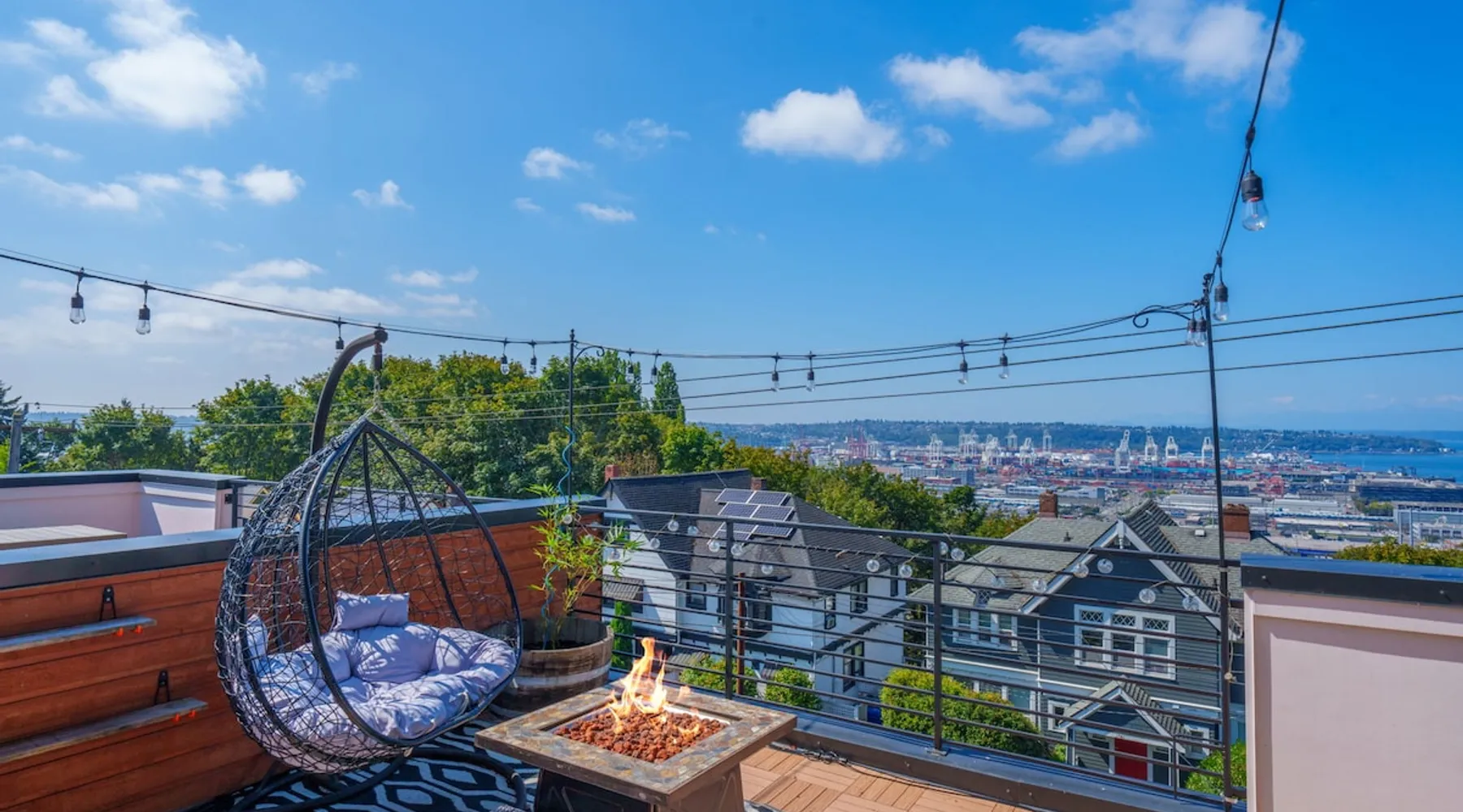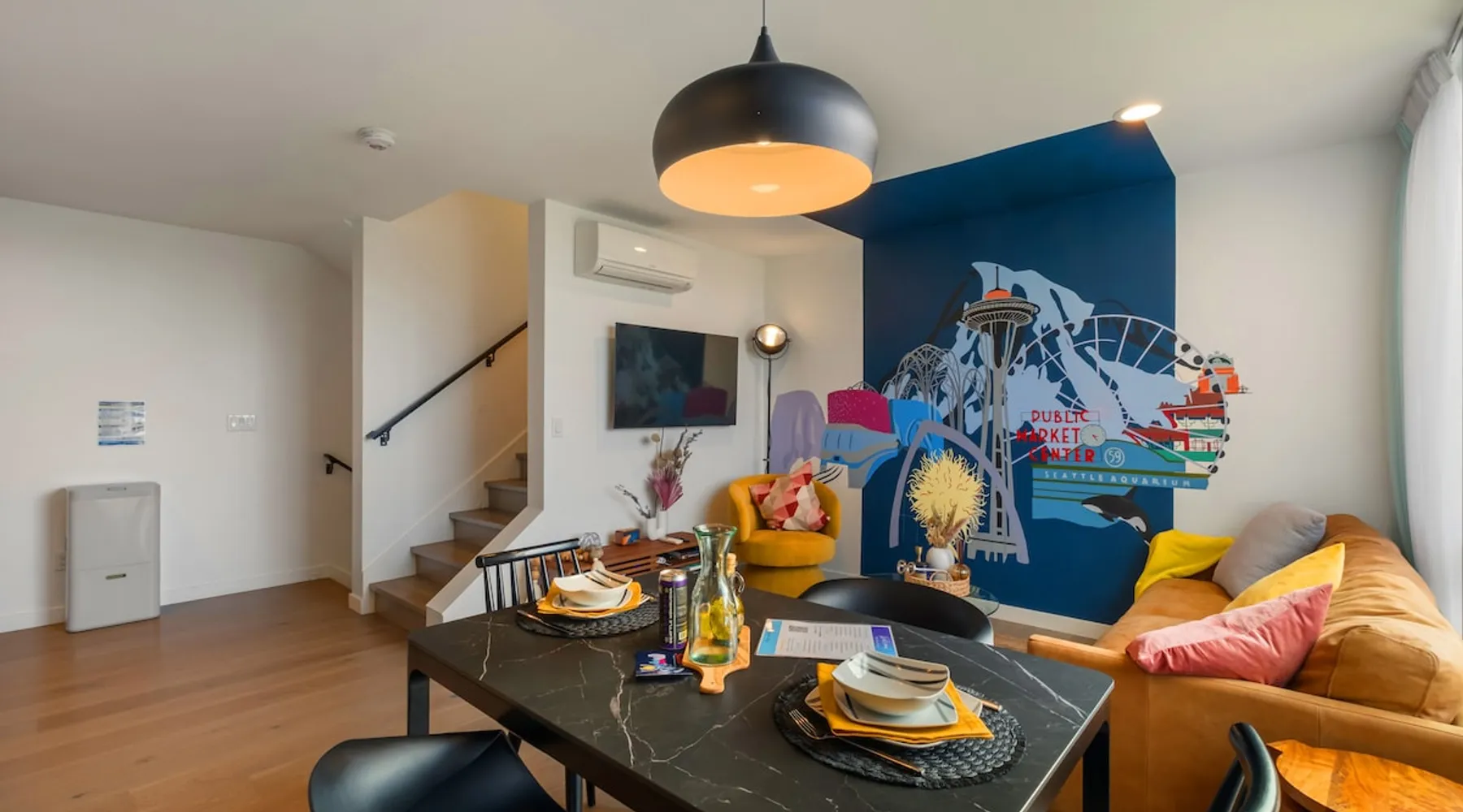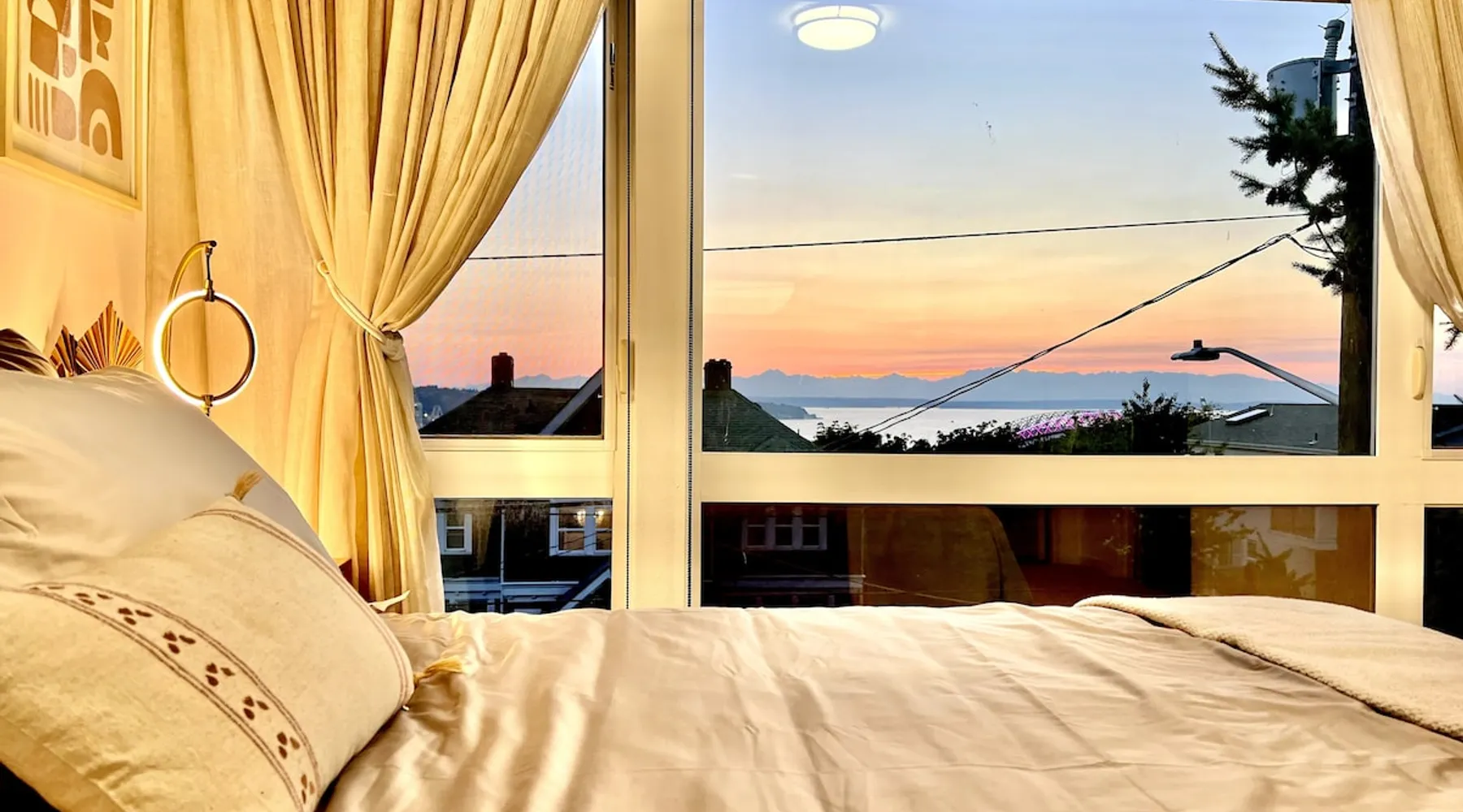 3-story townhouse with stunning mountains, bay, and Seattle city skyline views. •Dedicated parking. •1GB Internet •AC •Sunset vistas from the primary bedroom, private rooftop deck with a fire pit and pellet grill. •Two dedicated workspaces •Bus to DT, Cap Hill •Link train to SeaTac/UW Seamless I90 and I5 highway and city access, plus transit options to stadiums, downtown. ⚽ Stadiums (Lumen Field / T-Mobile Park) ~1.7 mi, ~7-9 min driving, 20 min bus, ~40 mins walk The space Step inside this charming three-story townhouse, where contemporary comfort meets natural beauty. The open living space is adorned with floor-to-ceiling windows framing stunning views of Olympic Mountains and Elliot Bay. Kitchen: A fully equipped kitchen with modern appliances and non-toxic cookware makes cooking a breeze, and you have everything to serve a beautiful dinner while admiring the breathtaking views. Bedrooms: Both bedrooms offer spacious comfort with a West Elm queen bed, exceptionally comfortable mattress, high-quality cotton sheets, and room darkening shades, ensuring a cozy and restful night's sleep. Additionally, you'll find a dedicated workspace for your convenience. Living Room: The retro-futuristic inspired living room welcomes you with a Seattle-themed mural that spans the entire wall, a cozy leather sofa, and a 50" TV. It's the perfect space to soak in the captivating Pacific Northwest ambiance and capture special moments against this unique backdrop. Rooftop: Private rooftop on the fourth floor gives you the most stunning views of Olympics, Bay, SODO and Downtown while you enjoy your comfortable seating under 200year old trees in front of the fire pit or enjoy your meal prepped on the pellet grill(can be used a smoker or regular grill). The most relaxing evening you can imagine! Parking: The townhouse has a dedicated parking spot on the back of the townhouse complex in the alley (1 min walk) and free street parking up front if you find a spot available. AC As most of the new construction townhouses in Seattle the AC is available on the 2nd and 3rd floors. The bottom bedroom is equipped with portable AC and fan. For your comfort: + 1GB Internet; + Air conditioning on second and third floors; fan on the ground floor; + Dedicated parking spot on the back of the townhouse complex; + Recreational smoke sensor; + In-unit washer/dryer; + Filtered water source; + Gentle toiletries without dyes and fragrances; + For little ones: Guava family travel crib, Uppababy G-Luxe stroller, baby monitor, sound machine, silicone plate, baby gates. Warning: it's a townhouse so lots of stairs are inevitable part of your experience of gorgeous view. The security camera is located over the entrance overlooking the street. Our property is committed to sustainability. We provide eco-friendly dish soap, dishwasher tablets, bamboo toilet paper, and reusable kitchen towels, ensuring your stay is both comfortable and environmentally responsible. Whether you seek relaxation or adventure, this townhouse promises an unforgettable experience, with nature's beauty right outside your windows. Guest access The entire townhouse is yours to explore and enjoy. You'll enjoy the convenience of a private entrance with keyless access. Our smart lock system ensures a hassle-free check-in process. Registration Details STR-OPLI-23-001168