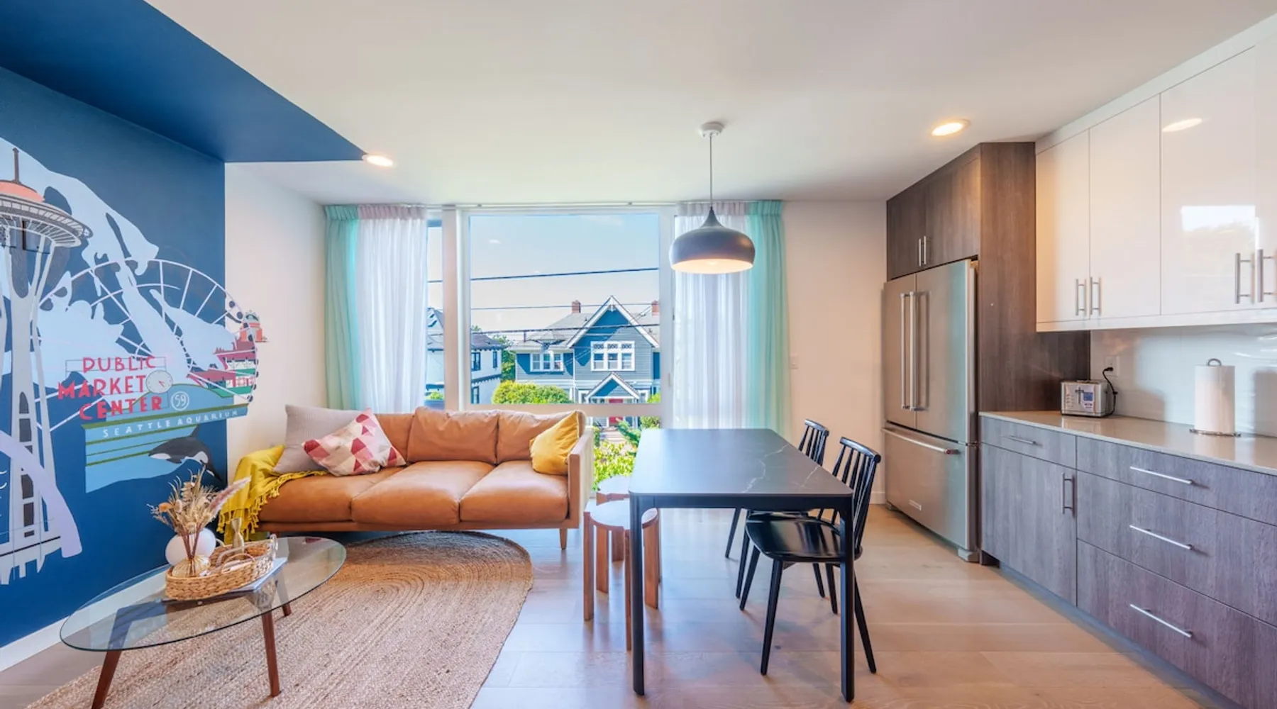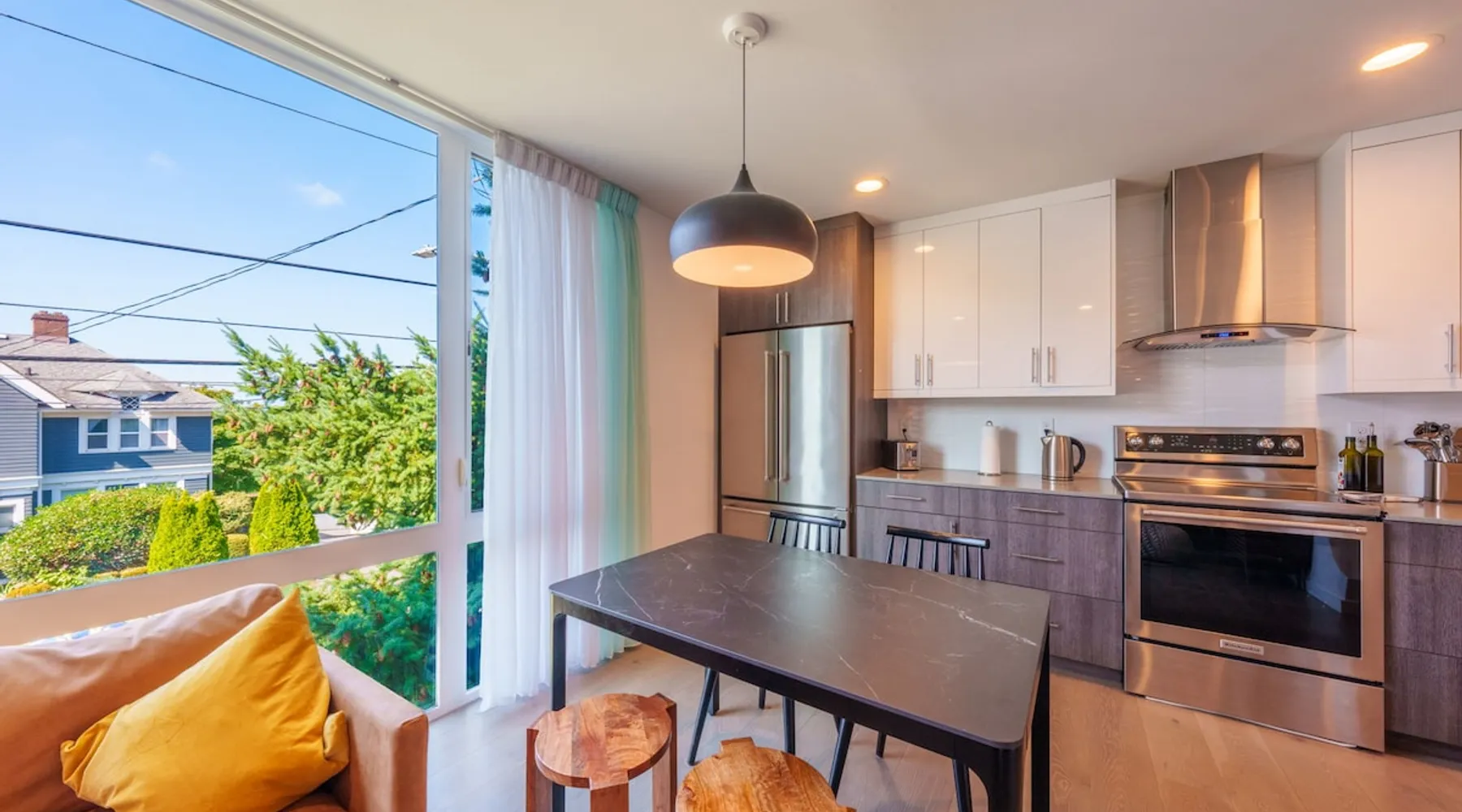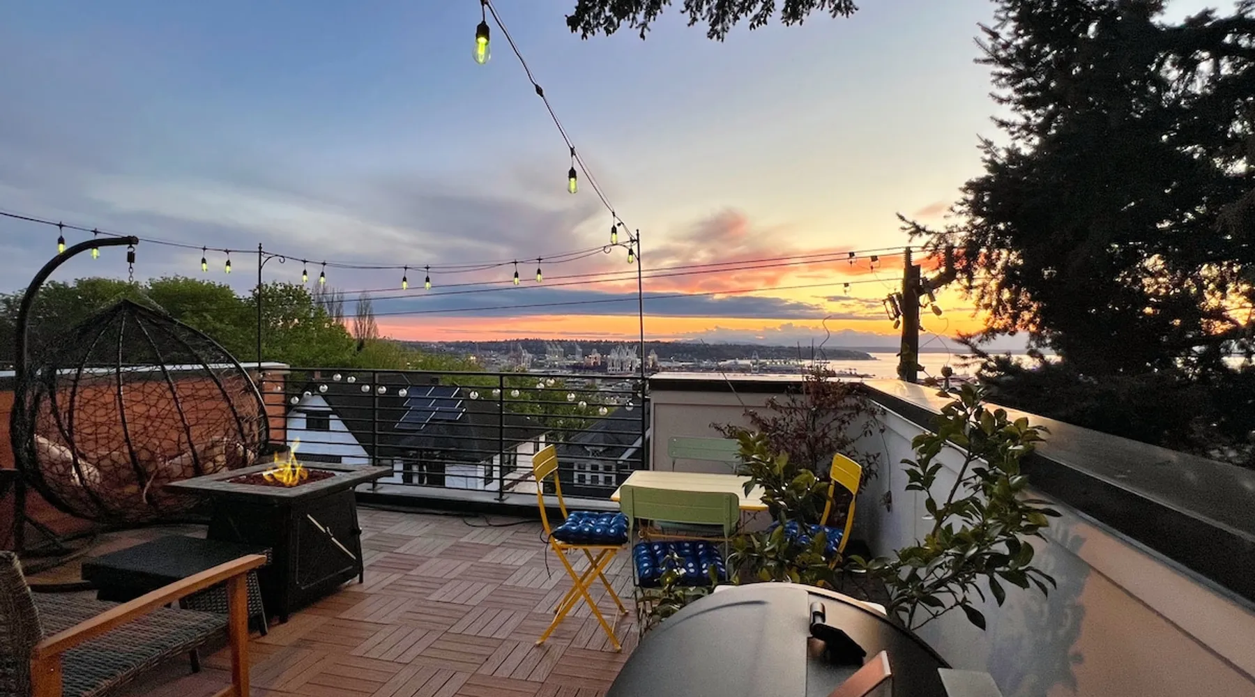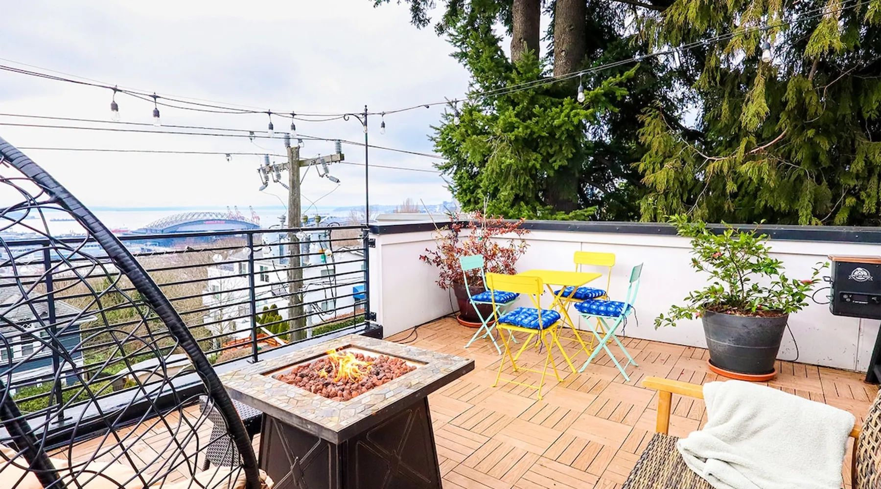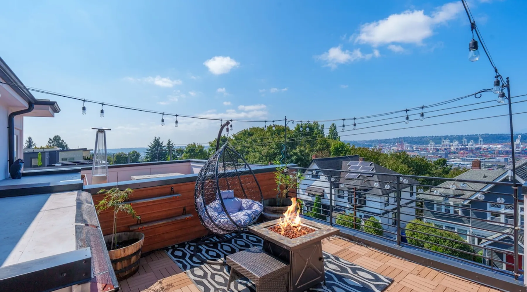 3-story townhouse with stunning mountains, bay, and Seattle city skyline views. •Dedicated parking. •1GB Internet •AC •Sunset vistas from the primary bedroom, private rooftop deck with a fire pit and pellet grill. •Two dedicated workspaces •Bus to DT, Cap Hill •Link train to SeaTac/UW Seamless I90 and I5 highway and city access, plus transit options to stadiums, downtown. ⚽ Stadiums (Lumen Field / T-Mobile Park) ~1.7 mi, ~7-9 min driving, 20 min bus, ~40 mins walk The space Step inside this charming three-story townhouse, where contemporary comfort meets natural beauty. The open living space is adorned with floor-to-ceiling windows framing stunning views of Olympic Mountains and Elliot Bay. Kitchen: A fully equipped kitchen with modern appliances and non-toxic cookware makes cooking a breeze, and you have everything to serve a beautiful dinner while admiring the breathtaking views. Bedrooms: Both bedrooms offer spacious comfort with a West Elm queen bed, exceptionally comfortable mattress, high-quality cotton sheets, and room darkening shades, ensuring a cozy and restful night's sleep. Additionally, you'll find a dedicated workspace for your convenience. Living Room: The retro-futuristic inspired living room welcomes you with a Seattle-themed mural that spans the entire wall, a cozy leather sofa, and a 50" TV. It's the perfect space to soak in the captivating Pacific Northwest ambiance and capture special moments against this unique backdrop. Rooftop: Private rooftop on the fourth floor gives you the most stunning views of Olympics, Bay, SODO and Downtown while you enjoy your comfortable seating under 200year old trees in front of the fire pit or enjoy your meal prepped on the pellet grill(can be used a smoker or regular grill). The most relaxing evening you can imagine! Parking: The townhouse has a dedicated parking spot on the back of the townhouse complex in the alley (1 min walk) and free street parking up front if you find a spot available. AC As most of the new construction townhouses in Seattle the AC is available on the 2nd and 3rd floors. The bottom bedroom is equipped with portable AC and fan. For your comfort: + 1GB Internet; + Air conditioning on second and third floors; fan on the ground floor; + Dedicated parking spot on the back of the townhouse complex; + Recreational smoke sensor; + In-unit washer/dryer; + Filtered water source; + Gentle toiletries without dyes and fragrances; + For little ones: Guava family travel crib, Uppababy G-Luxe stroller, baby monitor, sound machine, silicone plate, baby gates. Warning: it's a townhouse so lots of stairs are inevitable part of your experience of gorgeous view. The security camera is located over the entrance overlooking the street. Our property is committed to sustainability. We provide eco-friendly dish soap, dishwasher tablets, bamboo toilet paper, and reusable kitchen towels, ensuring your stay is both comfortable and environmentally responsible. Whether you seek relaxation or adventure, this townhouse promises an unforgettable experience, with nature's beauty right outside your windows. Guest access The entire townhouse is yours to explore and enjoy. You'll enjoy the convenience of a private entrance with keyless access. Our smart lock system ensures a hassle-free check-in process. Registration Details STR-OPLI-23-001168