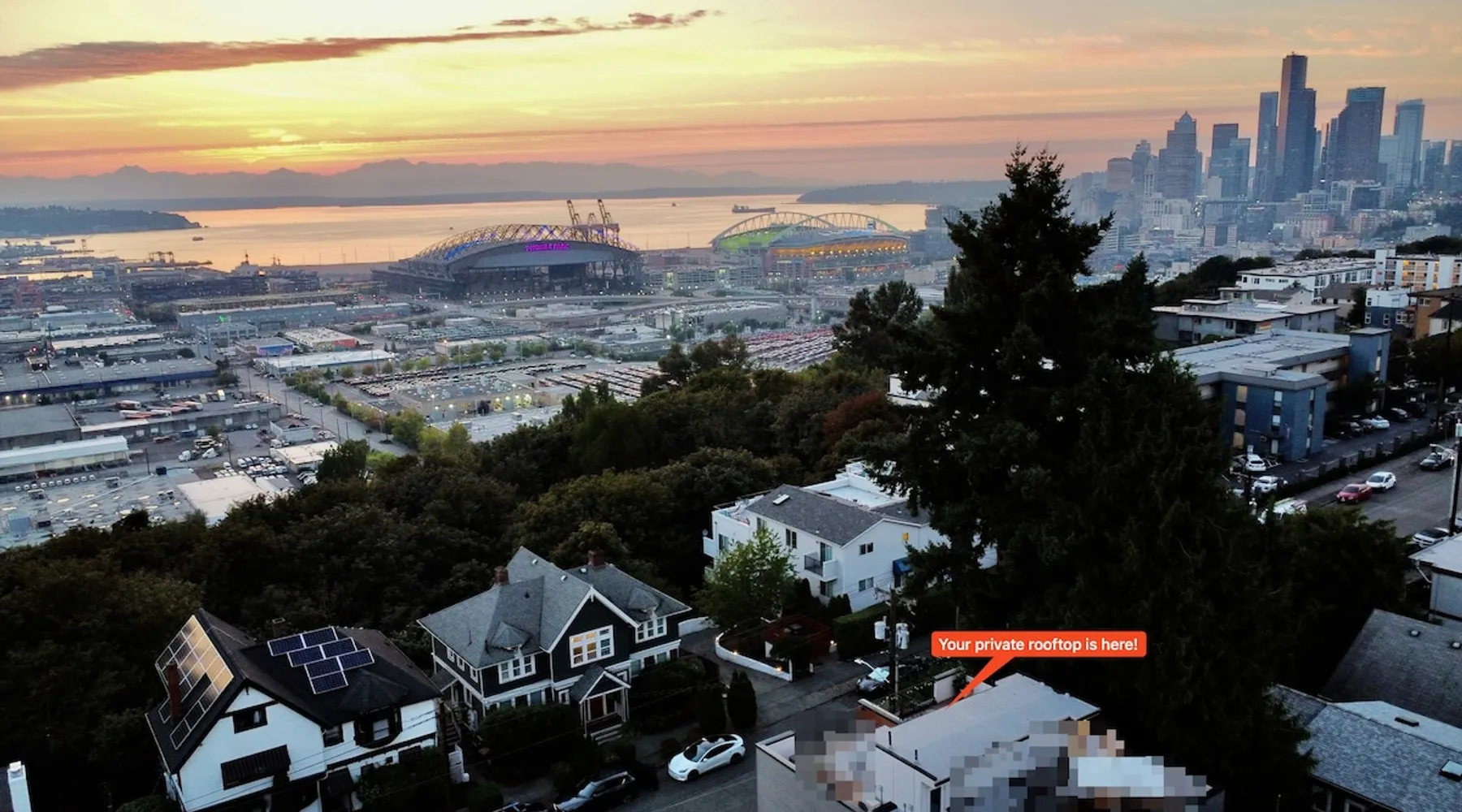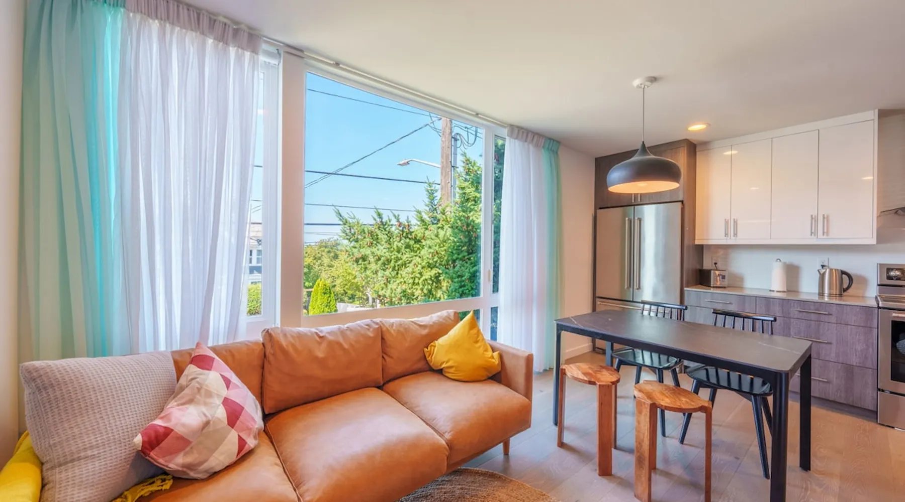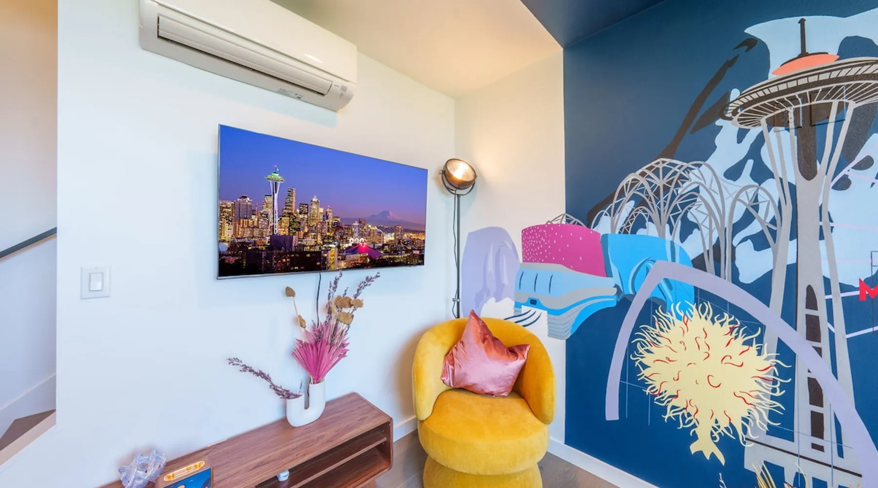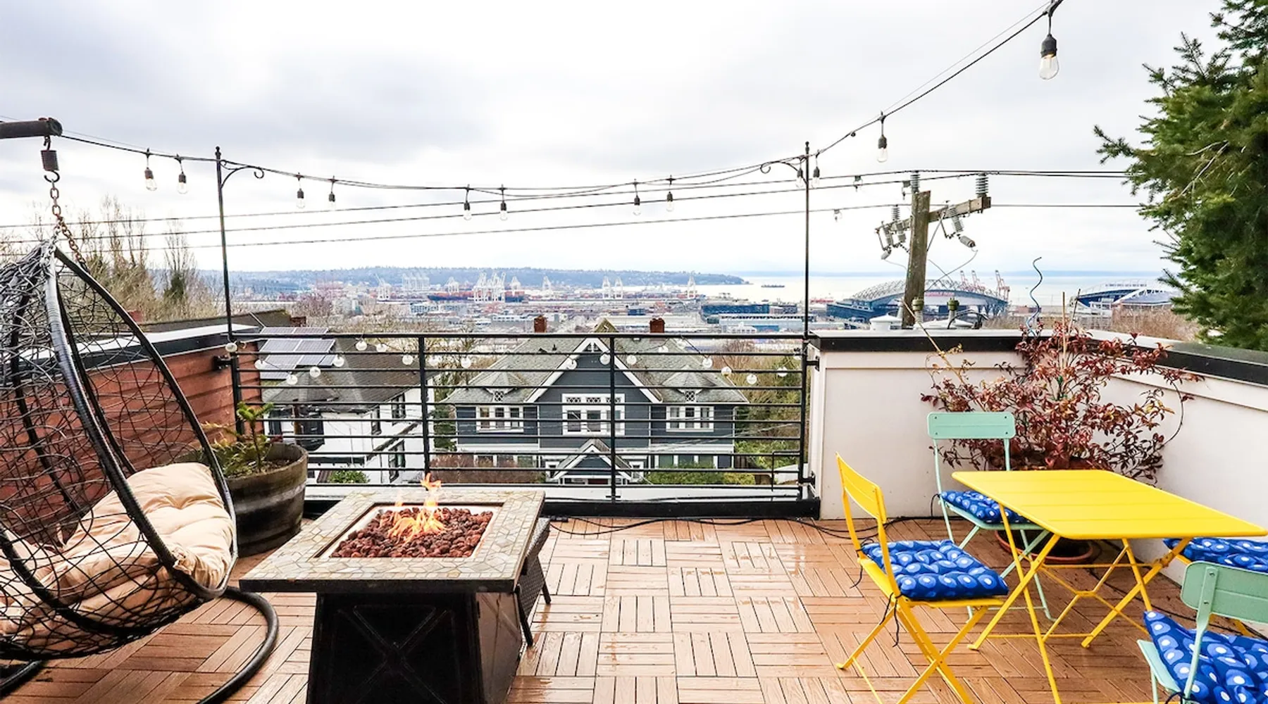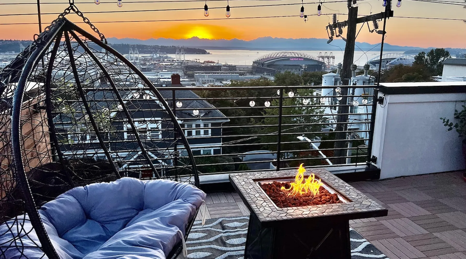 3-story townhouse with stunning mountains, bay, and Seattle city skyline views. •Dedicated parking. •1GB Internet •AC •Sunset vistas from the primary bedroom, private rooftop deck with a fire pit and pellet grill. •Two dedicated workspaces •Bus to DT, Cap Hill •Link train to SeaTac/UW Seamless I90 and I5 highway and city access, plus transit options to stadiums, downtown. ⚽ Stadiums (Lumen Field / T-Mobile Park) ~1.7 mi, ~7-9 min driving, 20 min bus, ~40 mins walk The space Step inside this charming three-story townhouse, where contemporary comfort meets natural beauty. The open living space is adorned with floor-to-ceiling windows framing stunning views of Olympic Mountains and Elliot Bay. Kitchen: A fully equipped kitchen with modern appliances and non-toxic cookware makes cooking a breeze, and you have everything to serve a beautiful dinner while admiring the breathtaking views. Bedrooms: Both bedrooms offer spacious comfort with a West Elm queen bed, exceptionally comfortable mattress, high-quality cotton sheets, and room darkening shades, ensuring a cozy and restful night's sleep. Additionally, you'll find a dedicated workspace for your convenience. Living Room: The retro-futuristic inspired living room welcomes you with a Seattle-themed mural that spans the entire wall, a cozy leather sofa, and a 50" TV. It's the perfect space to soak in the captivating Pacific Northwest ambiance and capture special moments against this unique backdrop. Rooftop: Private rooftop on the fourth floor gives you the most stunning views of Olympics, Bay, SODO and Downtown while you enjoy your comfortable seating under 200year old trees in front of the fire pit or enjoy your meal prepped on the pellet grill(can be used a smoker or regular grill). The most relaxing evening you can imagine! Parking: The townhouse has a dedicated parking spot on the back of the townhouse complex in the alley (1 min walk) and free street parking up front if you find a spot available. AC As most of the new construction townhouses in Seattle the AC is available on the 2nd and 3rd floors. The bottom bedroom is equipped with portable AC and fan. For your comfort: + 1GB Internet; + Air conditioning on second and third floors; fan on the ground floor; + Dedicated parking spot on the back of the townhouse complex; + Recreational smoke sensor; + In-unit washer/dryer; + Filtered water source; + Gentle toiletries without dyes and fragrances; + For little ones: Guava family travel crib, Uppababy G-Luxe stroller, baby monitor, sound machine, silicone plate, baby gates. Warning: it's a townhouse so lots of stairs are inevitable part of your experience of gorgeous view. The security camera is located over the entrance overlooking the street. Our property is committed to sustainability. We provide eco-friendly dish soap, dishwasher tablets, bamboo toilet paper, and reusable kitchen towels, ensuring your stay is both comfortable and environmentally responsible. Whether you seek relaxation or adventure, this townhouse promises an unforgettable experience, with nature's beauty right outside your windows. Guest access The entire townhouse is yours to explore and enjoy. You'll enjoy the convenience of a private entrance with keyless access. Our smart lock system ensures a hassle-free check-in process. Registration Details STR-OPLI-23-001168