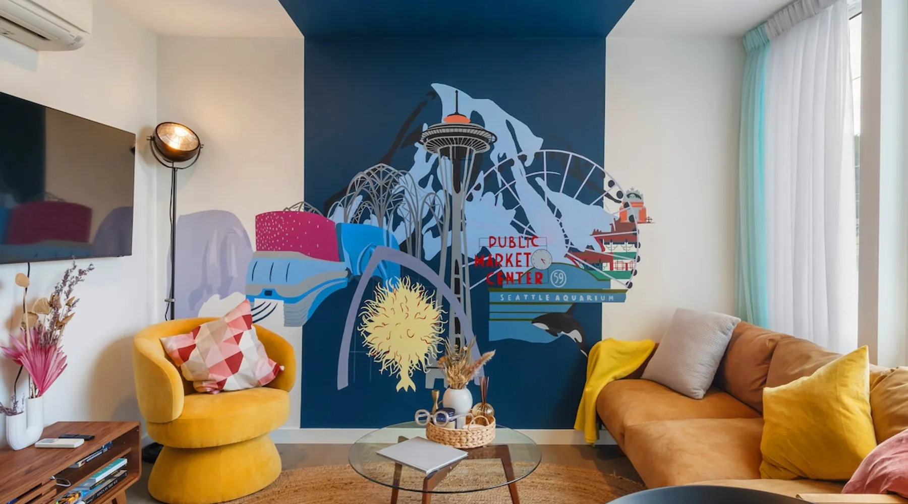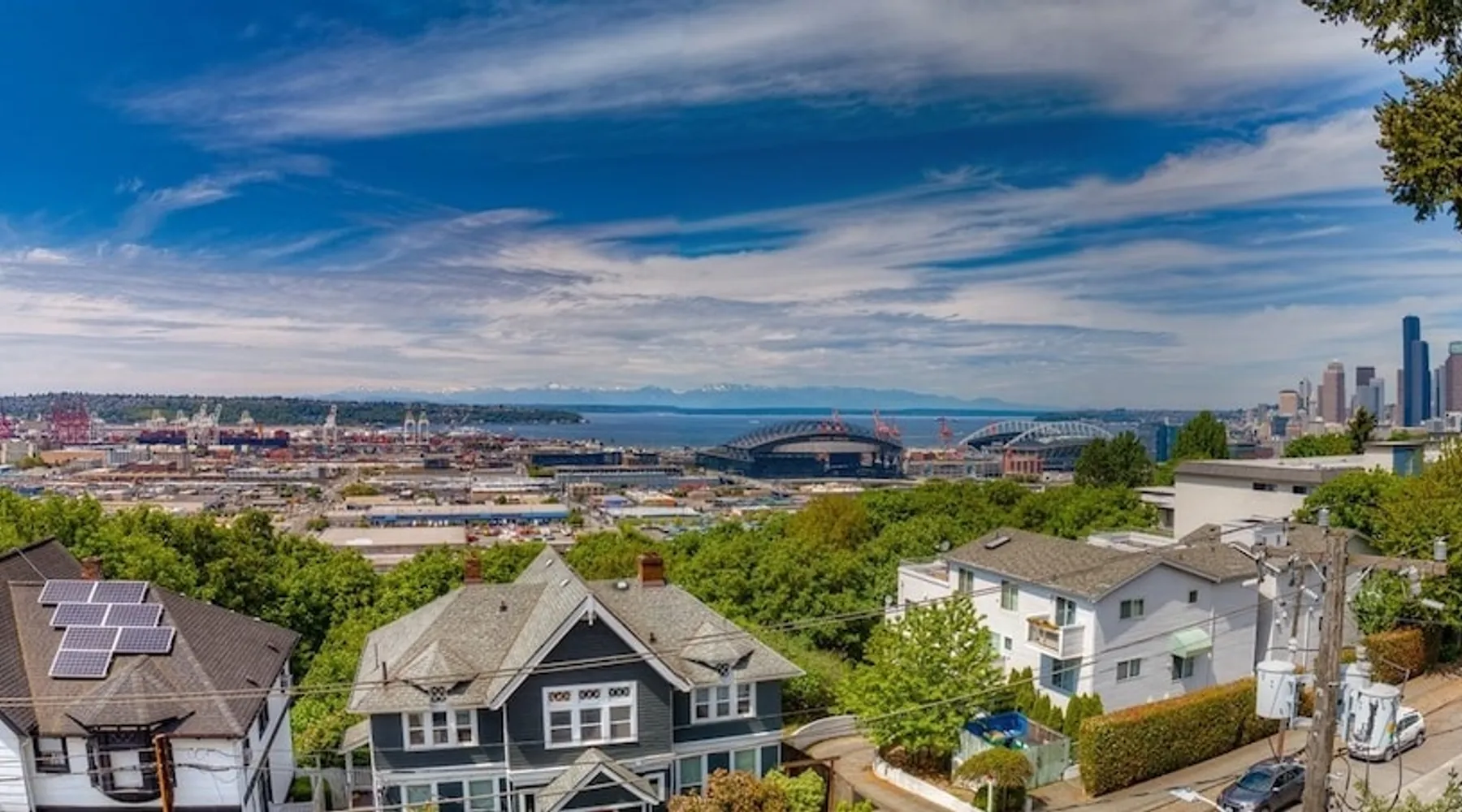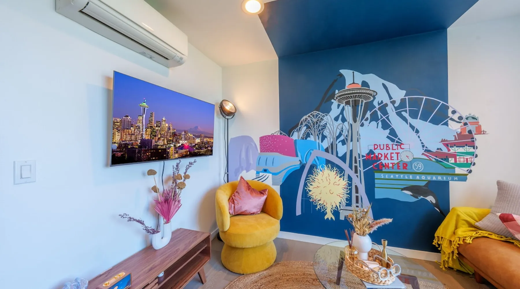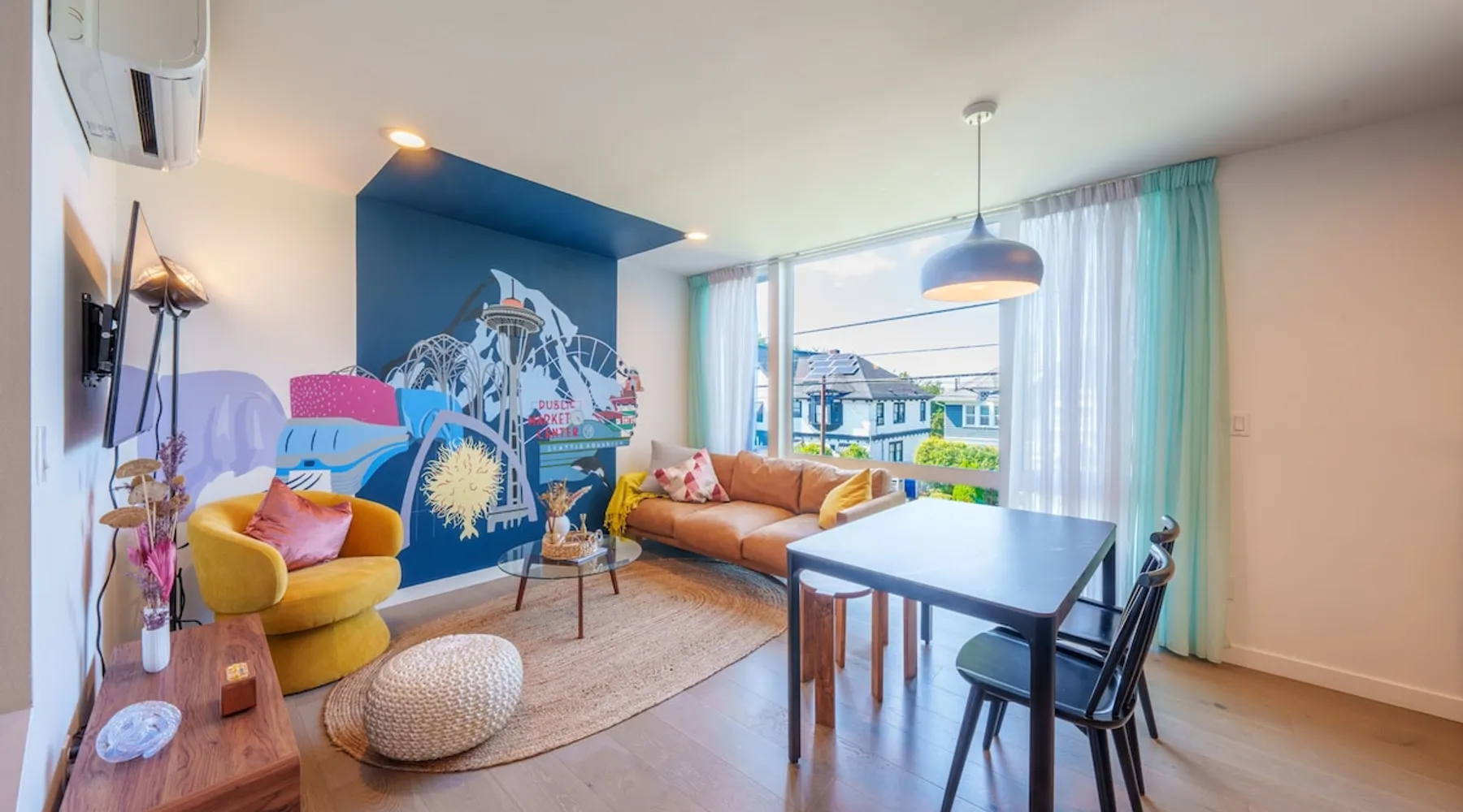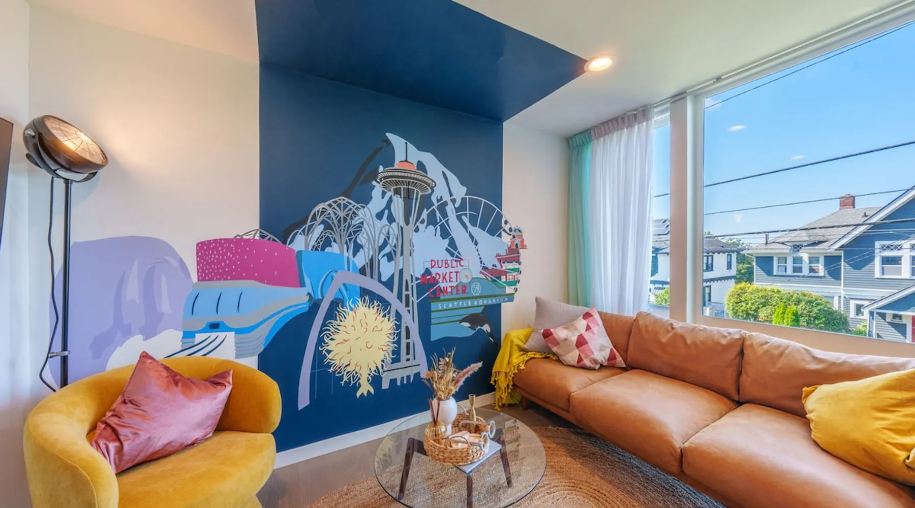 3-story townhouse with stunning mountains, bay, and Seattle city skyline views. •Dedicated parking. •1GB Internet •AC •Sunset vistas from the primary bedroom, private rooftop deck with a fire pit and pellet grill. •Two dedicated workspaces •Bus to DT, Cap Hill •Link train to SeaTac/UW Seamless I90 and I5 highway and city access, plus transit options to stadiums, downtown. ⚽ Stadiums (Lumen Field / T-Mobile Park) ~1.7 mi, ~7-9 min driving, 20 min bus, ~40 mins walk The space Step inside this charming three-story townhouse, where contemporary comfort meets natural beauty. The open living space is adorned with floor-to-ceiling windows framing stunning views of Olympic Mountains and Elliot Bay. Kitchen: A fully equipped kitchen with modern appliances and non-toxic cookware makes cooking a breeze, and you have everything to serve a beautiful dinner while admiring the breathtaking views. Bedrooms: Both bedrooms offer spacious comfort with a West Elm queen bed, exceptionally comfortable mattress, high-quality cotton sheets, and room darkening shades, ensuring a cozy and restful night's sleep. Additionally, you'll find a dedicated workspace for your convenience. Living Room: The retro-futuristic inspired living room welcomes you with a Seattle-themed mural that spans the entire wall, a cozy leather sofa, and a 50" TV. It's the perfect space to soak in the captivating Pacific Northwest ambiance and capture special moments against this unique backdrop. Rooftop: Private rooftop on the fourth floor gives you the most stunning views of Olympics, Bay, SODO and Downtown while you enjoy your comfortable seating under 200year old trees in front of the fire pit or enjoy your meal prepped on the pellet grill(can be used a smoker or regular grill). The most relaxing evening you can imagine! Parking: The townhouse has a dedicated parking spot on the back of the townhouse complex in the alley (1 min walk) and free street parking up front if you find a spot available. AC As most of the new construction townhouses in Seattle the AC is available on the 2nd and 3rd floors. The bottom bedroom is equipped with portable AC and fan. For your comfort: + 1GB Internet; + Air conditioning on second and third floors; fan on the ground floor; + Dedicated parking spot on the back of the townhouse complex; + Recreational smoke sensor; + In-unit washer/dryer; + Filtered water source; + Gentle toiletries without dyes and fragrances; + For little ones: Guava family travel crib, Uppababy G-Luxe stroller, baby monitor, sound machine, silicone plate, baby gates. Warning: it's a townhouse so lots of stairs are inevitable part of your experience of gorgeous view. The security camera is located over the entrance overlooking the street. Our property is committed to sustainability. We provide eco-friendly dish soap, dishwasher tablets, bamboo toilet paper, and reusable kitchen towels, ensuring your stay is both comfortable and environmentally responsible. Whether you seek relaxation or adventure, this townhouse promises an unforgettable experience, with nature's beauty right outside your windows. Guest access The entire townhouse is yours to explore and enjoy. You'll enjoy the convenience of a private entrance with keyless access. Our smart lock system ensures a hassle-free check-in process. Registration Details STR-OPLI-23-001168