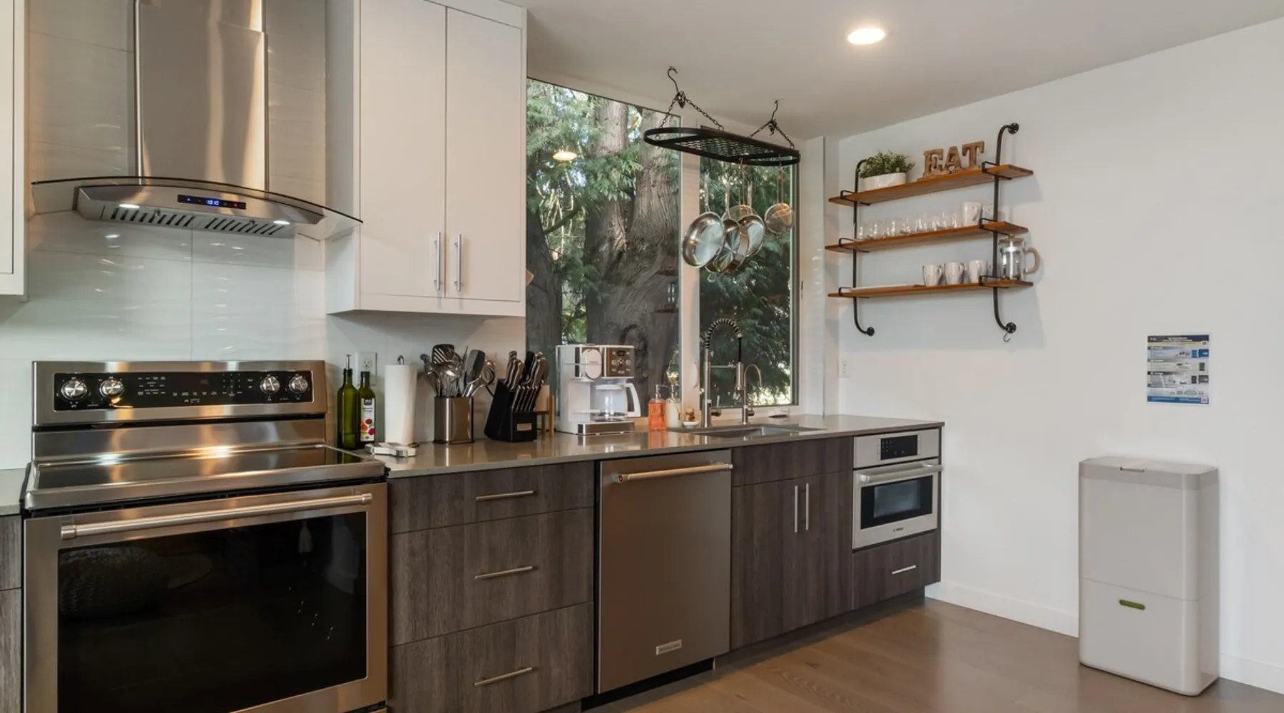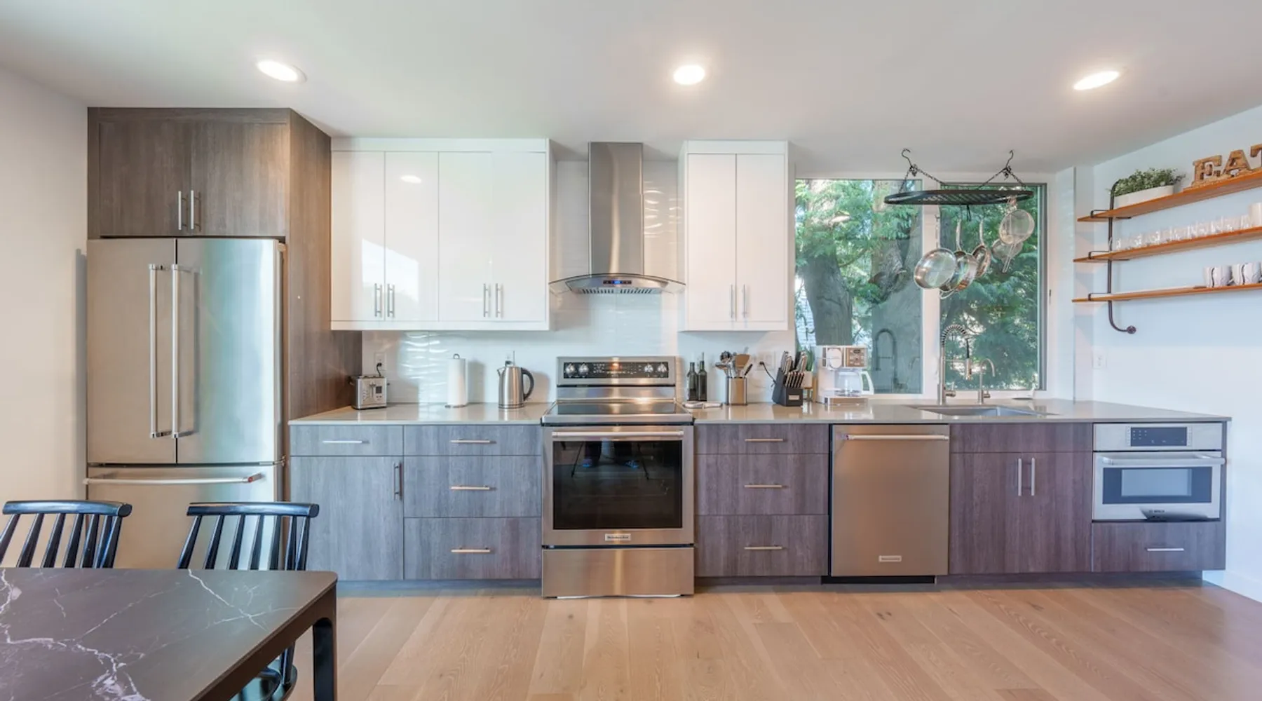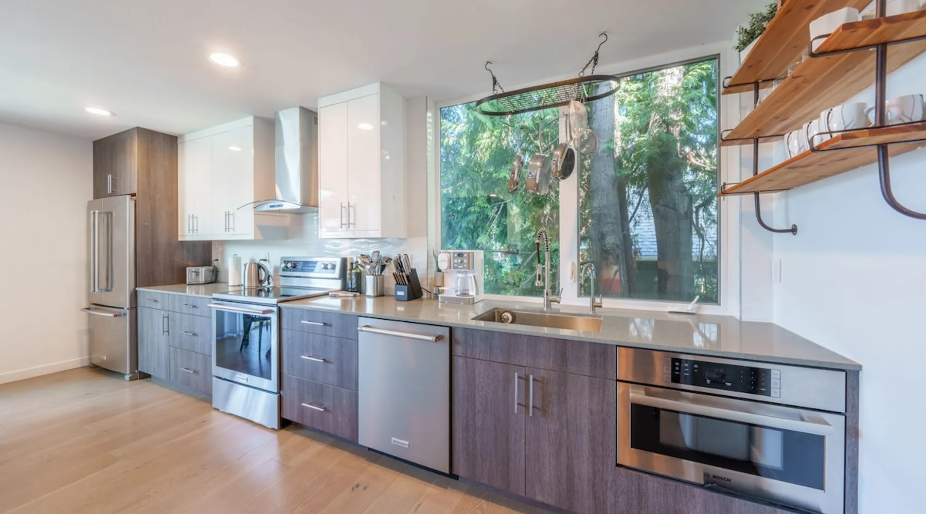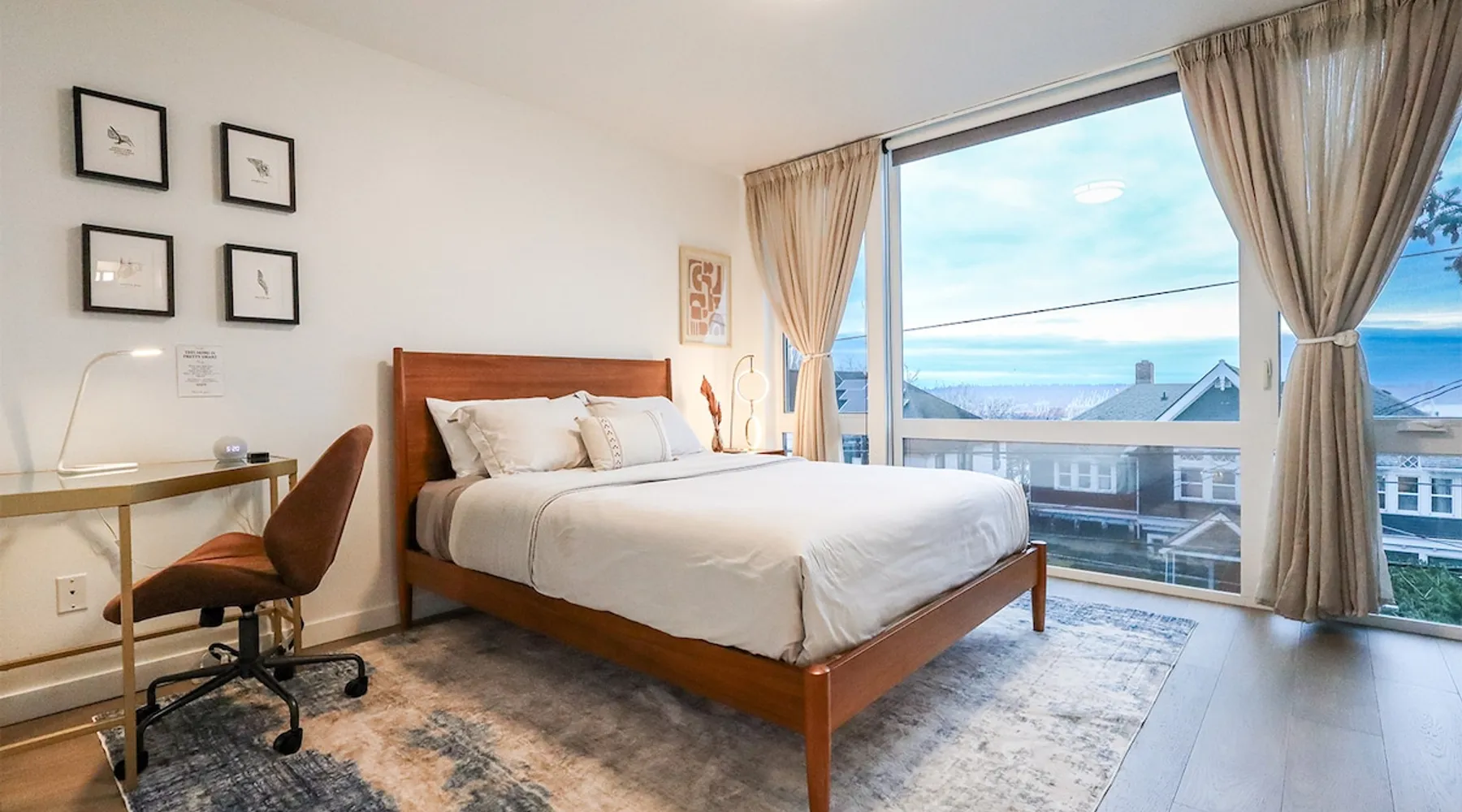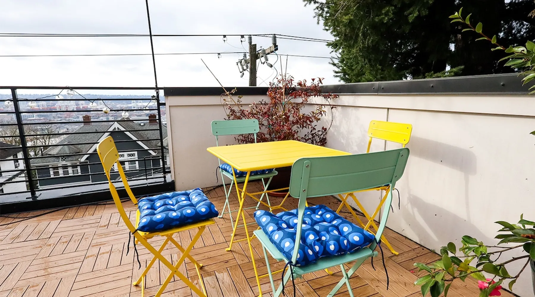 3-story townhouse with stunning mountains, bay, and Seattle city skyline views. •Dedicated parking. •1GB Internet •AC •Sunset vistas from the primary bedroom, private rooftop deck with a fire pit and pellet grill. •Two dedicated workspaces •Bus to DT, Cap Hill •Link train to SeaTac/UW Seamless I90 and I5 highway and city access, plus transit options to stadiums, downtown. ⚽ Stadiums (Lumen Field / T-Mobile Park) ~1.7 mi, ~7-9 min driving, 20 min bus, ~40 mins walk The space Step inside this charming three-story townhouse, where contemporary comfort meets natural beauty. The open living space is adorned with floor-to-ceiling windows framing stunning views of Olympic Mountains and Elliot Bay. Kitchen: A fully equipped kitchen with modern appliances and non-toxic cookware makes cooking a breeze, and you have everything to serve a beautiful dinner while admiring the breathtaking views. Bedrooms: Both bedrooms offer spacious comfort with a West Elm queen bed, exceptionally comfortable mattress, high-quality cotton sheets, and room darkening shades, ensuring a cozy and restful night's sleep. Additionally, you'll find a dedicated workspace for your convenience. Living Room: The retro-futuristic inspired living room welcomes you with a Seattle-themed mural that spans the entire wall, a cozy leather sofa, and a 50" TV. It's the perfect space to soak in the captivating Pacific Northwest ambiance and capture special moments against this unique backdrop. Rooftop: Private rooftop on the fourth floor gives you the most stunning views of Olympics, Bay, SODO and Downtown while you enjoy your comfortable seating under 200year old trees in front of the fire pit or enjoy your meal prepped on the pellet grill(can be used a smoker or regular grill). The most relaxing evening you can imagine! Parking: The townhouse has a dedicated parking spot on the back of the townhouse complex in the alley (1 min walk) and free street parking up front if you find a spot available. AC As most of the new construction townhouses in Seattle the AC is available on the 2nd and 3rd floors. The bottom bedroom is equipped with portable AC and fan. For your comfort: + 1GB Internet; + Air conditioning on second and third floors; fan on the ground floor; + Dedicated parking spot on the back of the townhouse complex; + Recreational smoke sensor; + In-unit washer/dryer; + Filtered water source; + Gentle toiletries without dyes and fragrances; + For little ones: Guava family travel crib, Uppababy G-Luxe stroller, baby monitor, sound machine, silicone plate, baby gates. Warning: it's a townhouse so lots of stairs are inevitable part of your experience of gorgeous view. The security camera is located over the entrance overlooking the street. Our property is committed to sustainability. We provide eco-friendly dish soap, dishwasher tablets, bamboo toilet paper, and reusable kitchen towels, ensuring your stay is both comfortable and environmentally responsible. Whether you seek relaxation or adventure, this townhouse promises an unforgettable experience, with nature's beauty right outside your windows. Guest access The entire townhouse is yours to explore and enjoy. You'll enjoy the convenience of a private entrance with keyless access. Our smart lock system ensures a hassle-free check-in process. Registration Details STR-OPLI-23-001168