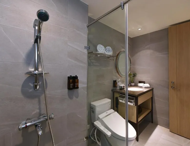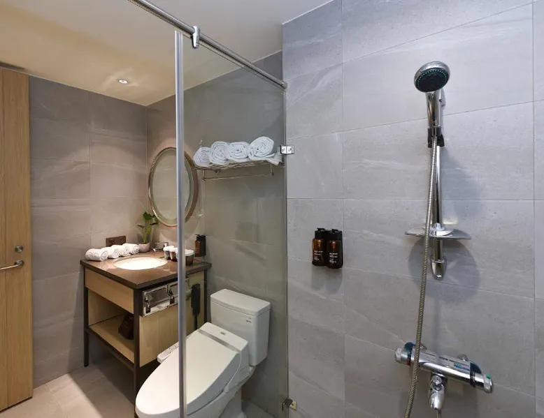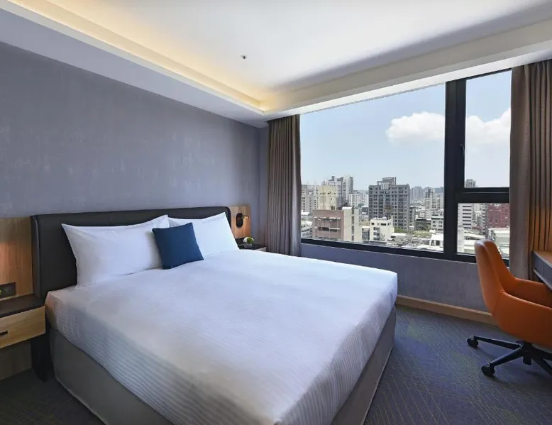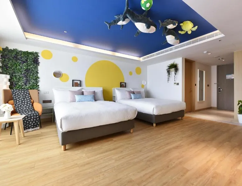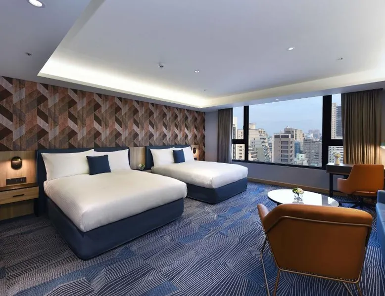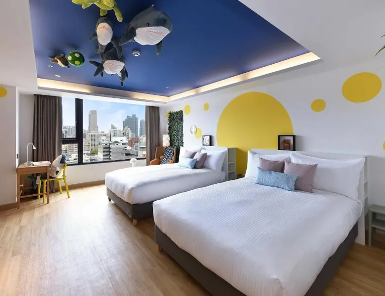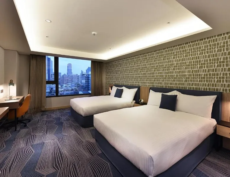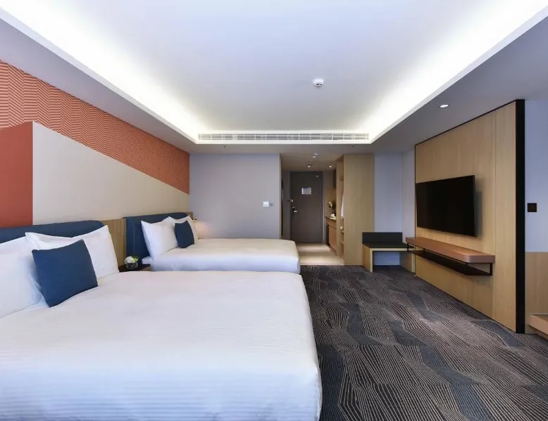Comfortable Accommodations: Fullon Poshtel - Kaohsiung in Kaohsiung offers spacious rooms with air-conditioning, private bathrooms, and modern amenities. Guests appreciate the room size and comfort. Dining Experience: The modern restaurant serves a buffet breakfast with vegetarian, vegan, halal, and Asian options. Additional dining options include a lounge and room service. Facilities and Services: The hotel features a fitness center, free WiFi, lounge, and concierge service. Free on-site private parking is available, along with a tour desk and luggage storage. Prime Location: Located 4.3 mi from Kaohsiung International Airport, the hotel is near attractions such as Formosa Boulevard Station (less than 0.6 mi) and Kaohsiung Museum of History (11-minute walk). Hiking trails are in the surroundings. The quadruple room features a wardrobe, a safe deposit box, as well as a private bathroom boasting a shower and a hairdryer. The spacious quadruple room offers air conditioning, soundproof walls, a mini-bar, a seating area, as well as a flat-screen TV with streaming services. The unit has 2 beds.